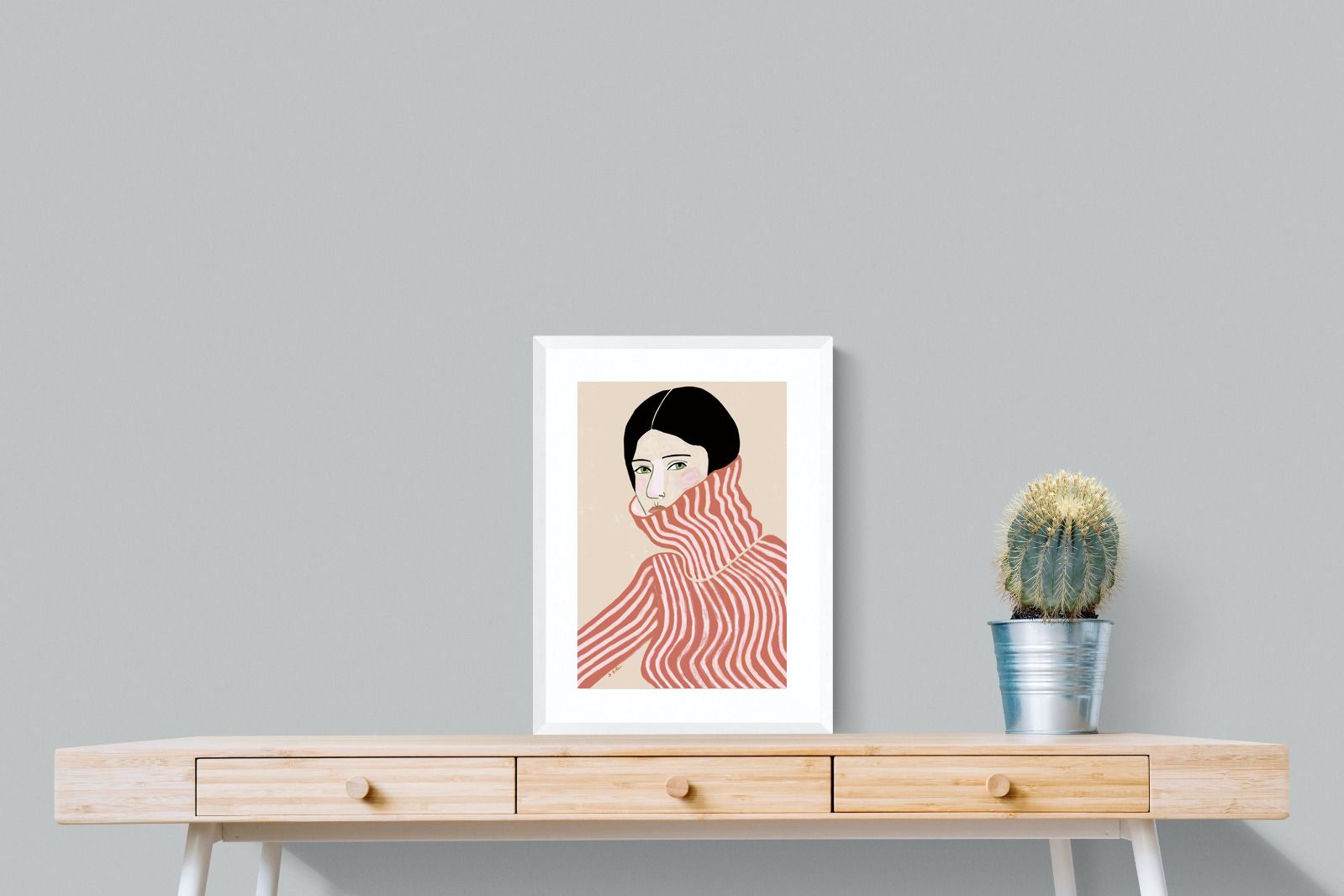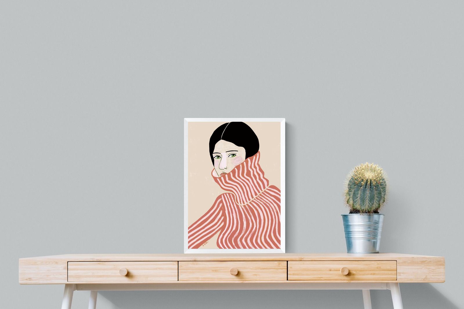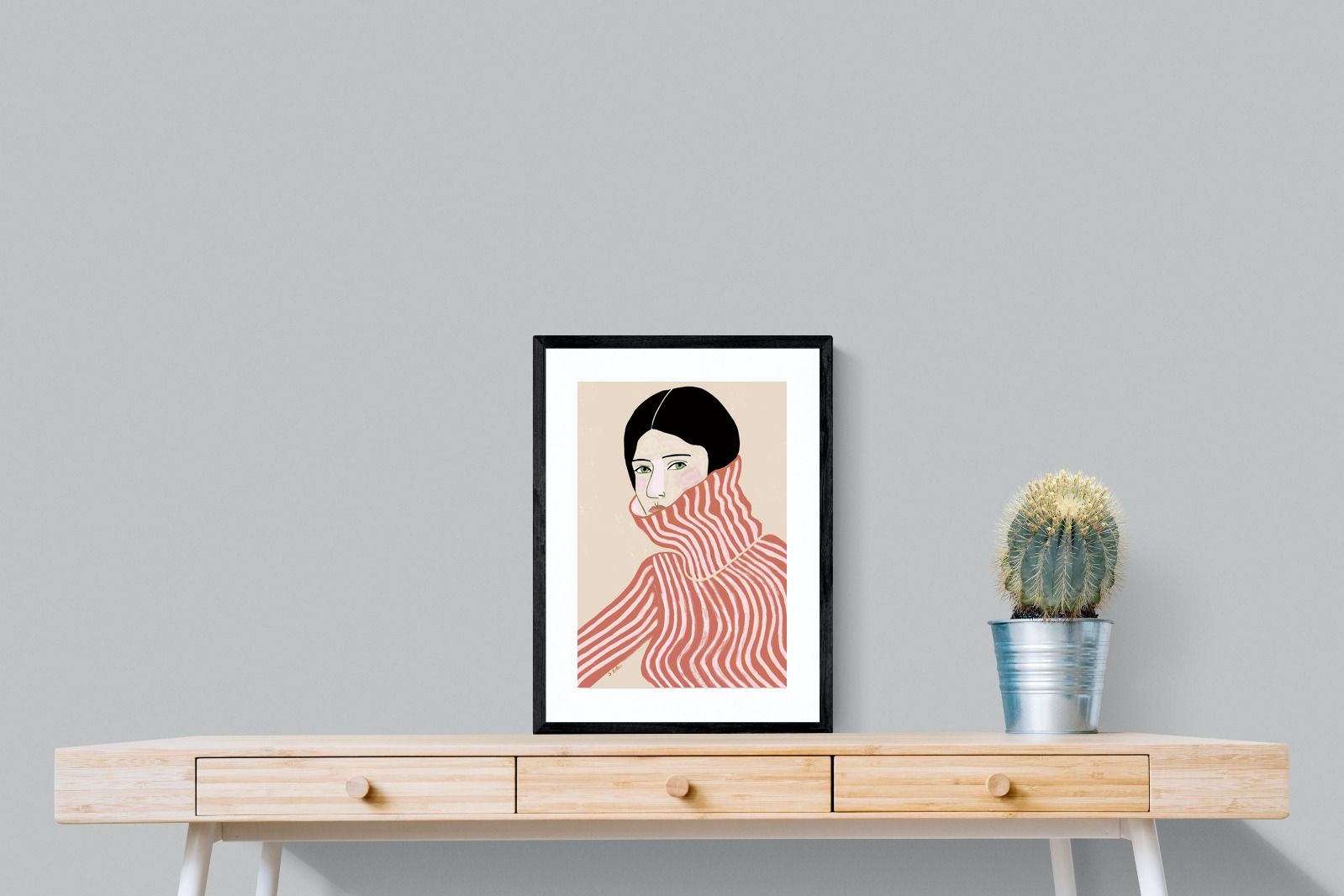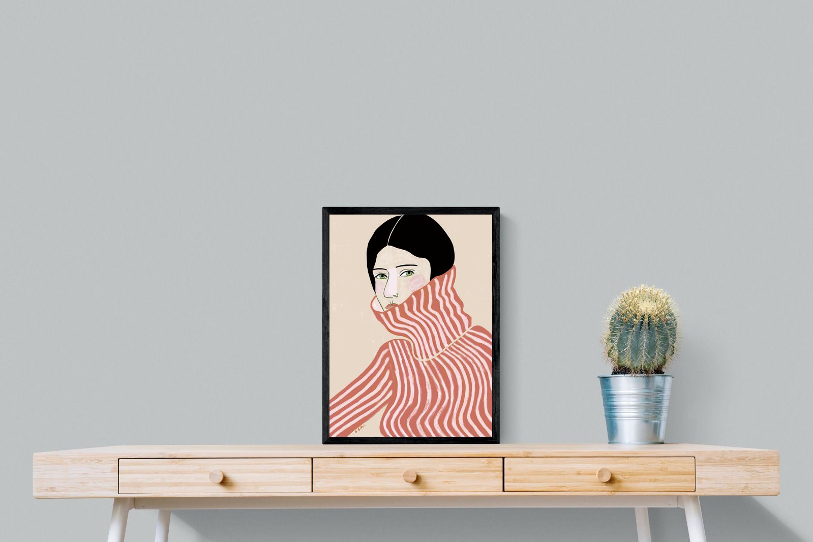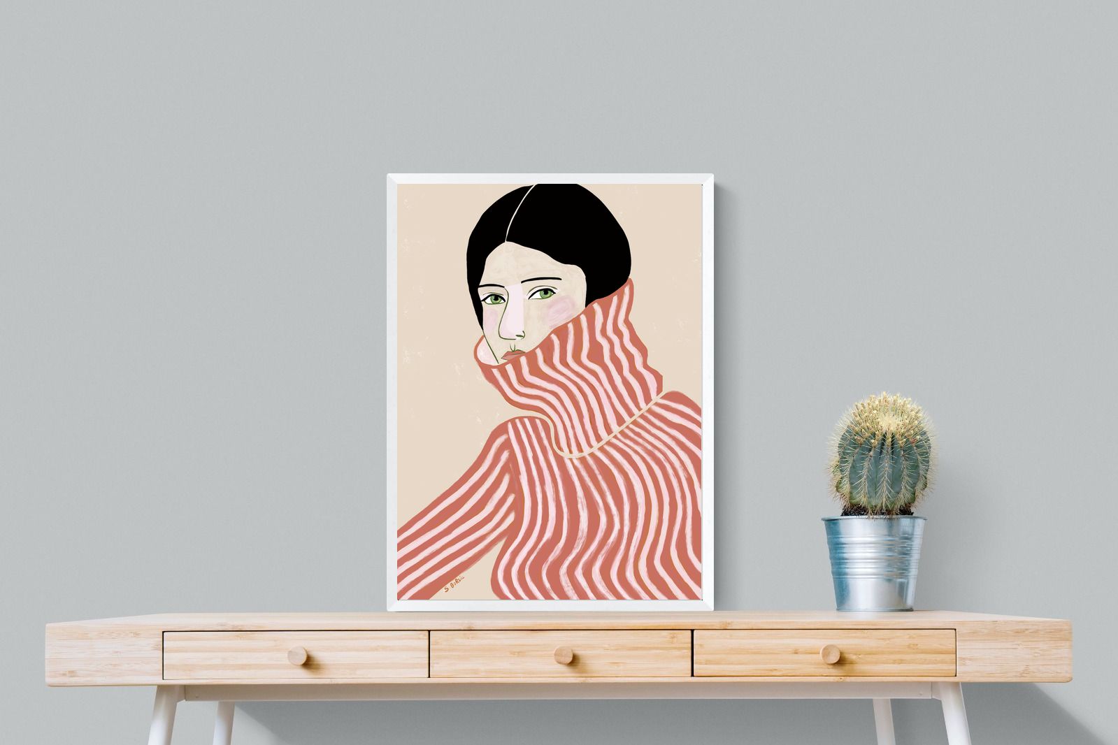 This abstract portrait captivates with its striking use of texture and colour. The soft pink and white stripes of the turtleneck create a sense of movement, while the subject’s piercing green eyes add emotional depth. The combination of minimalist forms and expressive brushwork gives the piece an enigmatic charm. Perfect for a living room or study, this artwork introduces a contemporary yet reflective mood, ideal for sparking thoughtful conversation.