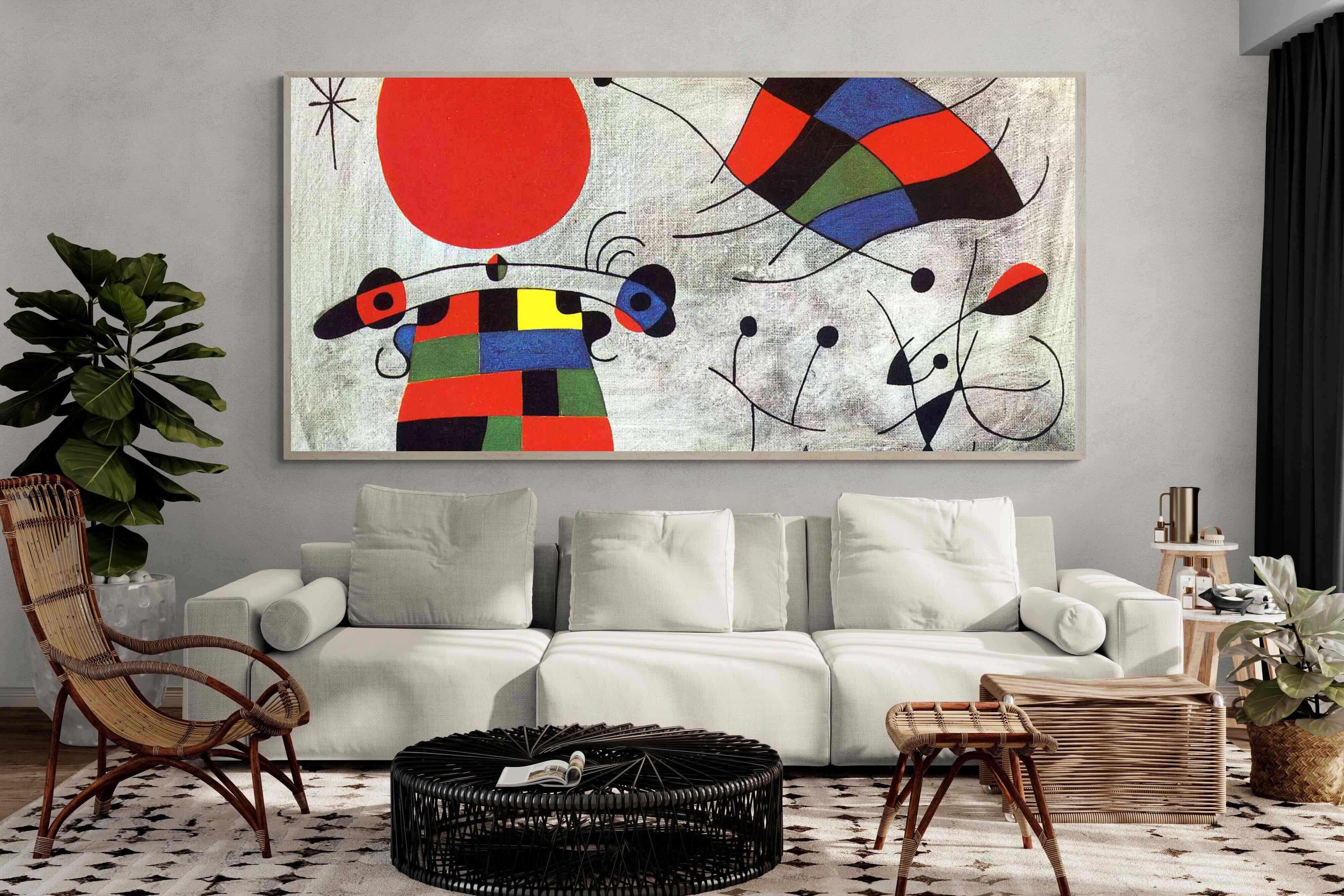Miró's work often features motifs such as birds, stars, and the moon, which can be seen as part of his personal iconography, imbued with poetic and dream-like symbolism. "The Smile of the Flamboyant Wings" likely incorporates these elements, with its title suggesting a sense of joy and liberation that could be symbolized by the image of wings—a frequent symbol of freedom and transcendence.