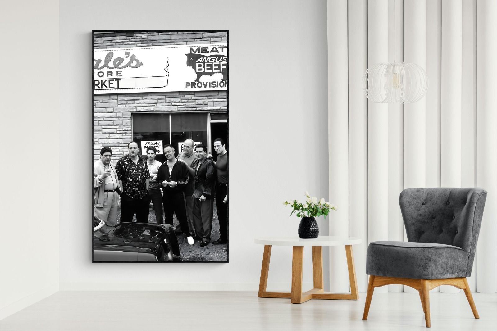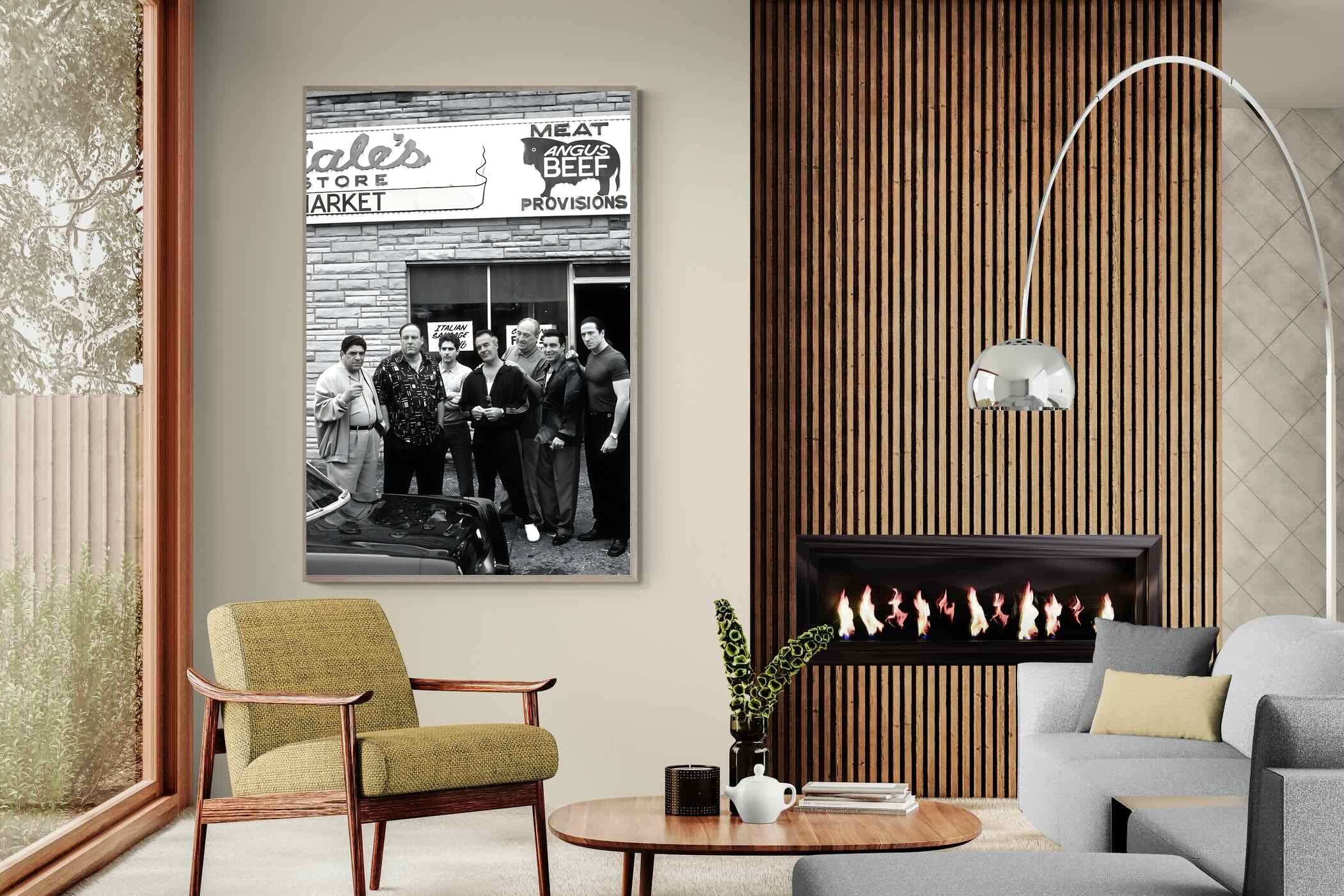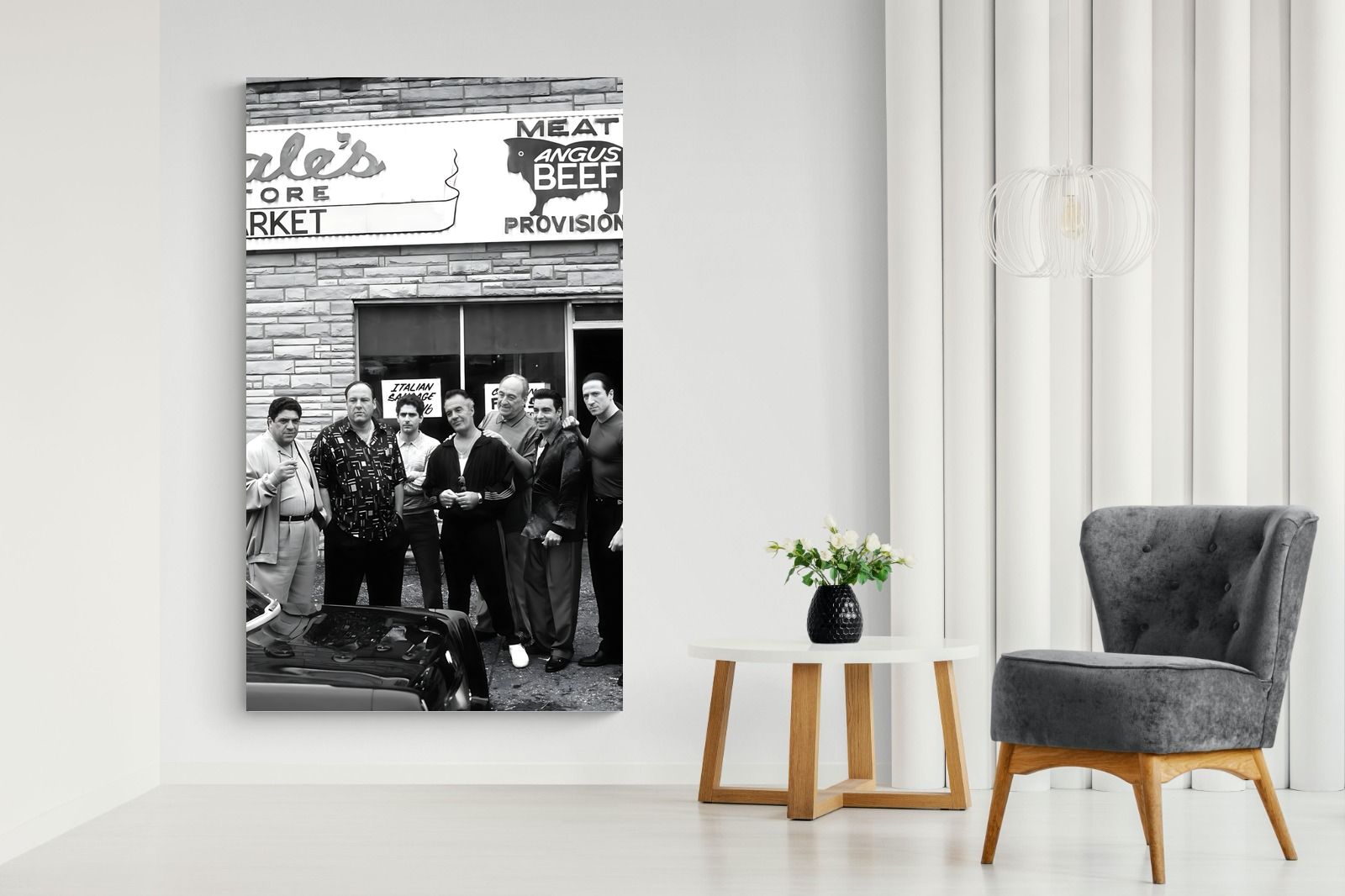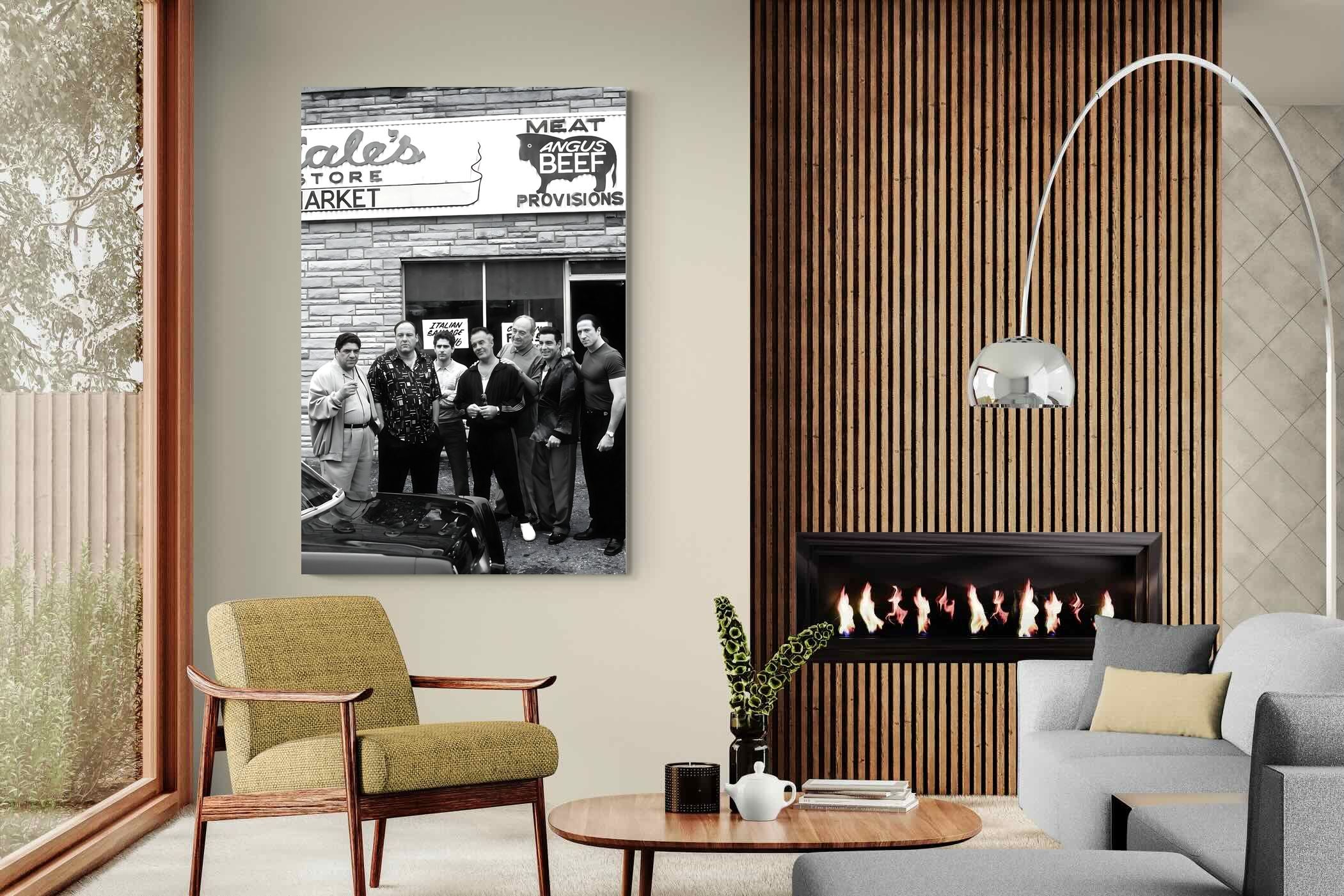 This iconic black-and-white image from The Sopranos captures the street crew outside the infamous Satriale's Pork Store. Featuring a powerful ensemble cast, the photo brings a gritty, nostalgic feel to any contemporary home. The striking contrast and nostalgic vibe make it a great choice for fans of TV history, mafia culture, and bold wall art that makes a statement.