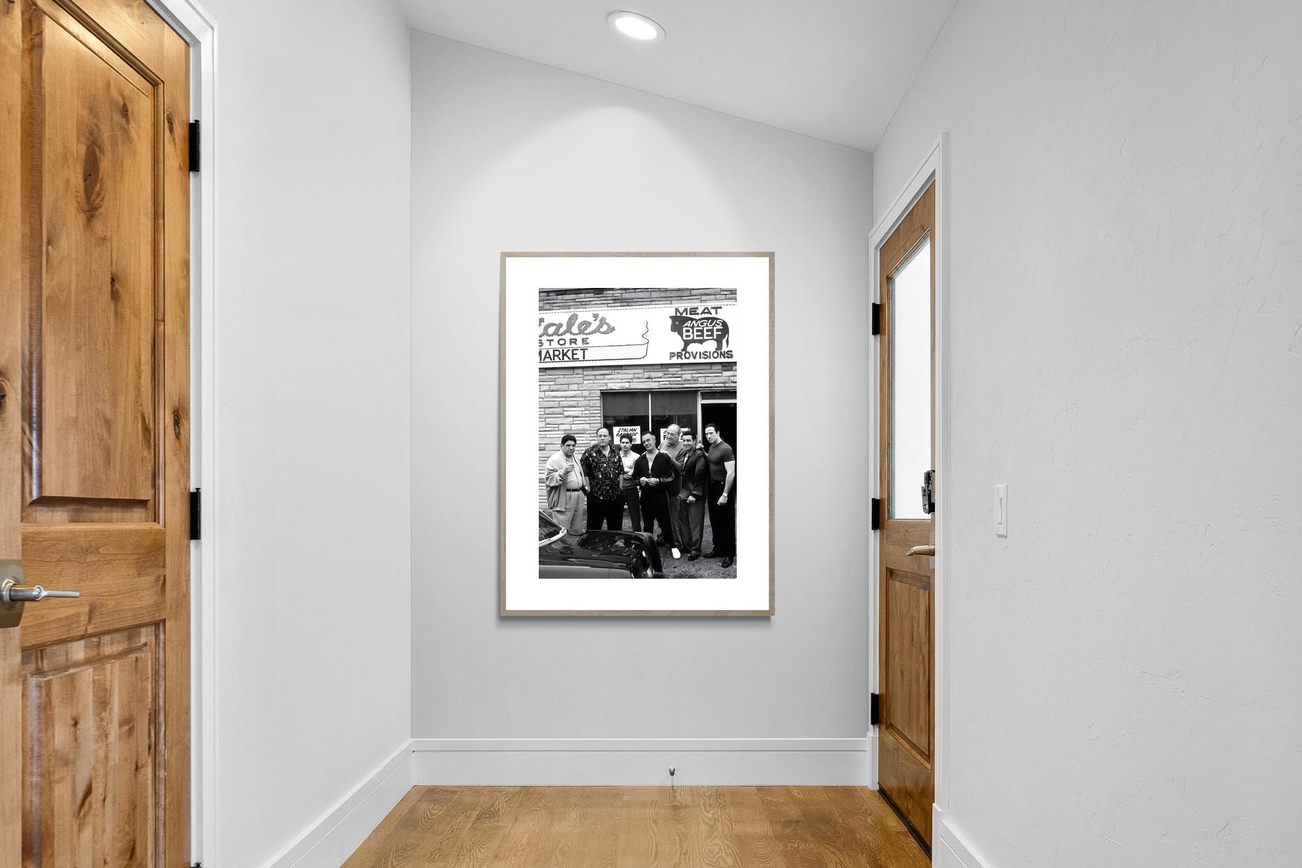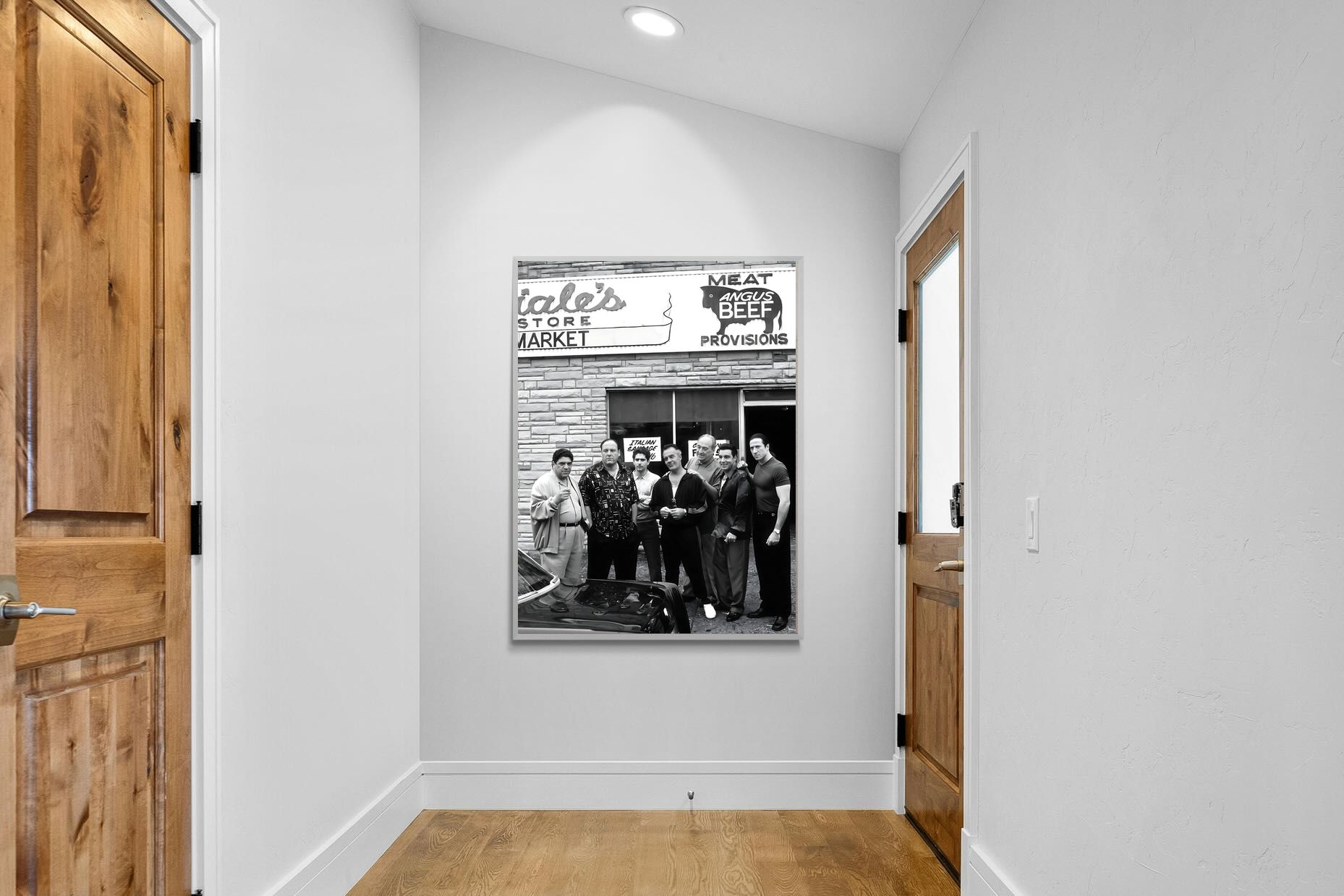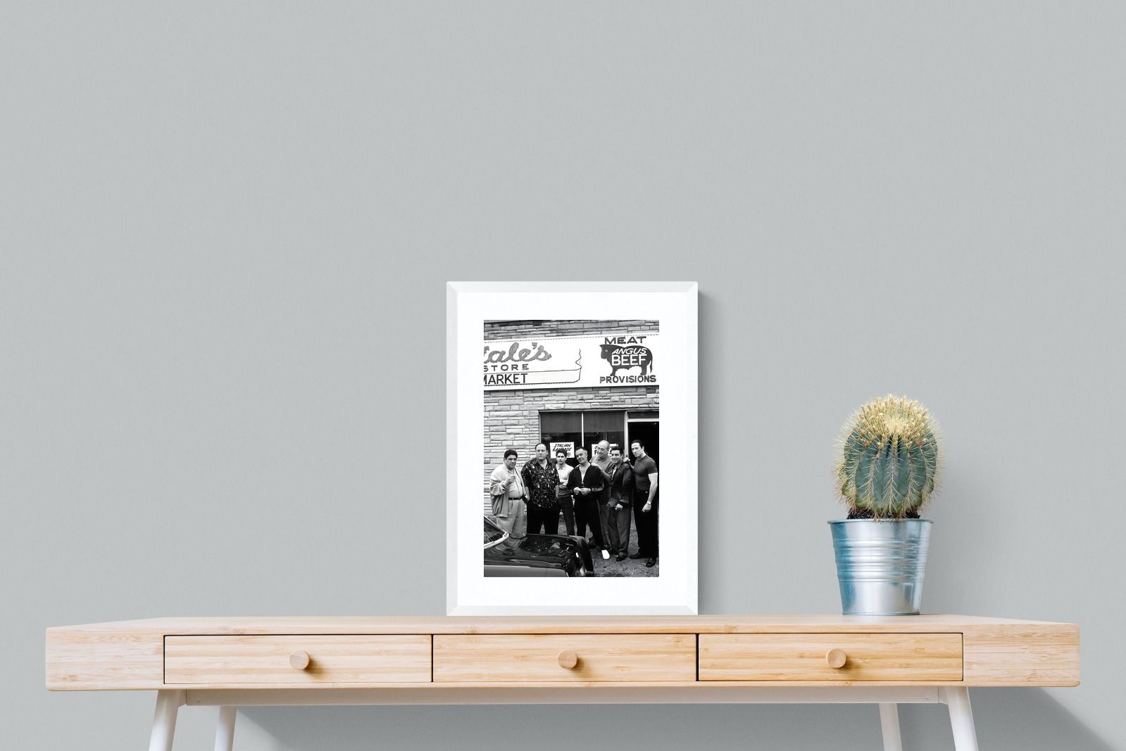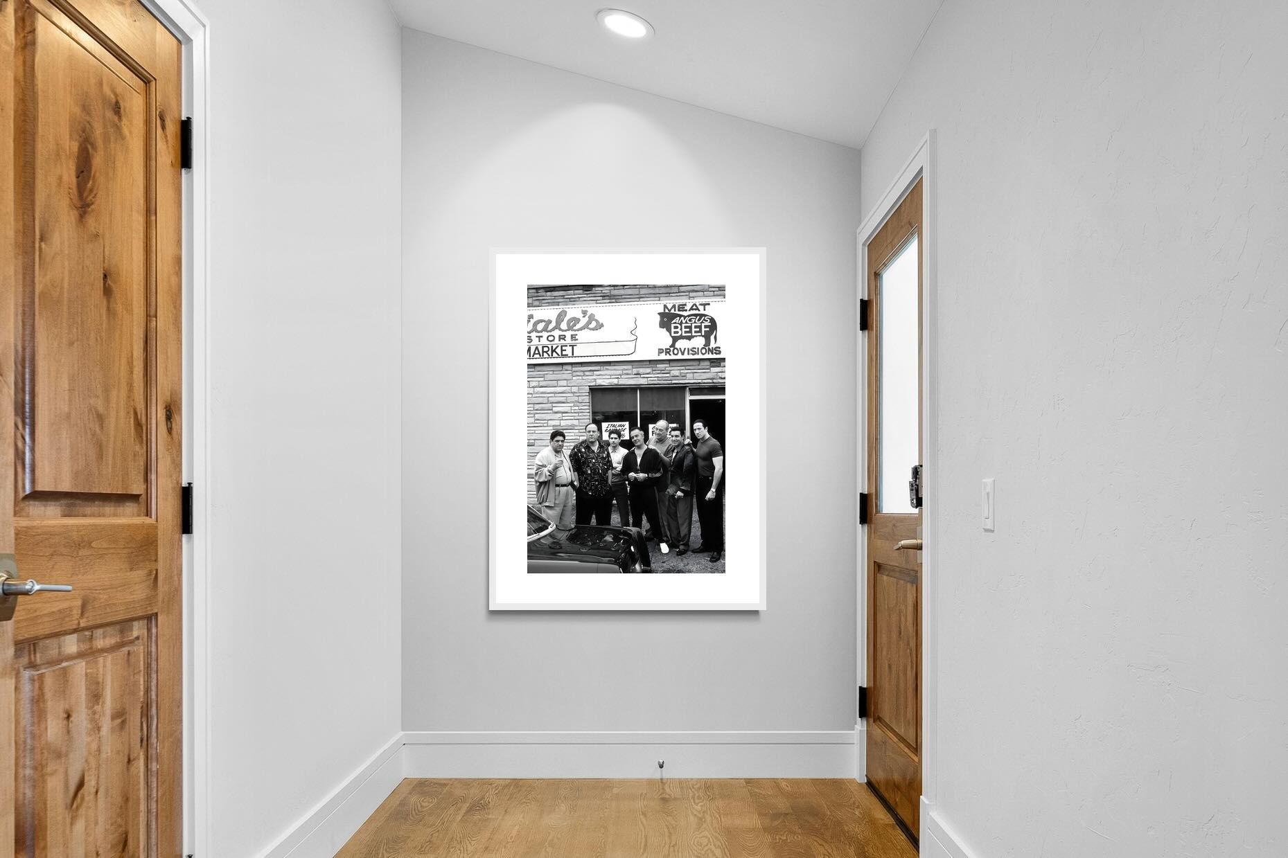 This iconic black-and-white image from The Sopranos captures the street crew outside the infamous Satriale's Pork Store. Featuring a powerful ensemble cast, the photo brings a gritty, nostalgic feel to any contemporary home. The striking contrast and nostalgic vibe make it a great choice for fans of TV history, mafia culture, and bold wall art that makes a statement.