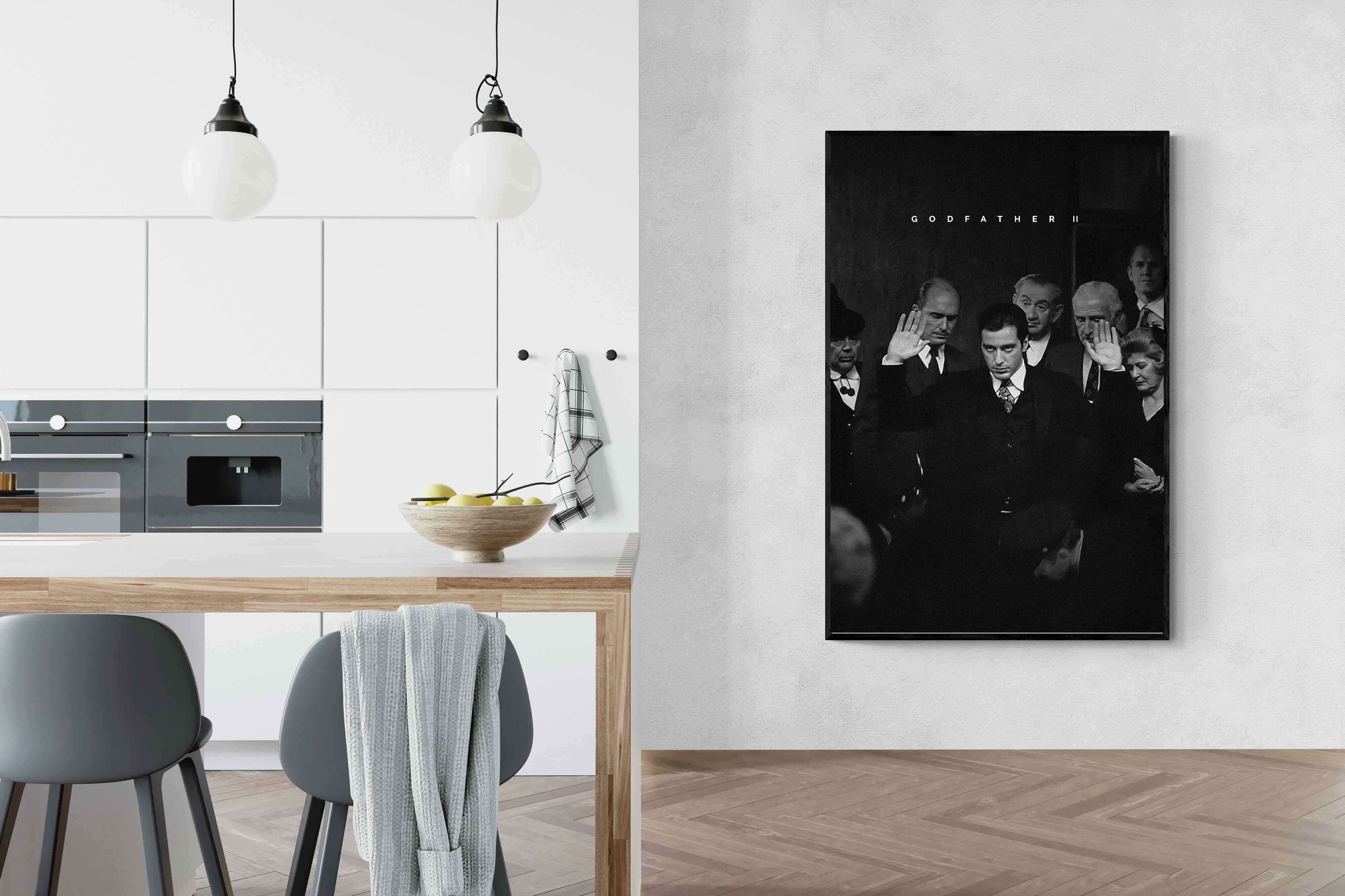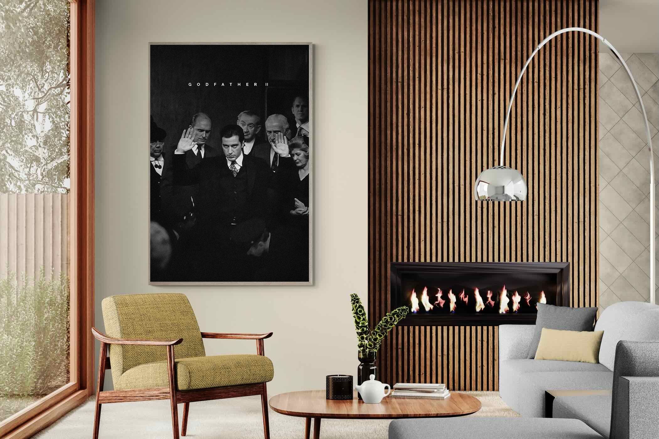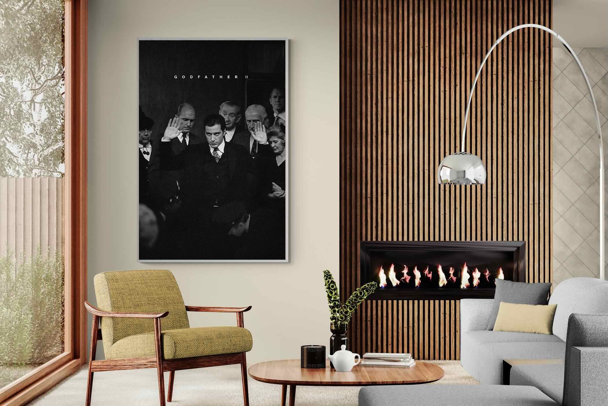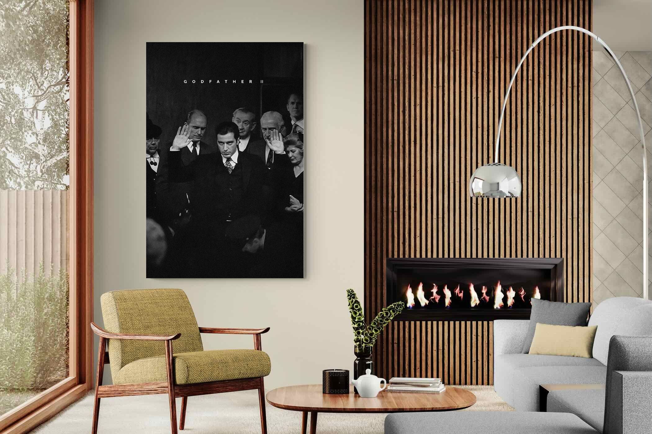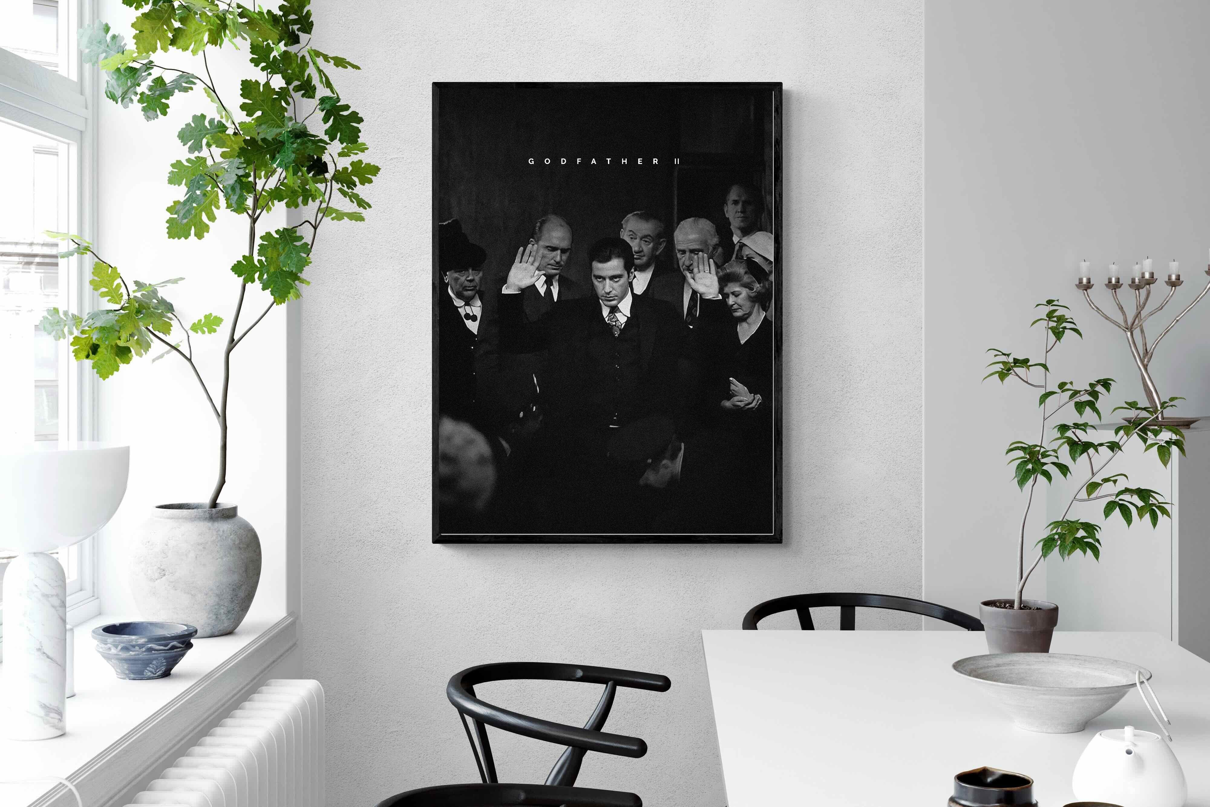 This striking black-and-white image from The Godfather II captures Michael Corleone's chilling moment of power, an iconic scene in cinema. His intense stare and the dramatic courtroom setting make it a compelling piece for any home. Perfect for a contemporary living space, this print adds sophistication and drama, making it a must-have for film enthusiasts and lovers of powerful, cinematic moments.