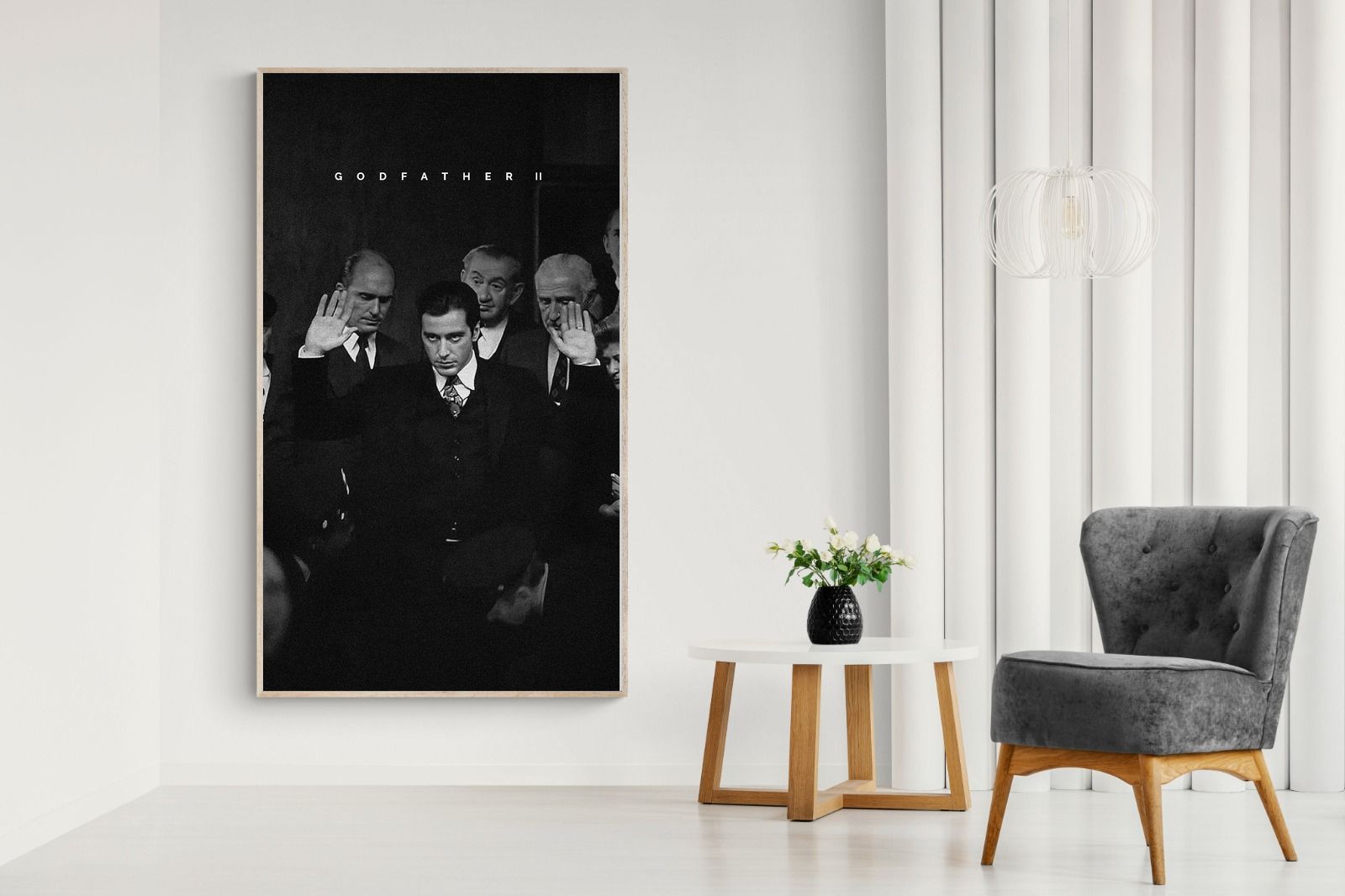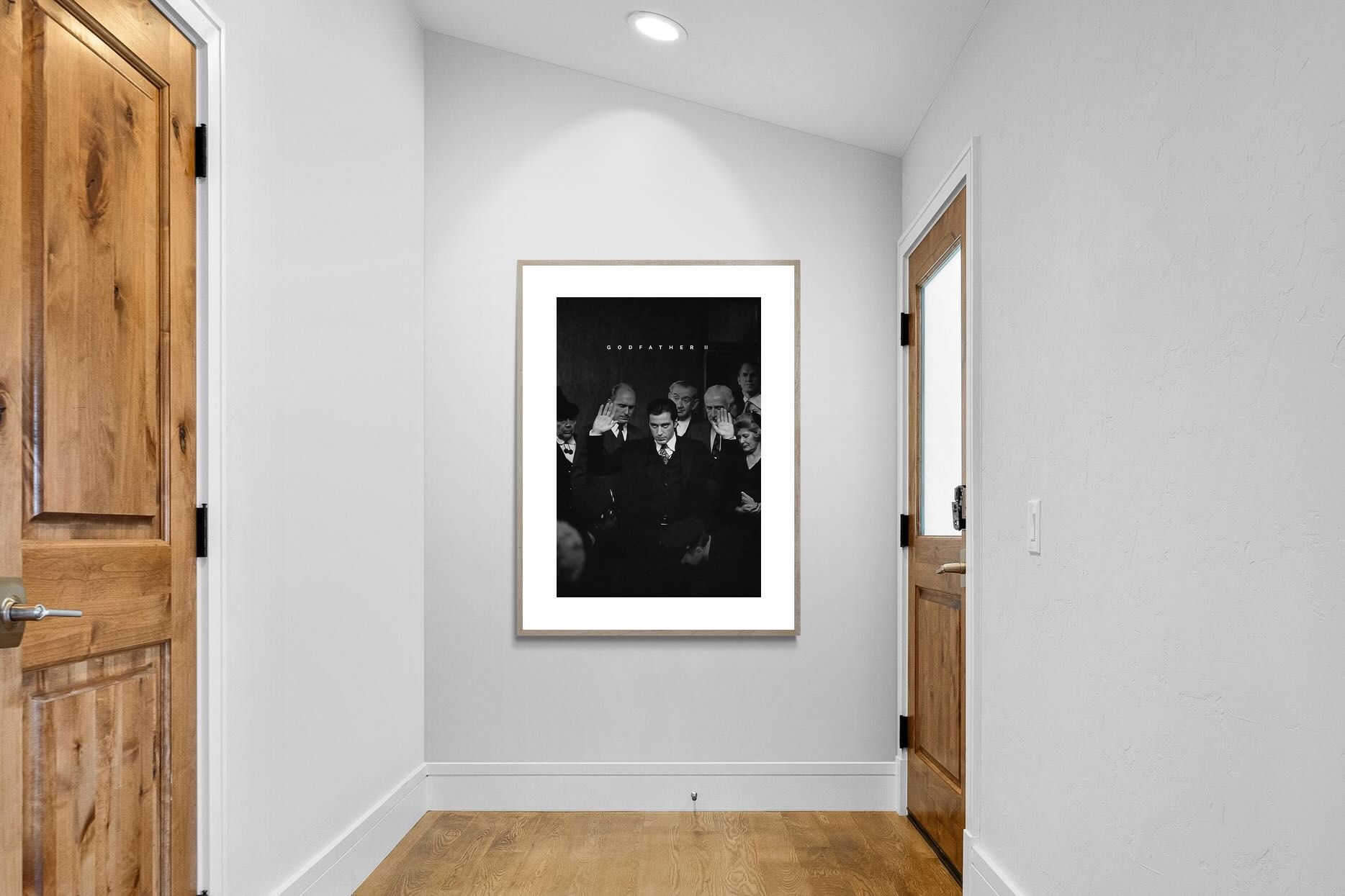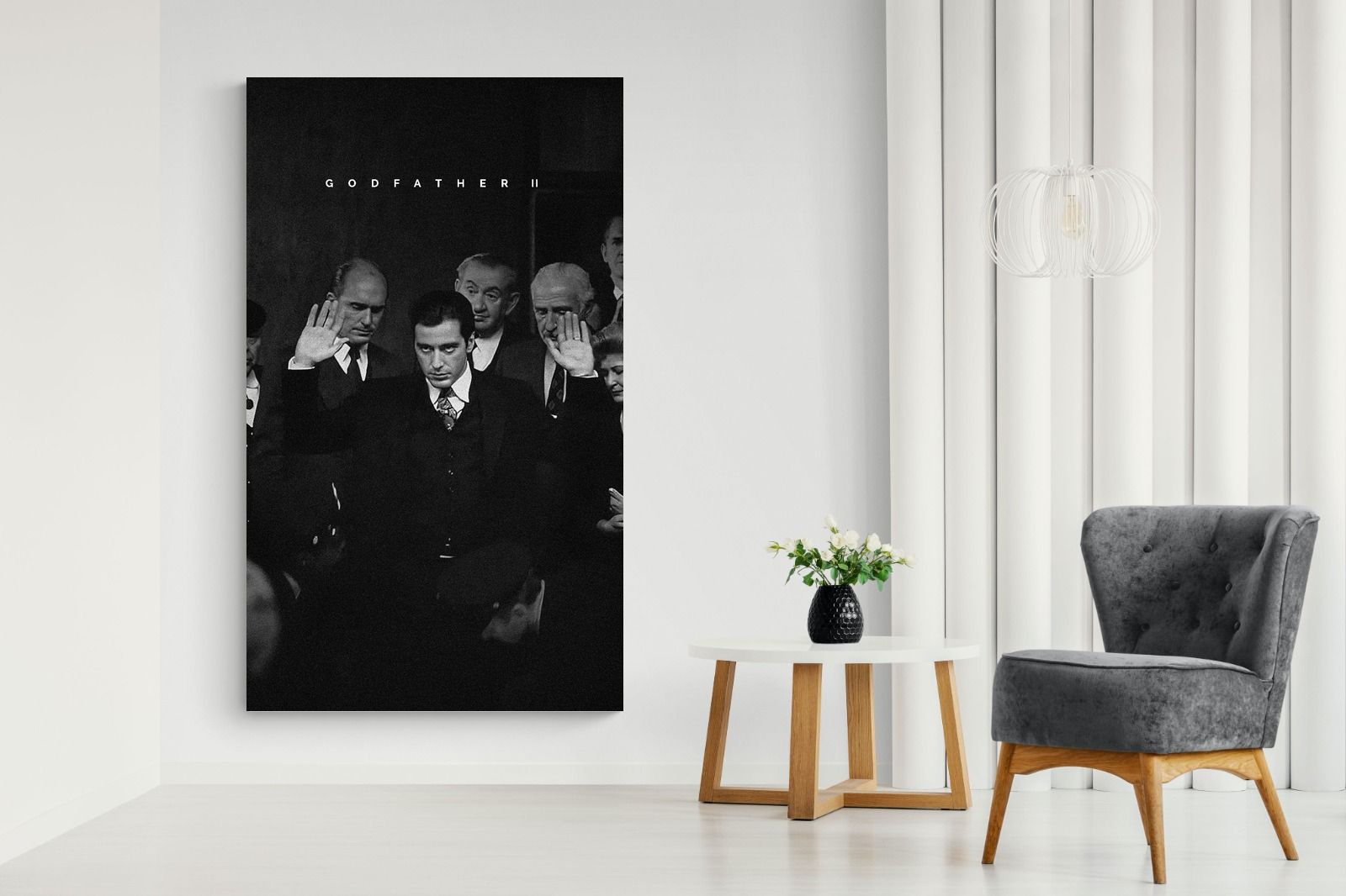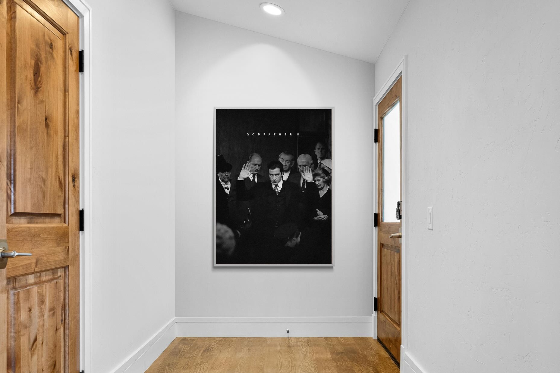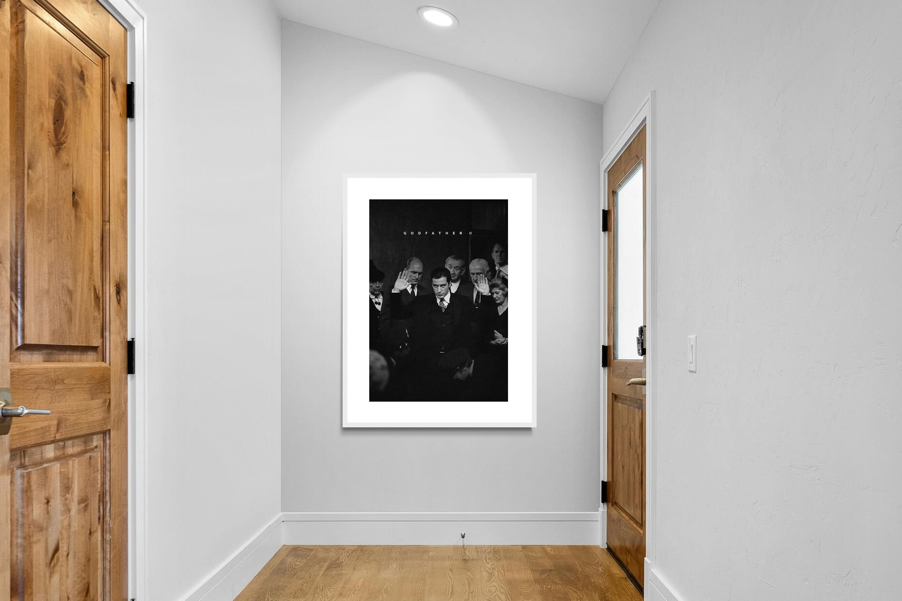 This striking black-and-white image from The Godfather II captures Michael Corleone's chilling moment of power, an iconic scene in cinema. His intense stare and the dramatic courtroom setting make it a compelling piece for any home. Perfect for a contemporary living space, this print adds sophistication and drama, making it a must-have for film enthusiasts and lovers of powerful, cinematic moments.
