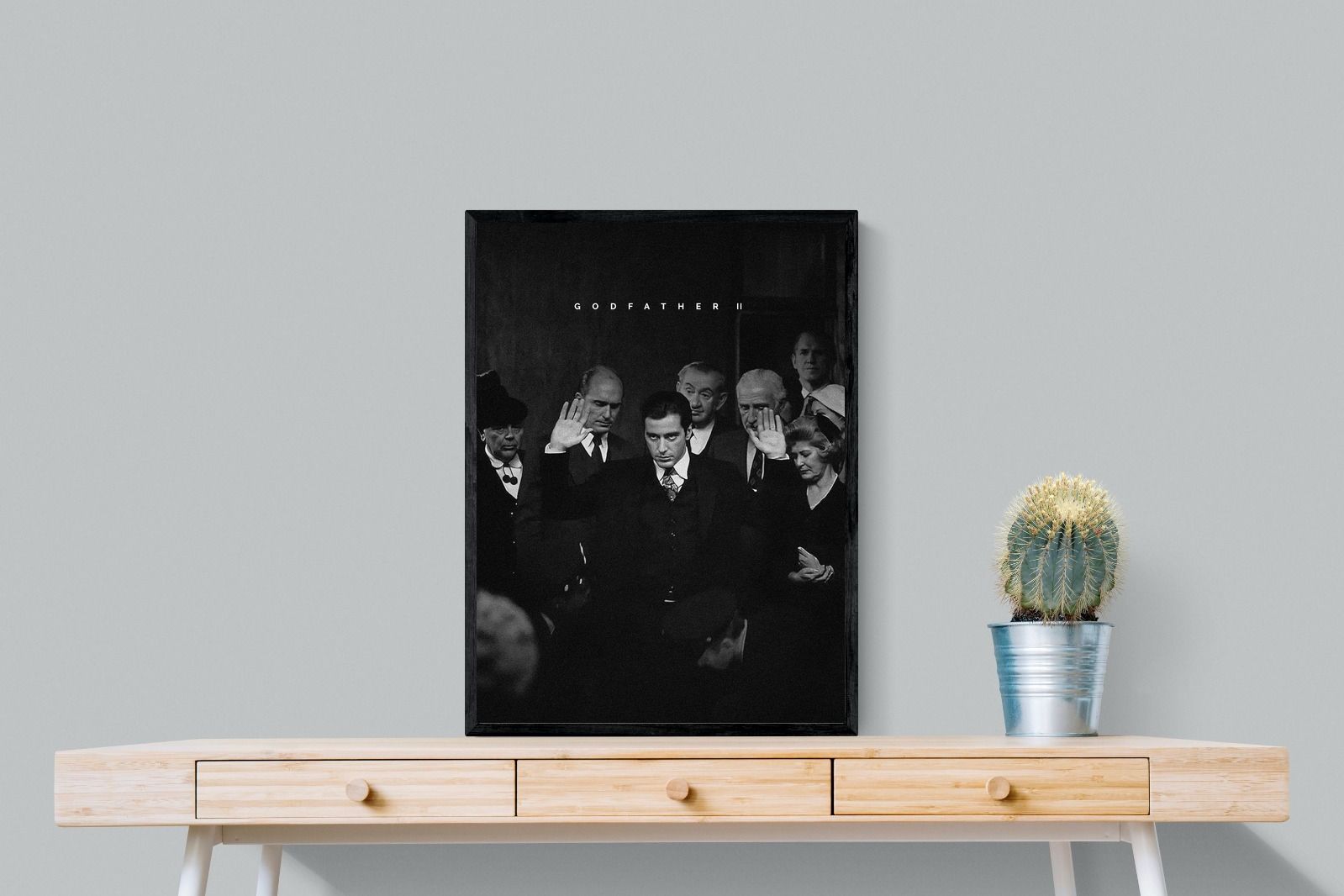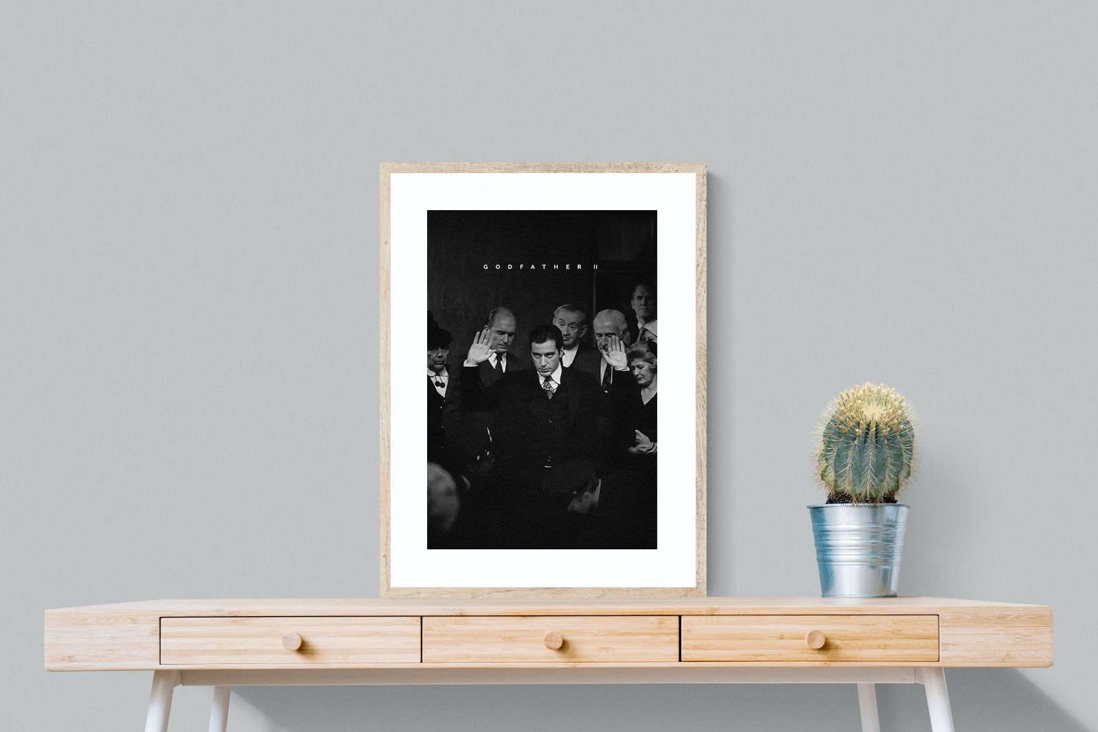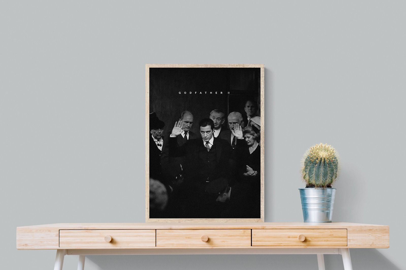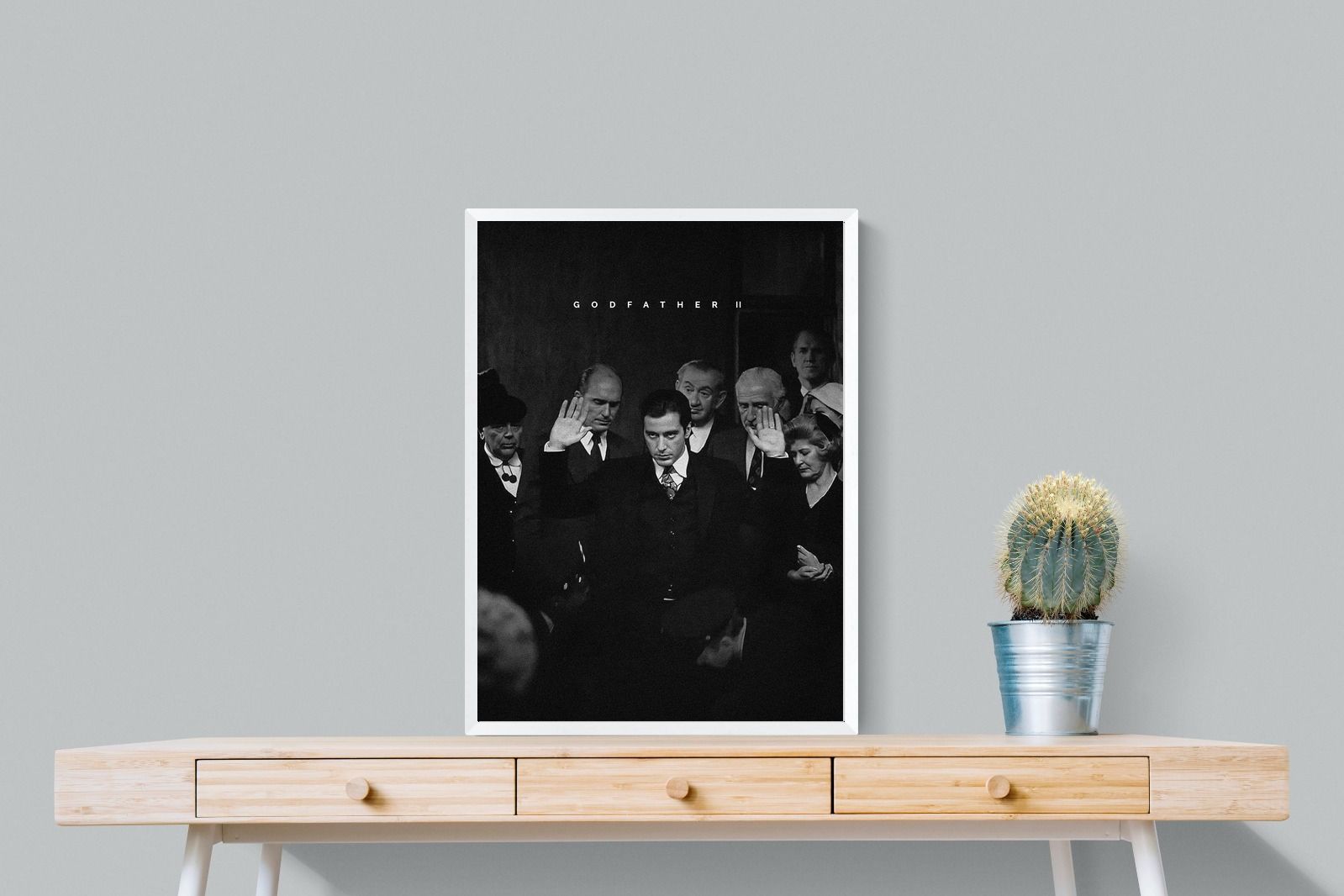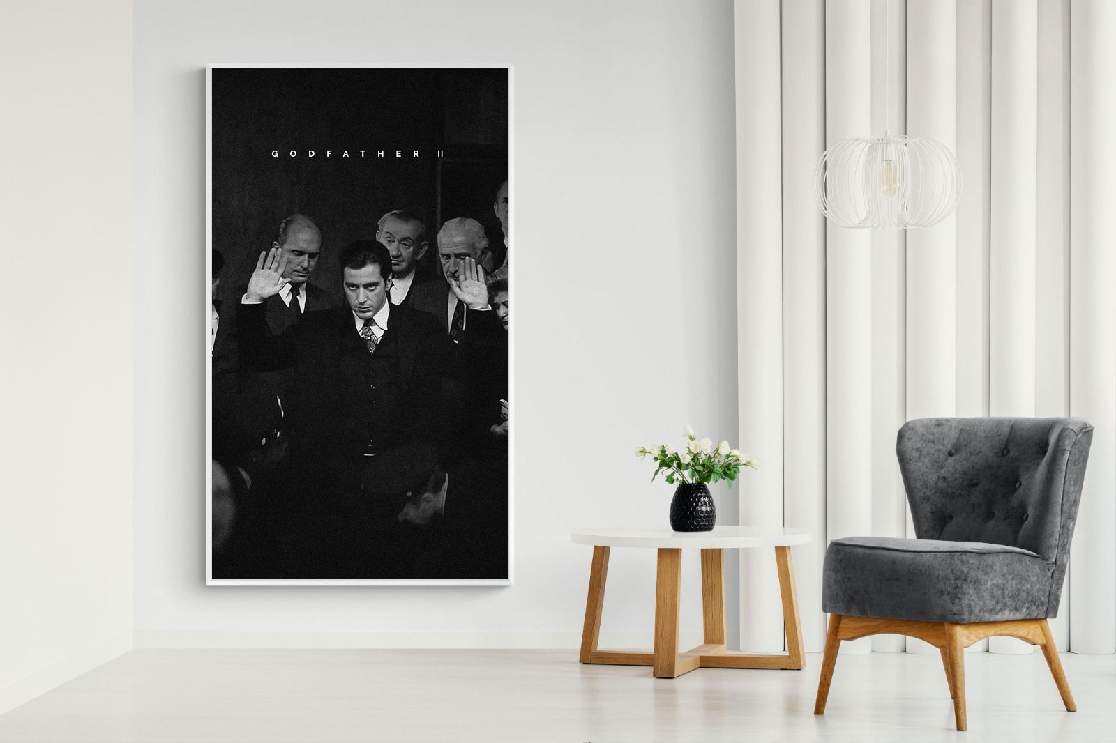 This striking black-and-white image from The Godfather II captures Michael Corleone's chilling moment of power, an iconic scene in cinema. His intense stare and the dramatic courtroom setting make it a compelling piece for any home. Perfect for a contemporary living space, this print adds sophistication and drama, making it a must-have for film enthusiasts and lovers of powerful, cinematic moments.