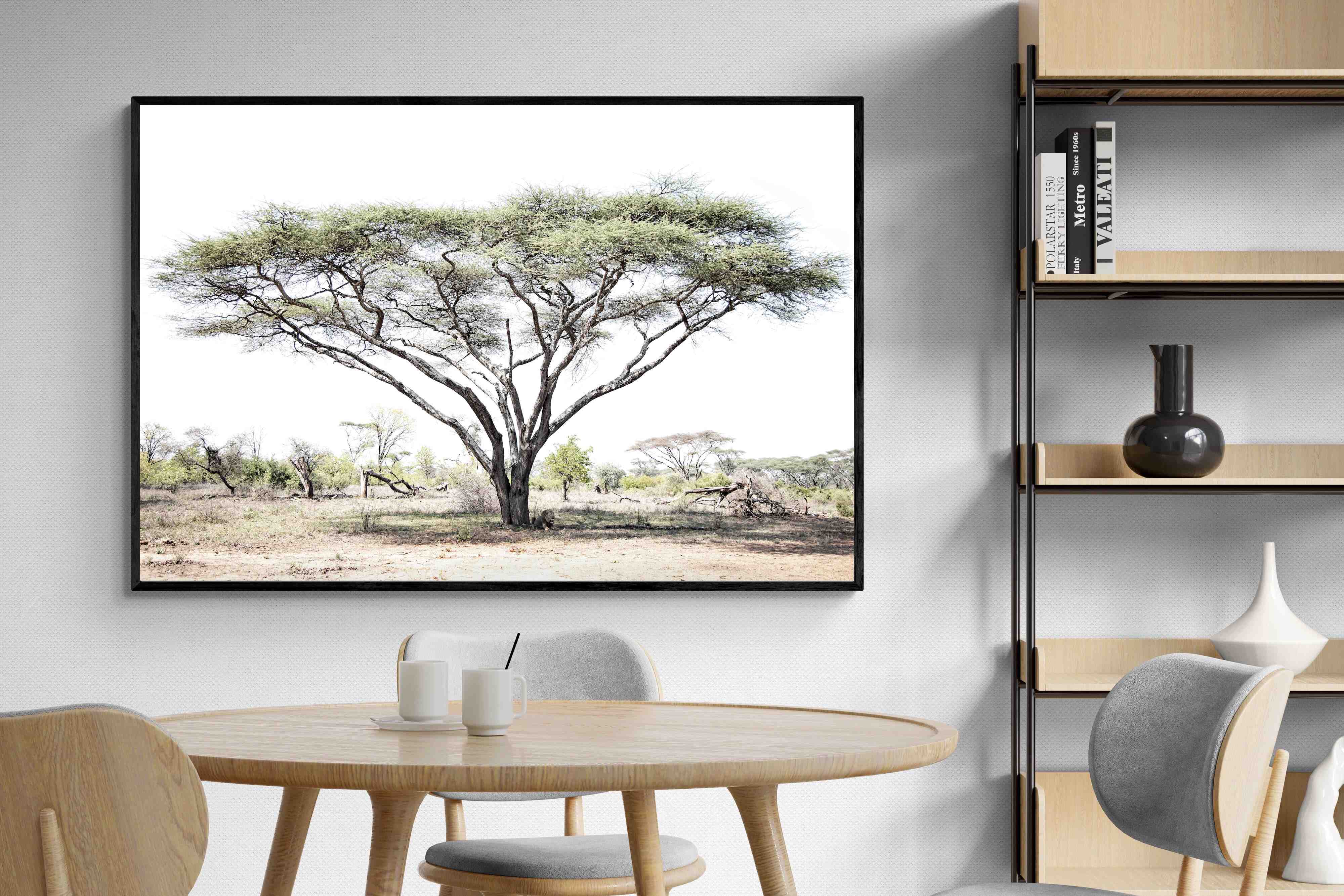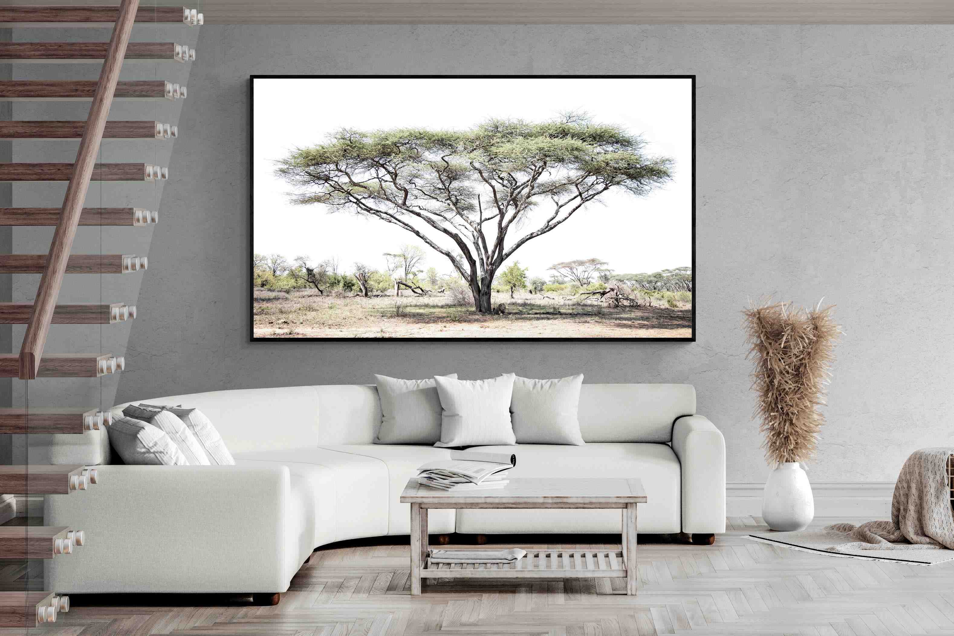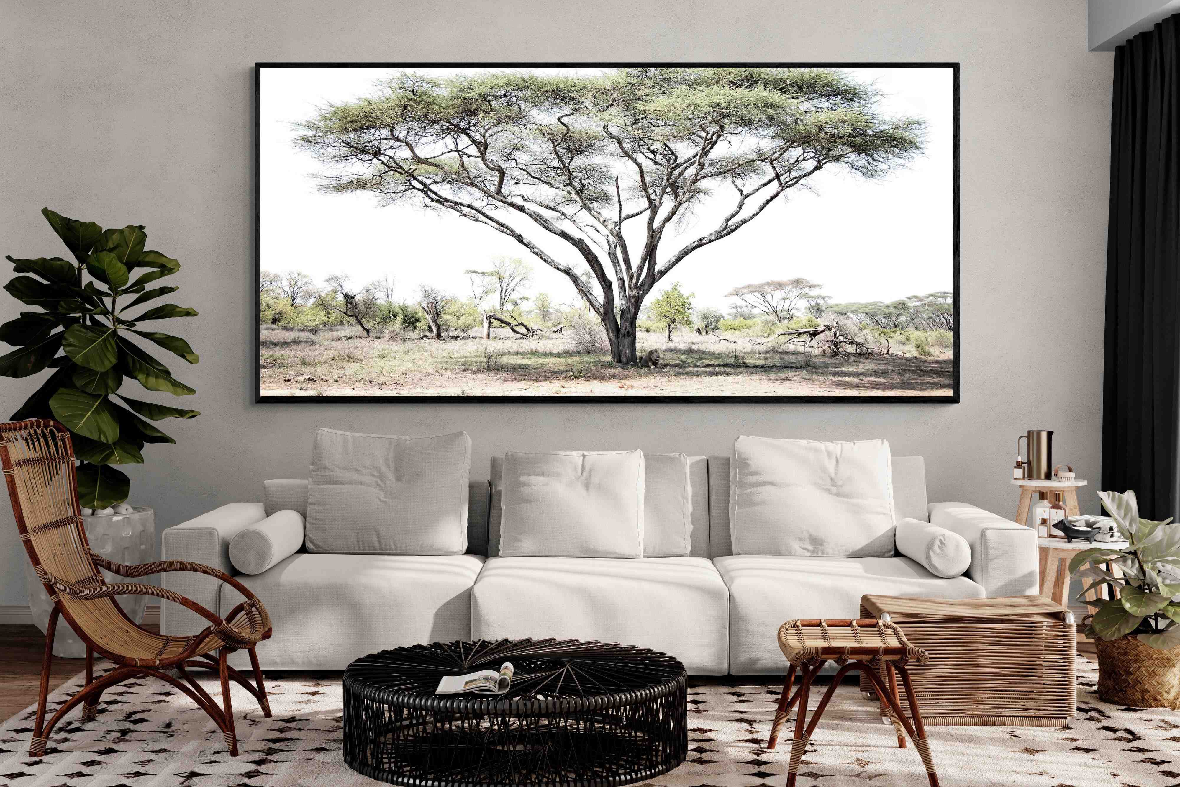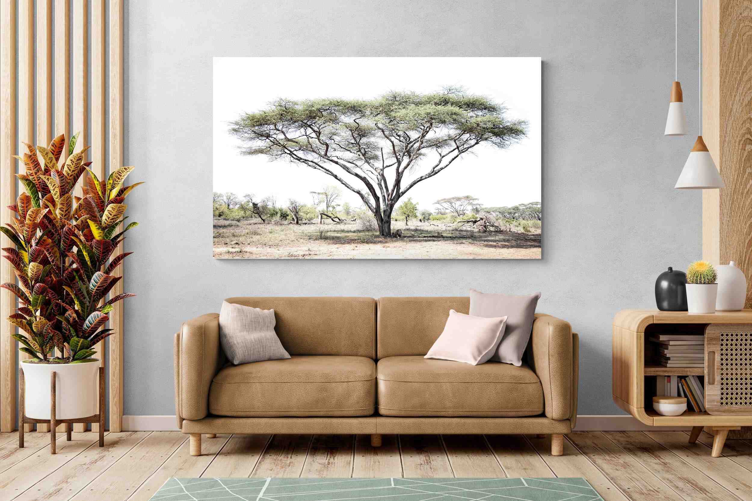 Embark on a journey into the heart of the African savannah with "Lion Under Umbrella Tree", a striking photograph capturing the serenity and grandeur of Zimbabwe’s wilderness. This evocative image portrays a lone lion beneath an iconic umbrella tree, blending muted tones with soft contrasts to highlight the lion’s regal poise against the vast landscape.