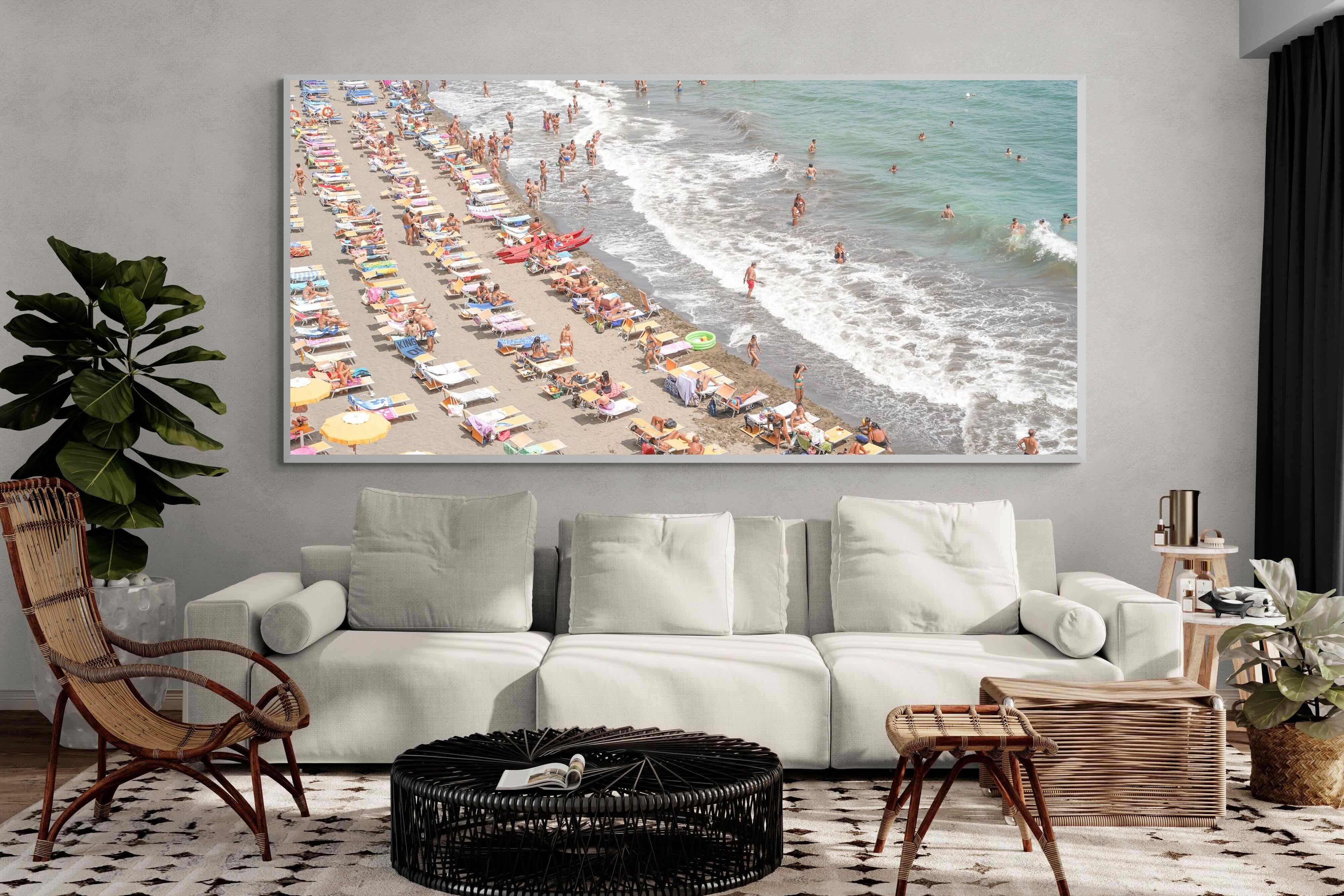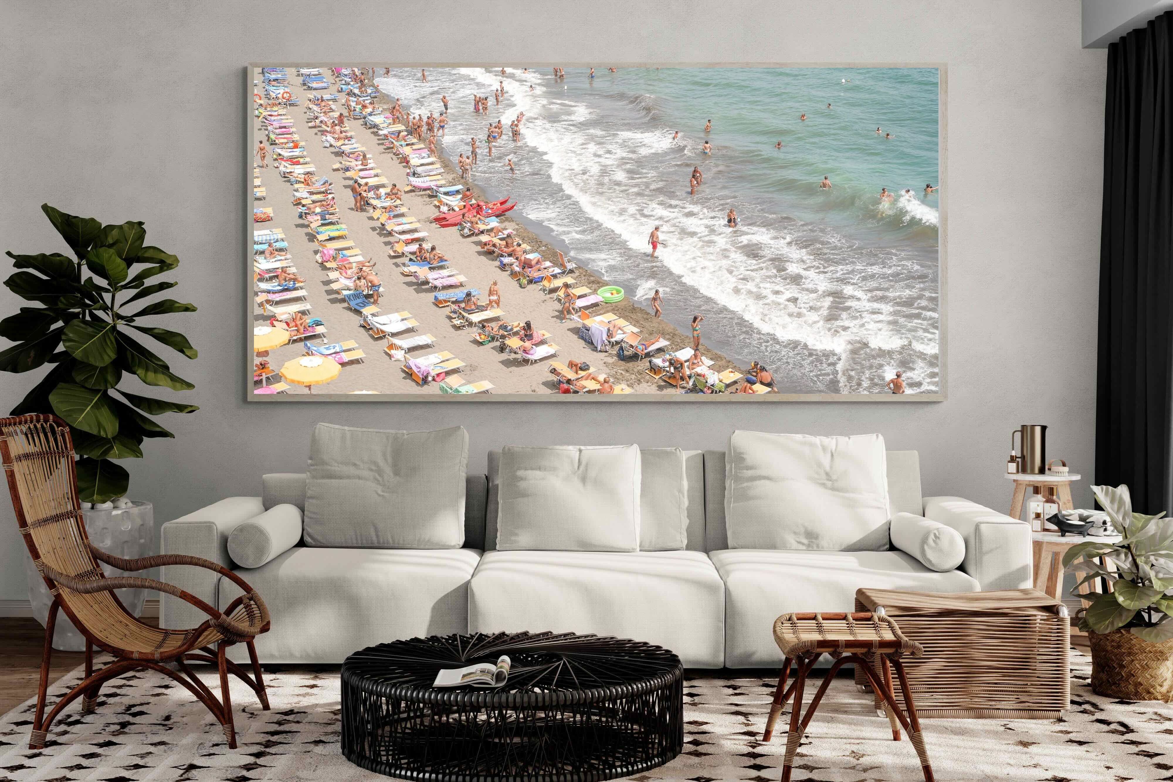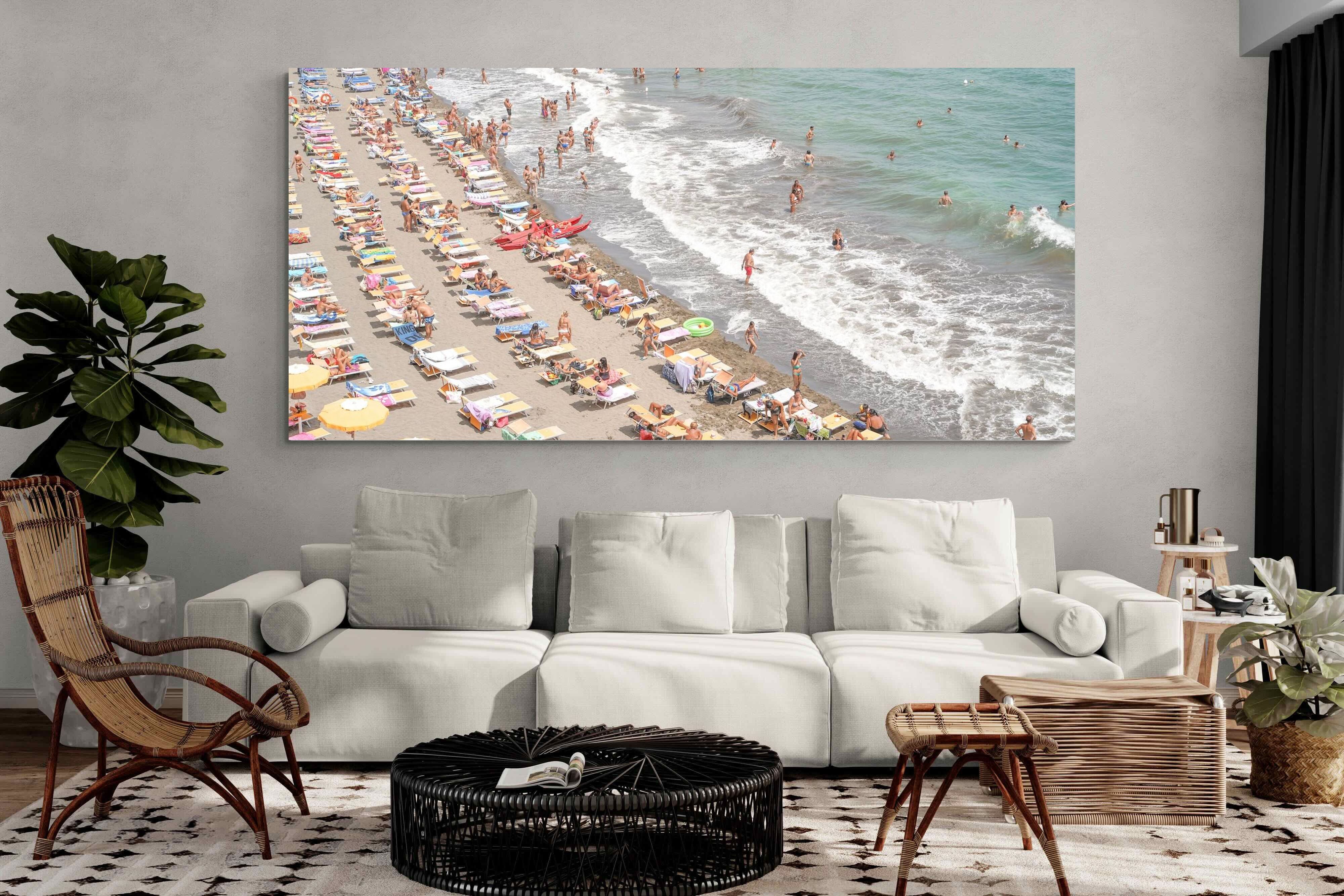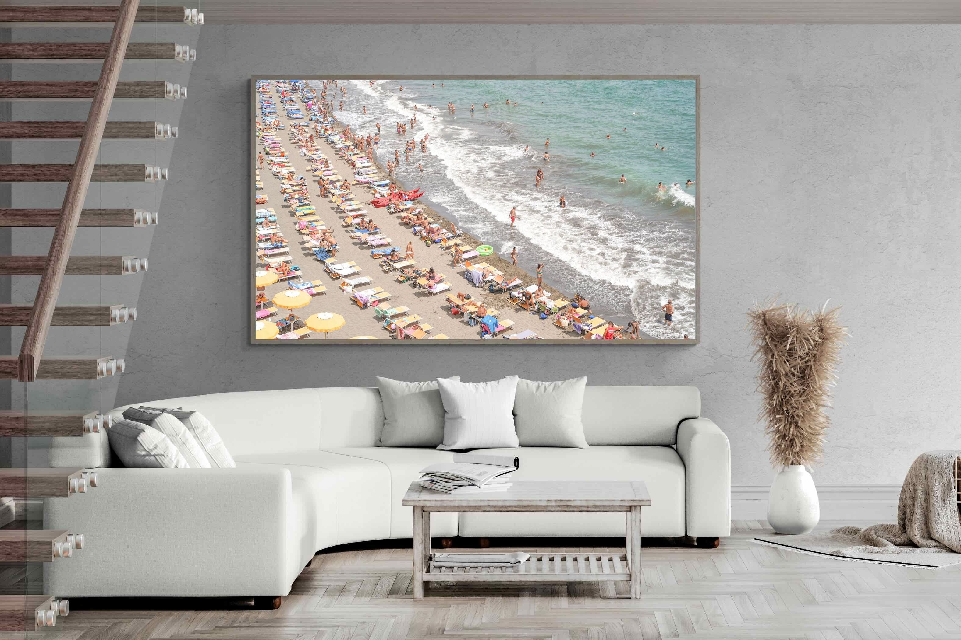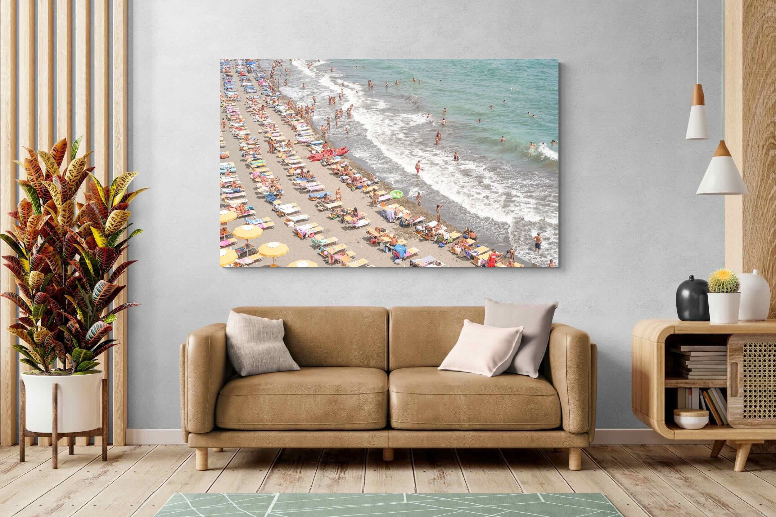 Rows of pastel loungers line the shoreline as waves fold gently onto the sand, capturing the lively rhythm of an Italian summer afternoon. The soft, sun-washed tones balance colour with refinement, preventing the scene from feeling chaotic. Ideal for relaxed living rooms, holiday homes or vibrant coastal interiors, this artwork introduces movement and warmth while maintaining a curated, editorial finish.