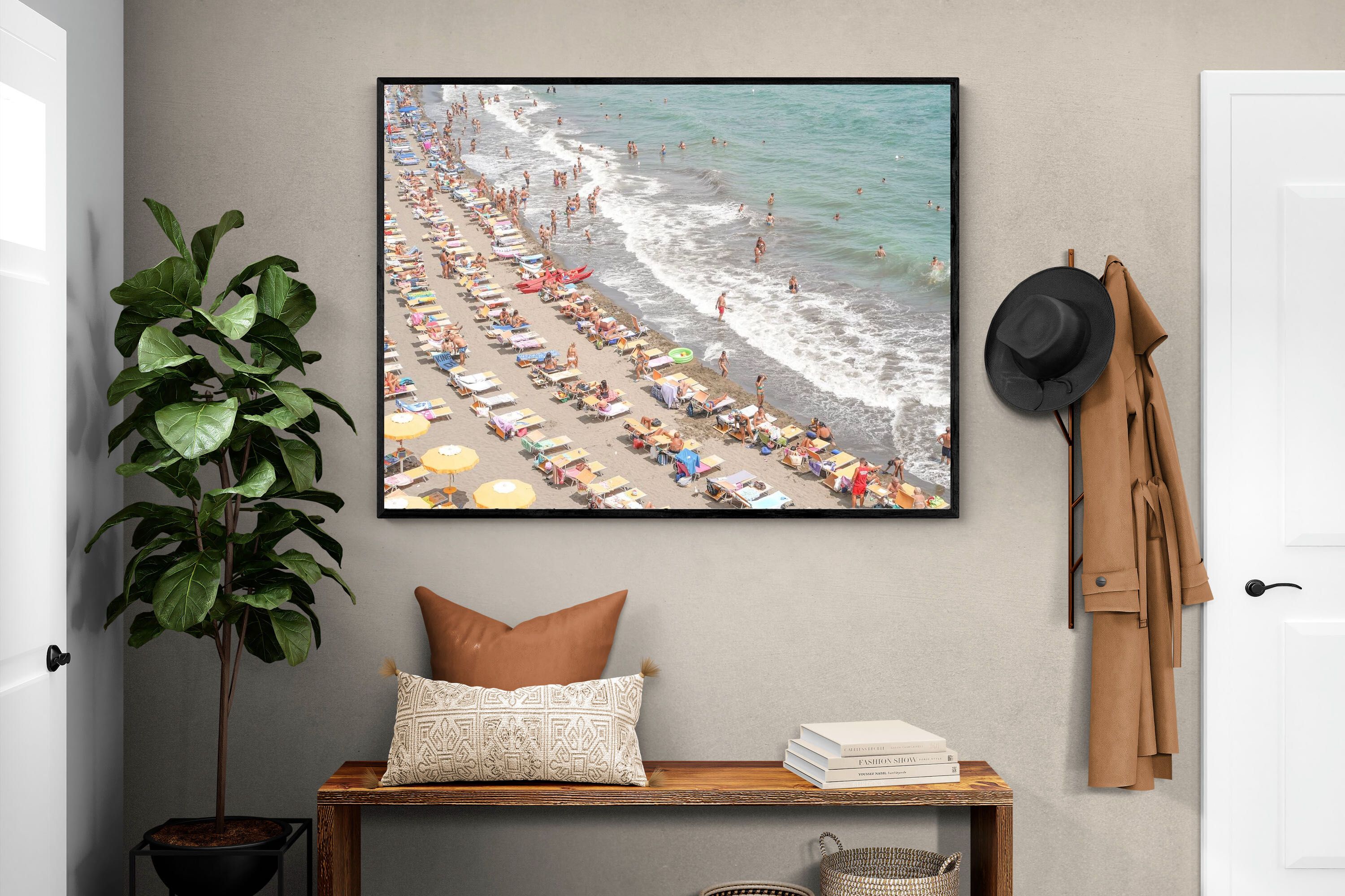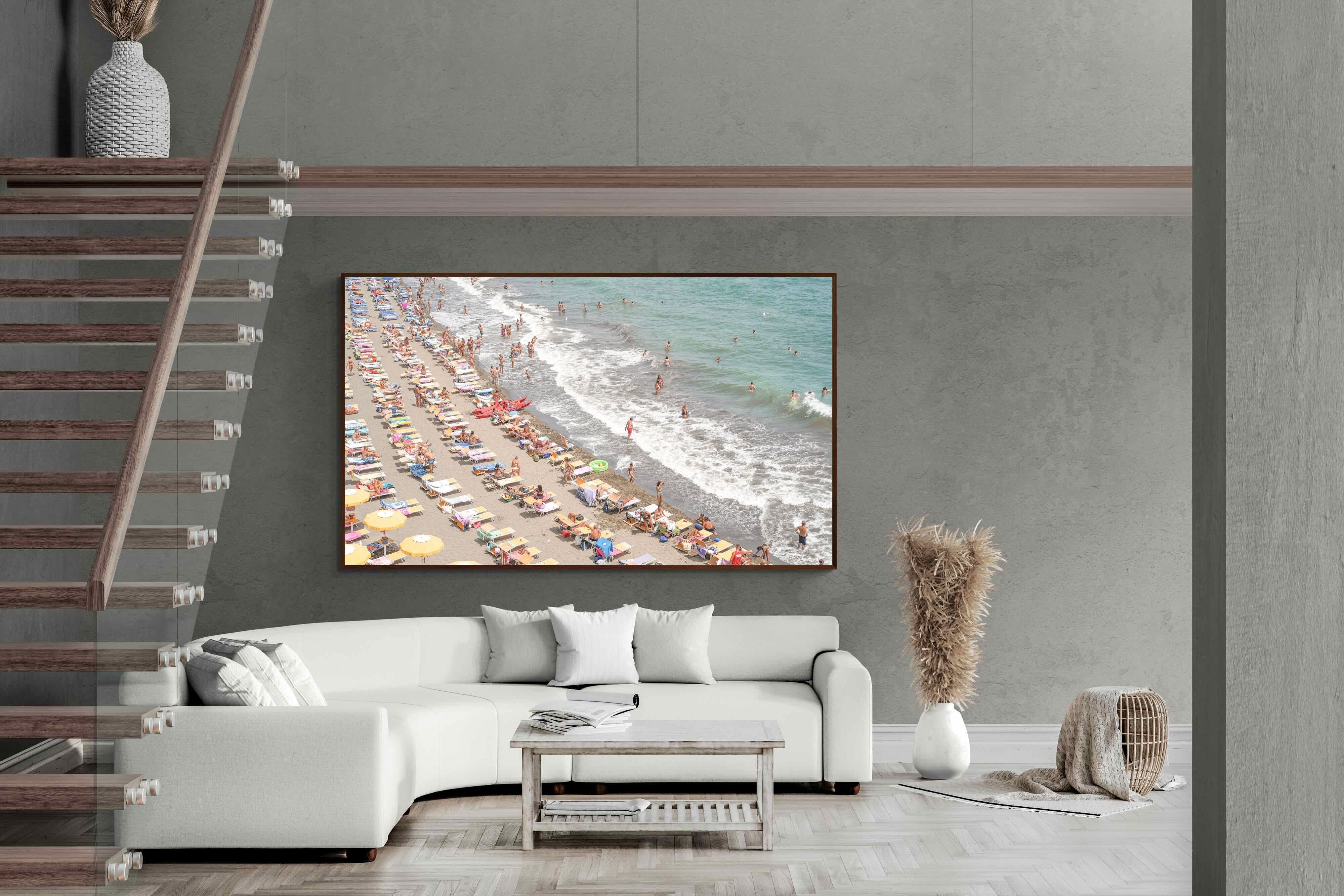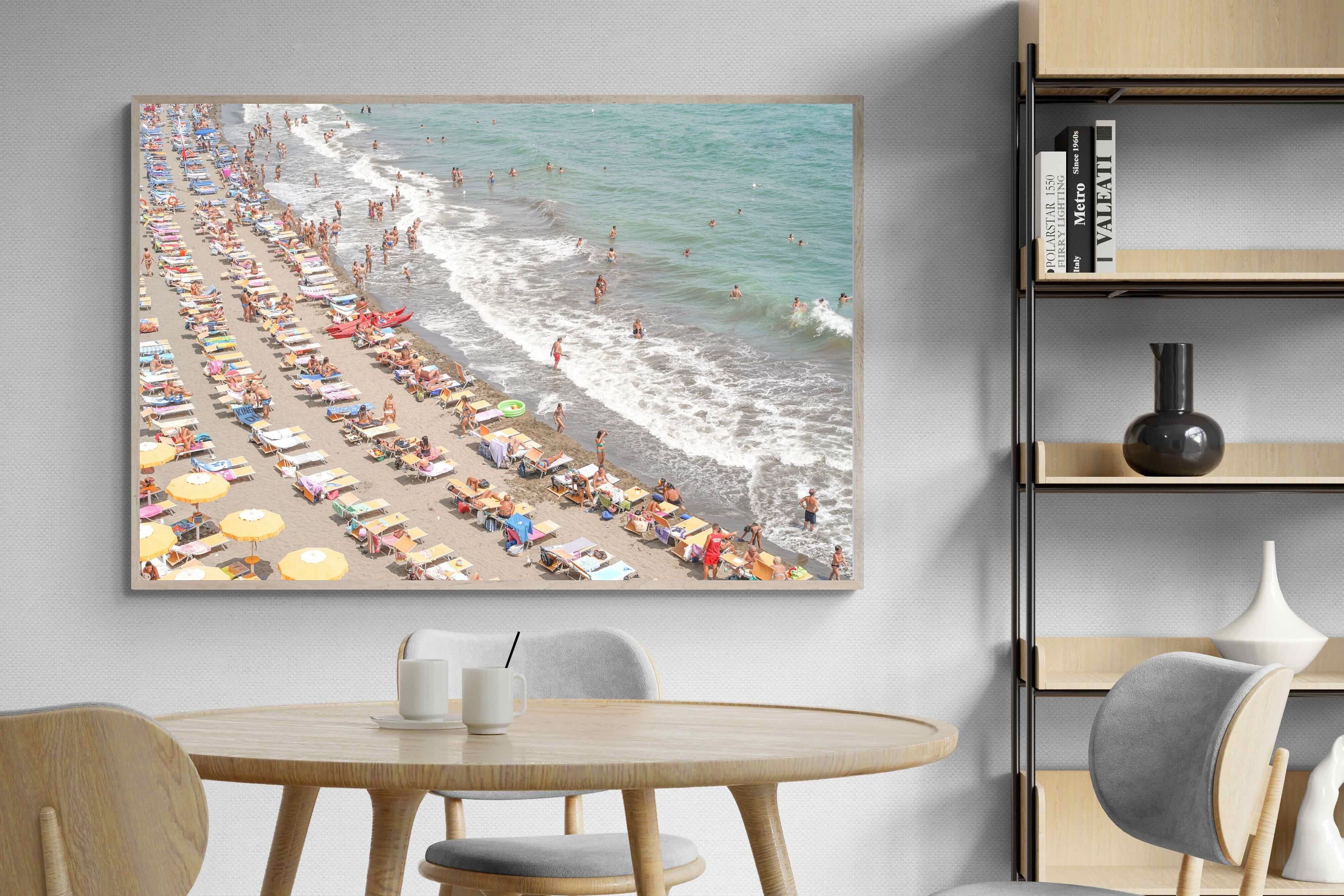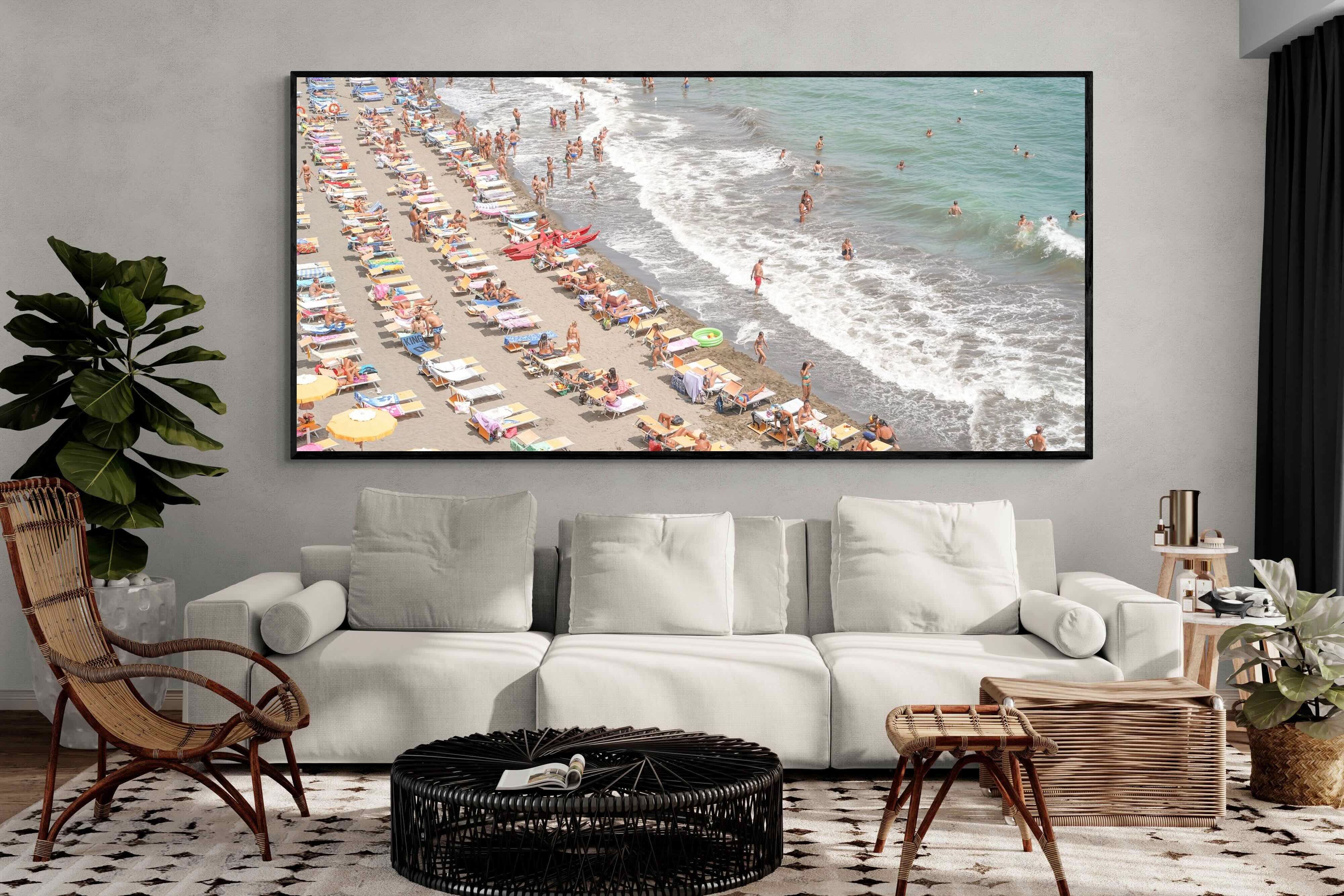 Rows of pastel loungers line the shoreline as waves fold gently onto the sand, capturing the lively rhythm of an Italian summer afternoon. The soft, sun-washed tones balance colour with refinement, preventing the scene from feeling chaotic. Ideal for relaxed living rooms, holiday homes or vibrant coastal interiors, this artwork introduces movement and warmth while maintaining a curated, editorial finish.