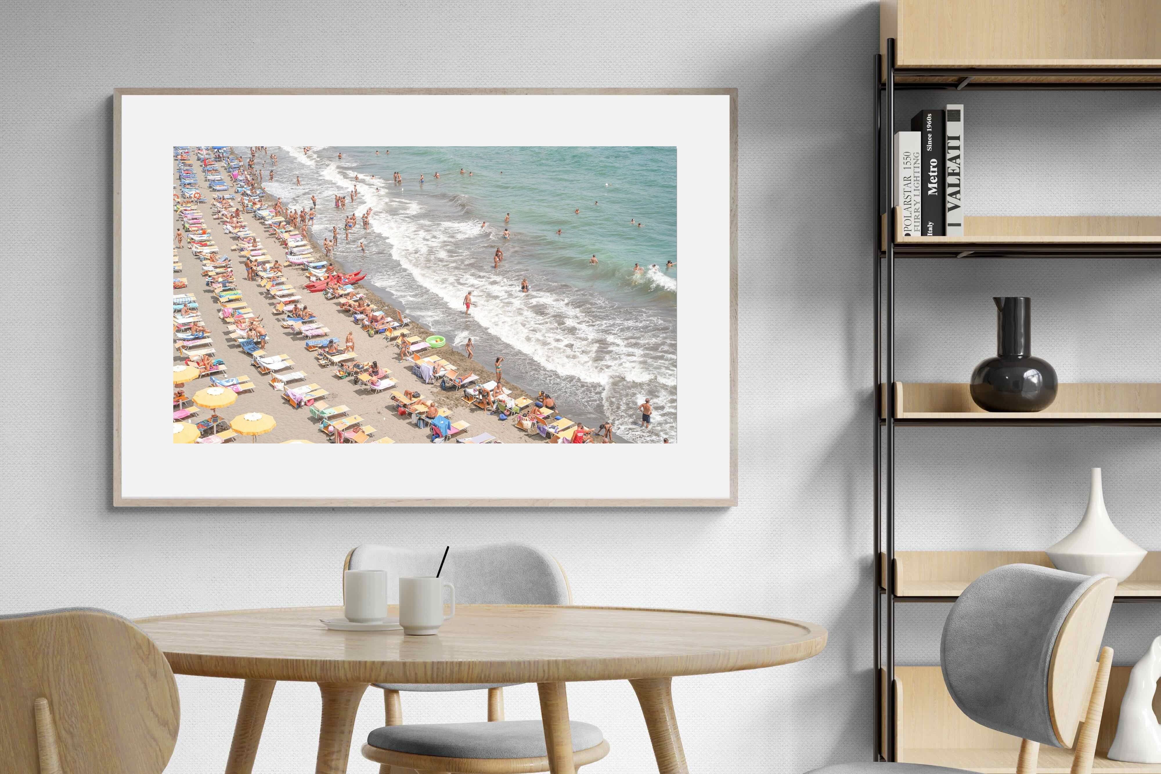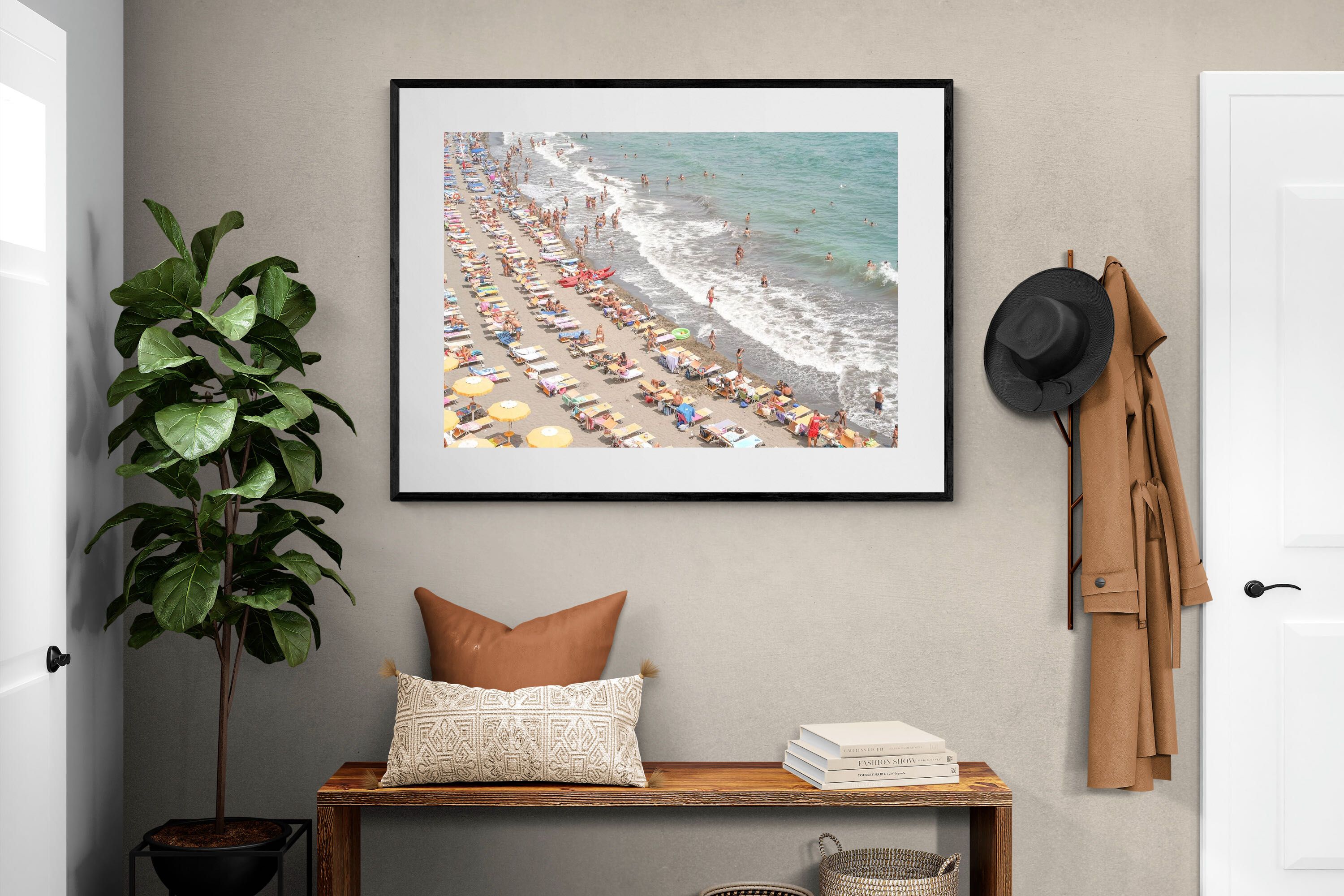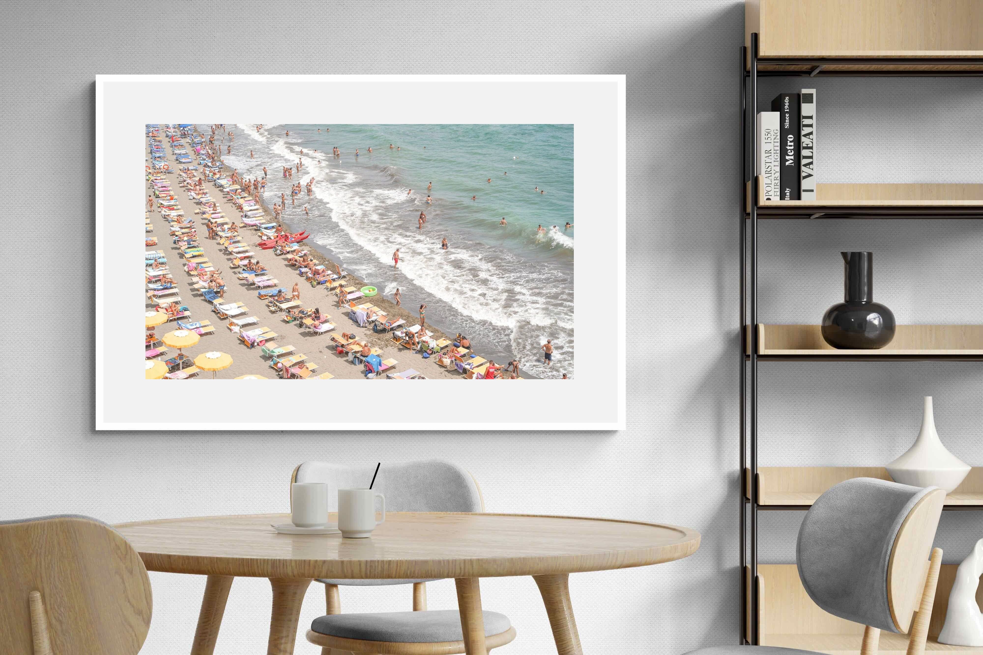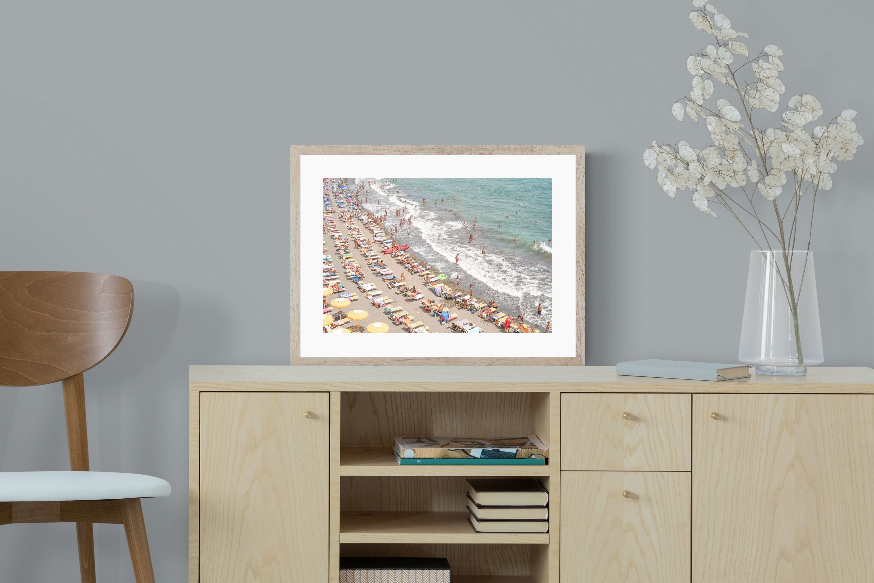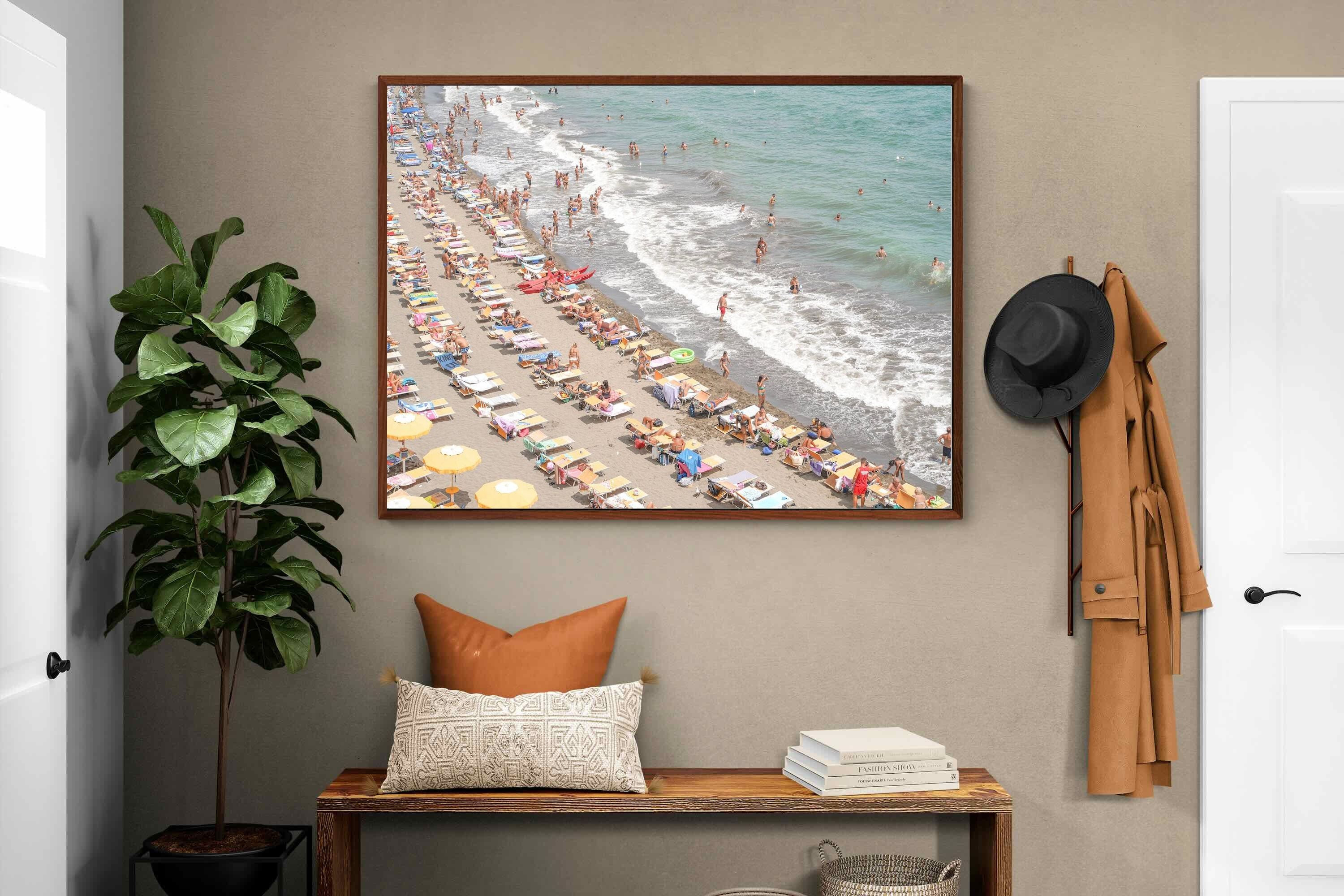 Rows of pastel loungers line the shoreline as waves fold gently onto the sand, capturing the lively rhythm of an Italian summer afternoon. The soft, sun-washed tones balance colour with refinement, preventing the scene from feeling chaotic. Ideal for relaxed living rooms, holiday homes or vibrant coastal interiors, this artwork introduces movement and warmth while maintaining a curated, editorial finish.
