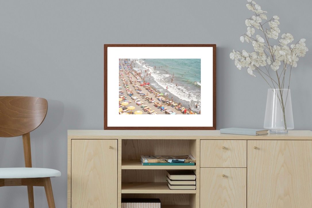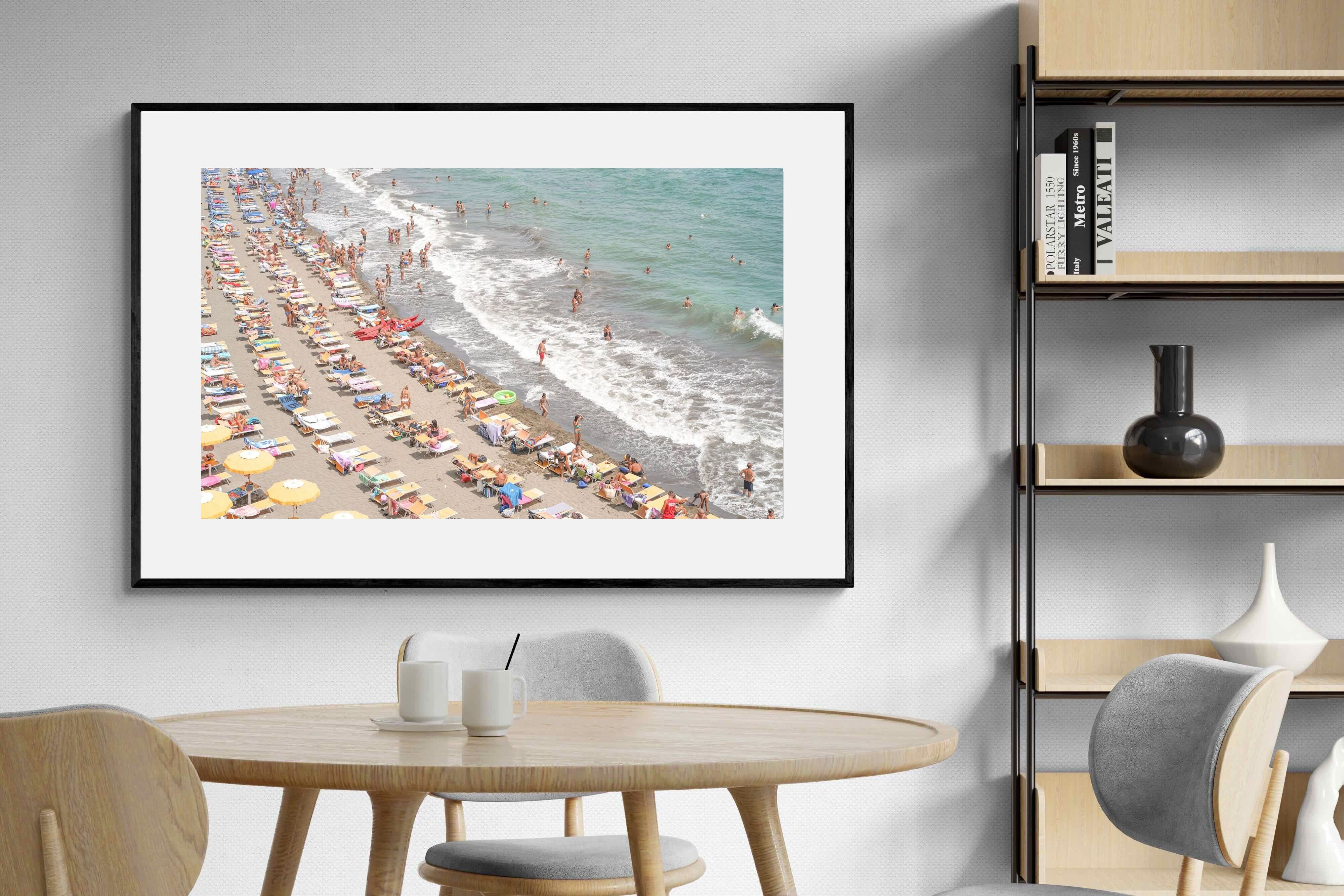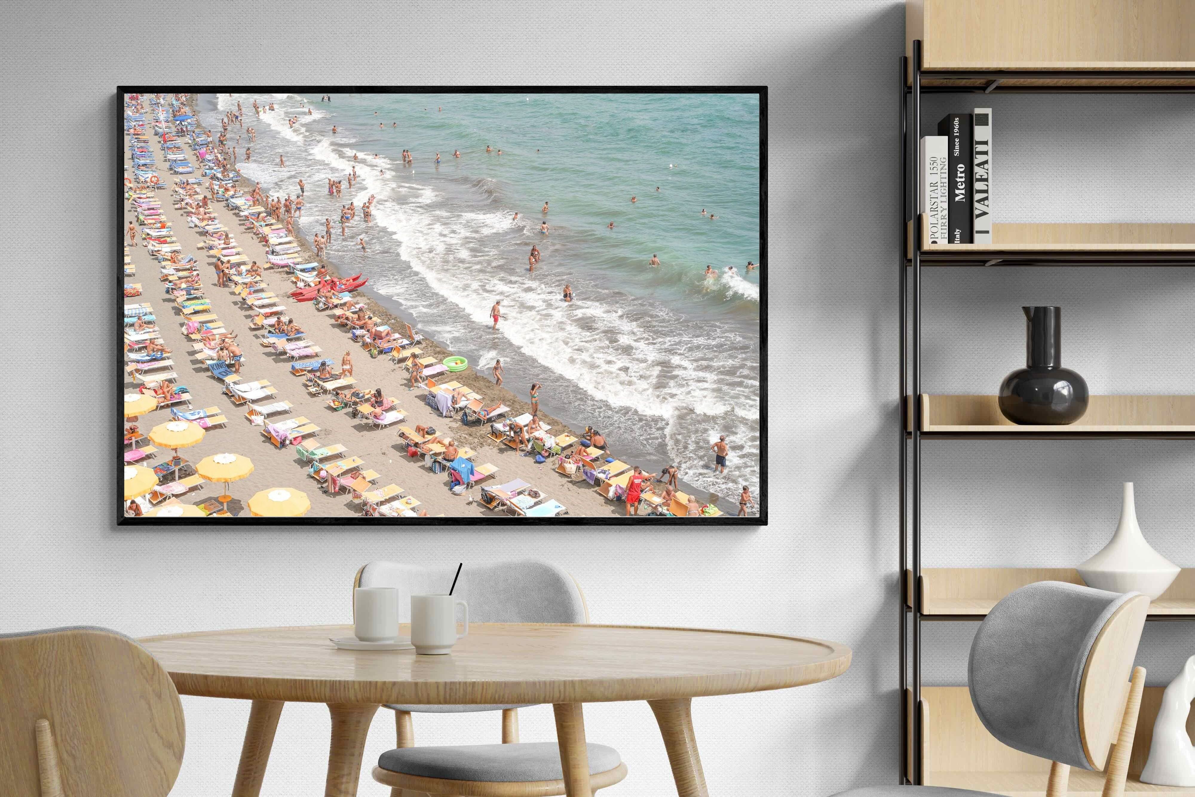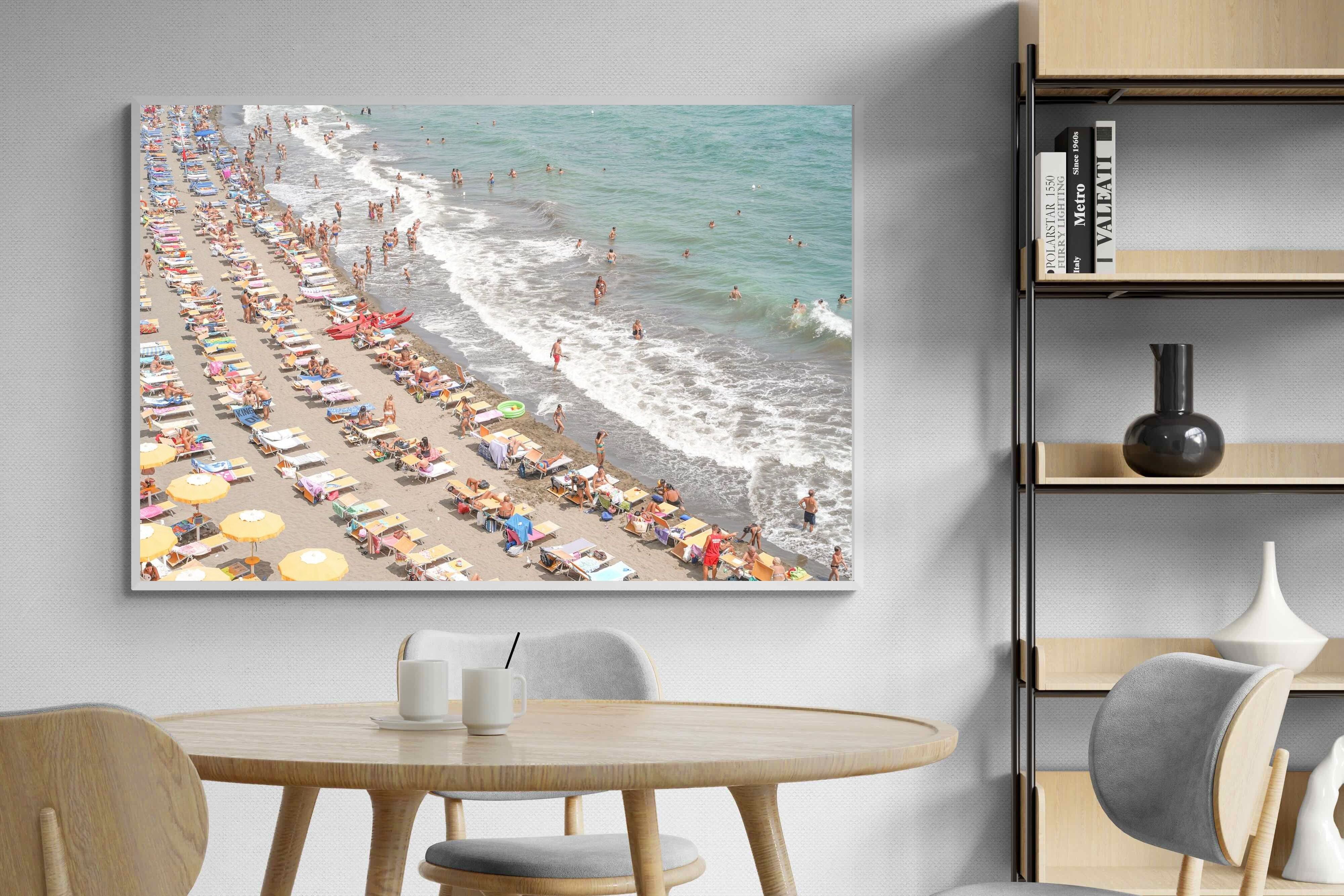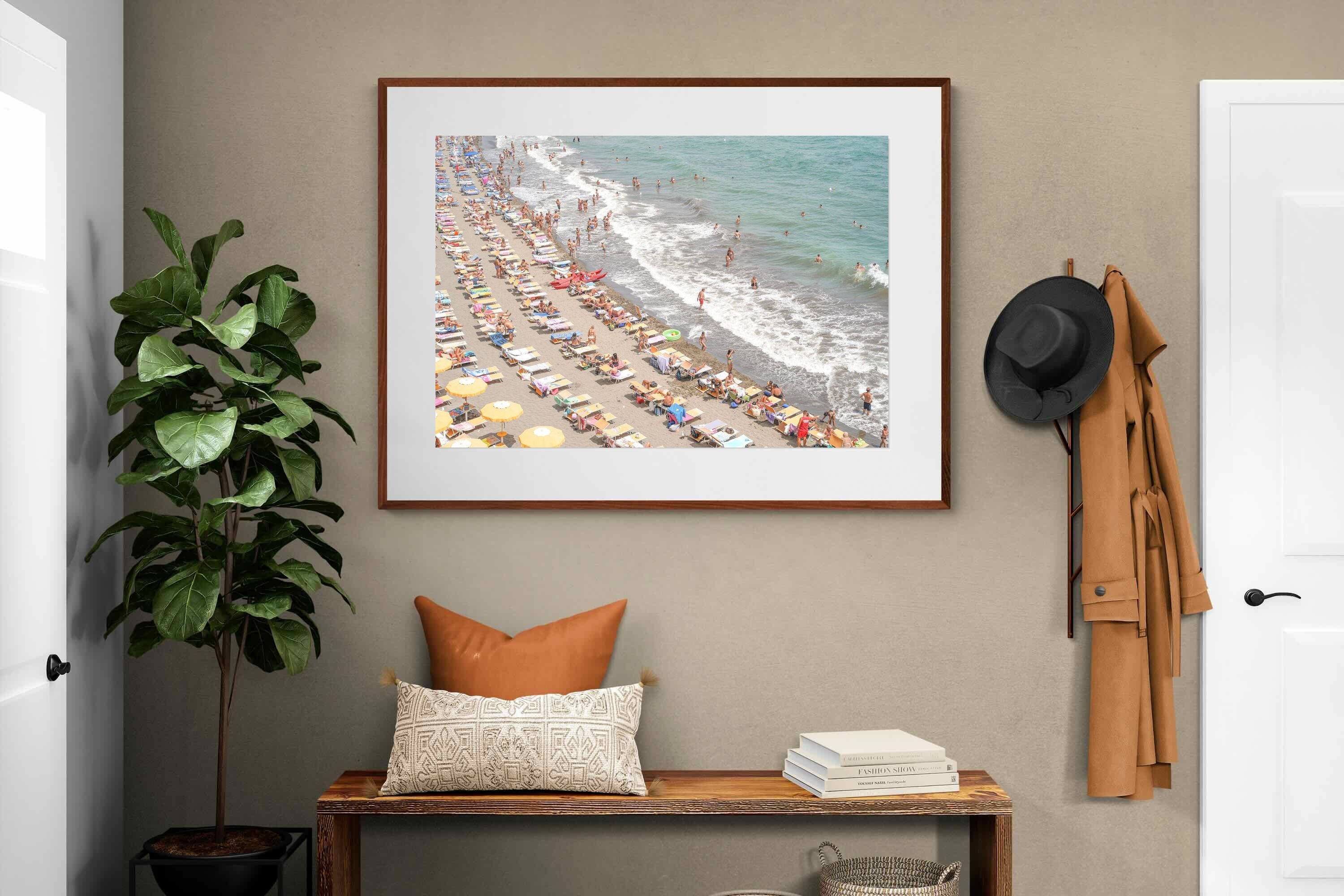 Rows of pastel loungers line the shoreline as waves fold gently onto the sand, capturing the lively rhythm of an Italian summer afternoon. The soft, sun-washed tones balance colour with refinement, preventing the scene from feeling chaotic. Ideal for relaxed living rooms, holiday homes or vibrant coastal interiors, this artwork introduces movement and warmth while maintaining a curated, editorial finish.
