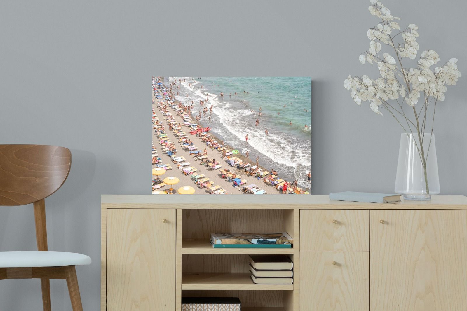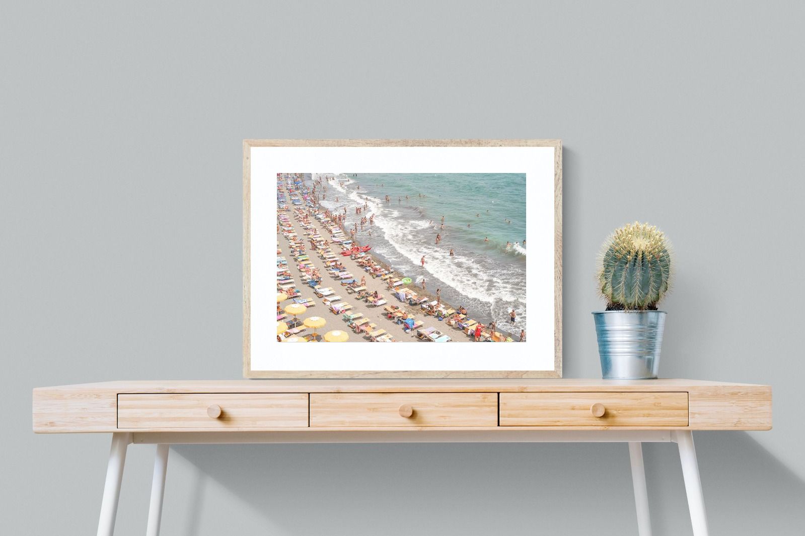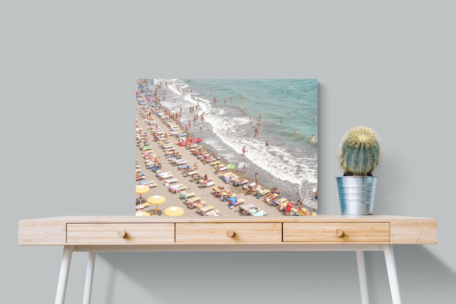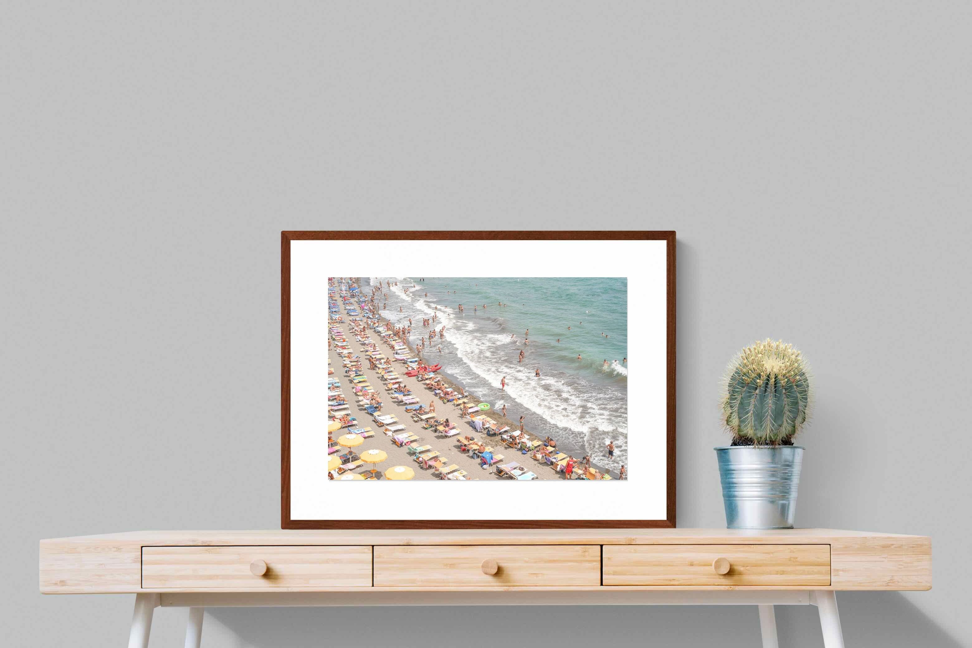 Rows of pastel loungers line the shoreline as waves fold gently onto the sand, capturing the lively rhythm of an Italian summer afternoon. The soft, sun-washed tones balance colour with refinement, preventing the scene from feeling chaotic. Ideal for relaxed living rooms, holiday homes or vibrant coastal interiors, this artwork introduces movement and warmth while maintaining a curated, editorial finish.