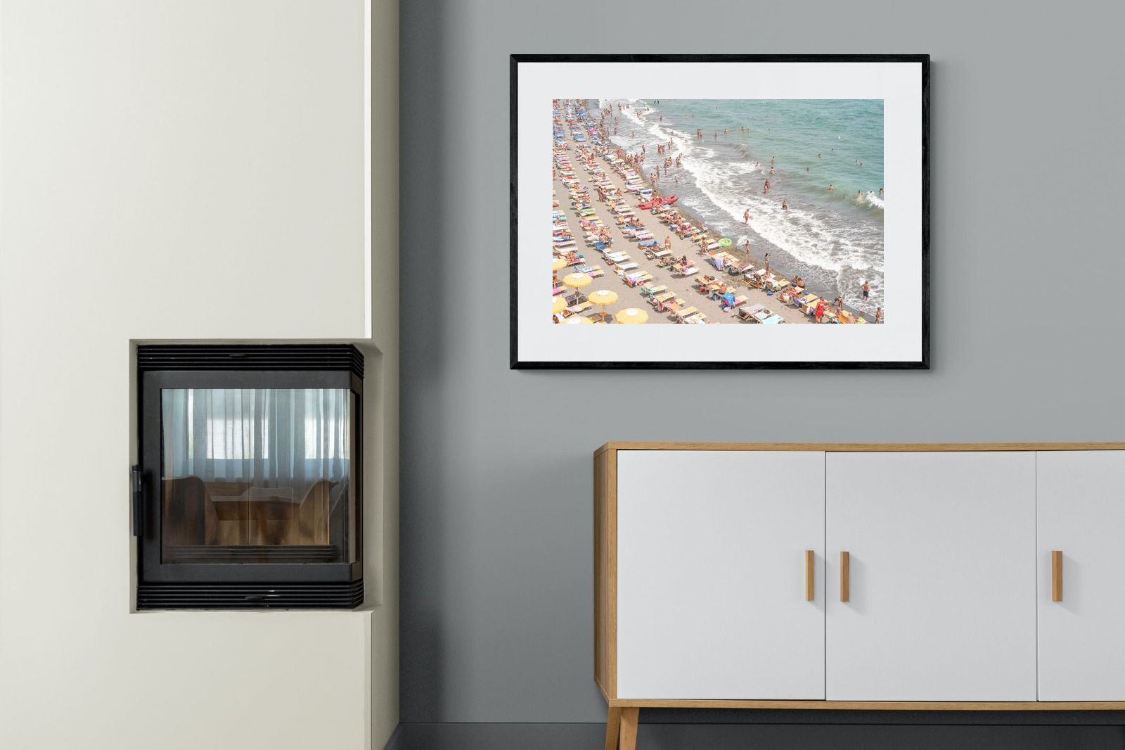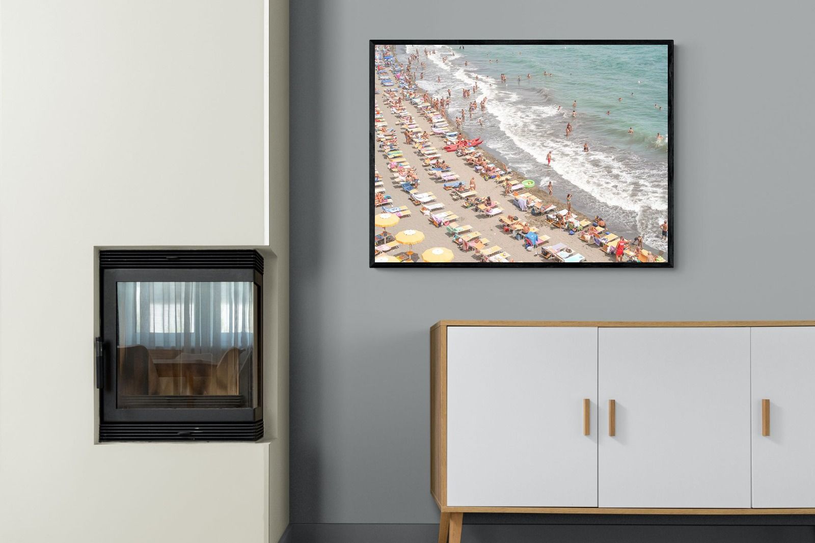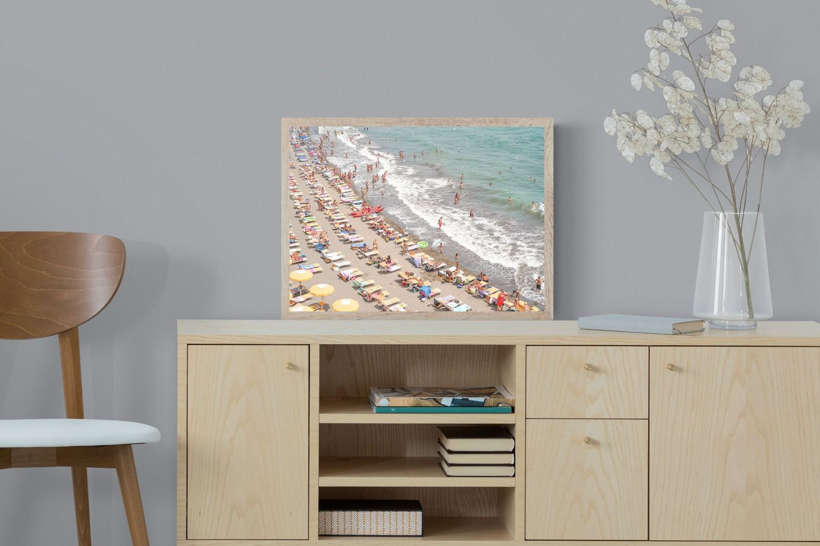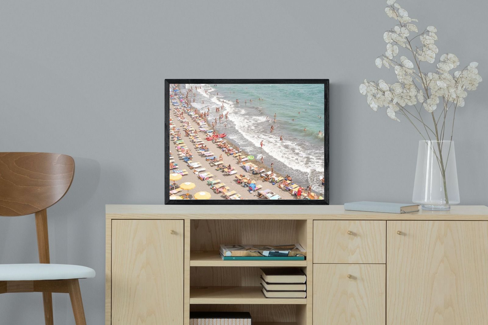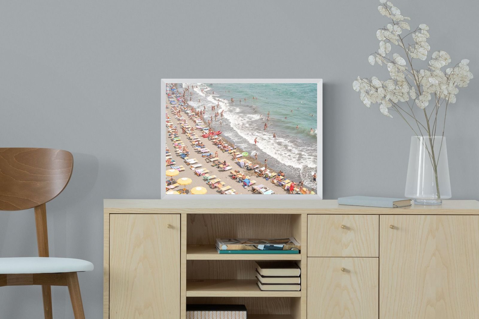 Rows of pastel loungers line the shoreline as waves fold gently onto the sand, capturing the lively rhythm of an Italian summer afternoon. The soft, sun-washed tones balance colour with refinement, preventing the scene from feeling chaotic. Ideal for relaxed living rooms, holiday homes or vibrant coastal interiors, this artwork introduces movement and warmth while maintaining a curated, editorial finish.