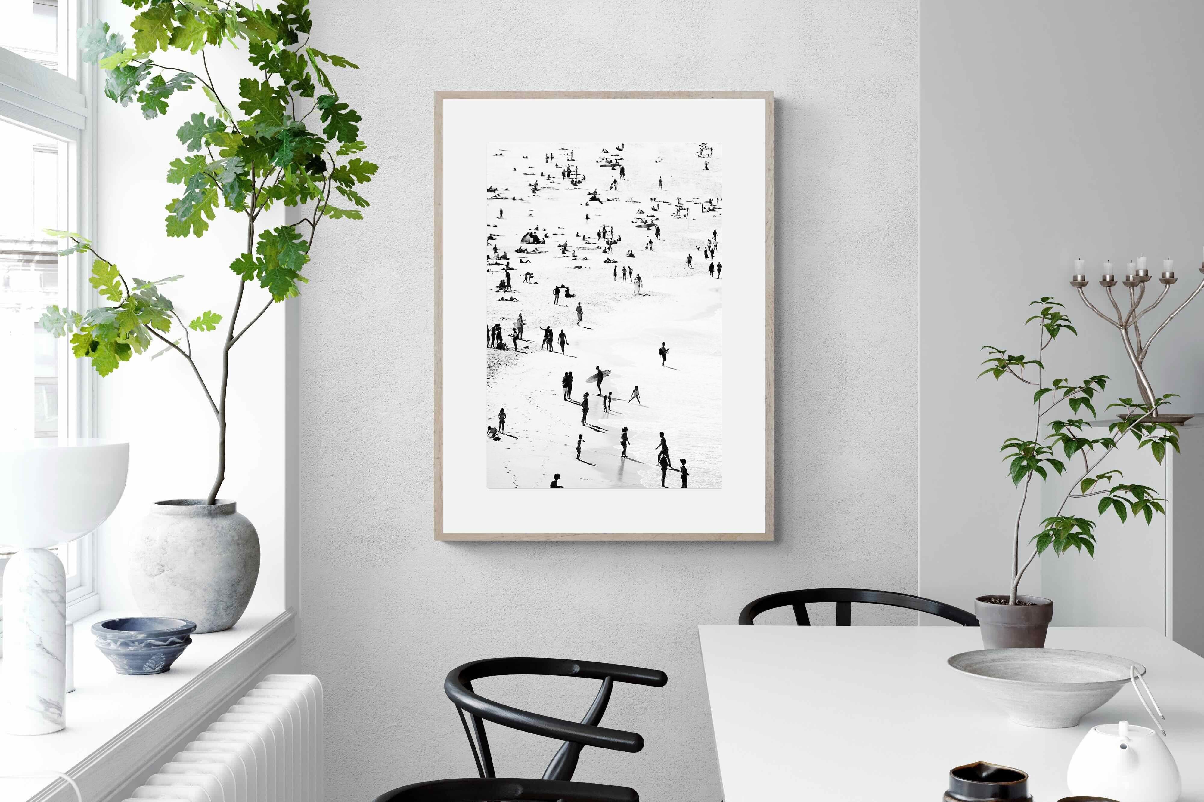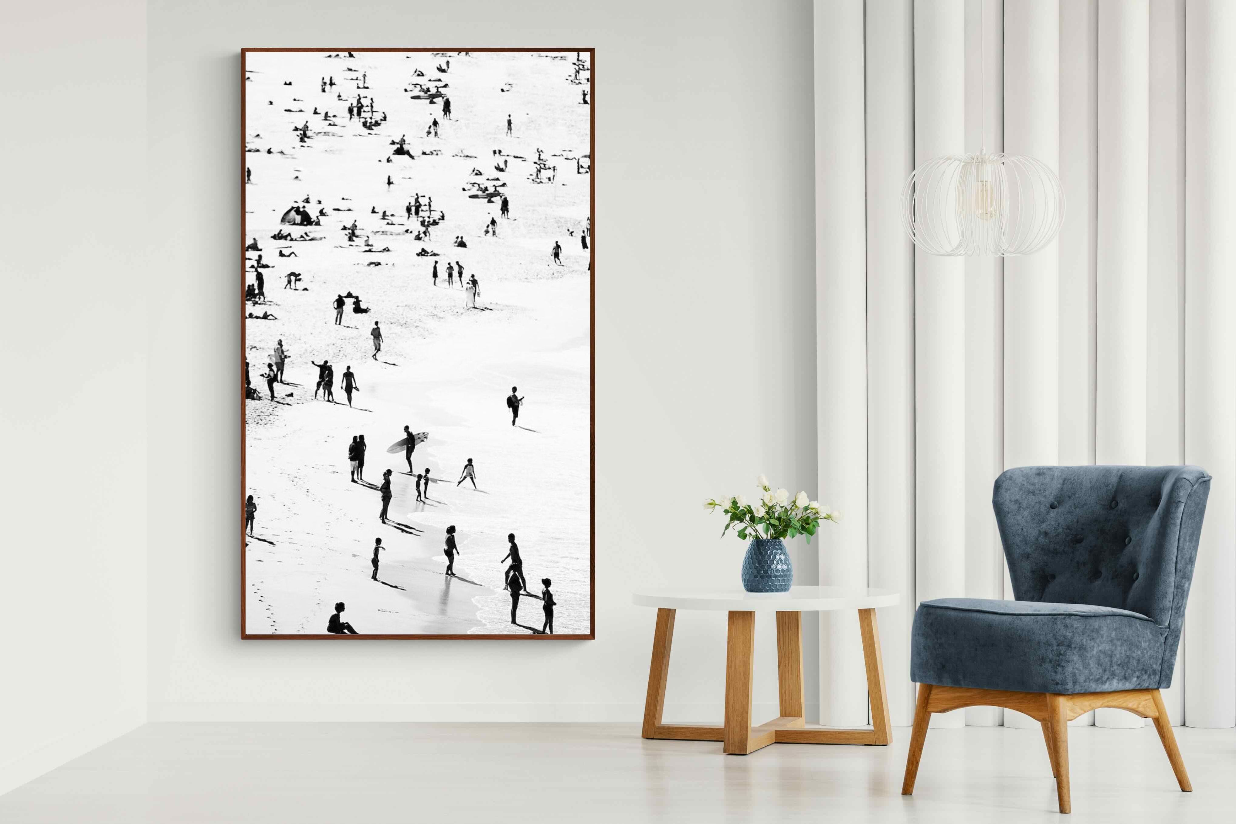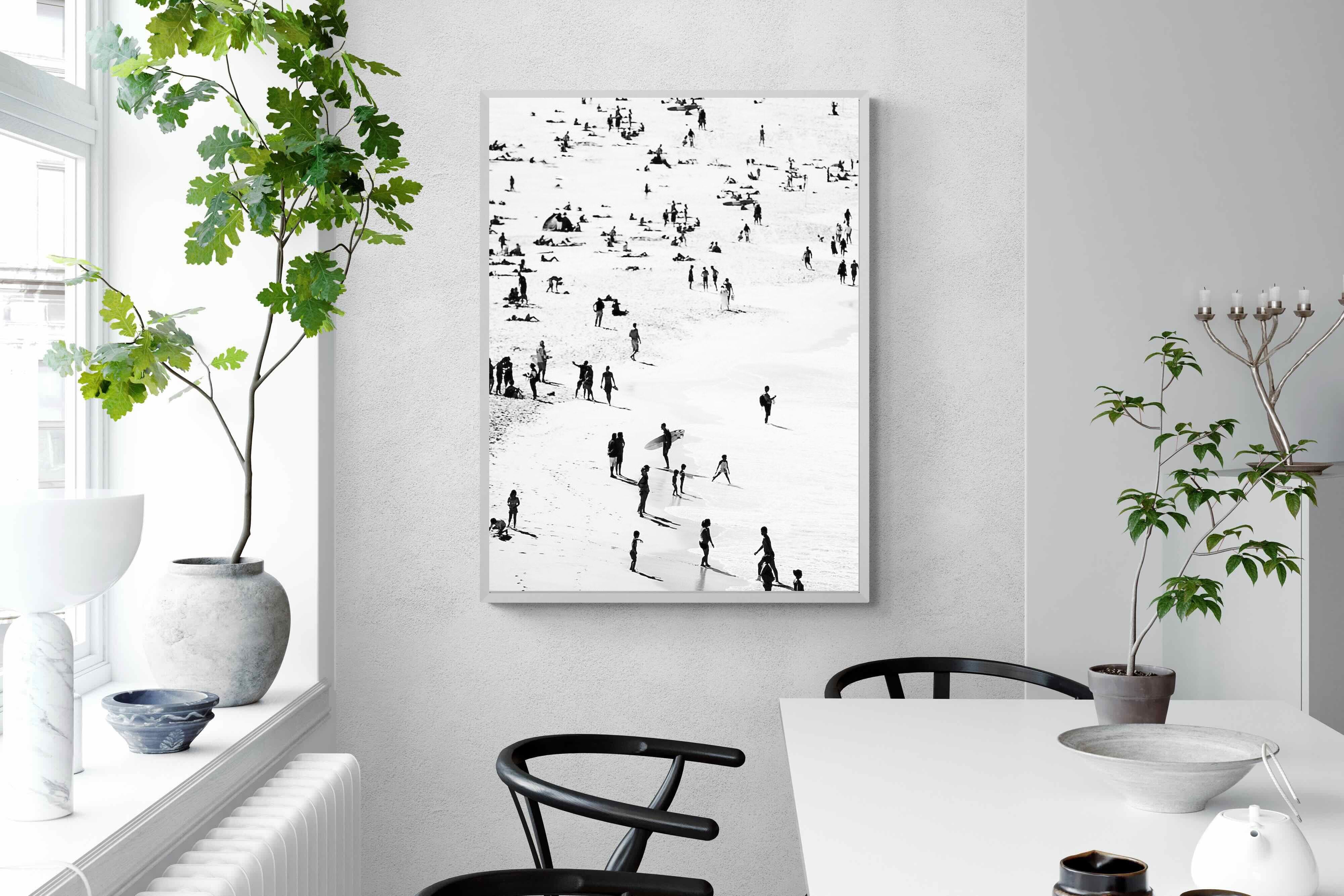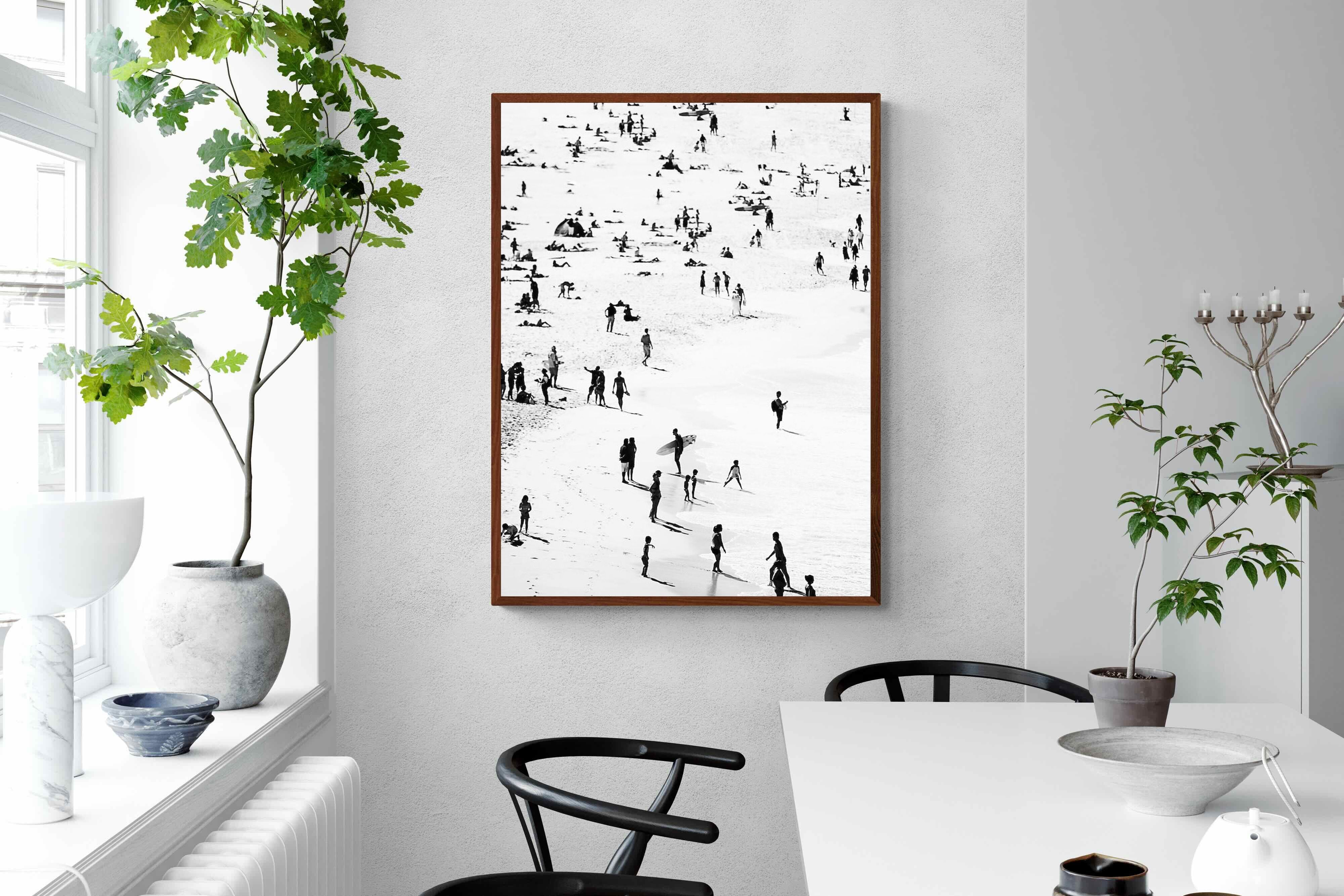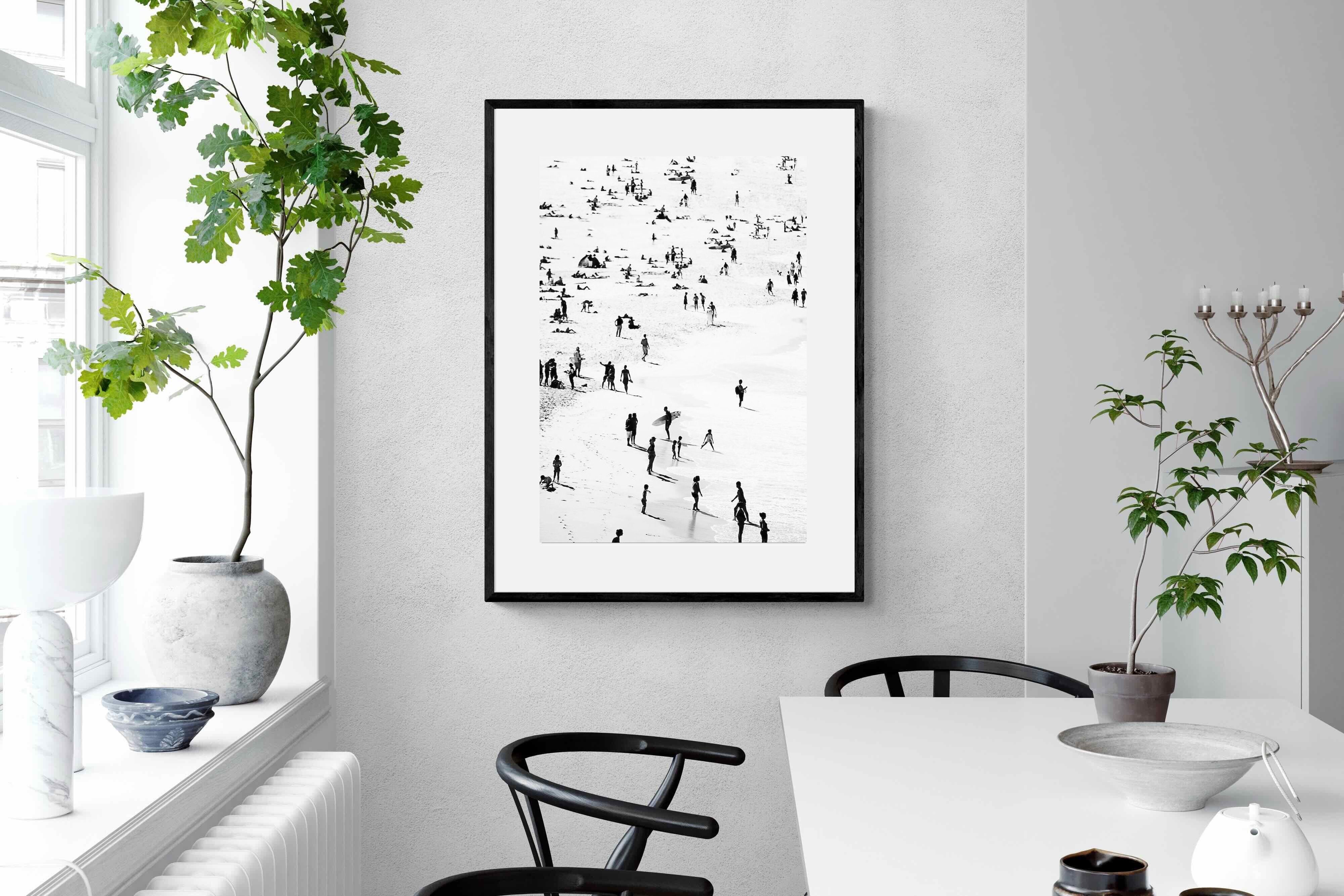 A striking black and white shoreline scene captures scattered figures, long shadows and gentle surf in a beautifully abstract composition. The high-contrast treatment transforms everyday beach life into graphic art, where movement and negative space create rhythm across the sand. This contemporary coastal piece works effortlessly in modern, minimalist, monochrome or seaside-inspired interiors. Ideal for living rooms, hallways, offices or holiday homes, it adds depth, atmosphere and timeless coastal character without overwhelming a space.