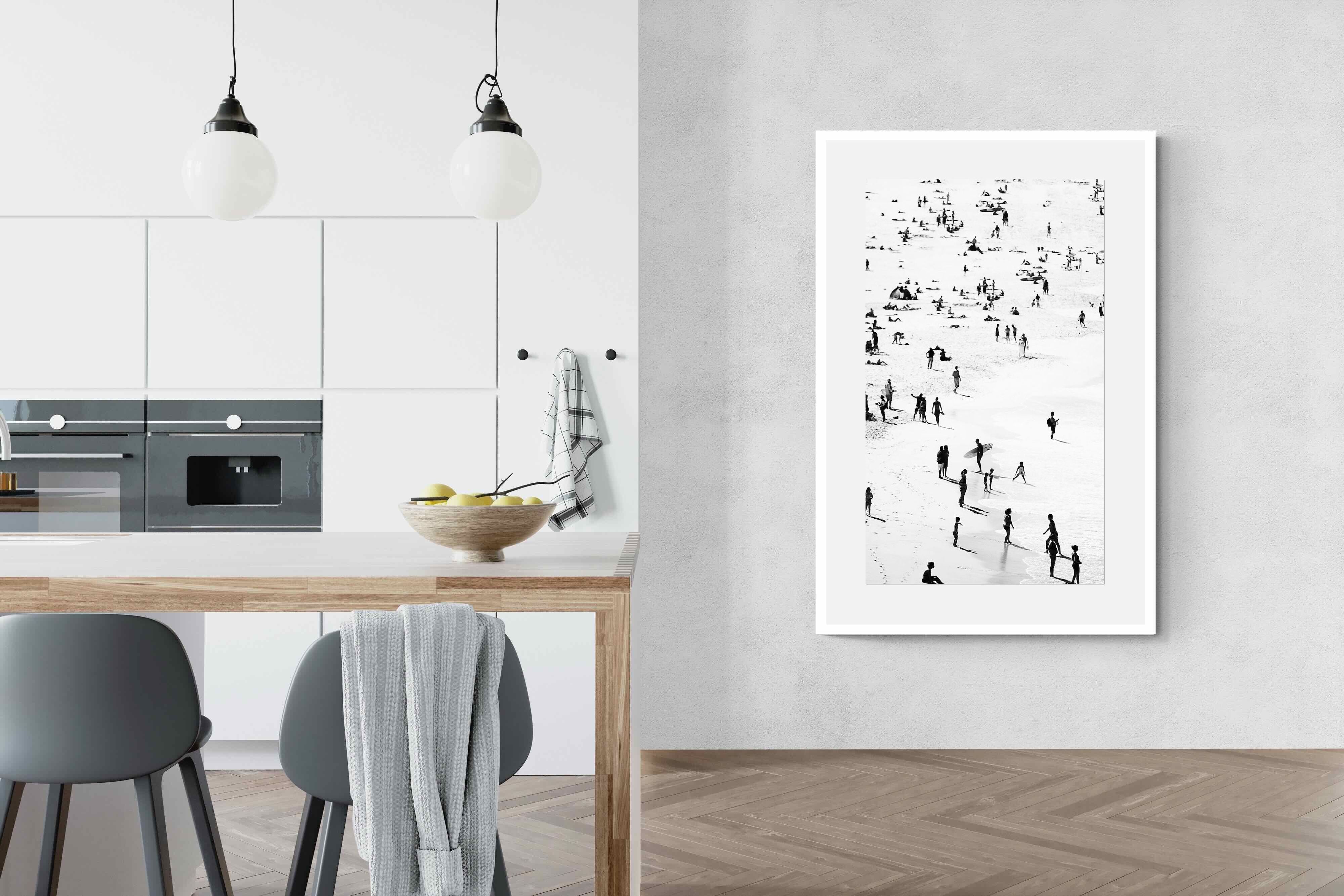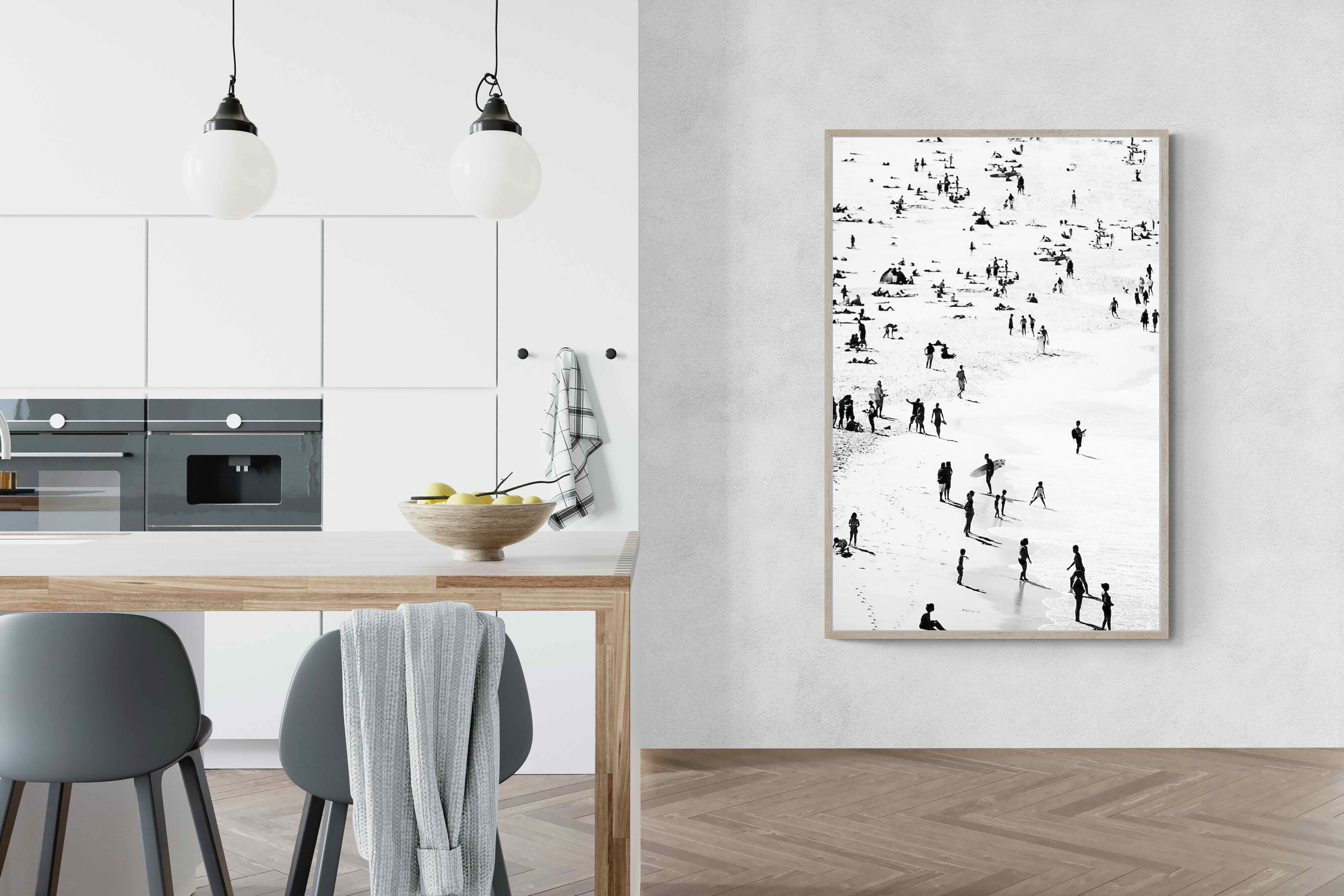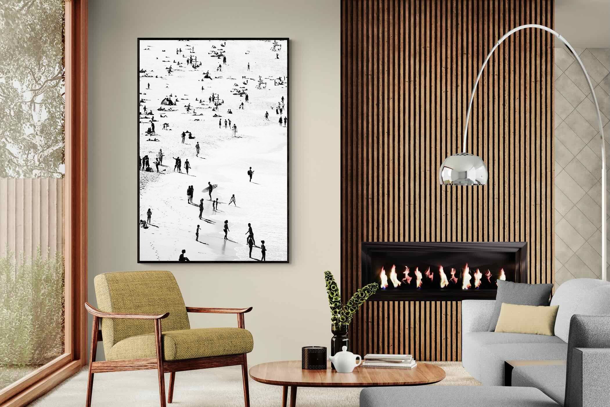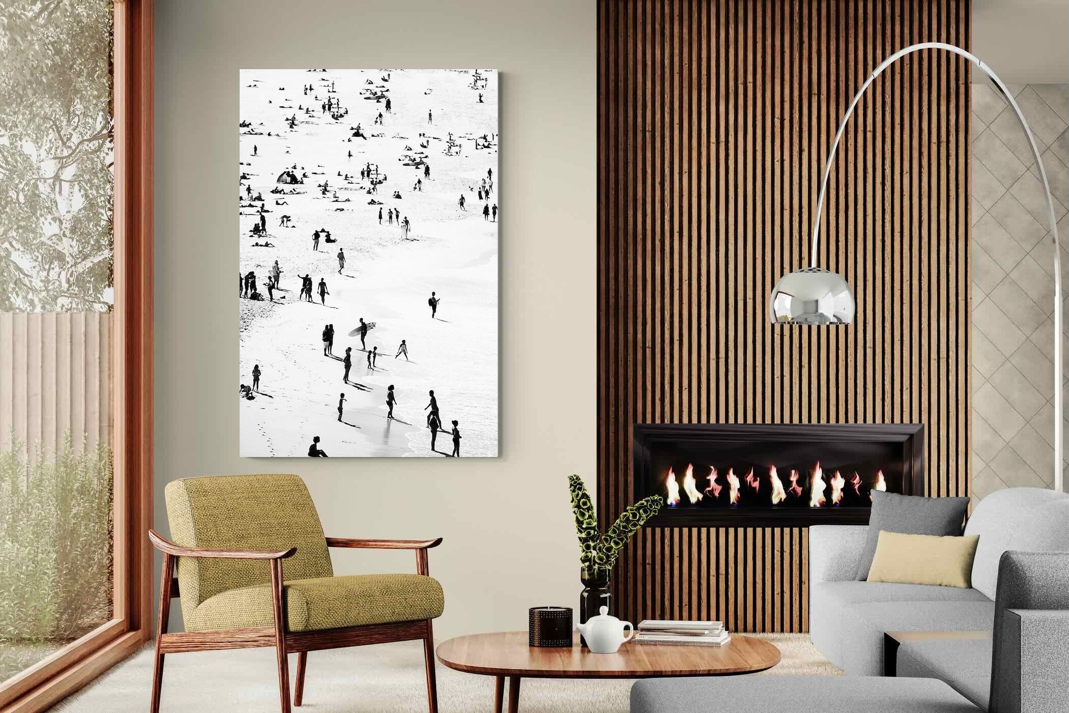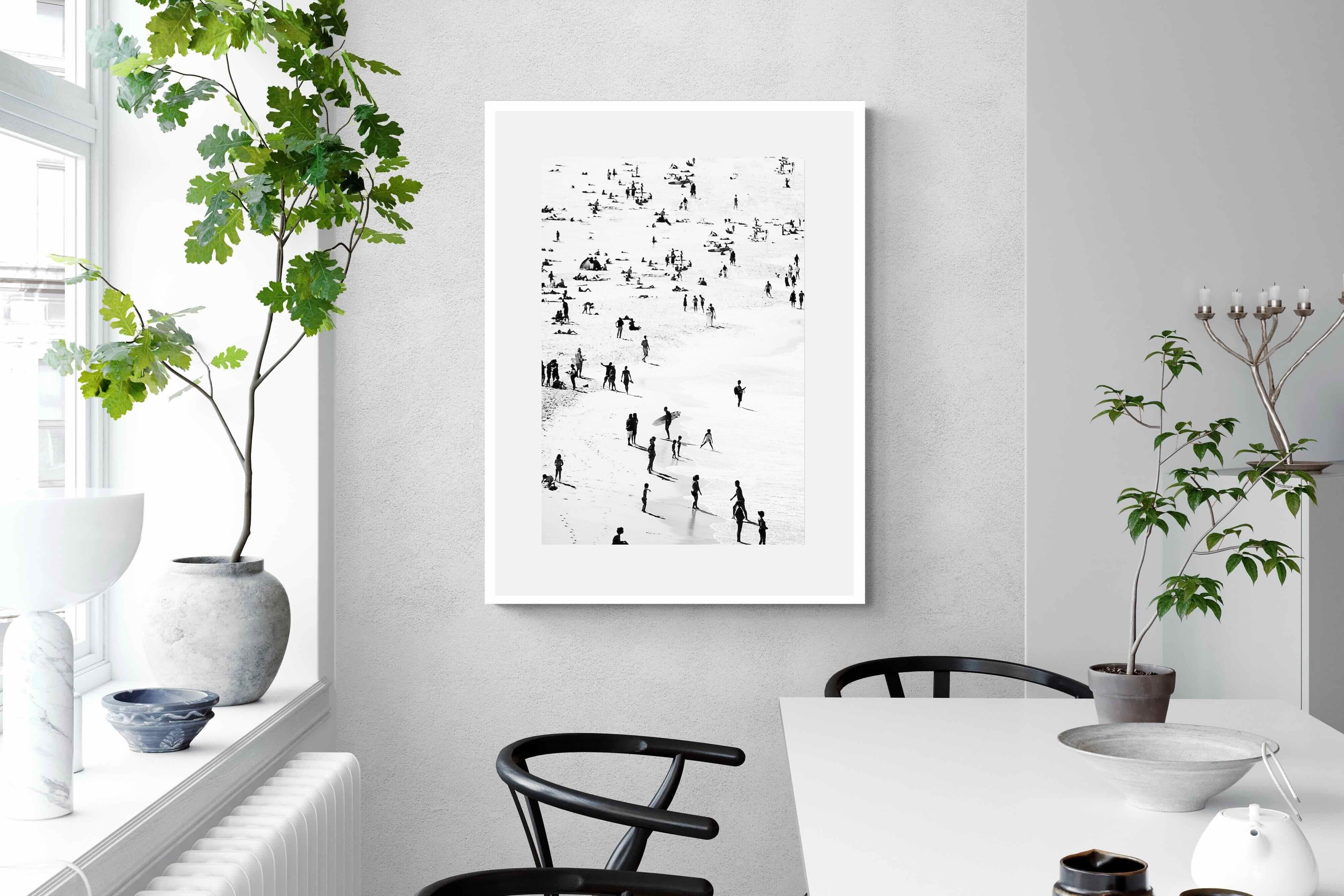 A striking black and white shoreline scene captures scattered figures, long shadows and gentle surf in a beautifully abstract composition. The high-contrast treatment transforms everyday beach life into graphic art, where movement and negative space create rhythm across the sand. This contemporary coastal piece works effortlessly in modern, minimalist, monochrome or seaside-inspired interiors. Ideal for living rooms, hallways, offices or holiday homes, it adds depth, atmosphere and timeless coastal character without overwhelming a space.