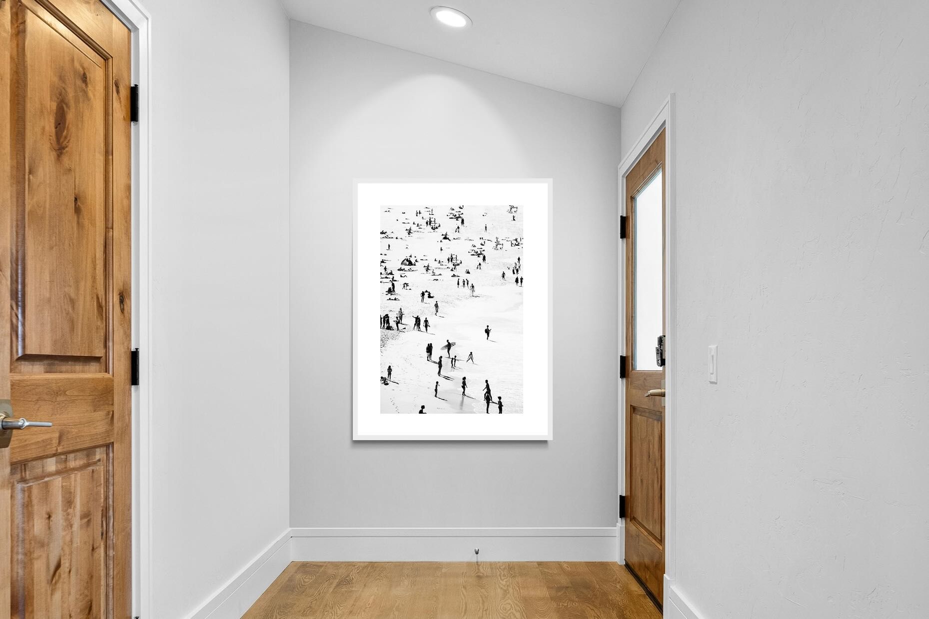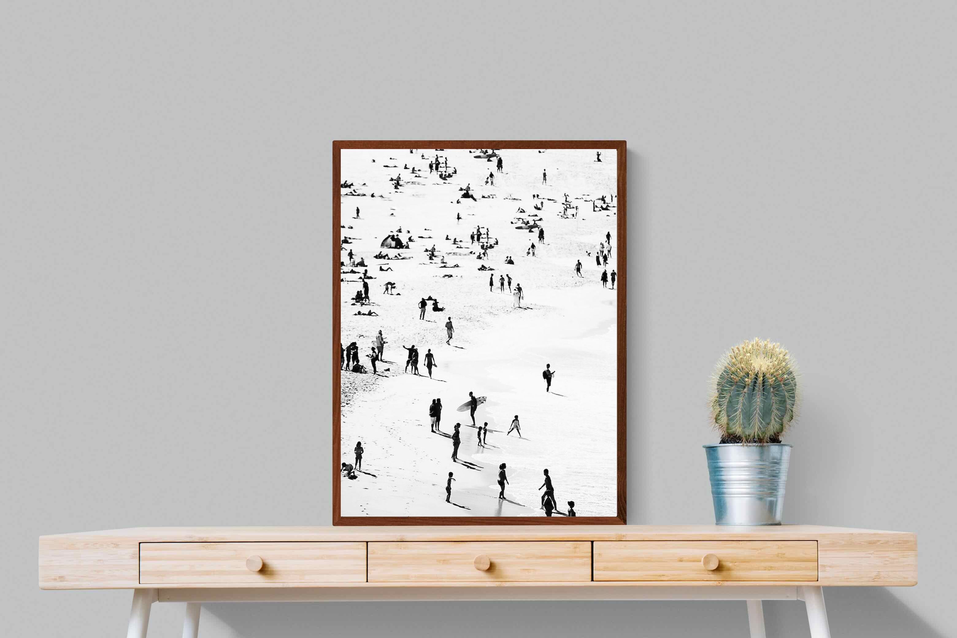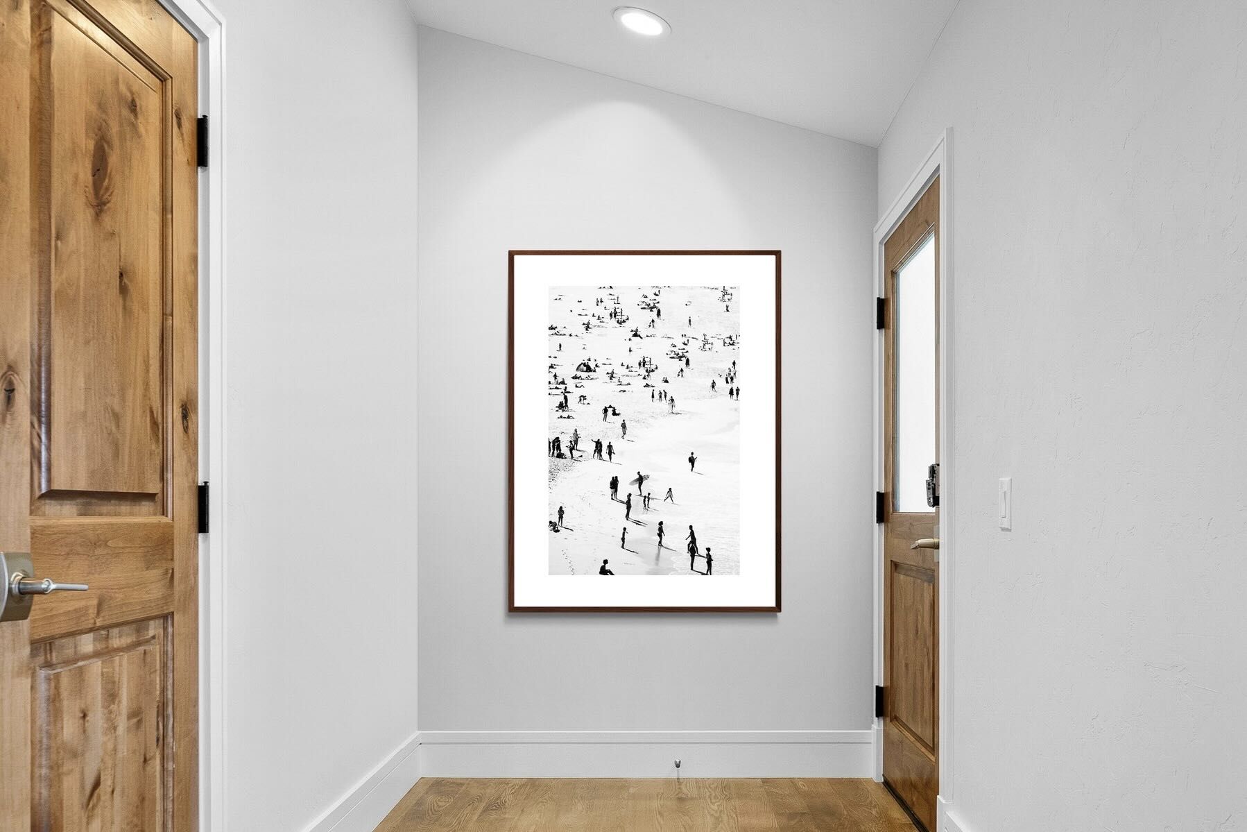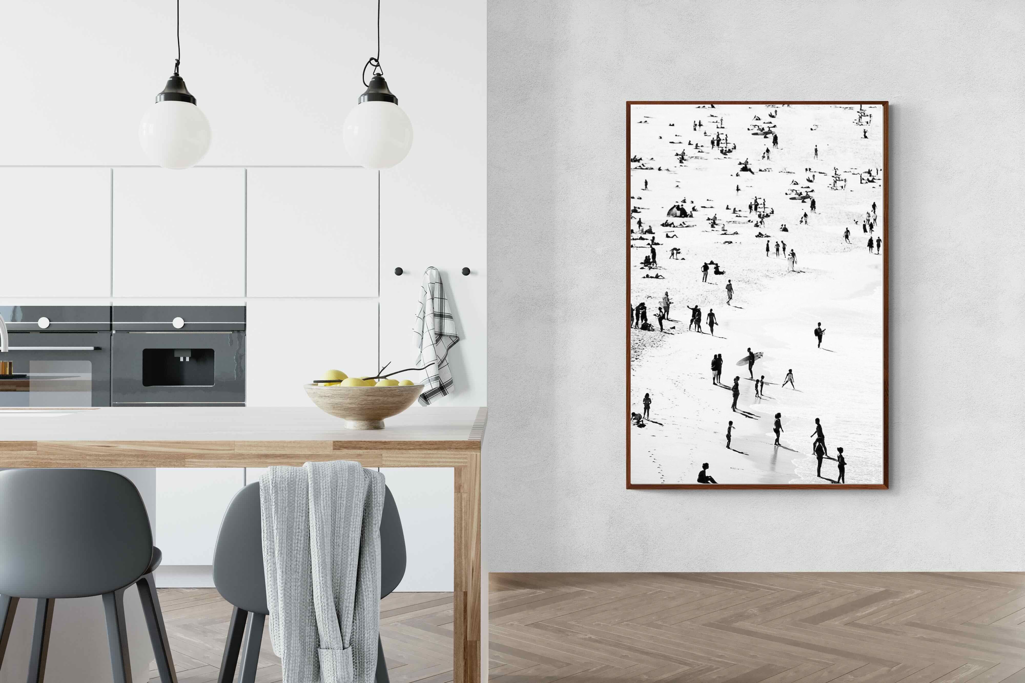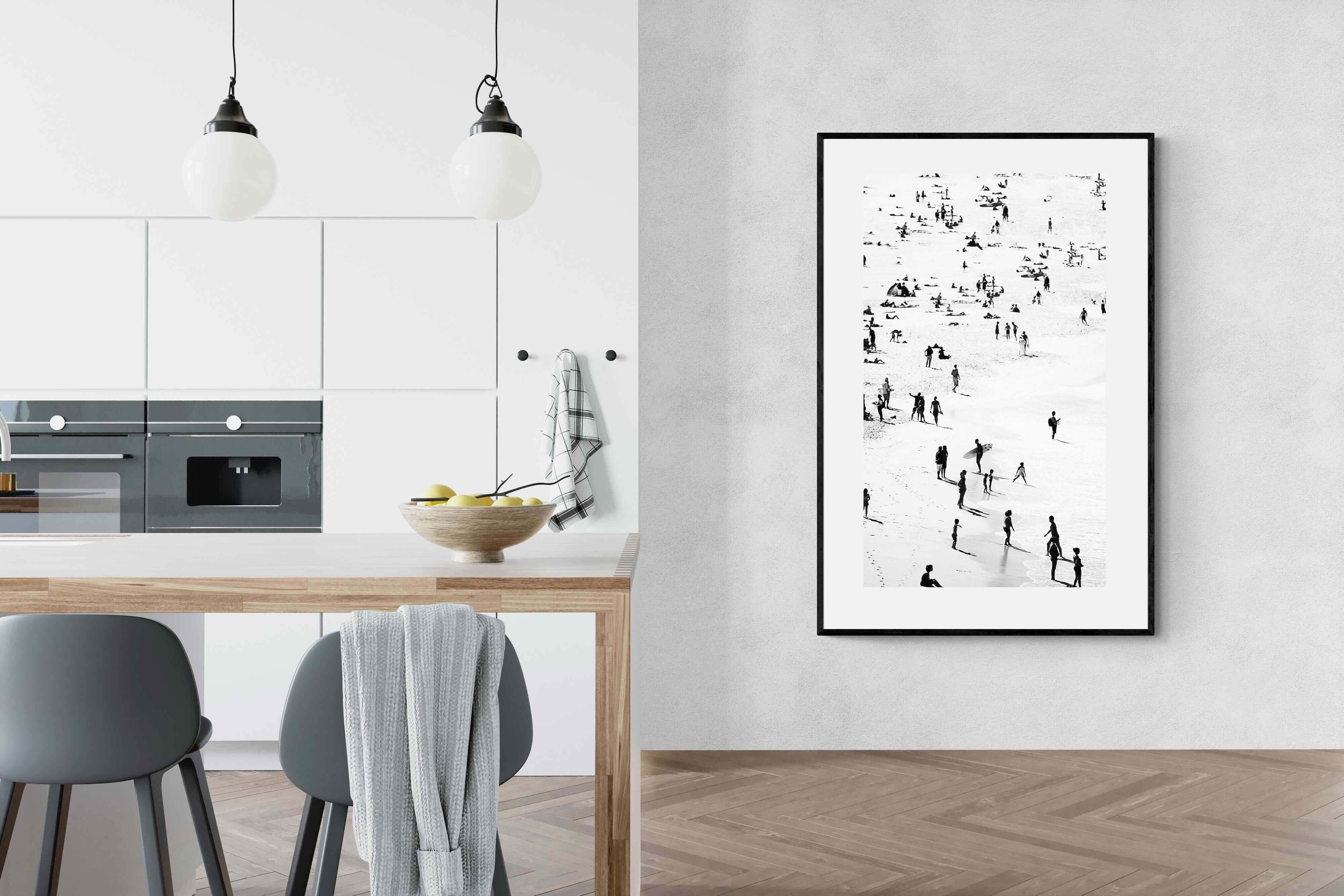 A striking black and white shoreline scene captures scattered figures, long shadows and gentle surf in a beautifully abstract composition. The high-contrast treatment transforms everyday beach life into graphic art, where movement and negative space create rhythm across the sand. This contemporary coastal piece works effortlessly in modern, minimalist, monochrome or seaside-inspired interiors. Ideal for living rooms, hallways, offices or holiday homes, it adds depth, atmosphere and timeless coastal character without overwhelming a space.