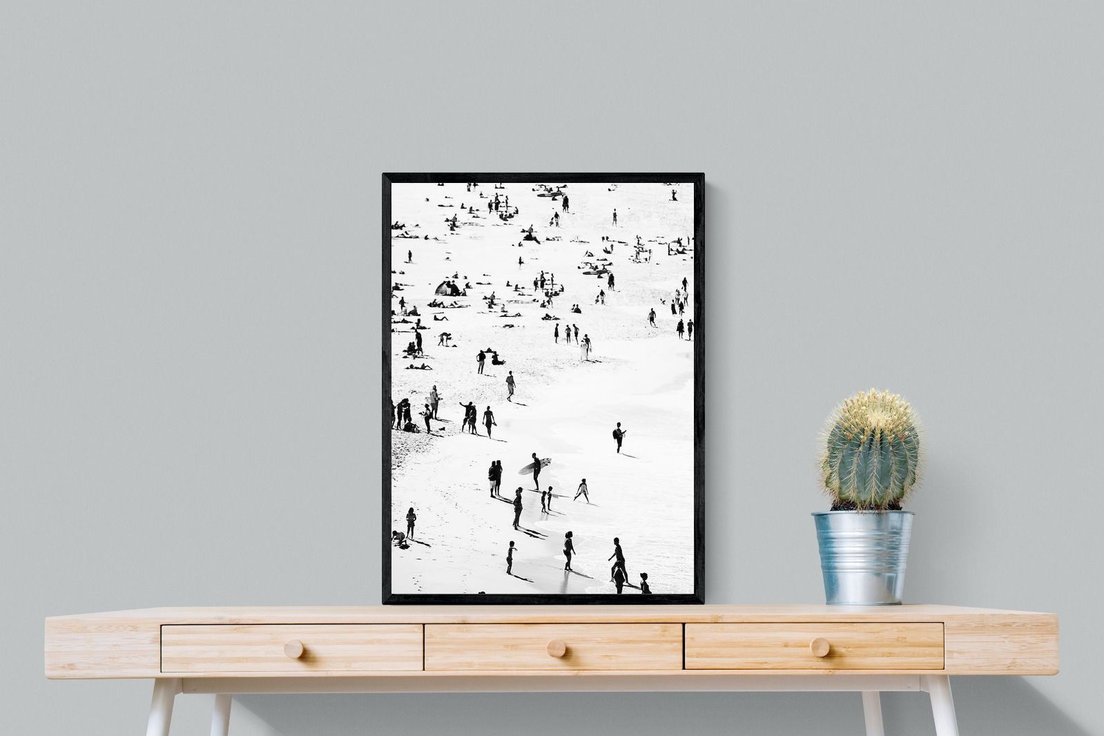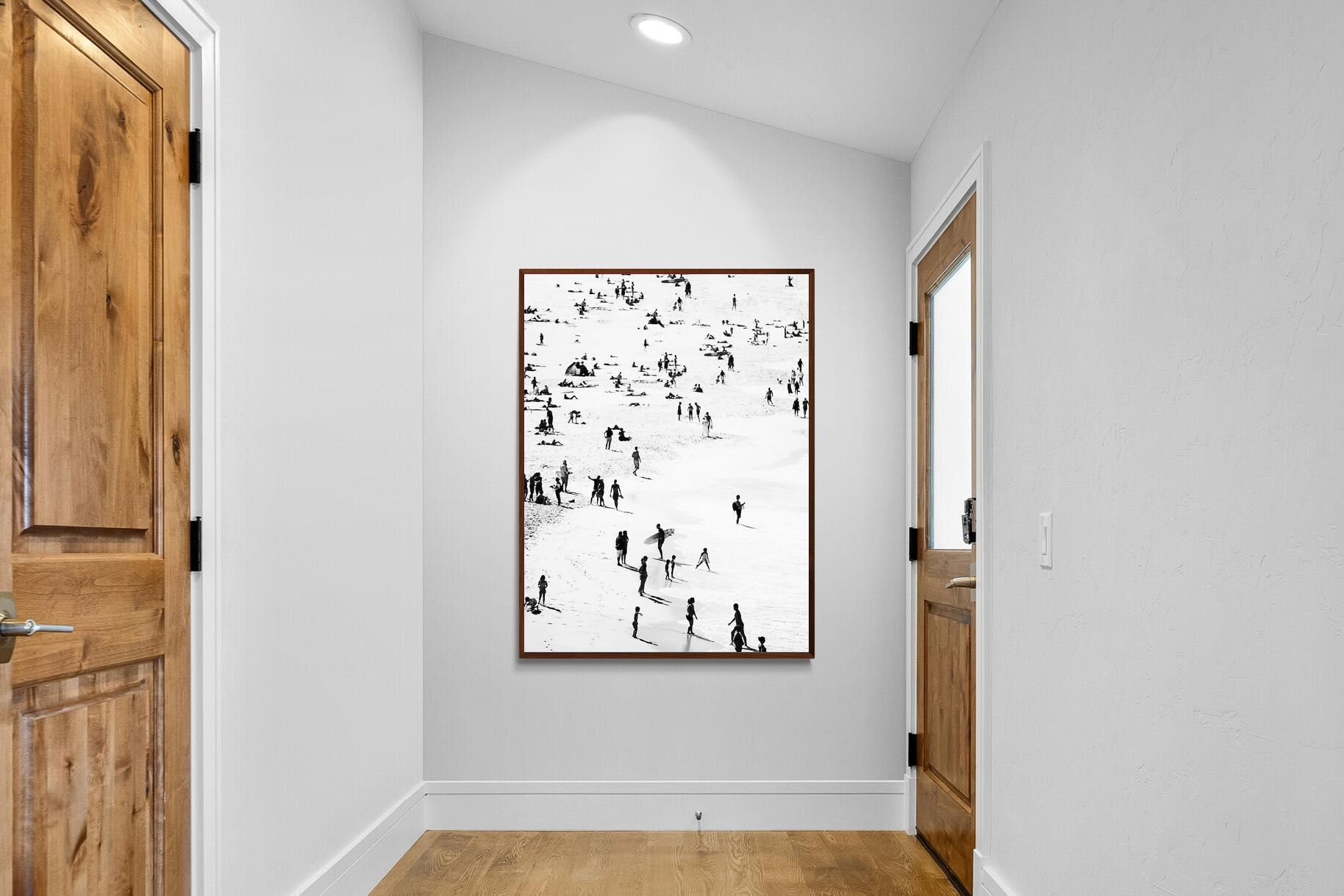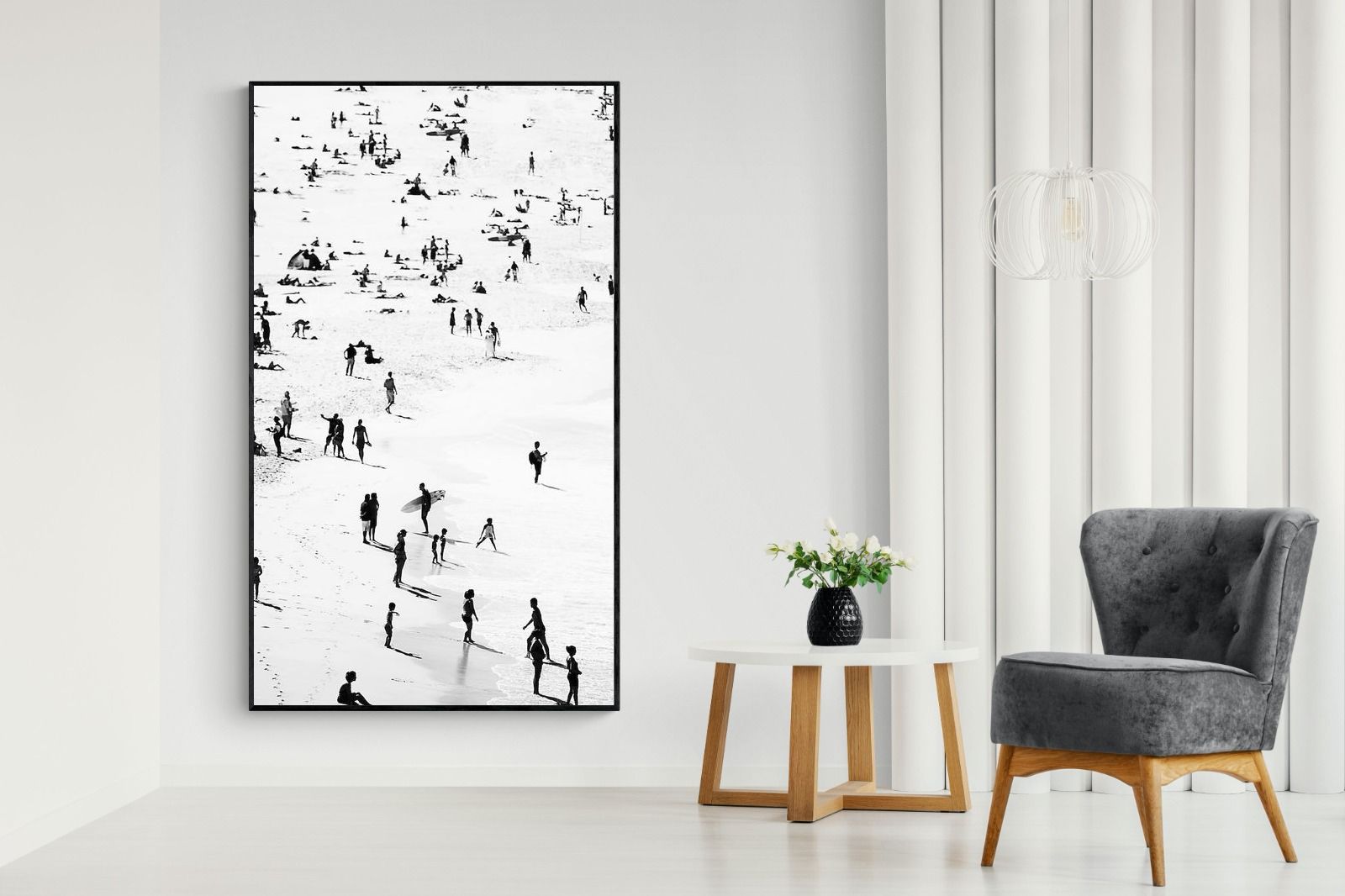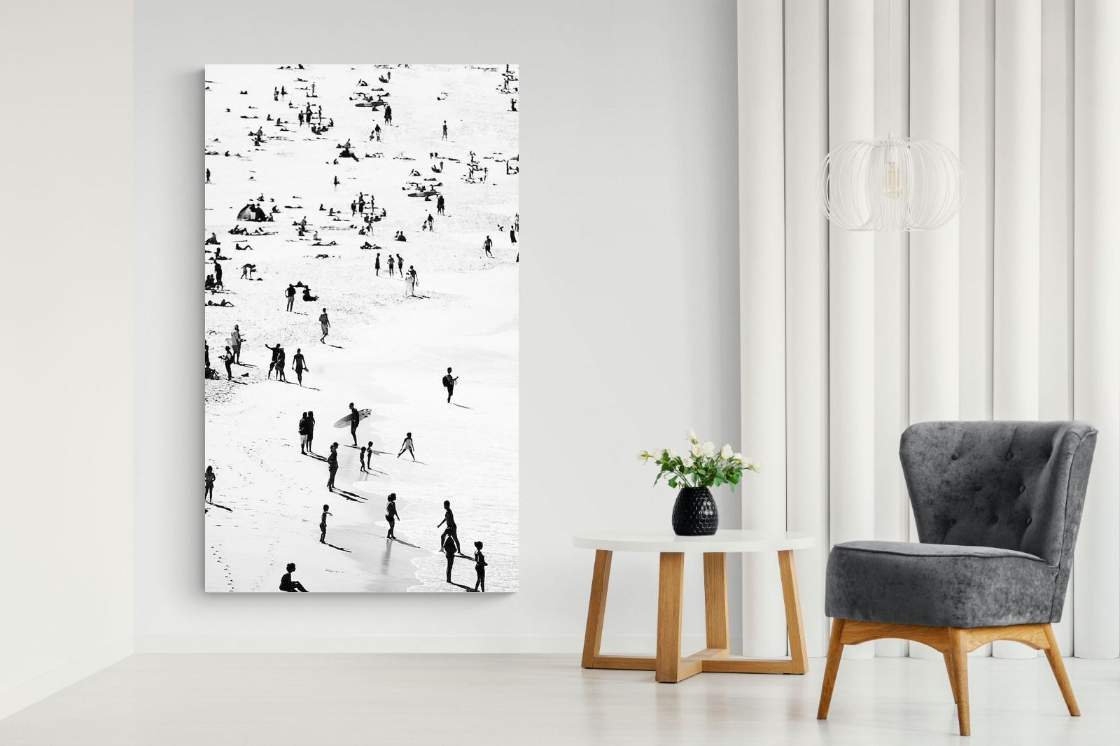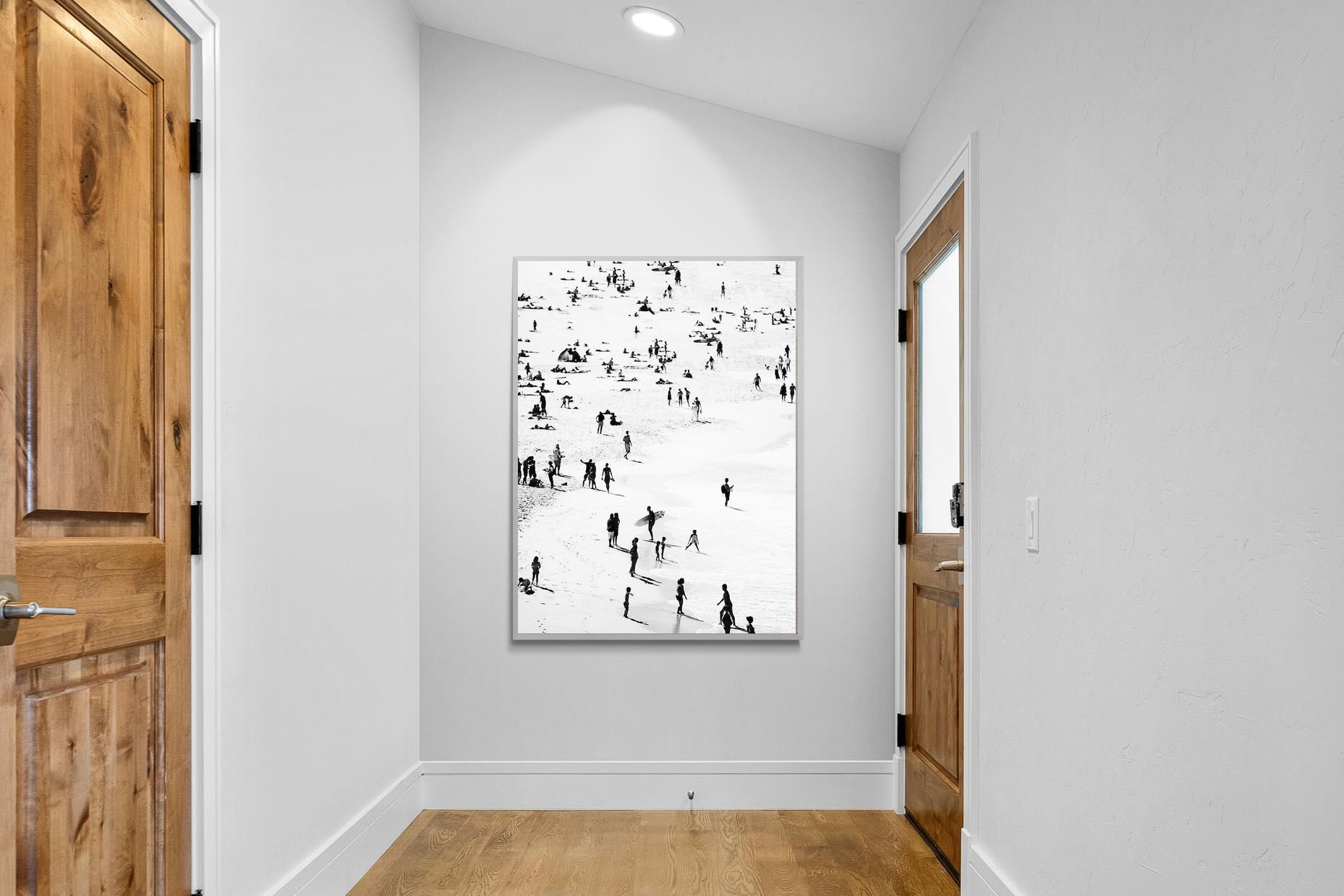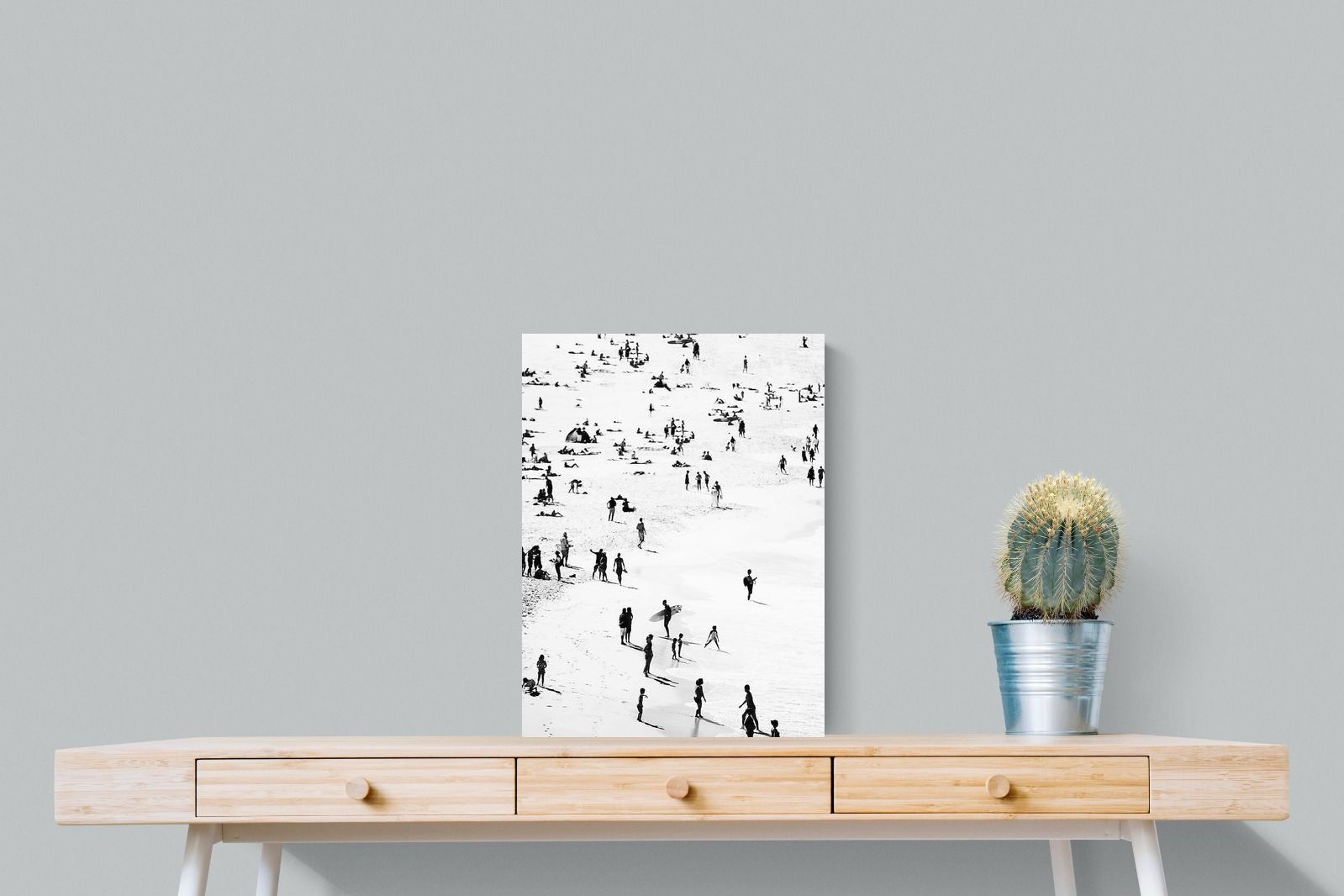 A striking black and white shoreline scene captures scattered figures, long shadows and gentle surf in a beautifully abstract composition. The high-contrast treatment transforms everyday beach life into graphic art, where movement and negative space create rhythm across the sand. This contemporary coastal piece works effortlessly in modern, minimalist, monochrome or seaside-inspired interiors. Ideal for living rooms, hallways, offices or holiday homes, it adds depth, atmosphere and timeless coastal character without overwhelming a space.