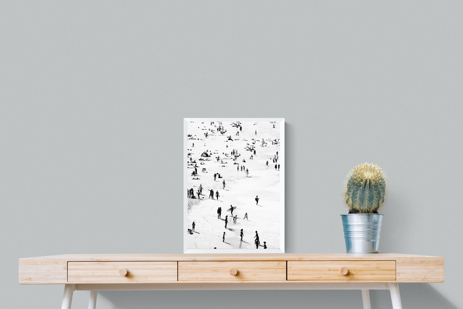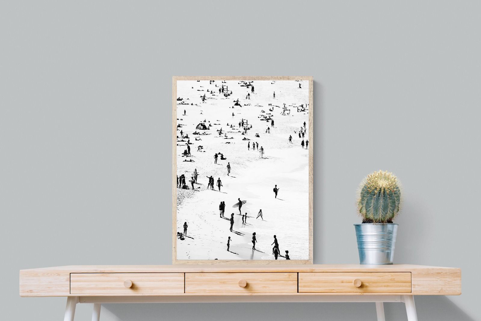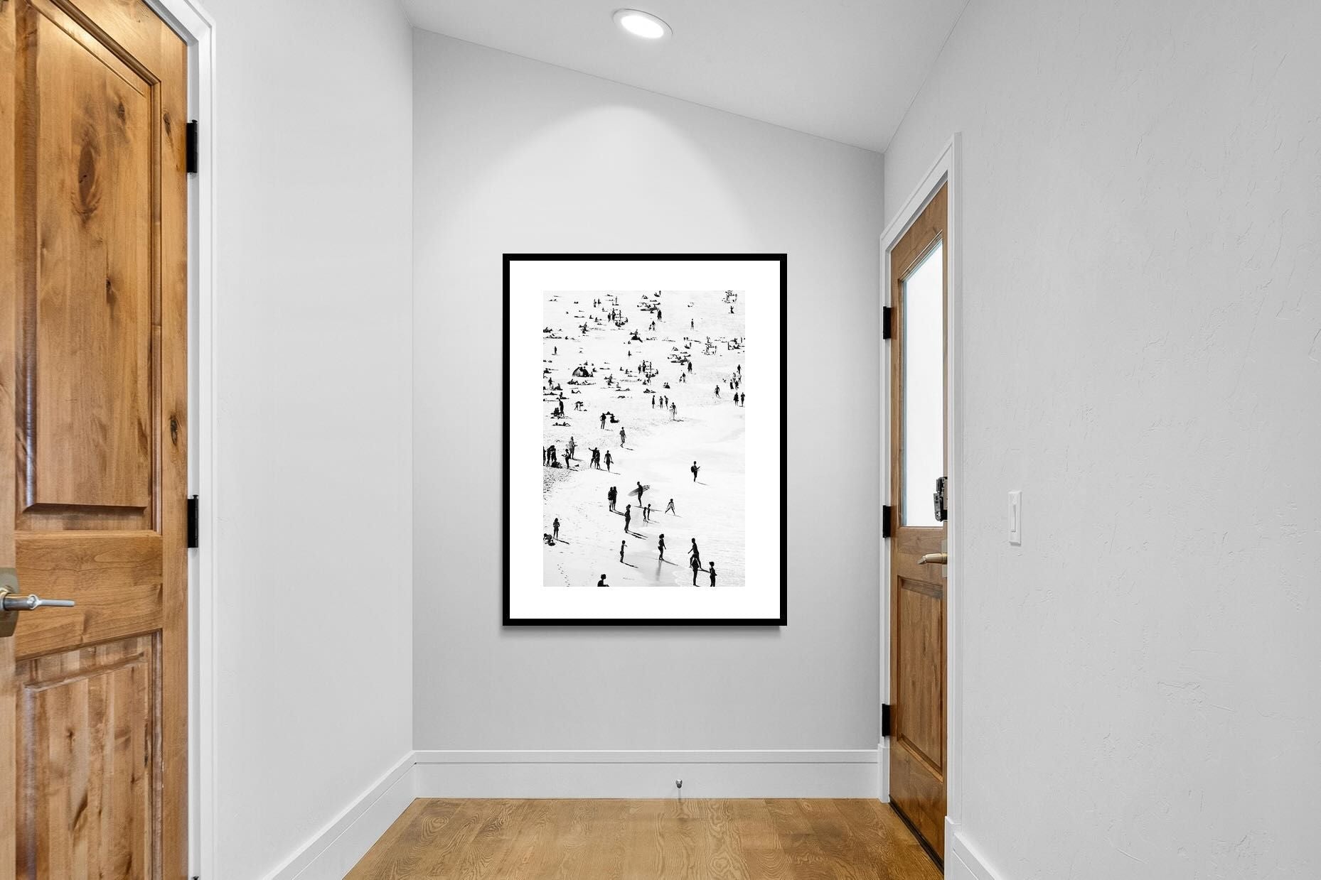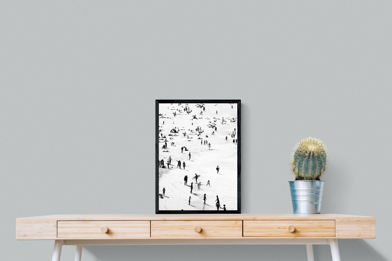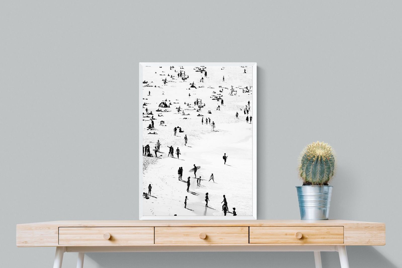 A striking black and white shoreline scene captures scattered figures, long shadows and gentle surf in a beautifully abstract composition. The high-contrast treatment transforms everyday beach life into graphic art, where movement and negative space create rhythm across the sand. This contemporary coastal piece works effortlessly in modern, minimalist, monochrome or seaside-inspired interiors. Ideal for living rooms, hallways, offices or holiday homes, it adds depth, atmosphere and timeless coastal character without overwhelming a space.