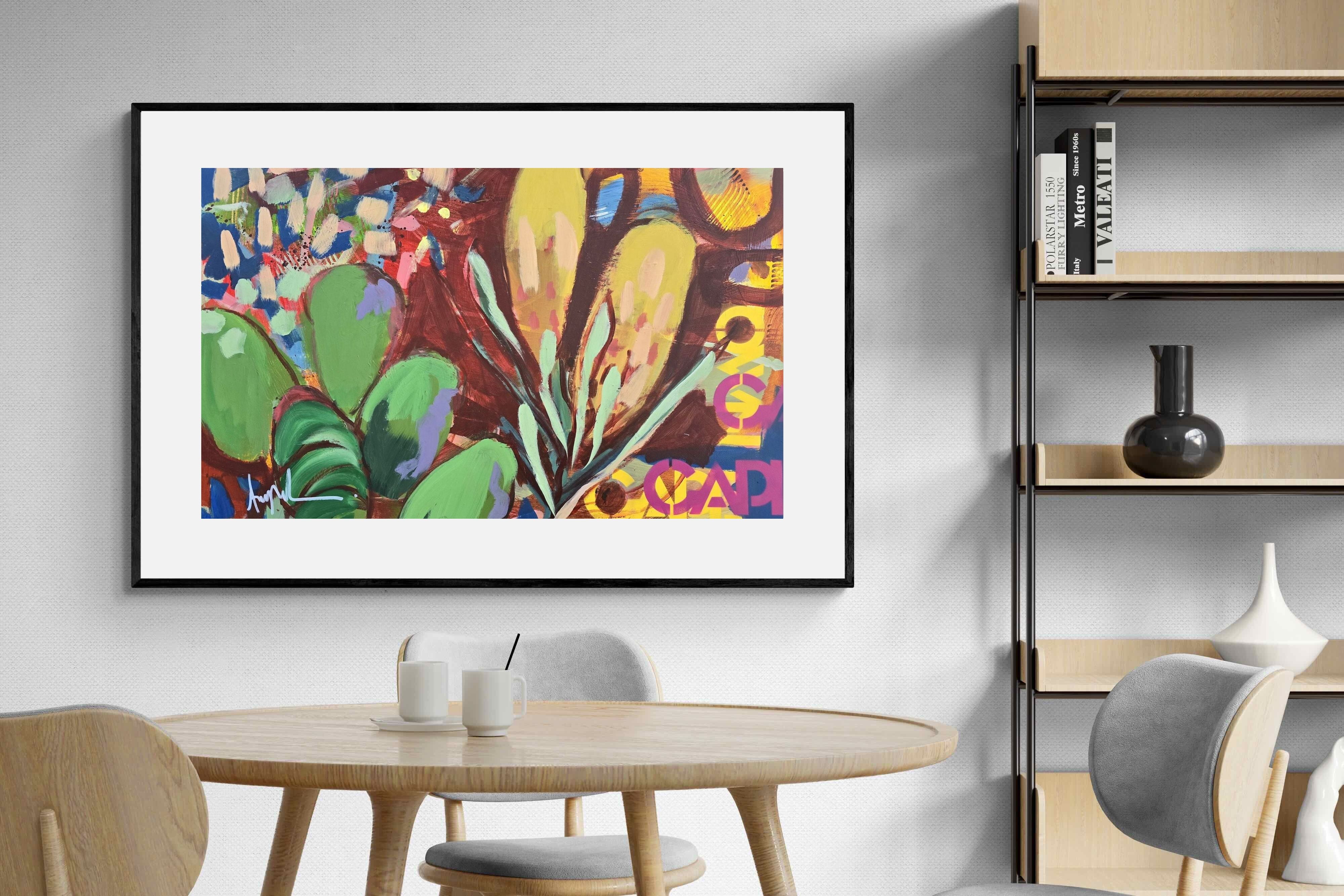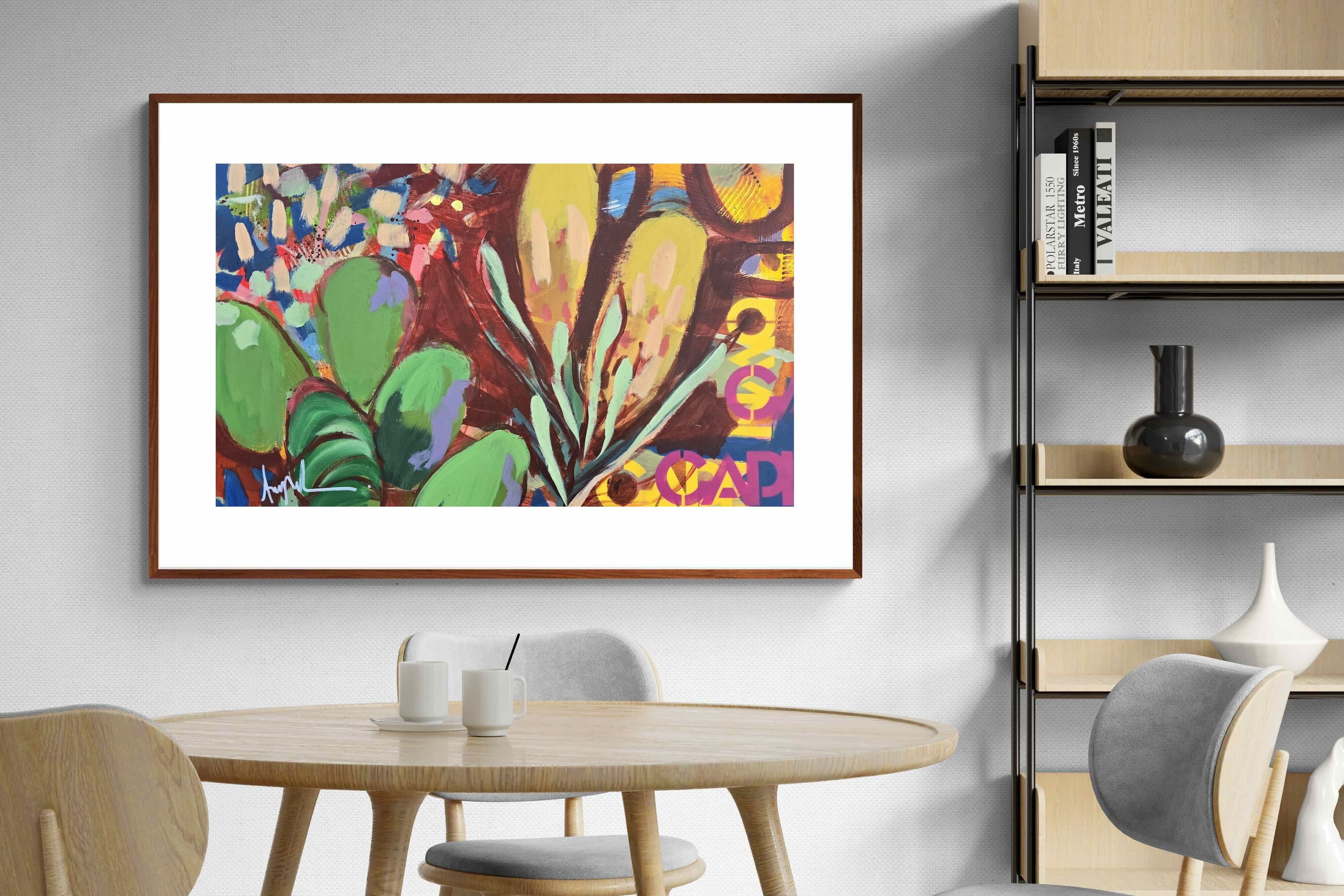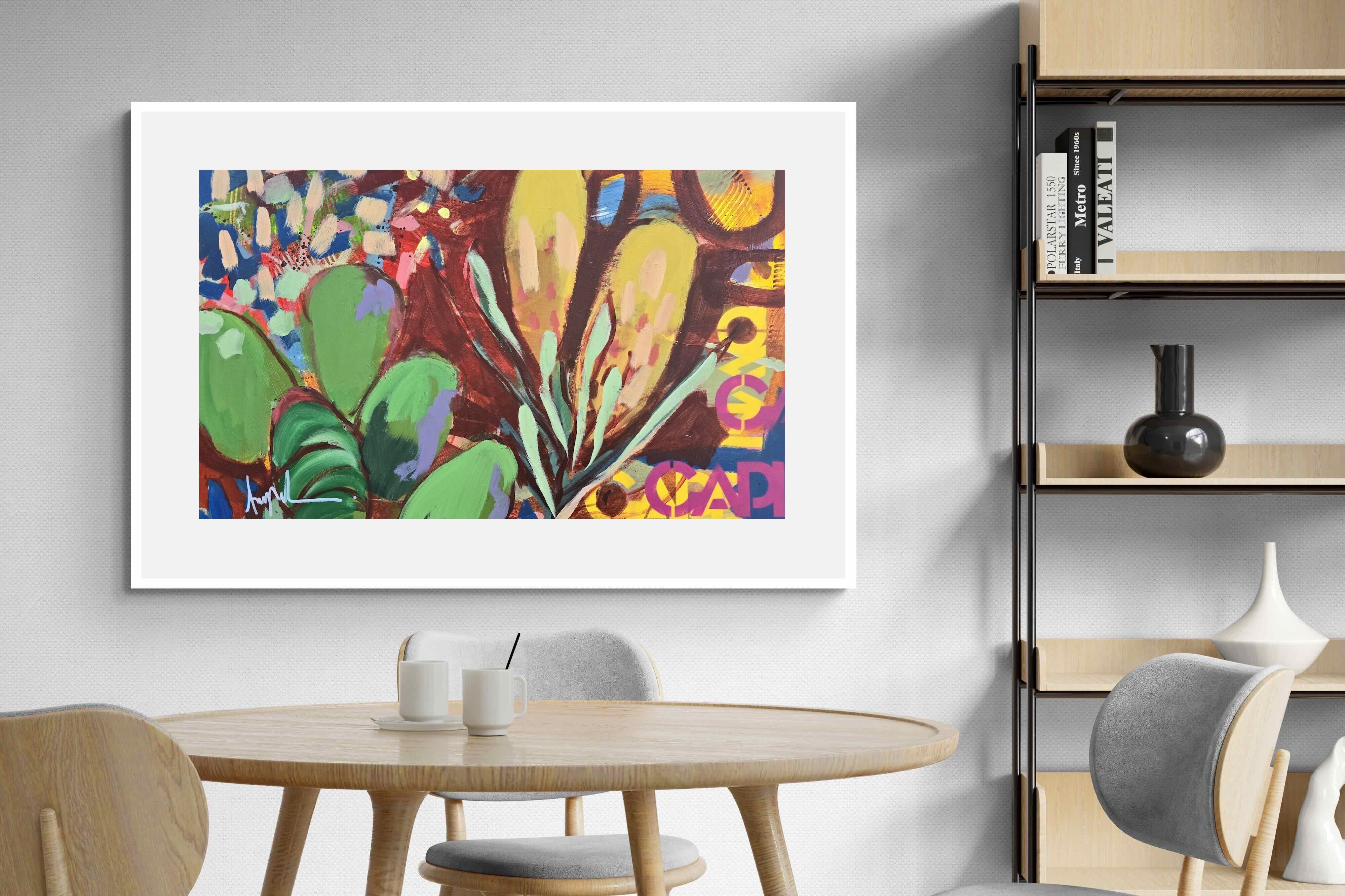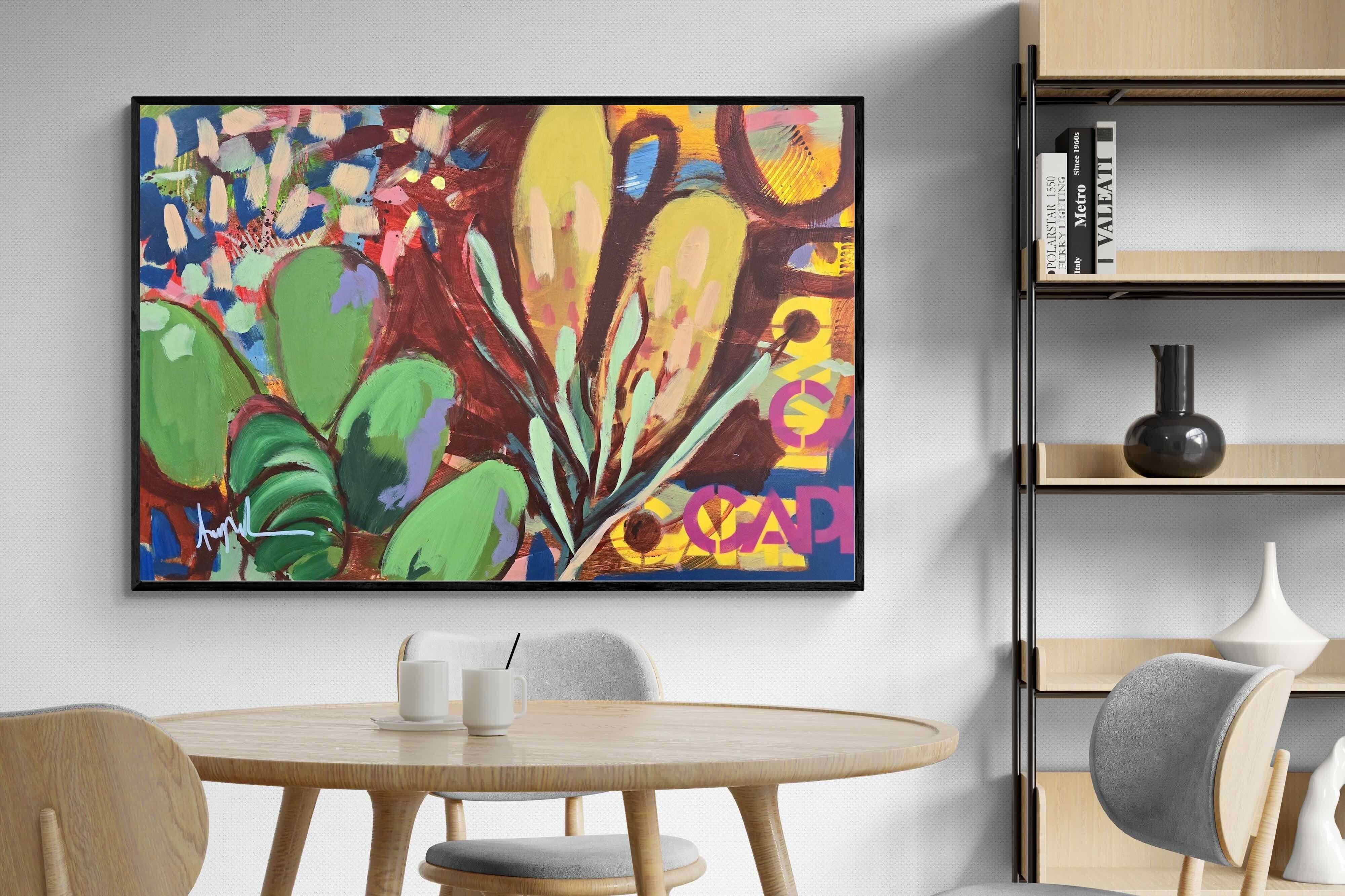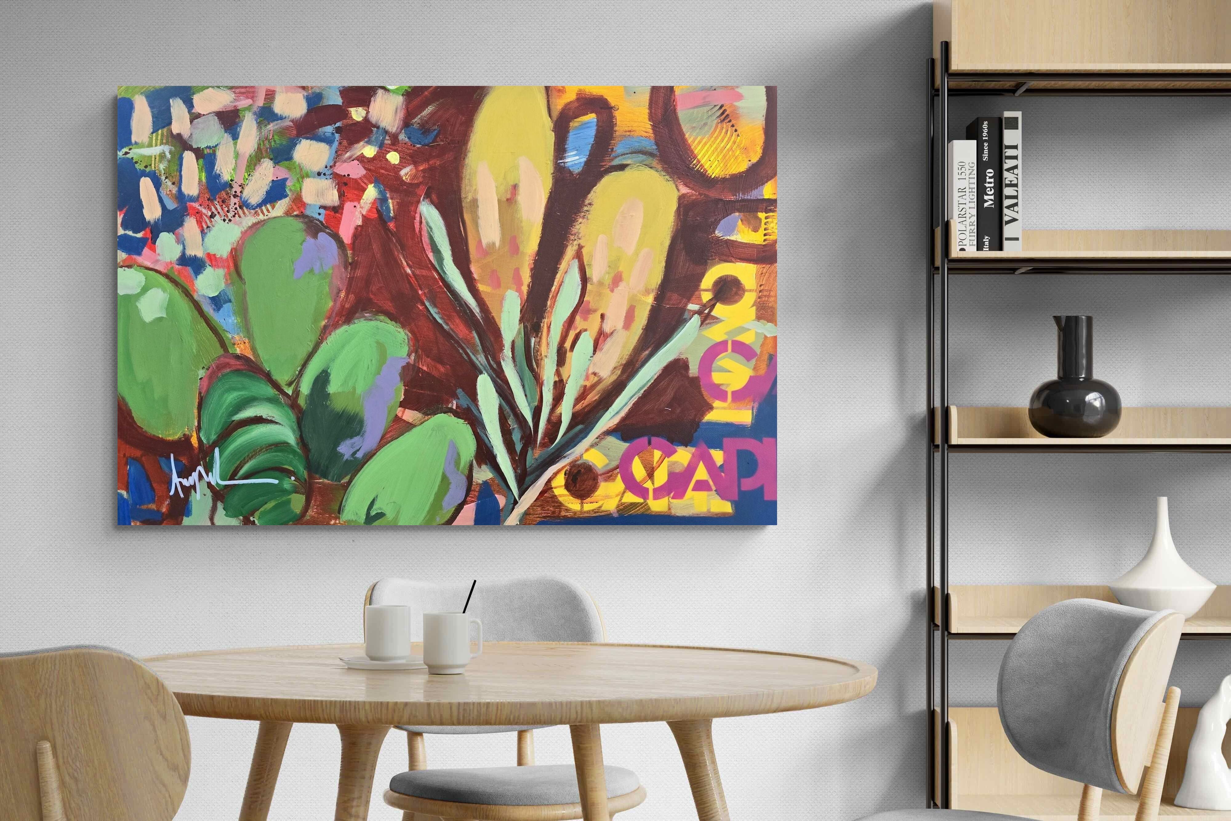 Inspired by the diverse plant life surrounding Cape Town, this energetic abstract painting celebrates the vivid colours and forms of the Cape’s unique flora. Loose brushwork, layered shapes and playful textures create a lively composition filled with movement and warmth. Hints of protea-like blooms and foliage evoke the wild landscapes of the Western Cape. This expressive artwork makes uplifting wall art for modern interiors and creative spaces.
