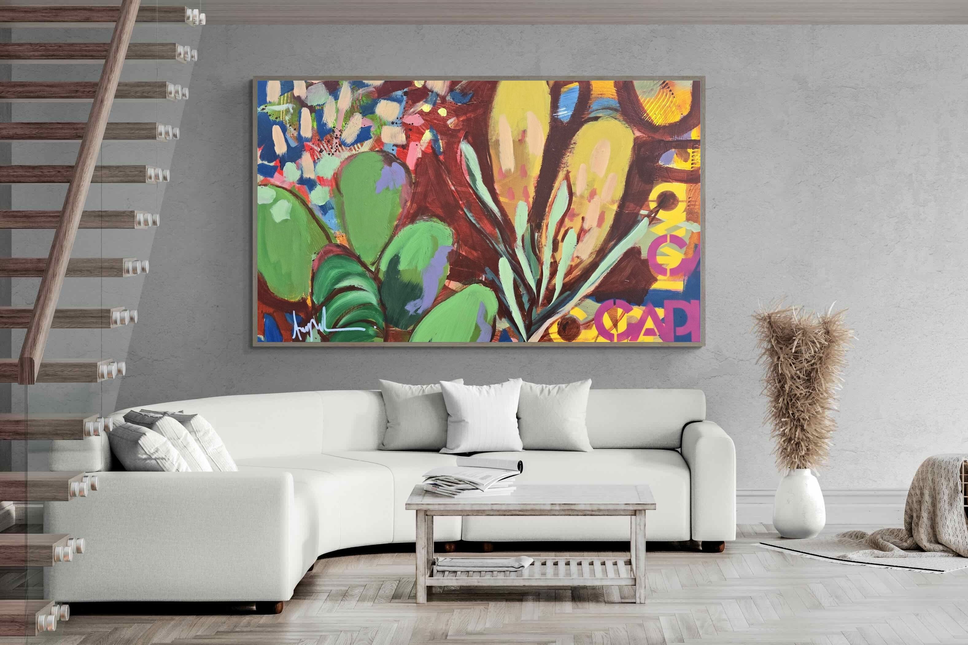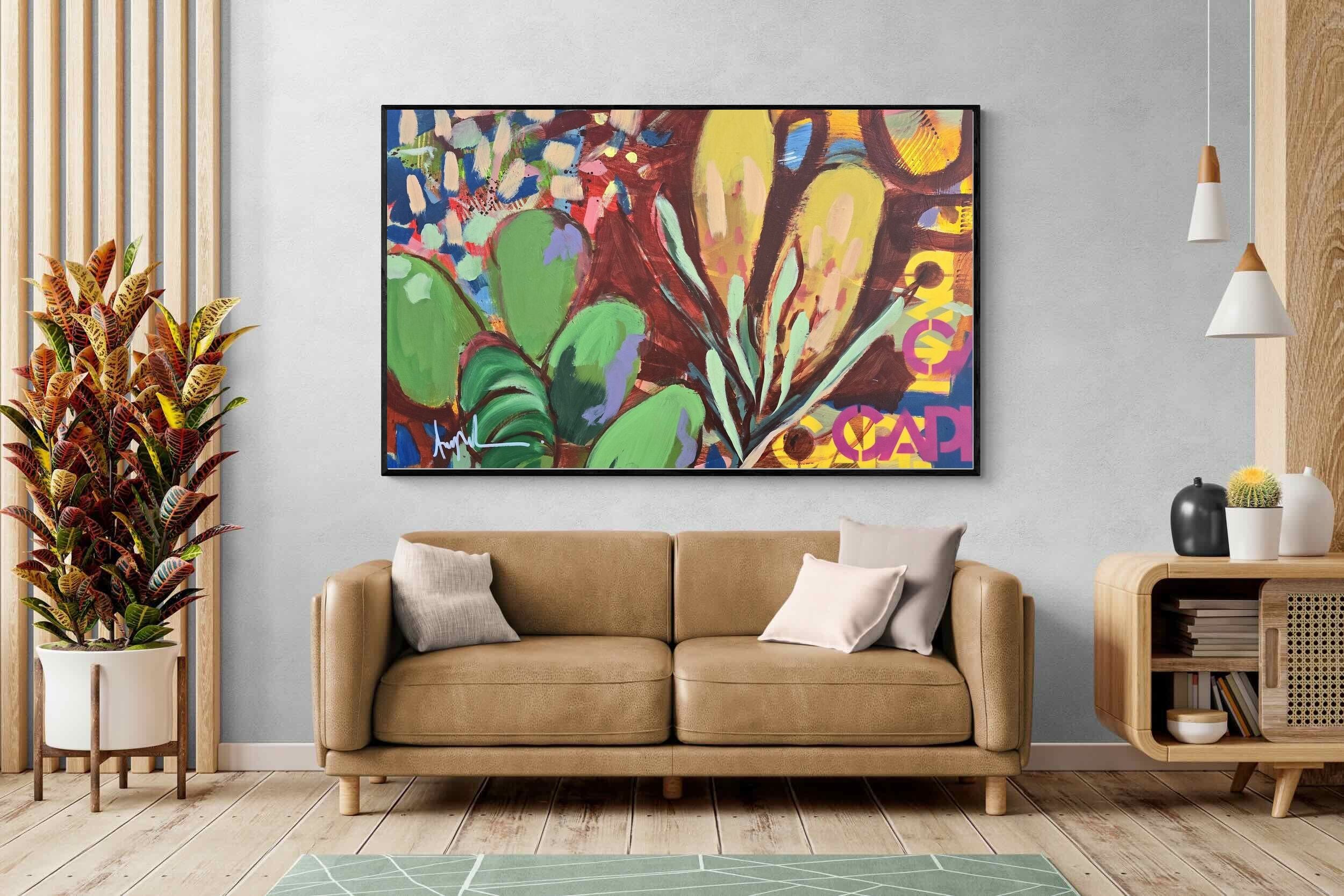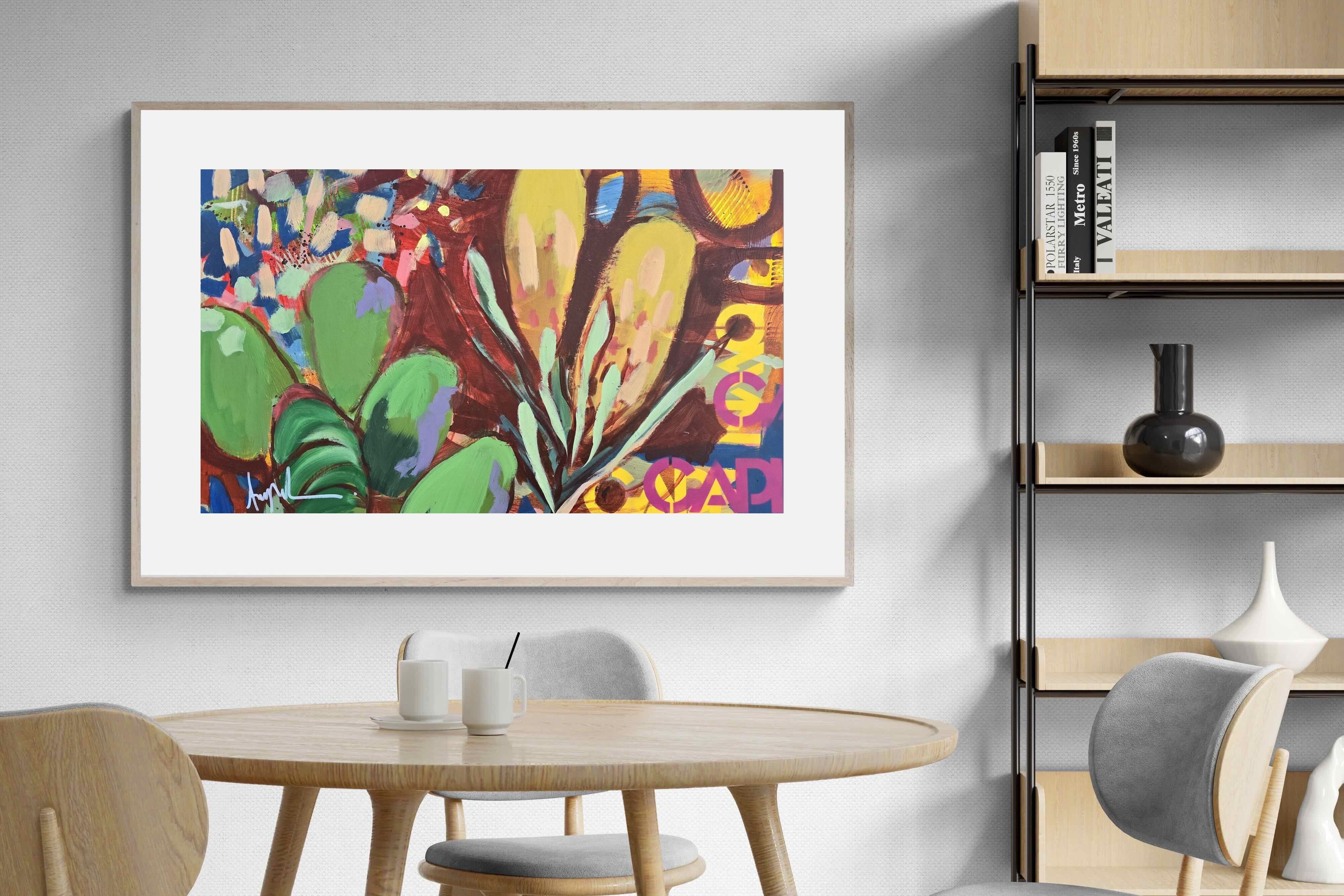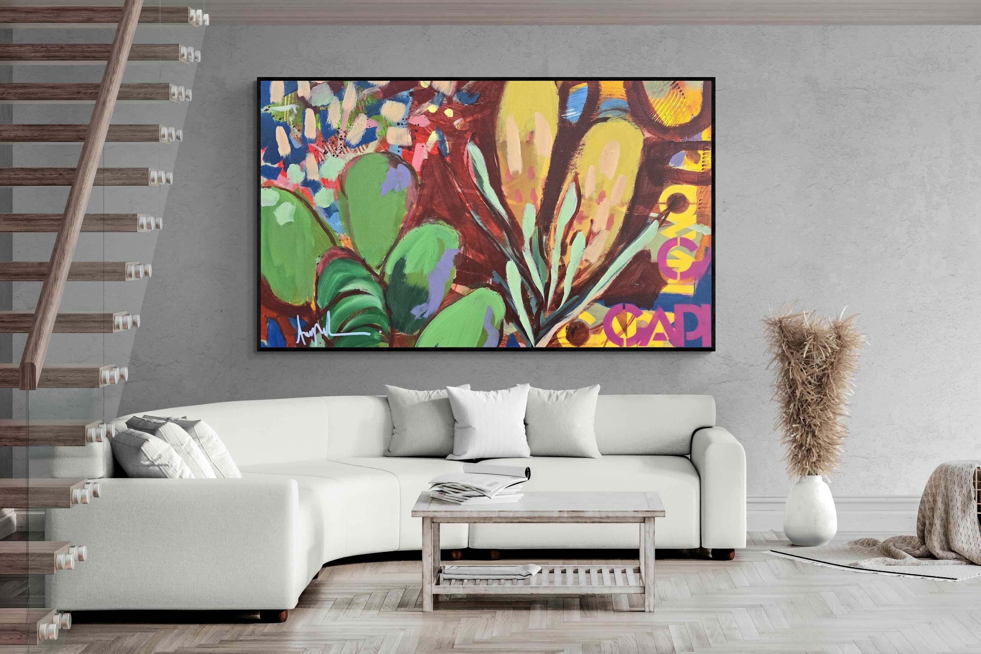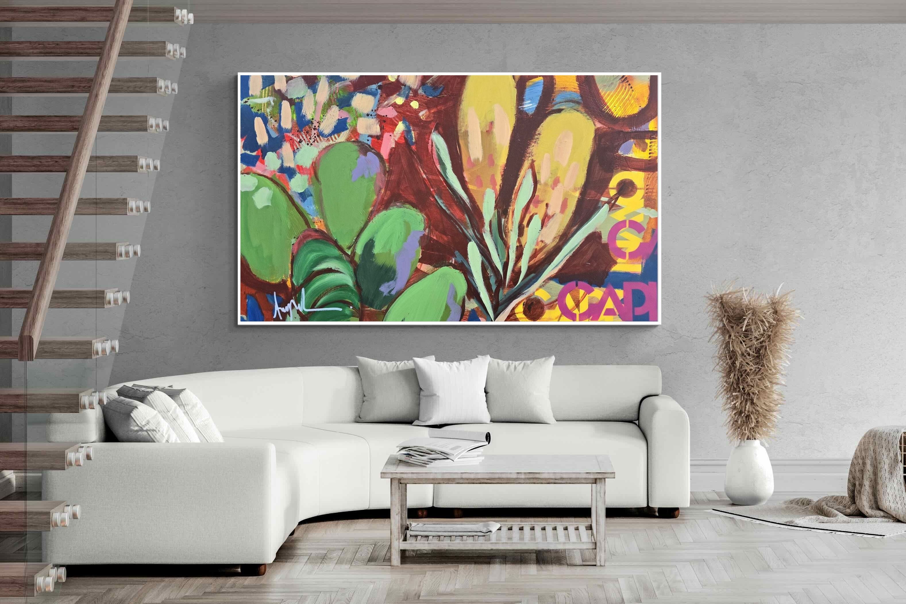 Inspired by the diverse plant life surrounding Cape Town, this energetic abstract painting celebrates the vivid colours and forms of the Cape’s unique flora. Loose brushwork, layered shapes and playful textures create a lively composition filled with movement and warmth. Hints of protea-like blooms and foliage evoke the wild landscapes of the Western Cape. This expressive artwork makes uplifting wall art for modern interiors and creative spaces.