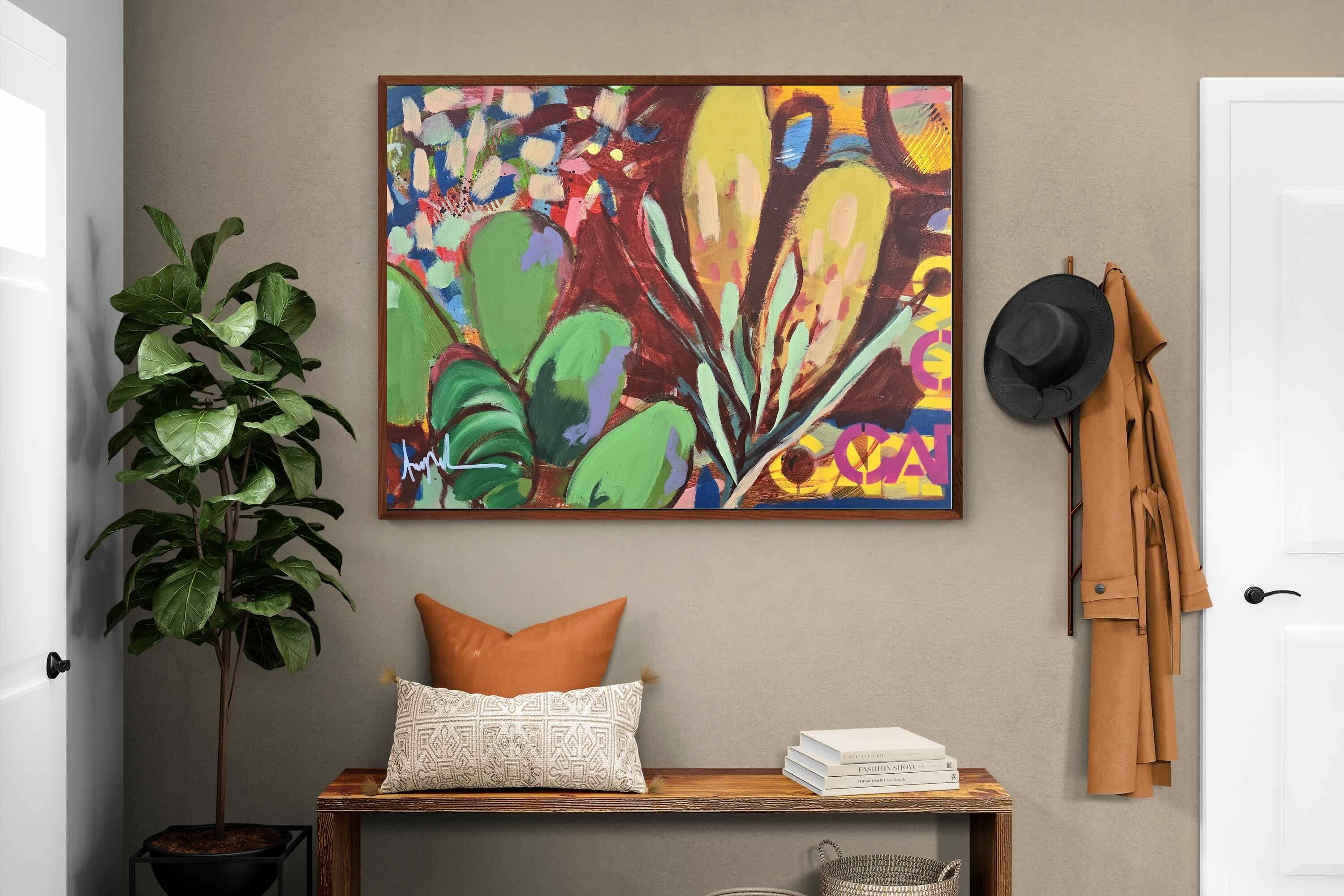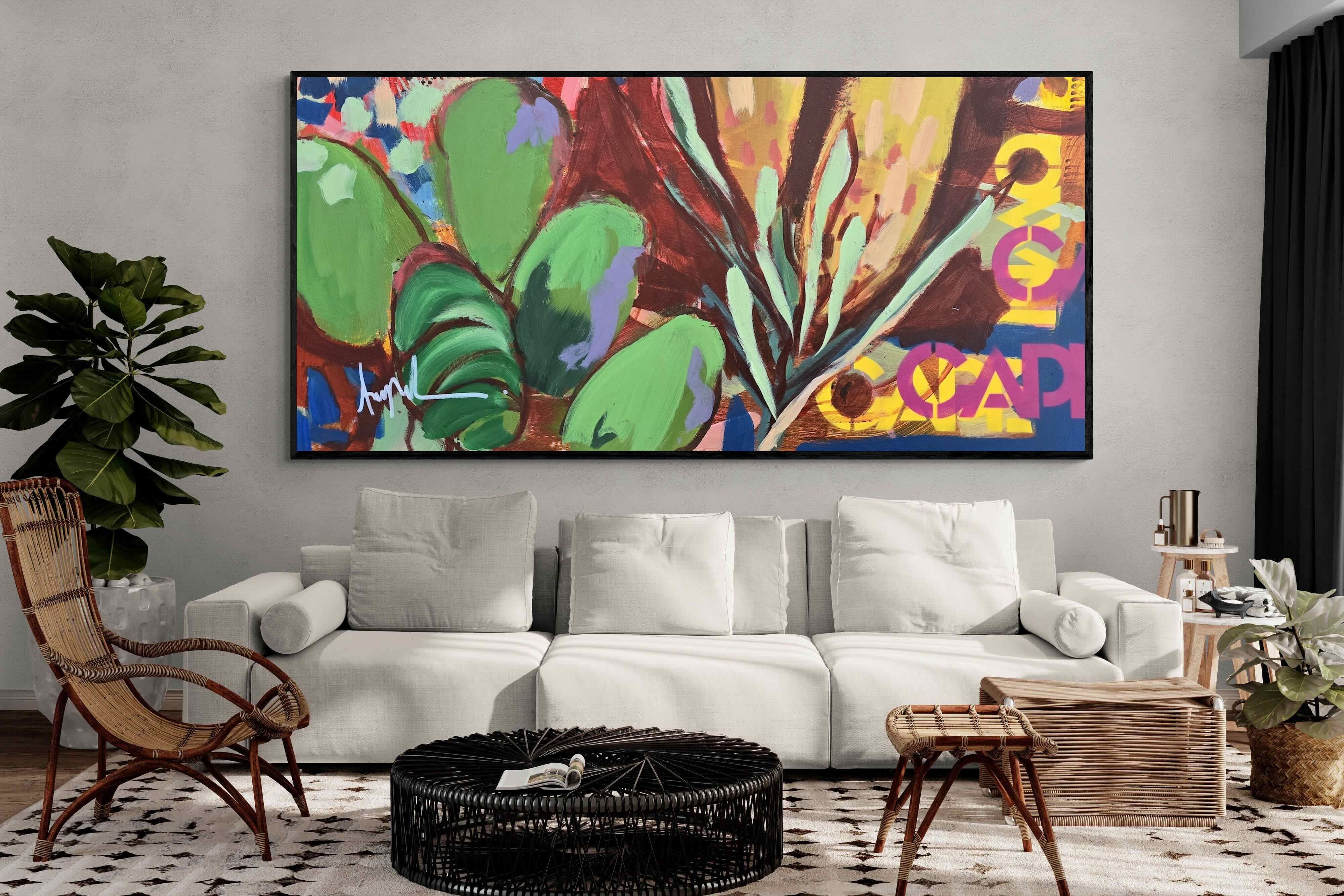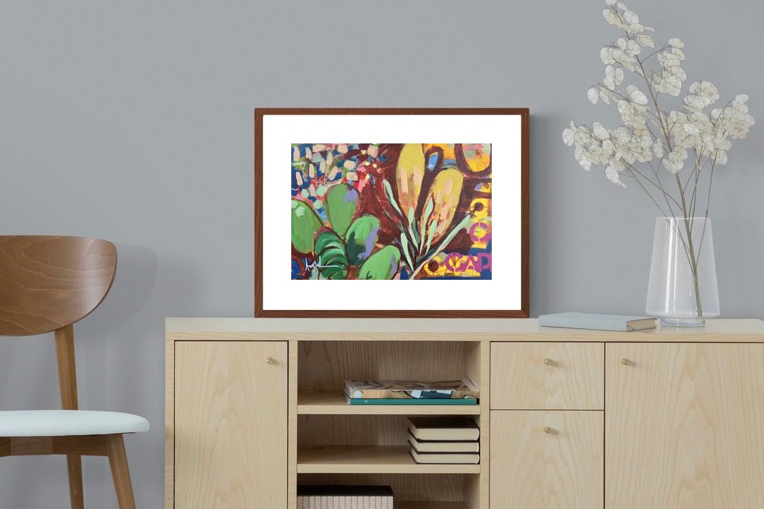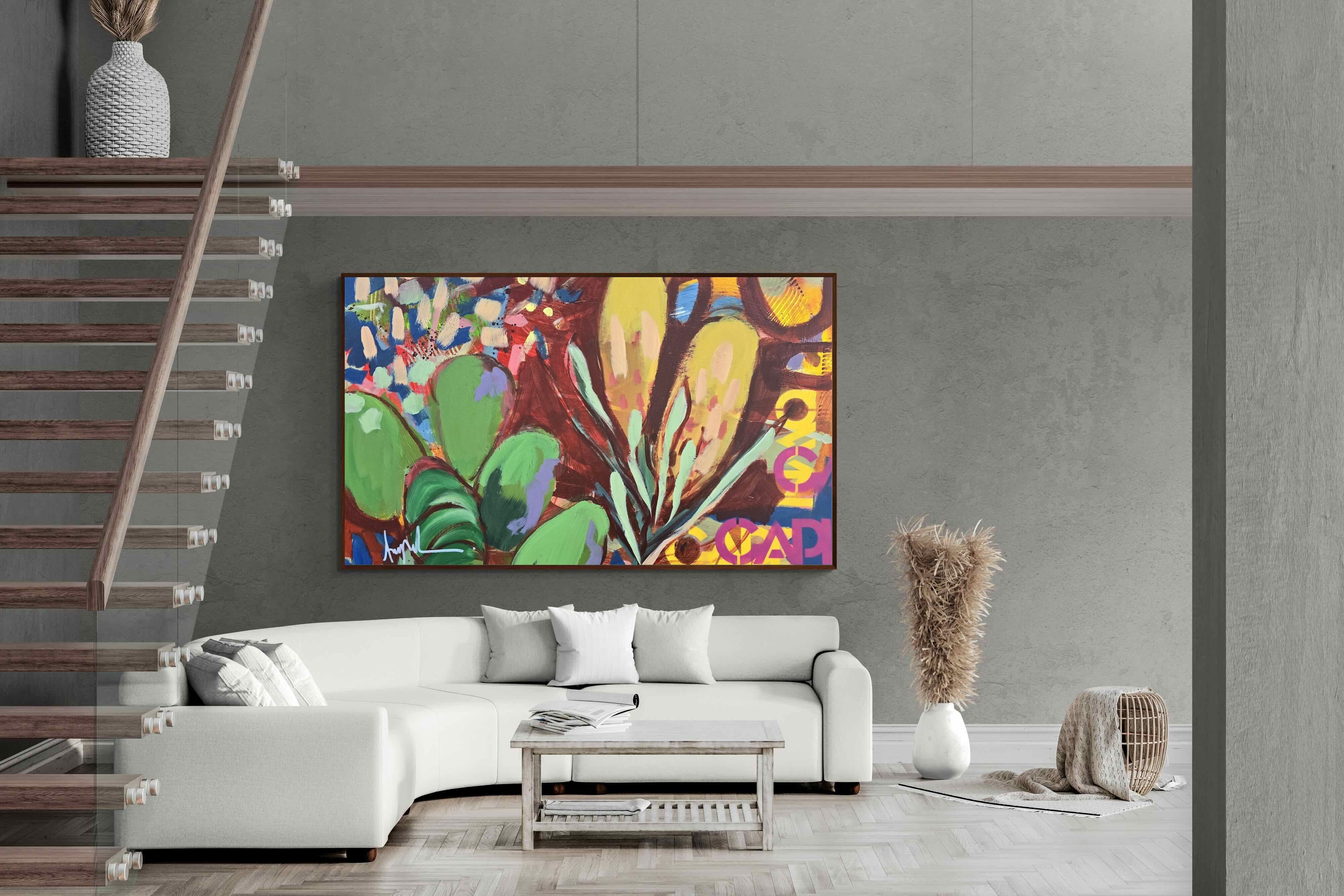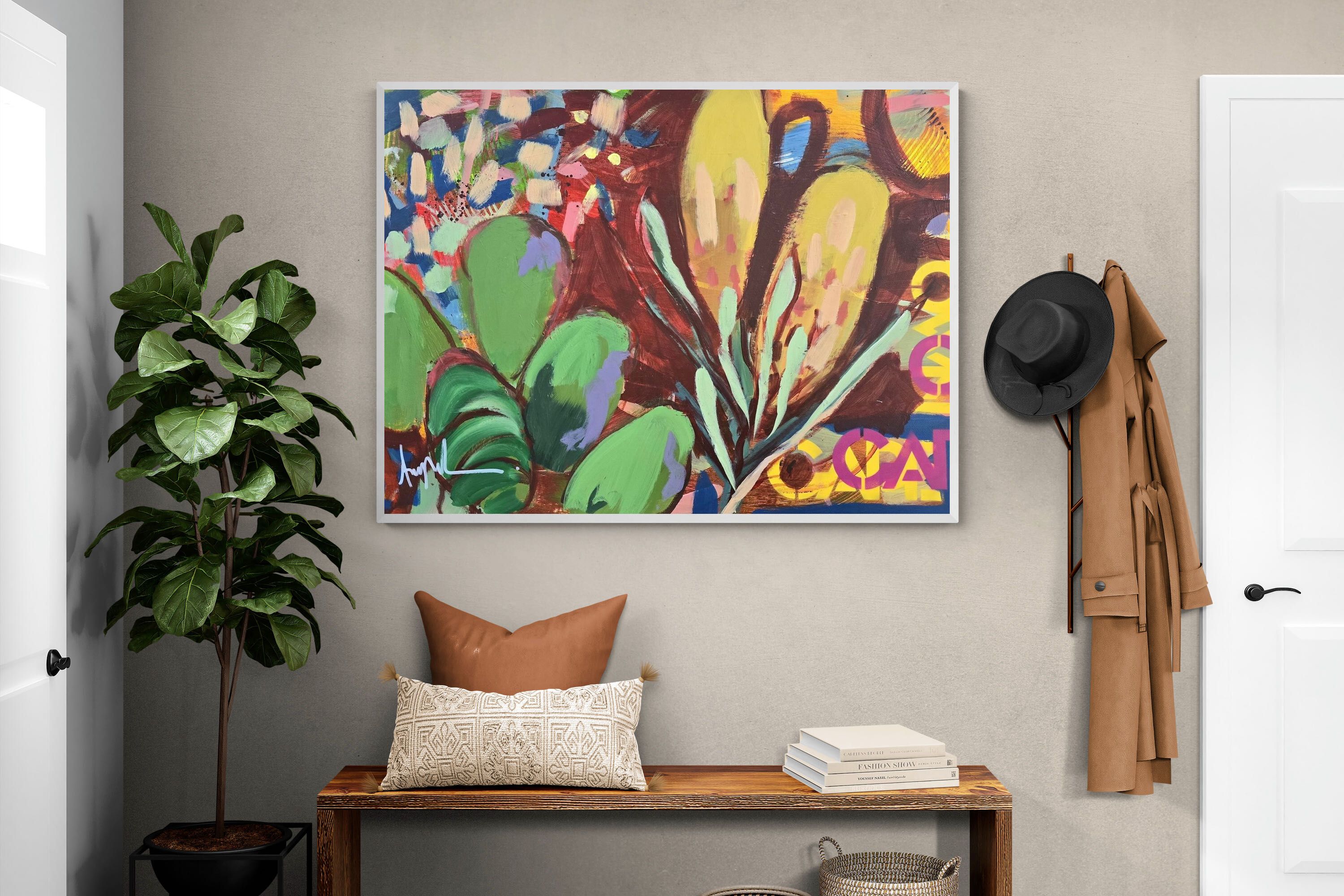 Inspired by the diverse plant life surrounding Cape Town, this energetic abstract painting celebrates the vivid colours and forms of the Cape’s unique flora. Loose brushwork, layered shapes and playful textures create a lively composition filled with movement and warmth. Hints of protea-like blooms and foliage evoke the wild landscapes of the Western Cape. This expressive artwork makes uplifting wall art for modern interiors and creative spaces.