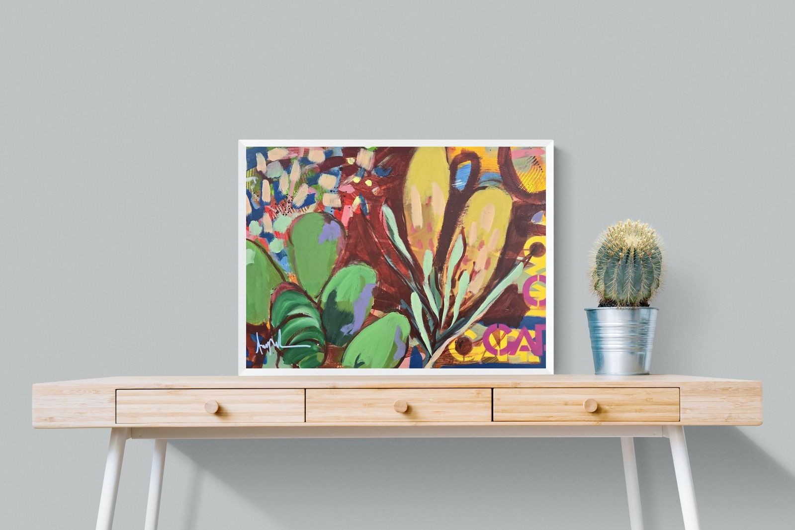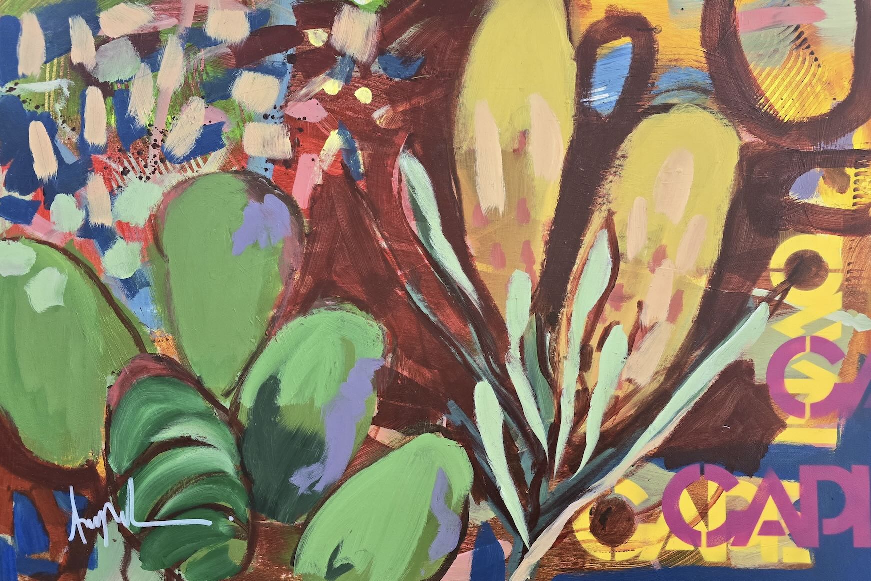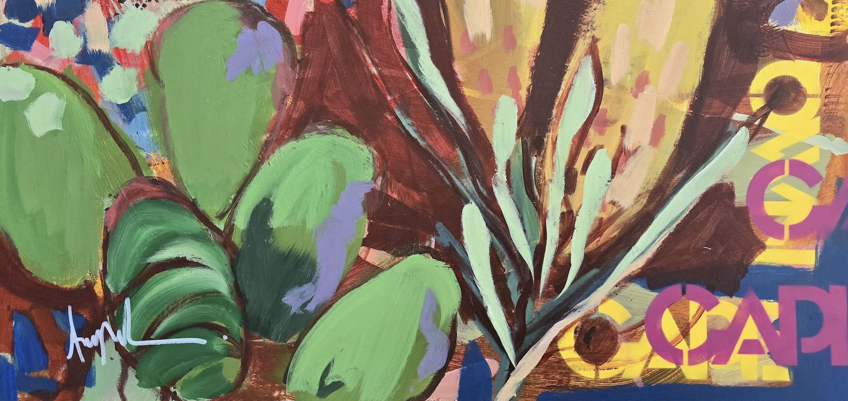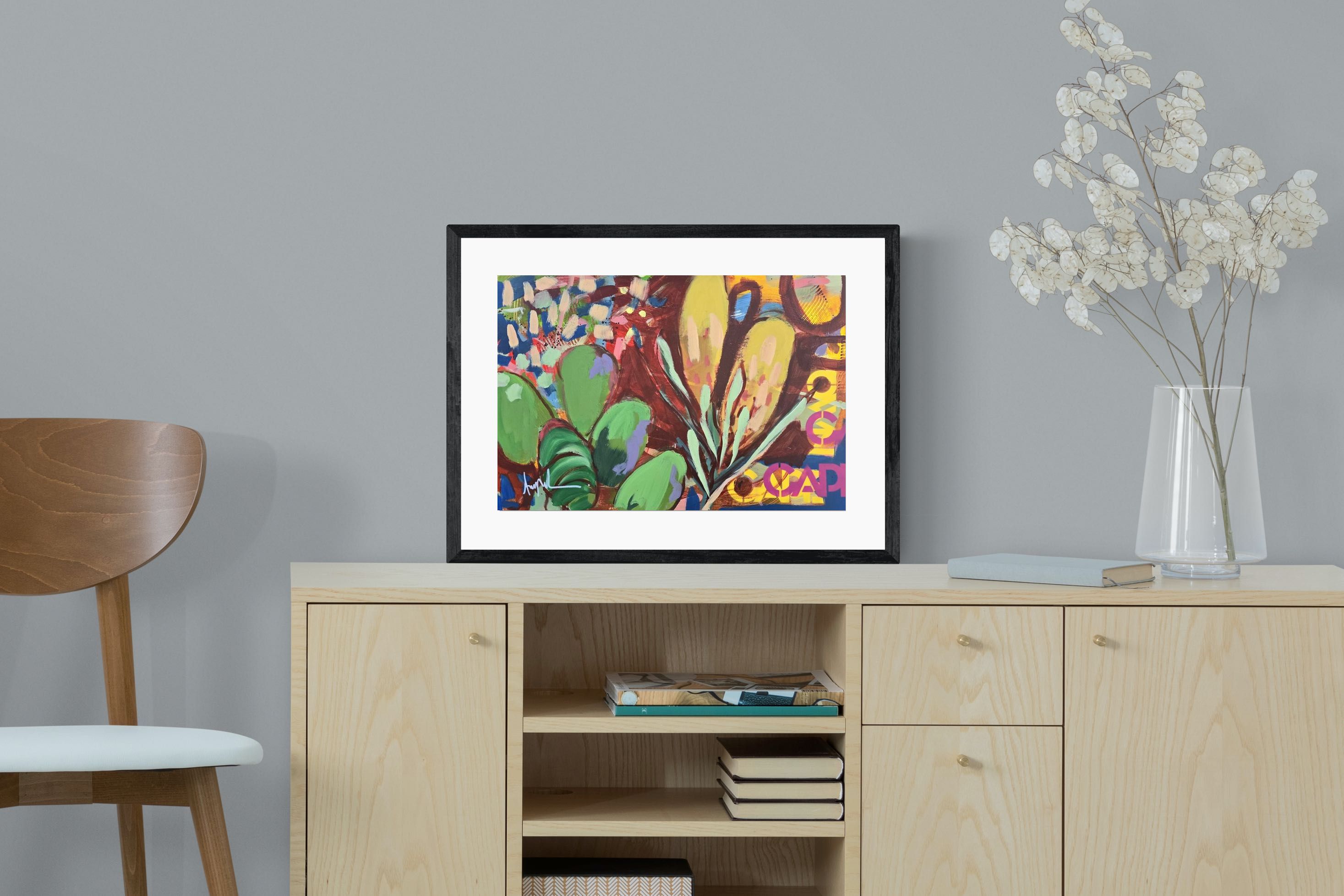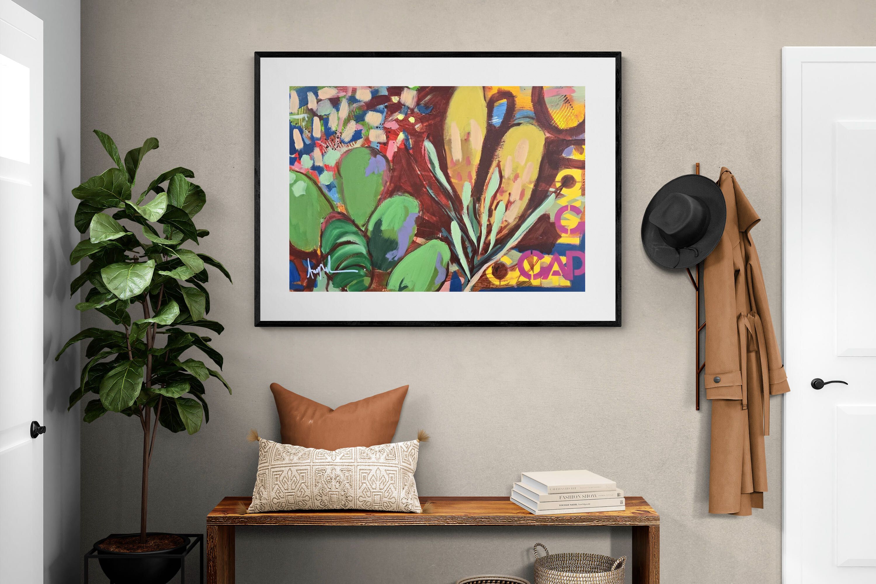 Inspired by the diverse plant life surrounding Cape Town, this energetic abstract painting celebrates the vivid colours and forms of the Cape’s unique flora. Loose brushwork, layered shapes and playful textures create a lively composition filled with movement and warmth. Hints of protea-like blooms and foliage evoke the wild landscapes of the Western Cape. This expressive artwork makes uplifting wall art for modern interiors and creative spaces.