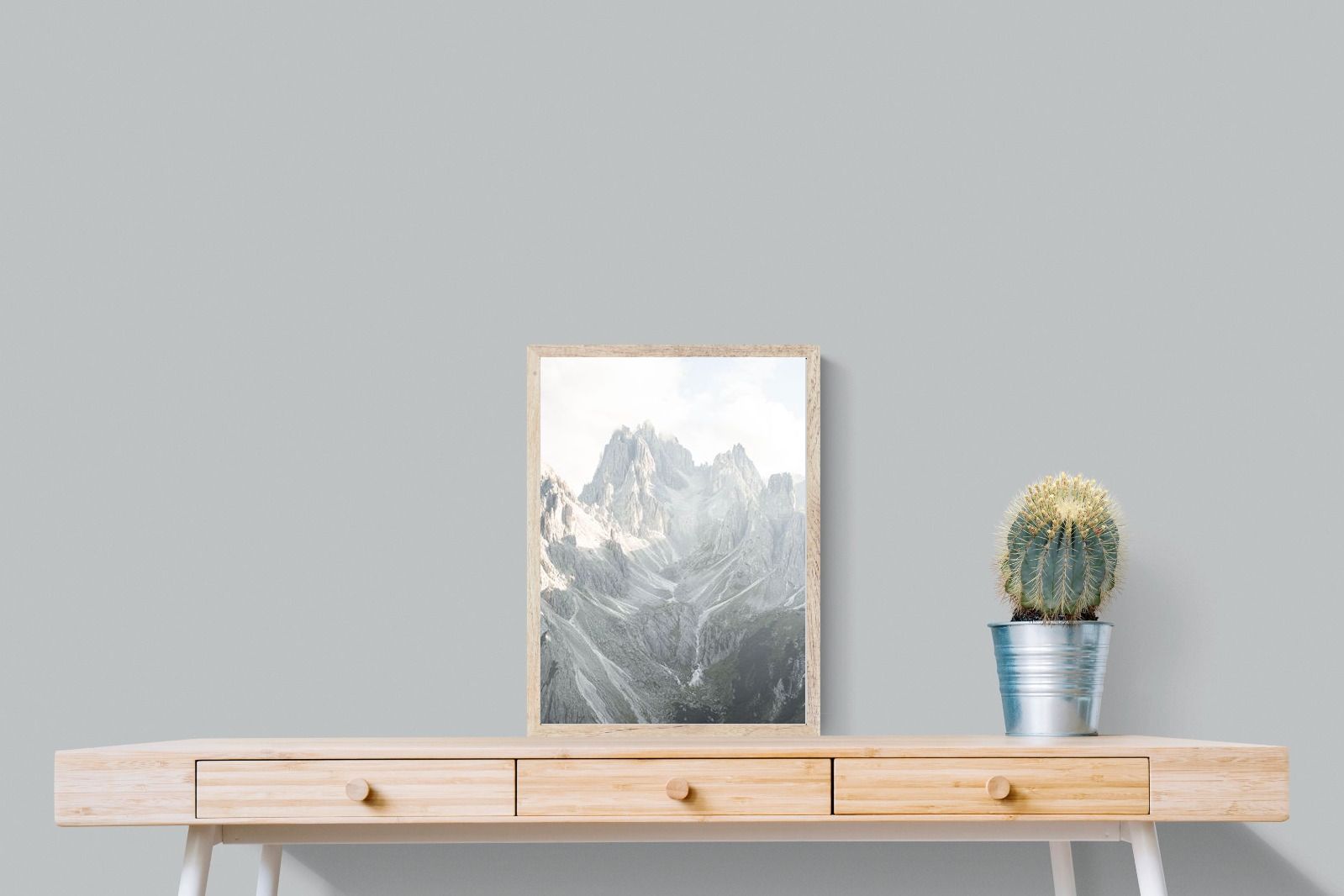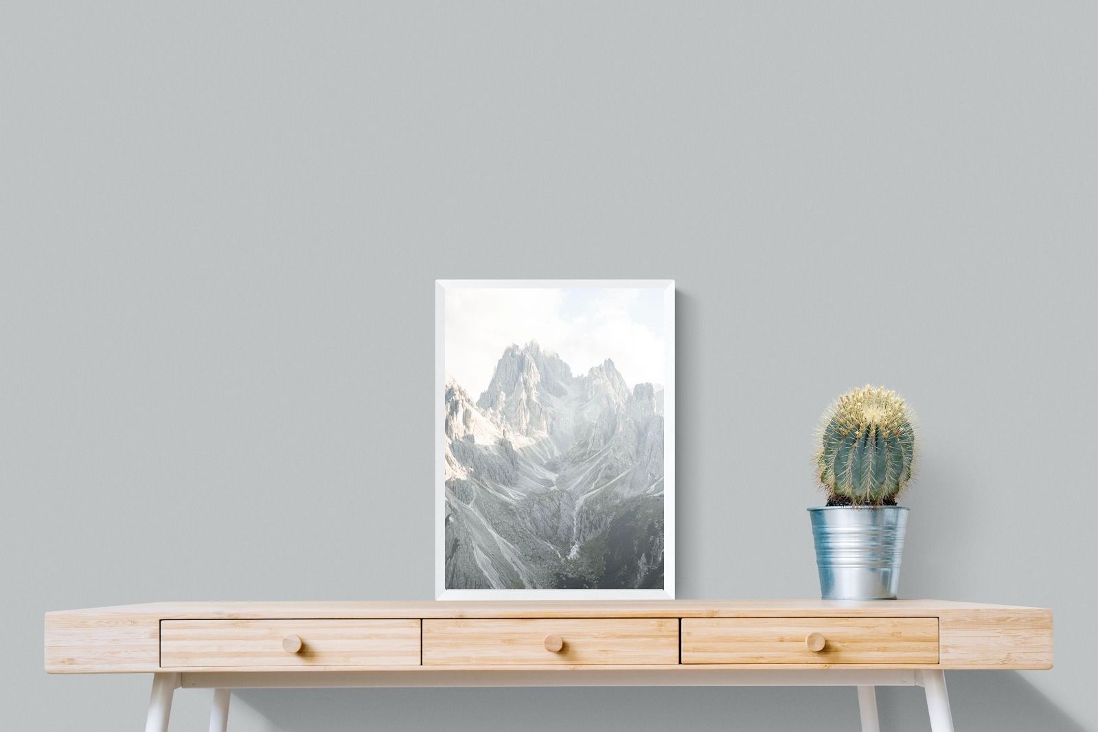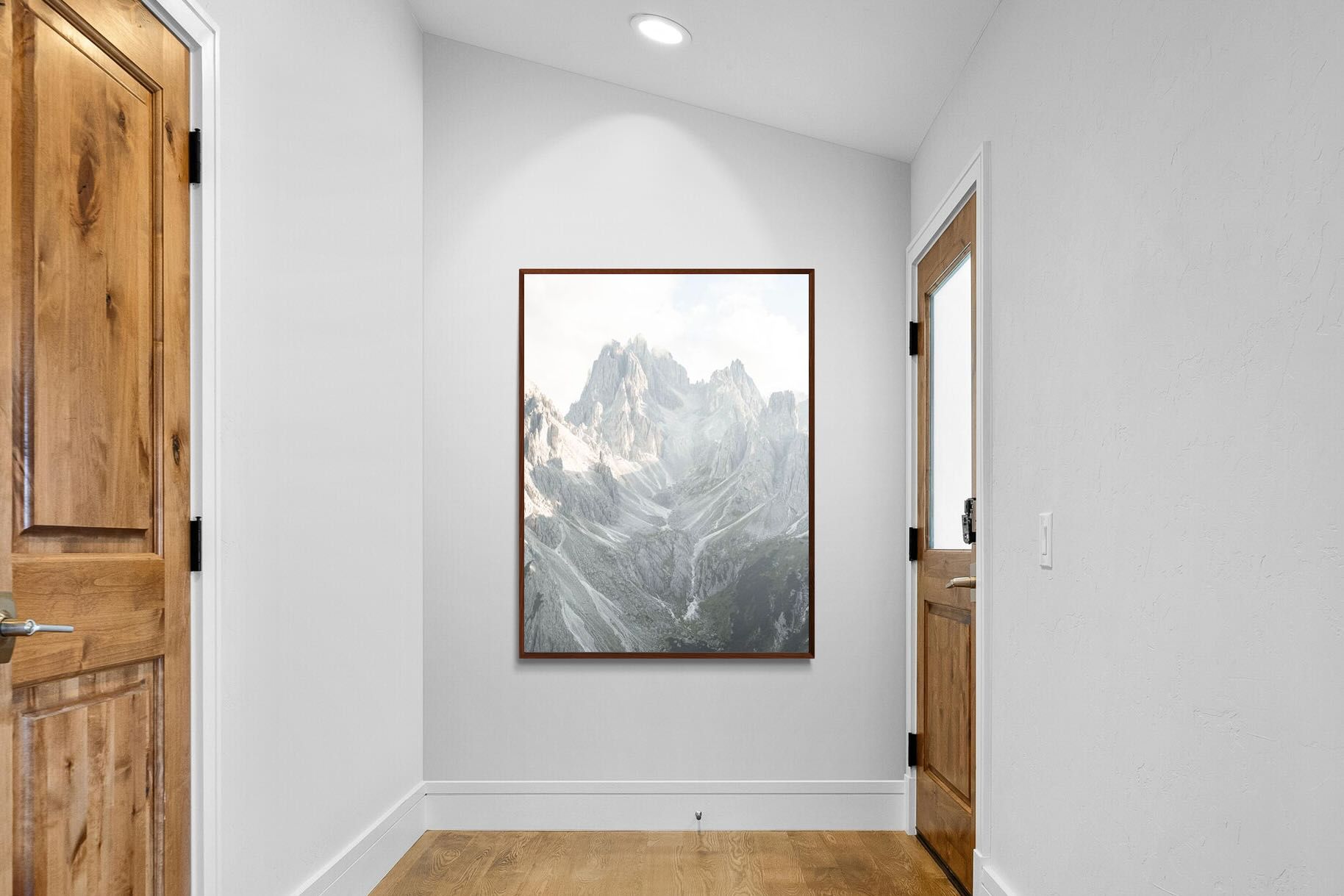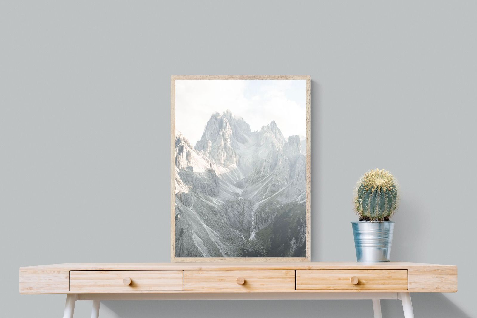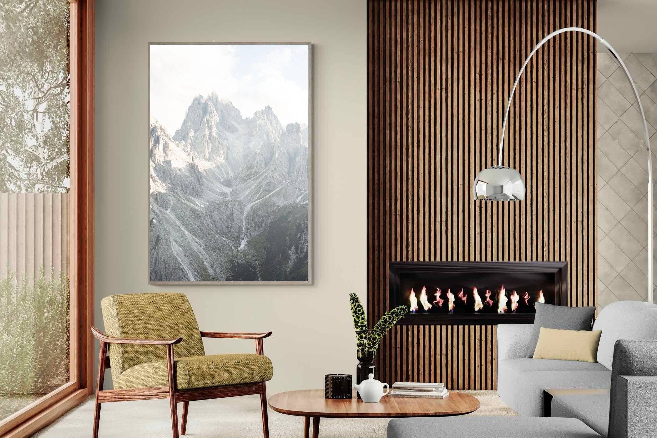 Sharp limestone peaks rise through soft morning haze, their ridgelines carved with striking geological detail. Subtle tones of grey and pale sage create an ethereal, almost monochrome palette that feels refined and contemporary. The vertical composition adds height and drama, making it ideal for large statement walls. Perfect for modern interiors, this artwork brings alpine grandeur and European landscape elegance into the home.