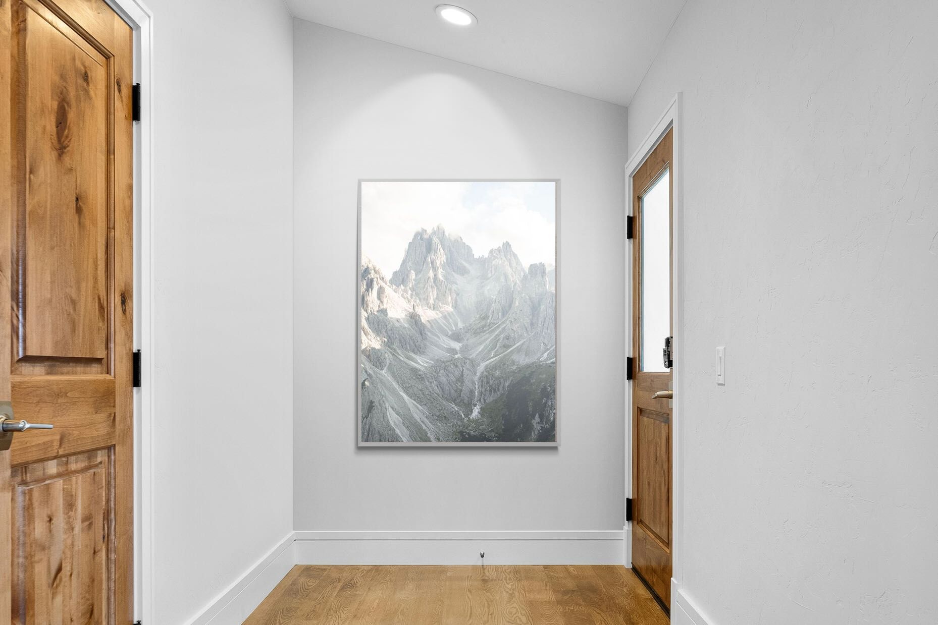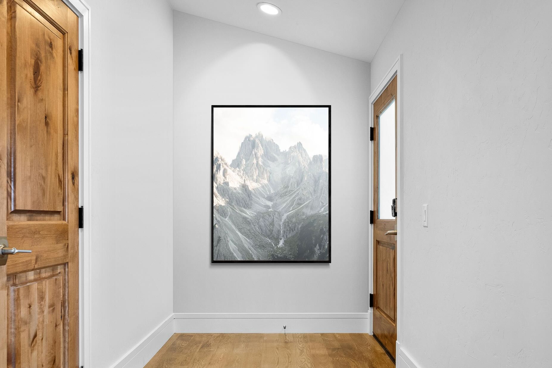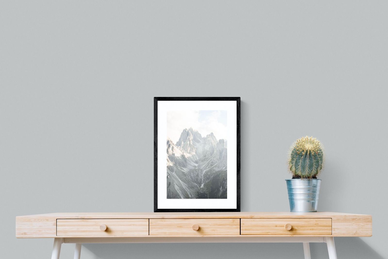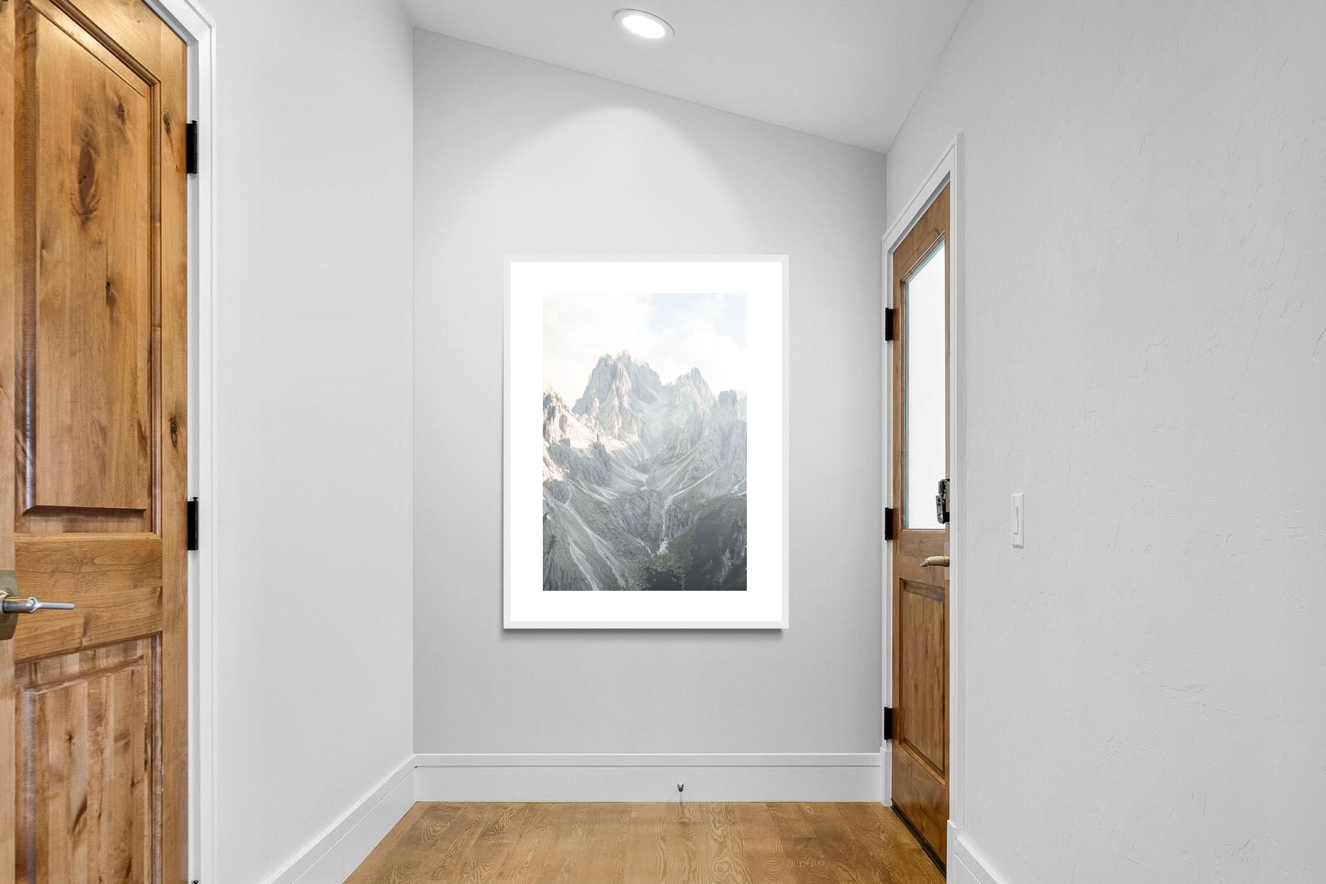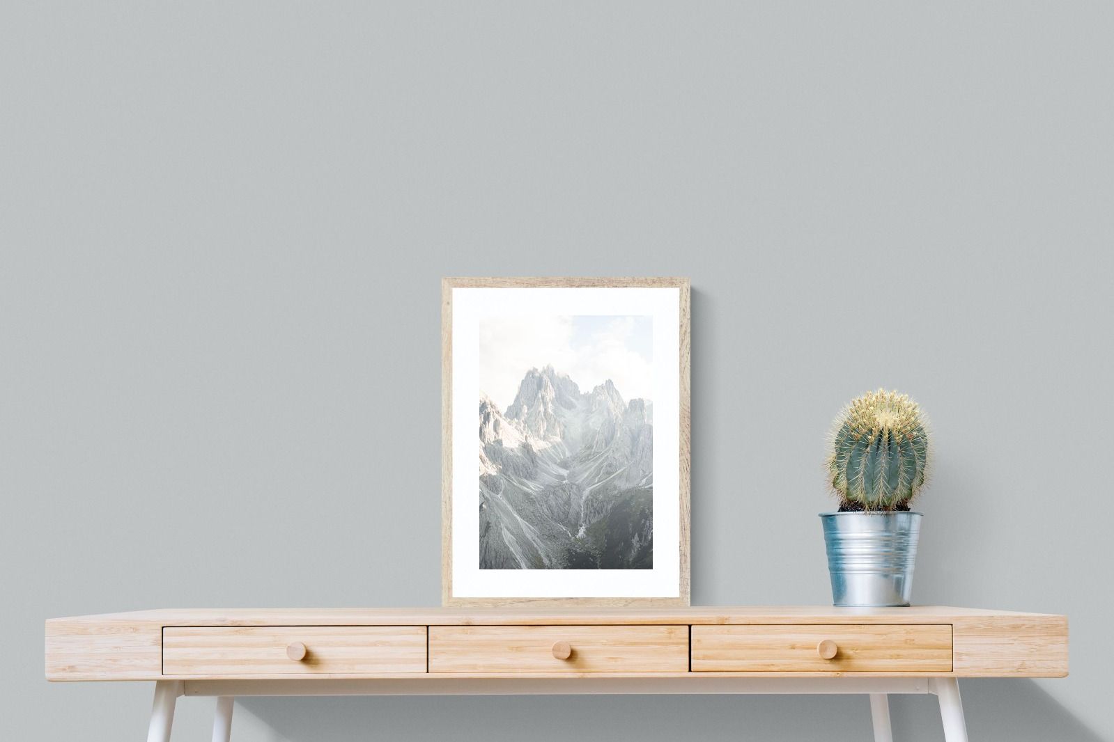 Sharp limestone peaks rise through soft morning haze, their ridgelines carved with striking geological detail. Subtle tones of grey and pale sage create an ethereal, almost monochrome palette that feels refined and contemporary. The vertical composition adds height and drama, making it ideal for large statement walls. Perfect for modern interiors, this artwork brings alpine grandeur and European landscape elegance into the home.