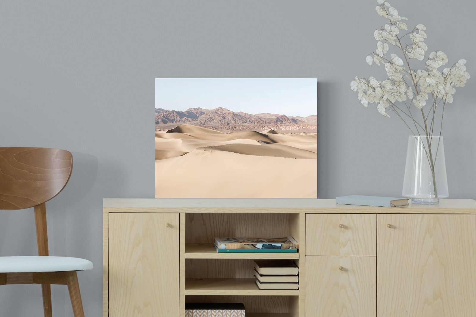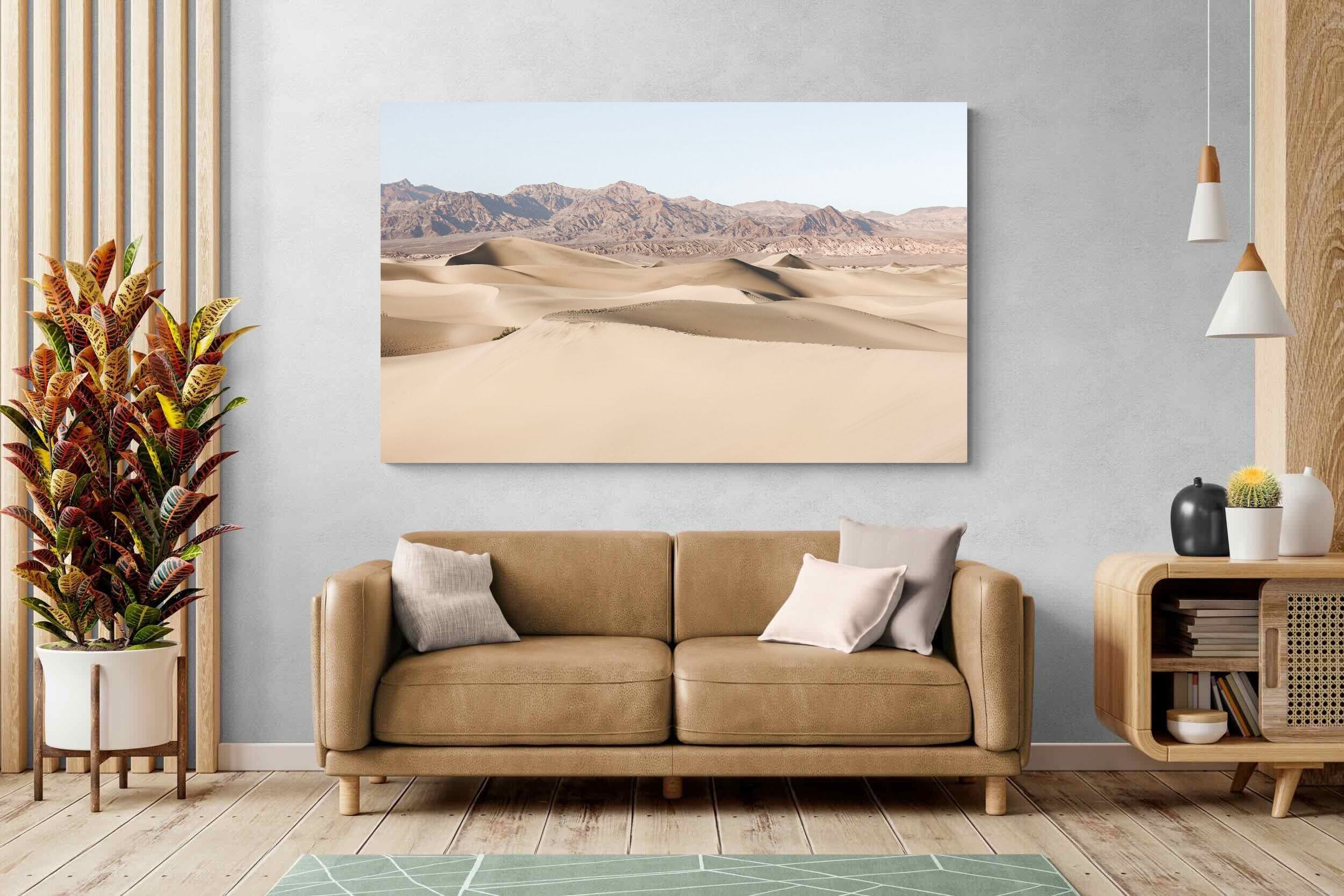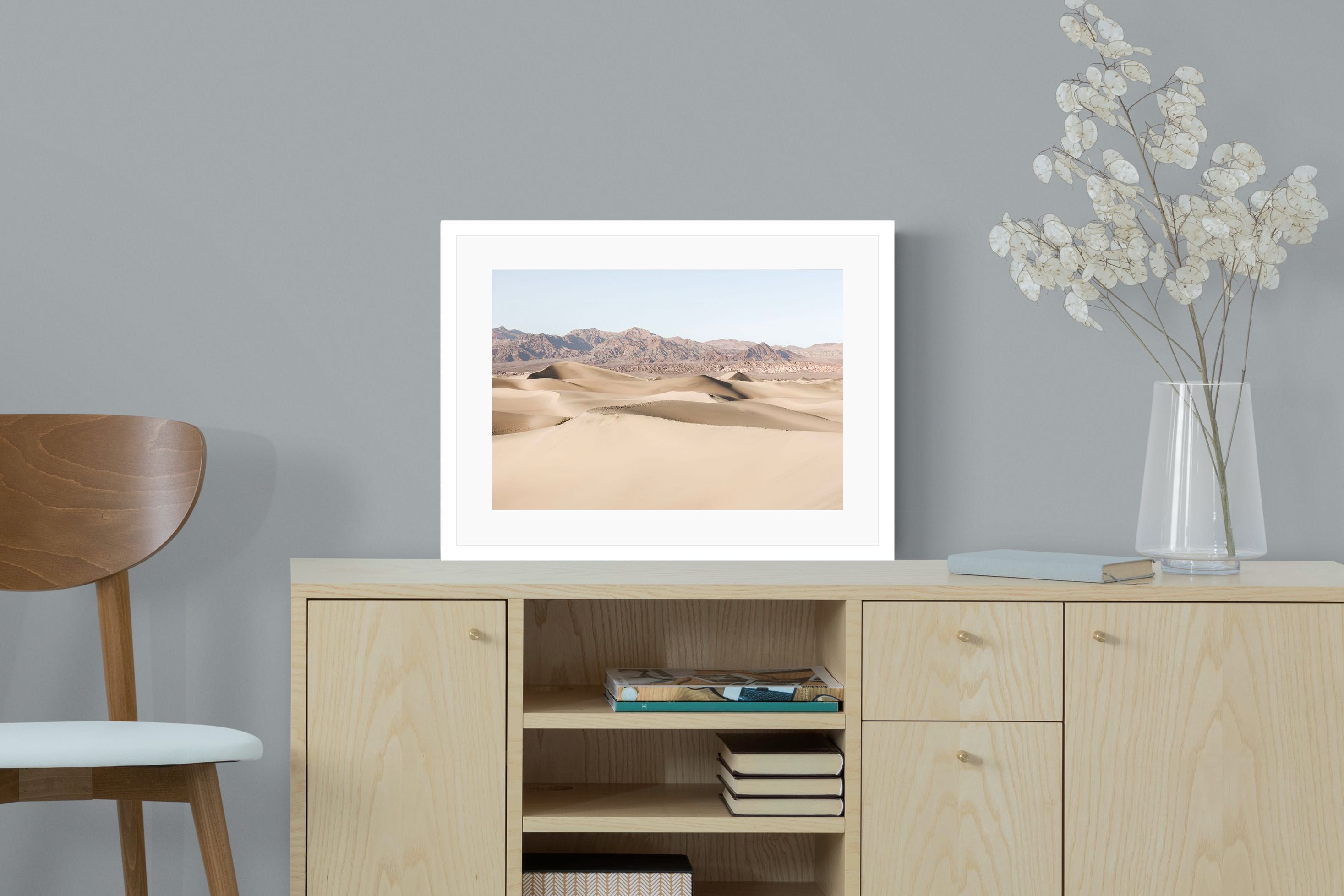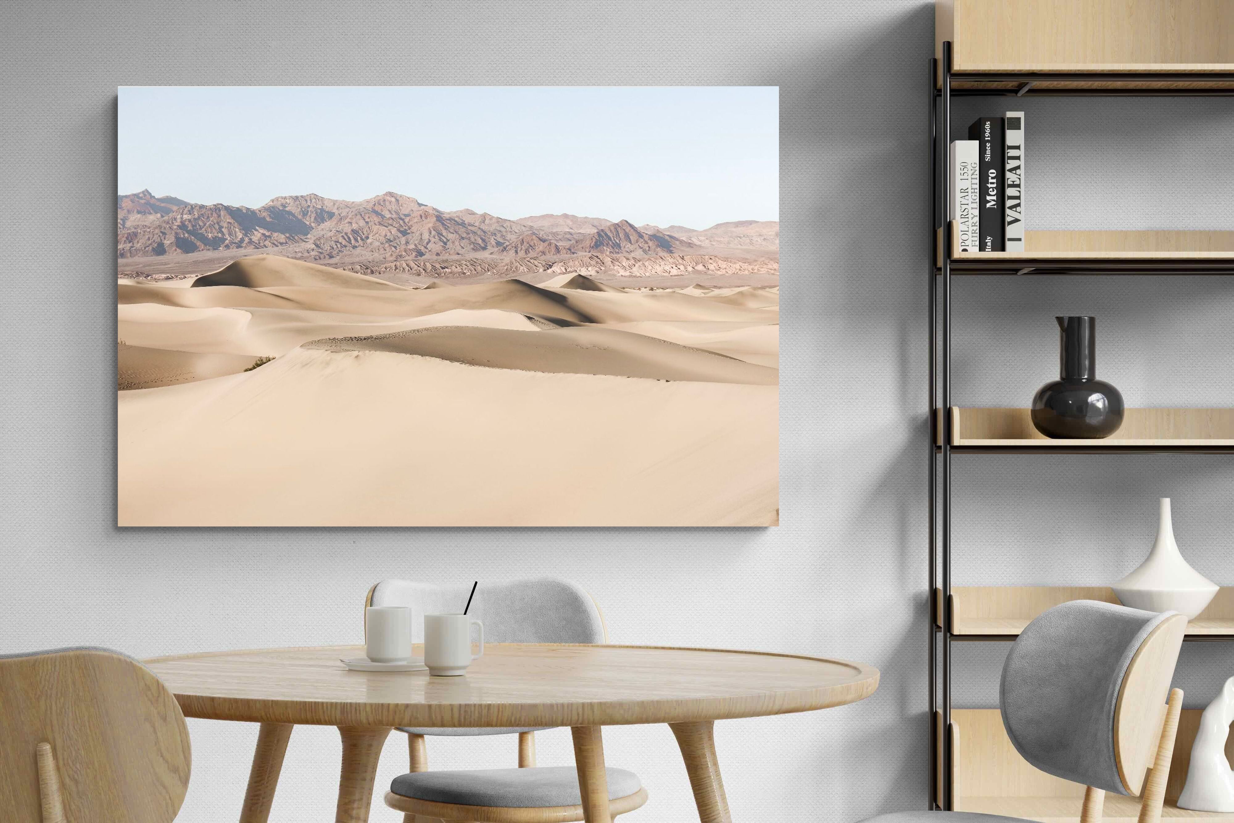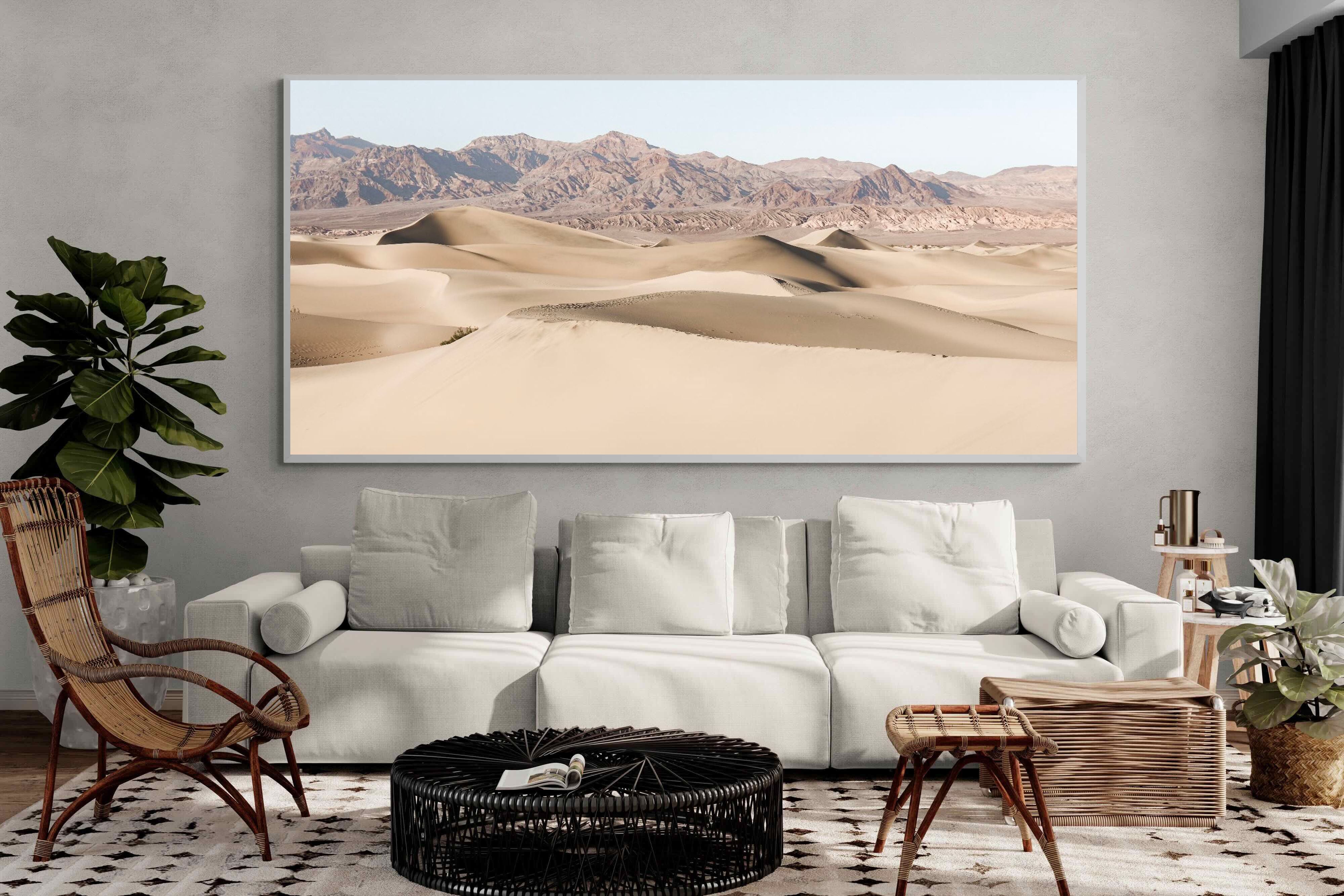 Rolling sand dunes sweep across the foreground, their sculptural curves set against distant mountain ridges beneath a clear sky. The restrained palette of beige, taupe and muted stone creates a calming, architectural aesthetic with strong negative space. Perfect for minimalist lounges, modern offices or neutral-toned interiors, this piece adds depth and quiet drama. Its simplicity allows it to anchor a room without overwhelming surrounding décor.