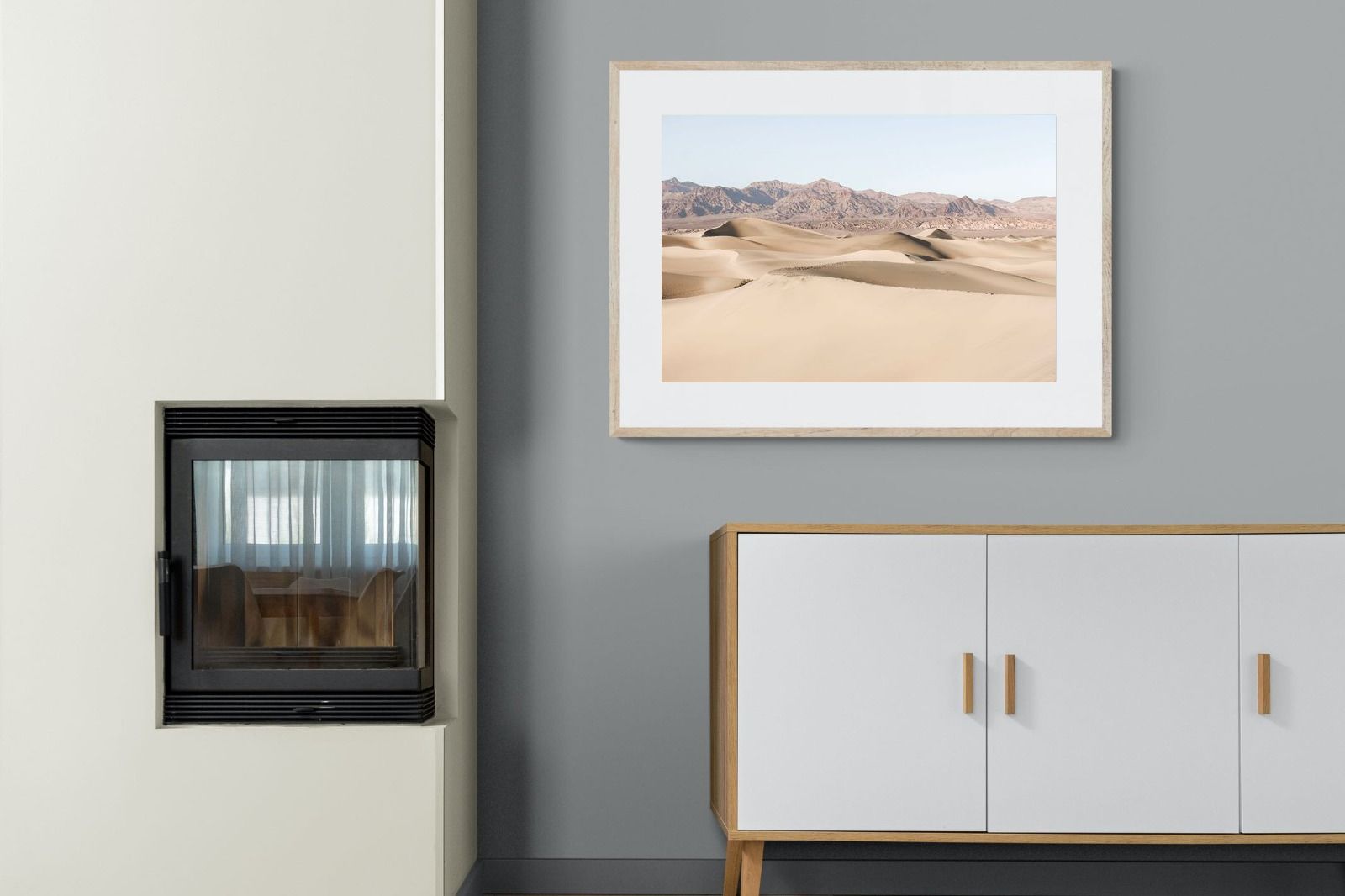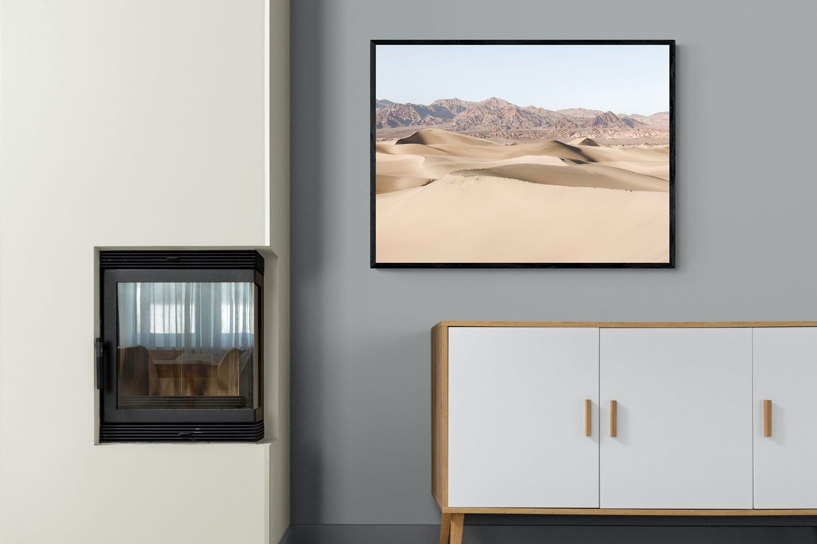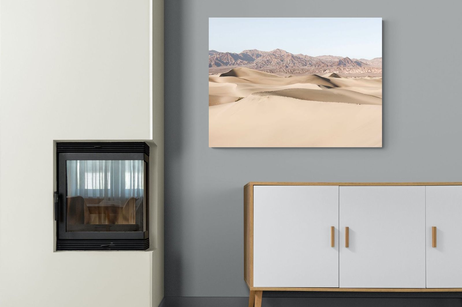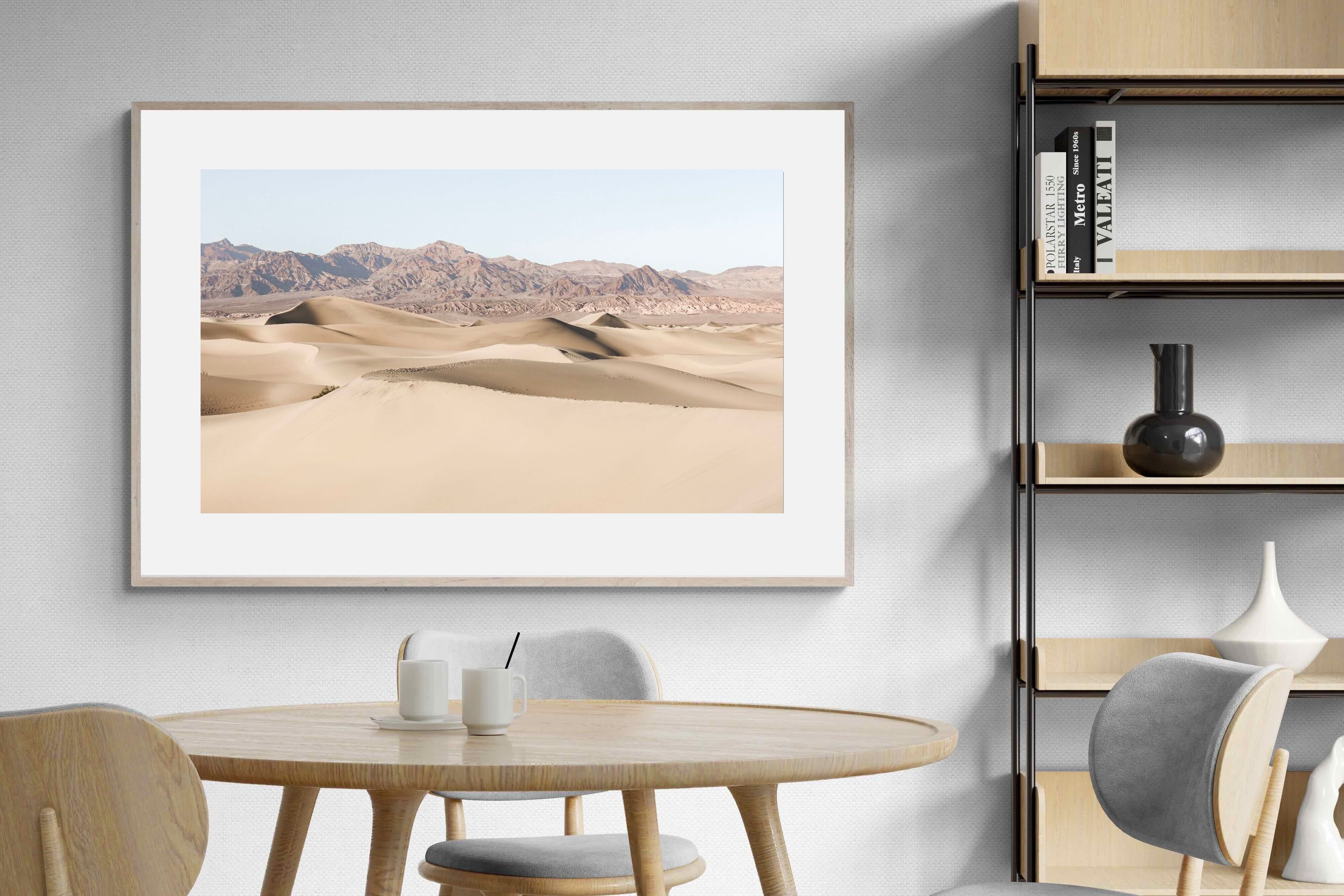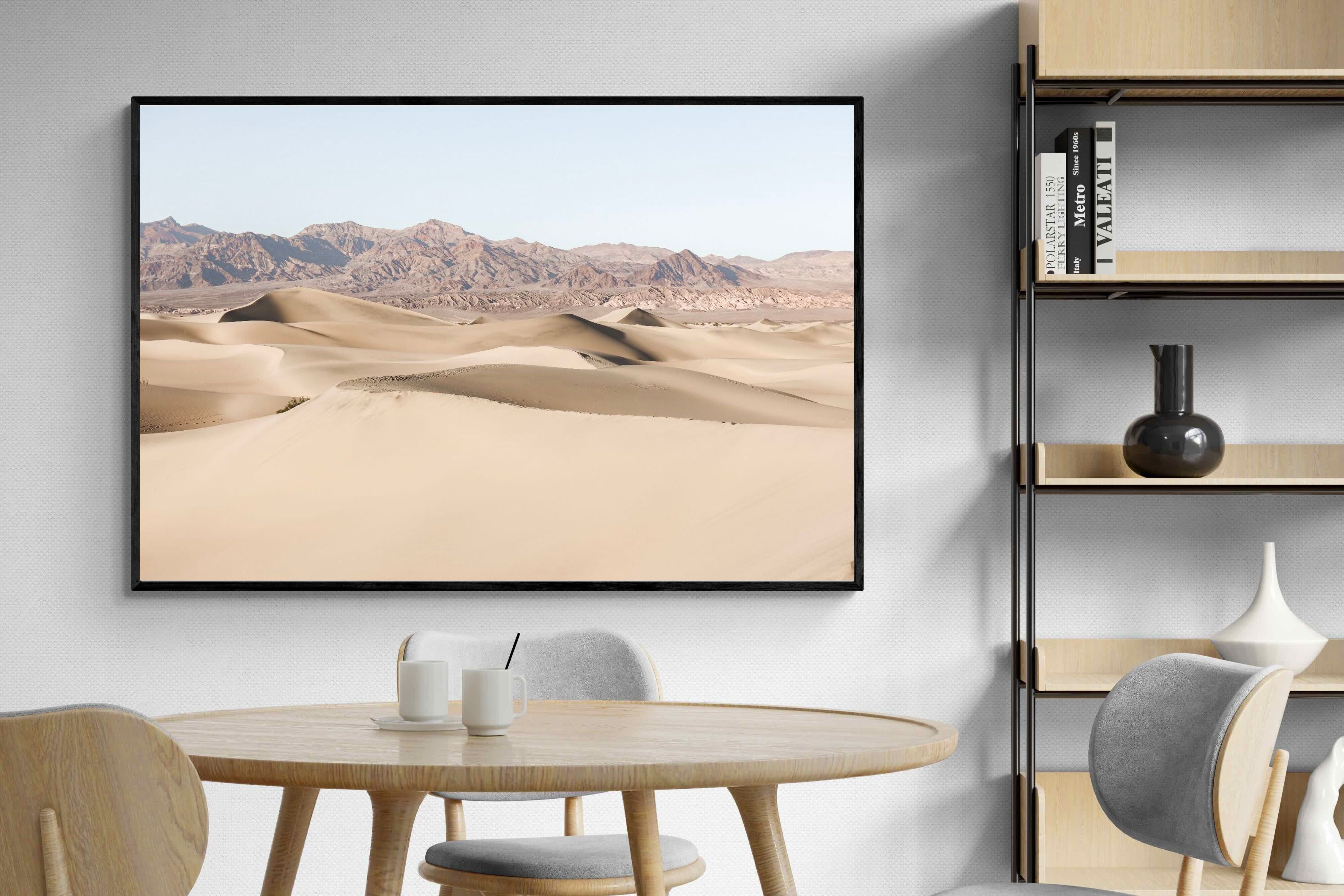 Rolling sand dunes sweep across the foreground, their sculptural curves set against distant mountain ridges beneath a clear sky. The restrained palette of beige, taupe and muted stone creates a calming, architectural aesthetic with strong negative space. Perfect for minimalist lounges, modern offices or neutral-toned interiors, this piece adds depth and quiet drama. Its simplicity allows it to anchor a room without overwhelming surrounding décor.