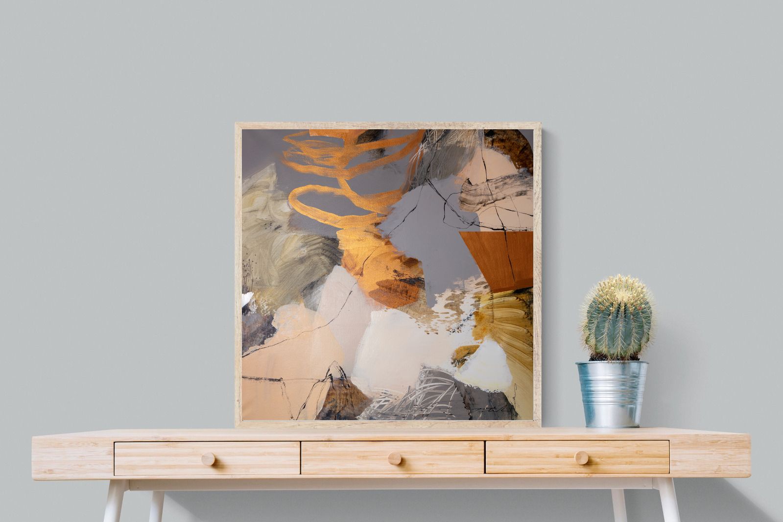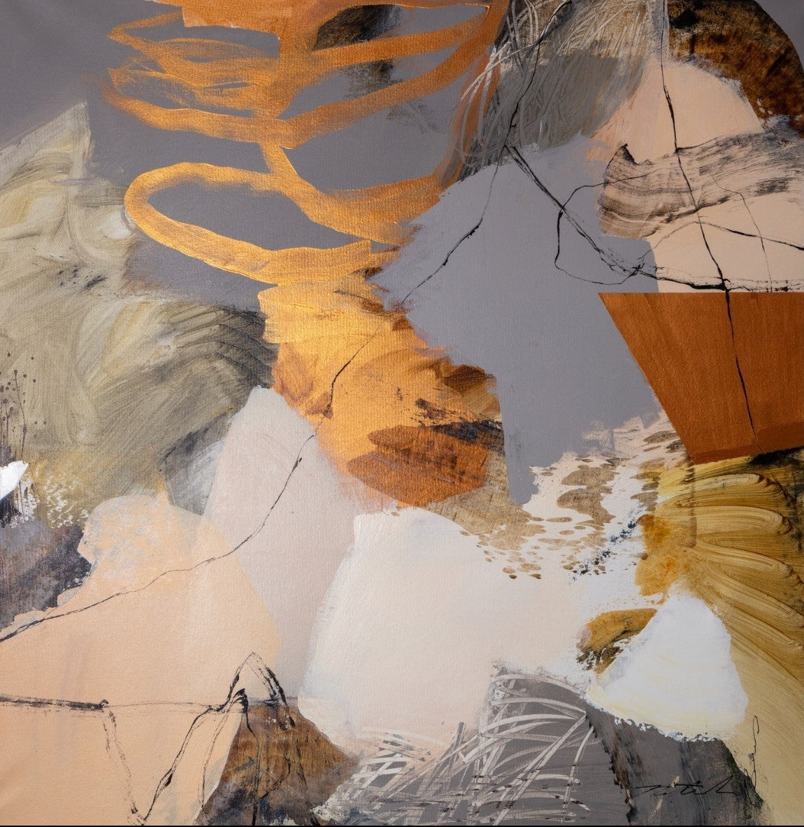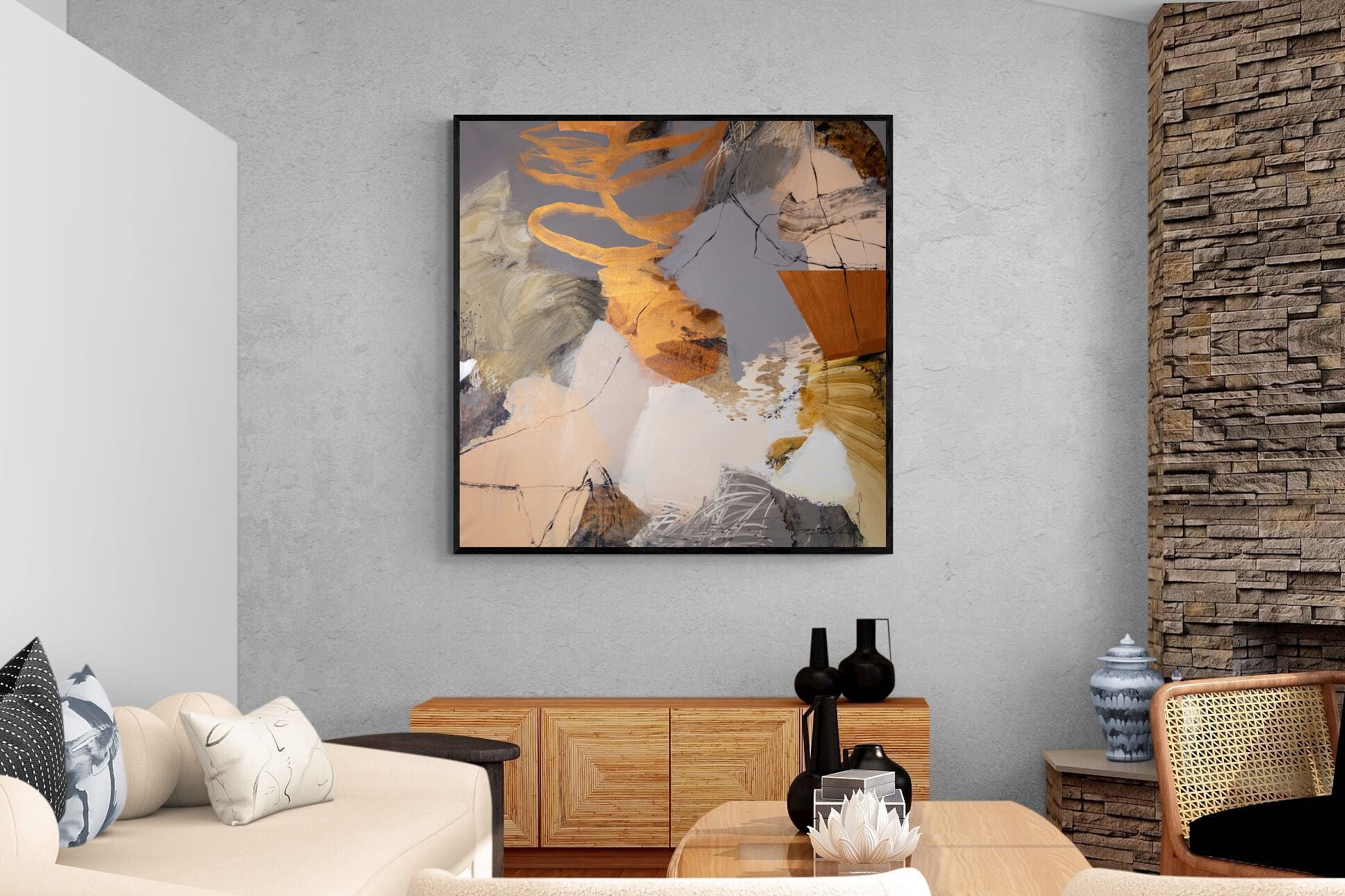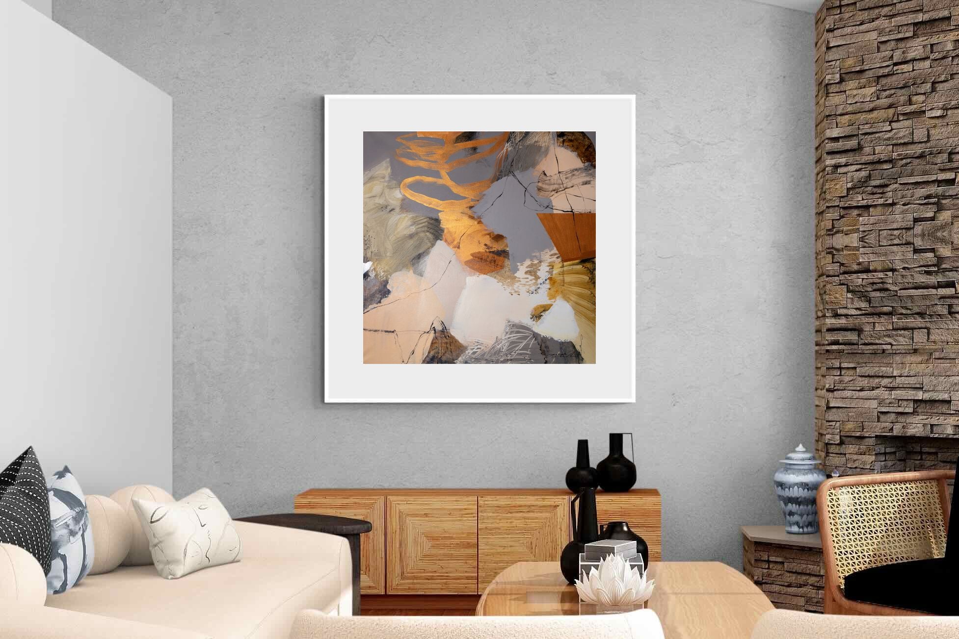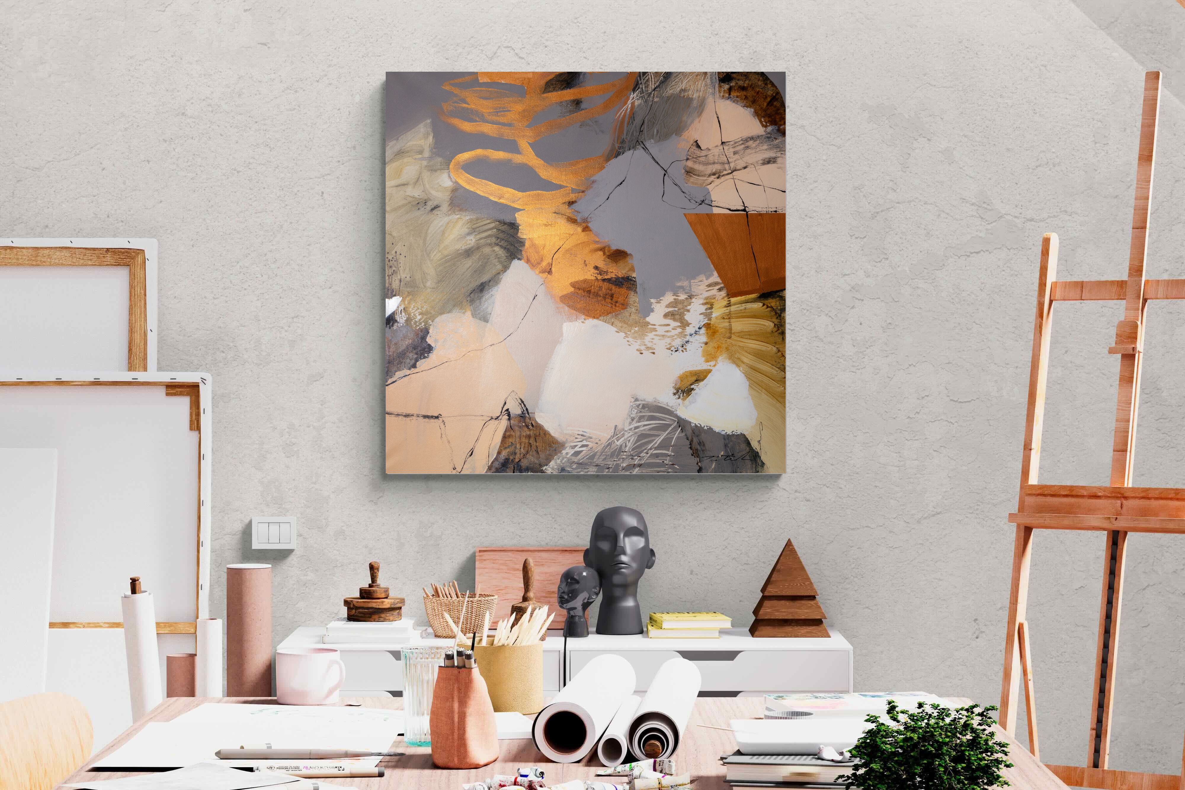 Gilded Drift combines warm gold accents with cool grey and cream tones, creating a refined abstract artwork with depth and subtle contrast. The layered brushwork adds quiet energy without overpowering a space. Ideal for modern, luxury or transitional interiors, this piece works beautifully above sofas, sideboards or in stylish home offices where understated elegance is key.