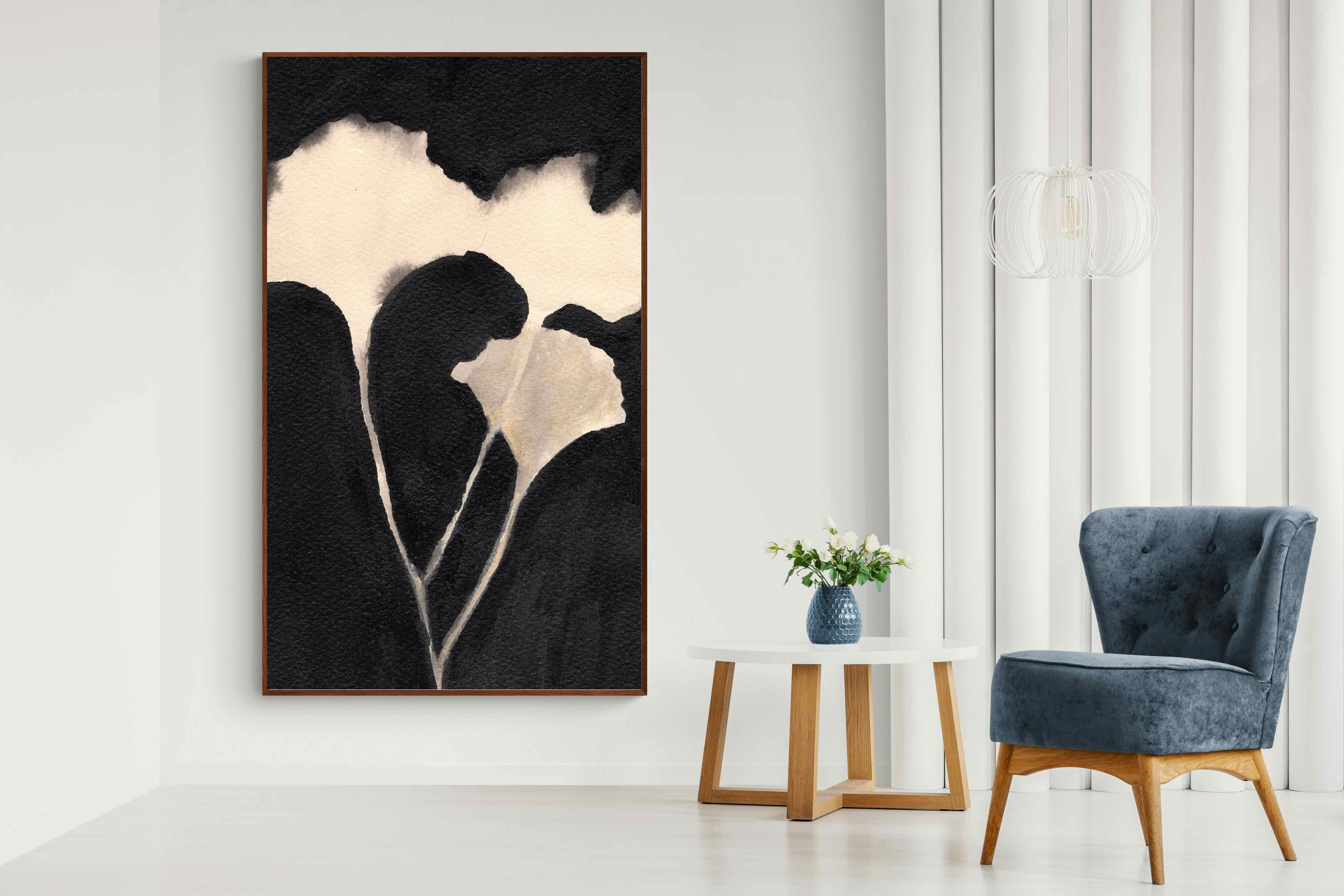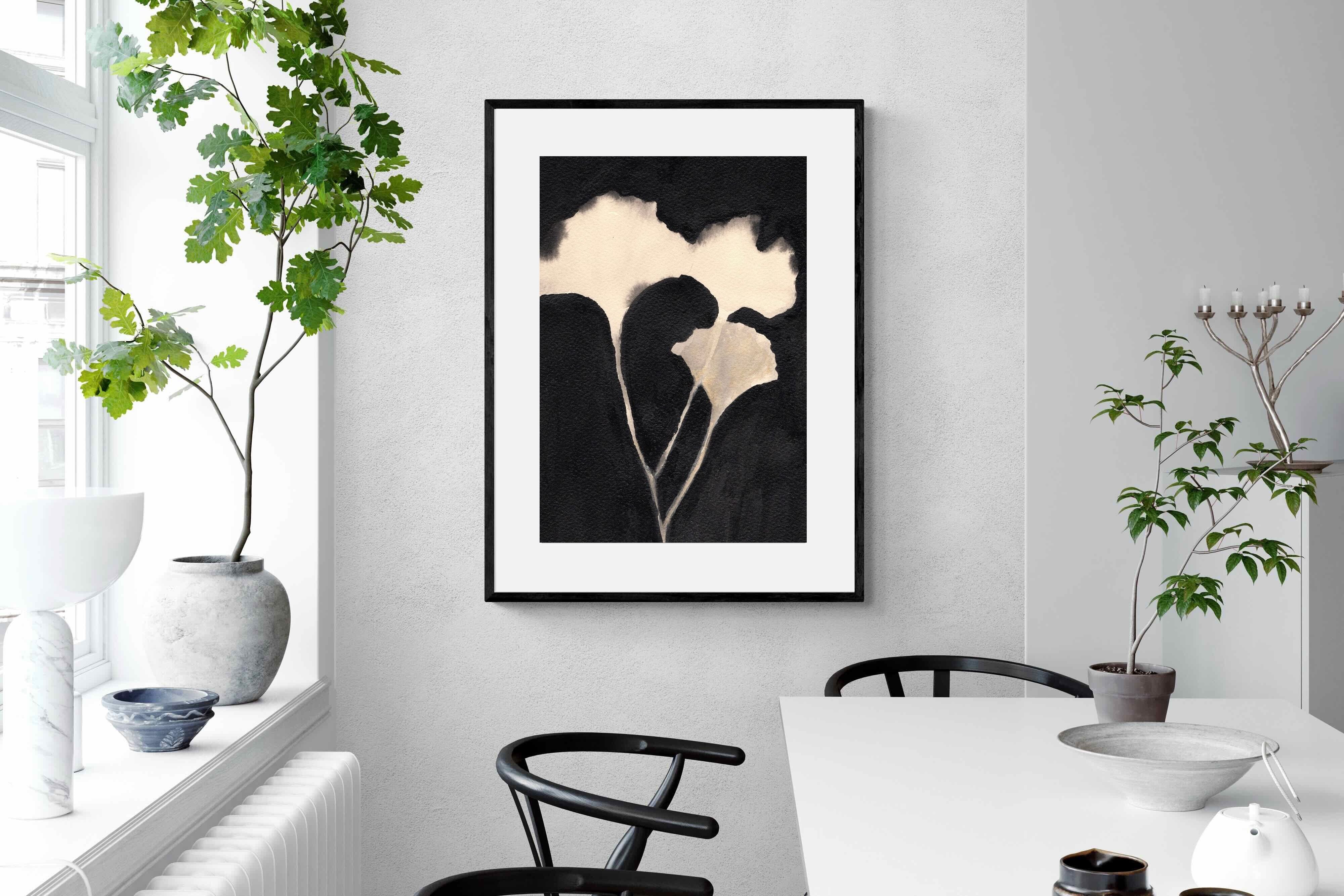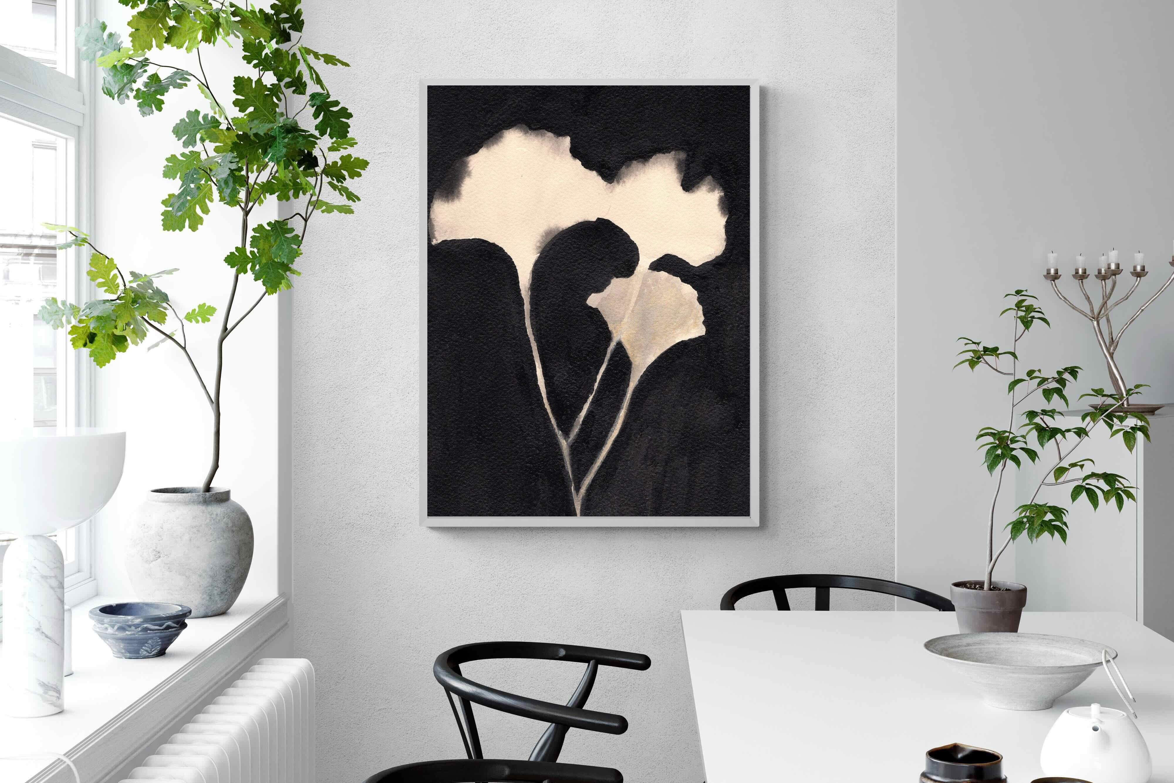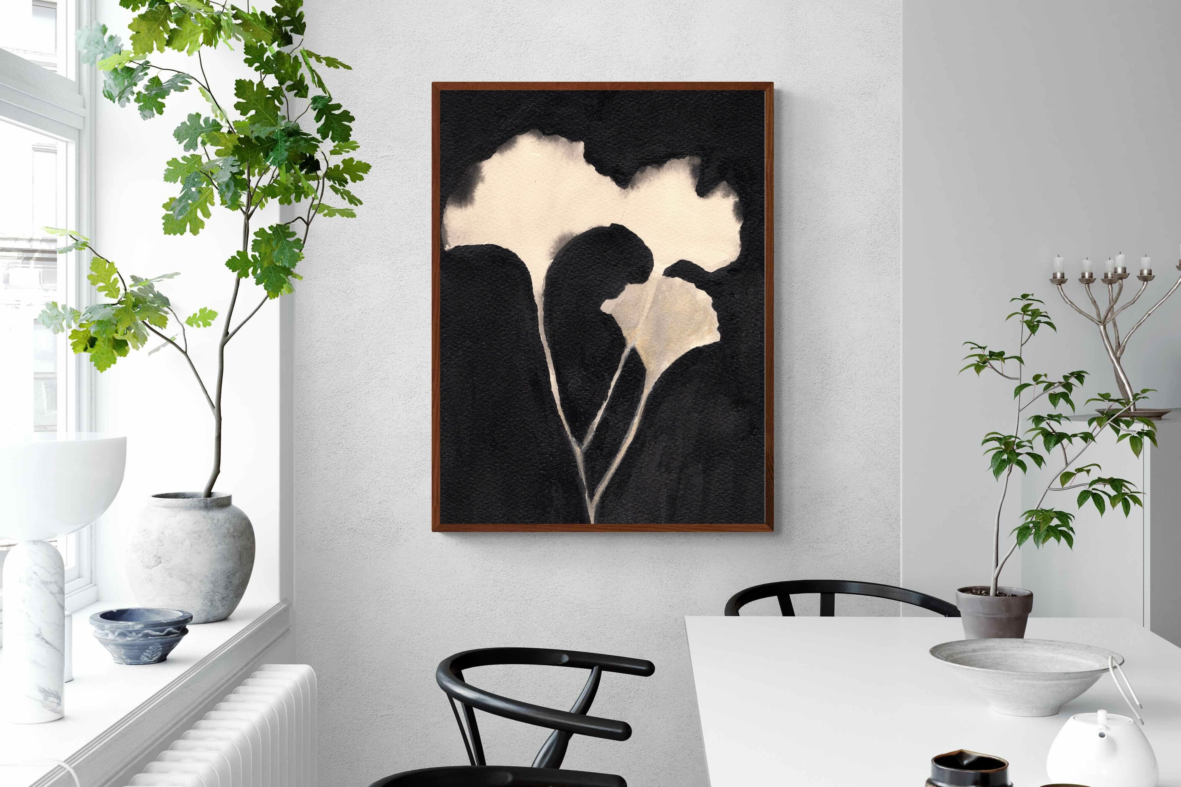 Striking in its simplicity, this monochrome botanical artwork uses bold ink contrasts to form a soft yet dramatic floral silhouette. The interplay between negative space and deep black tones creates a calming, refined composition suited to minimalist interiors. Ideal for bedrooms, hallways or modern living spaces, it delivers quiet elegance while maintaining a strong visual presence through its organic form and tonal depth.