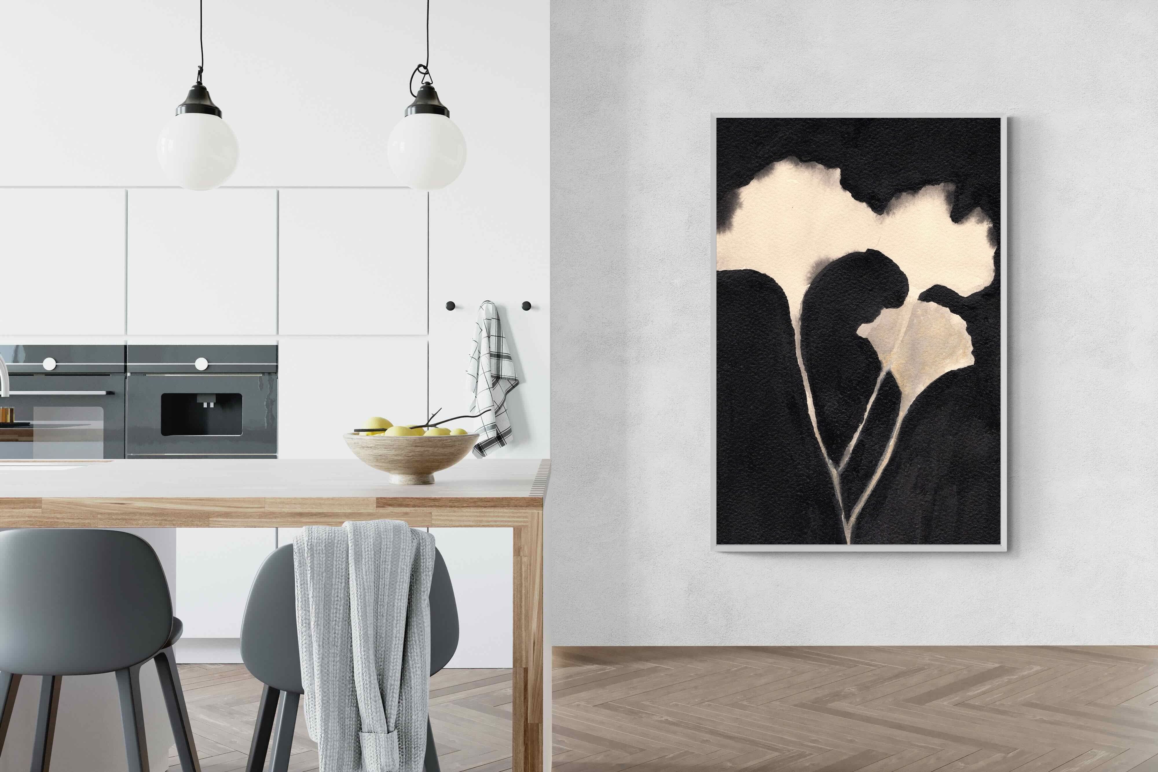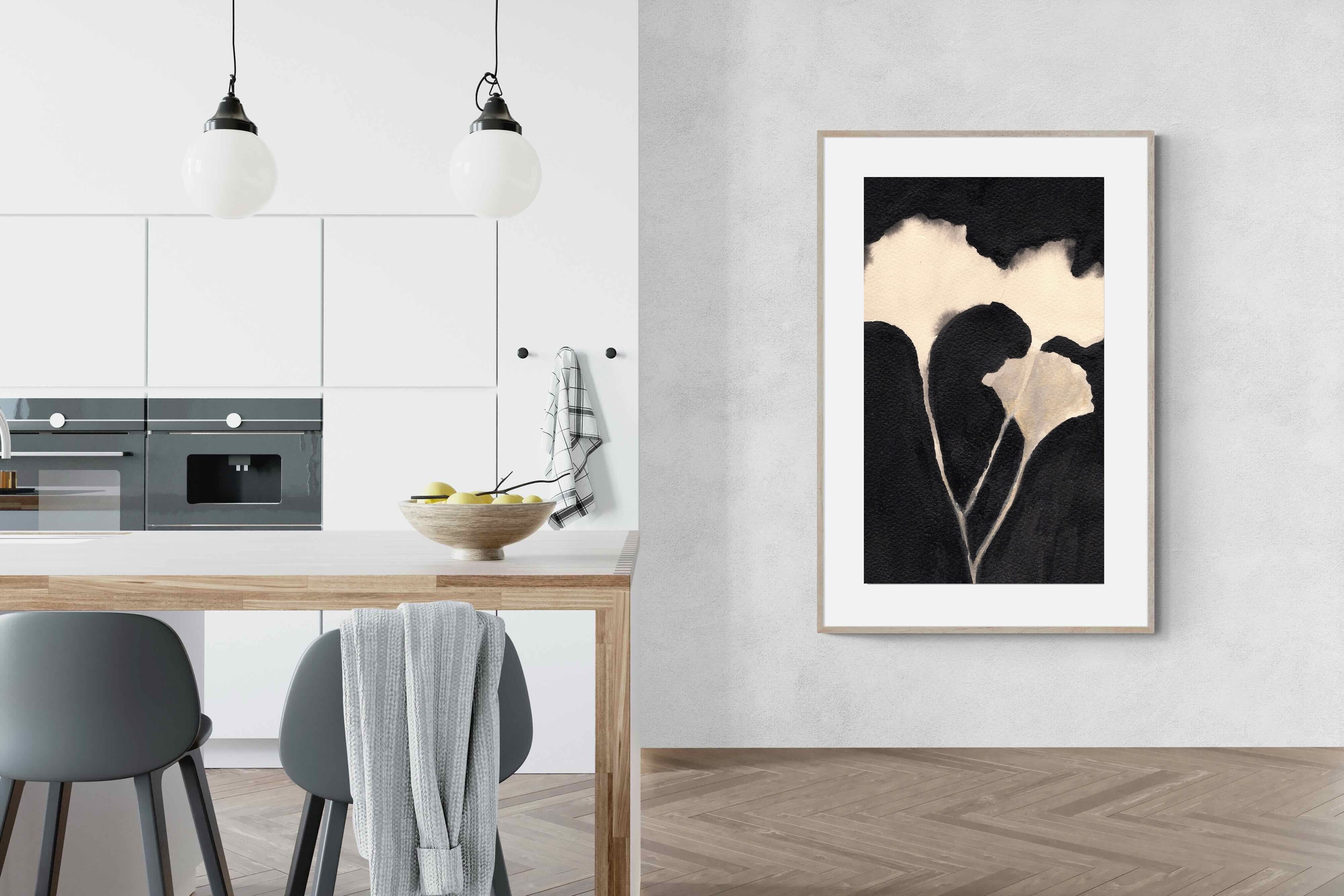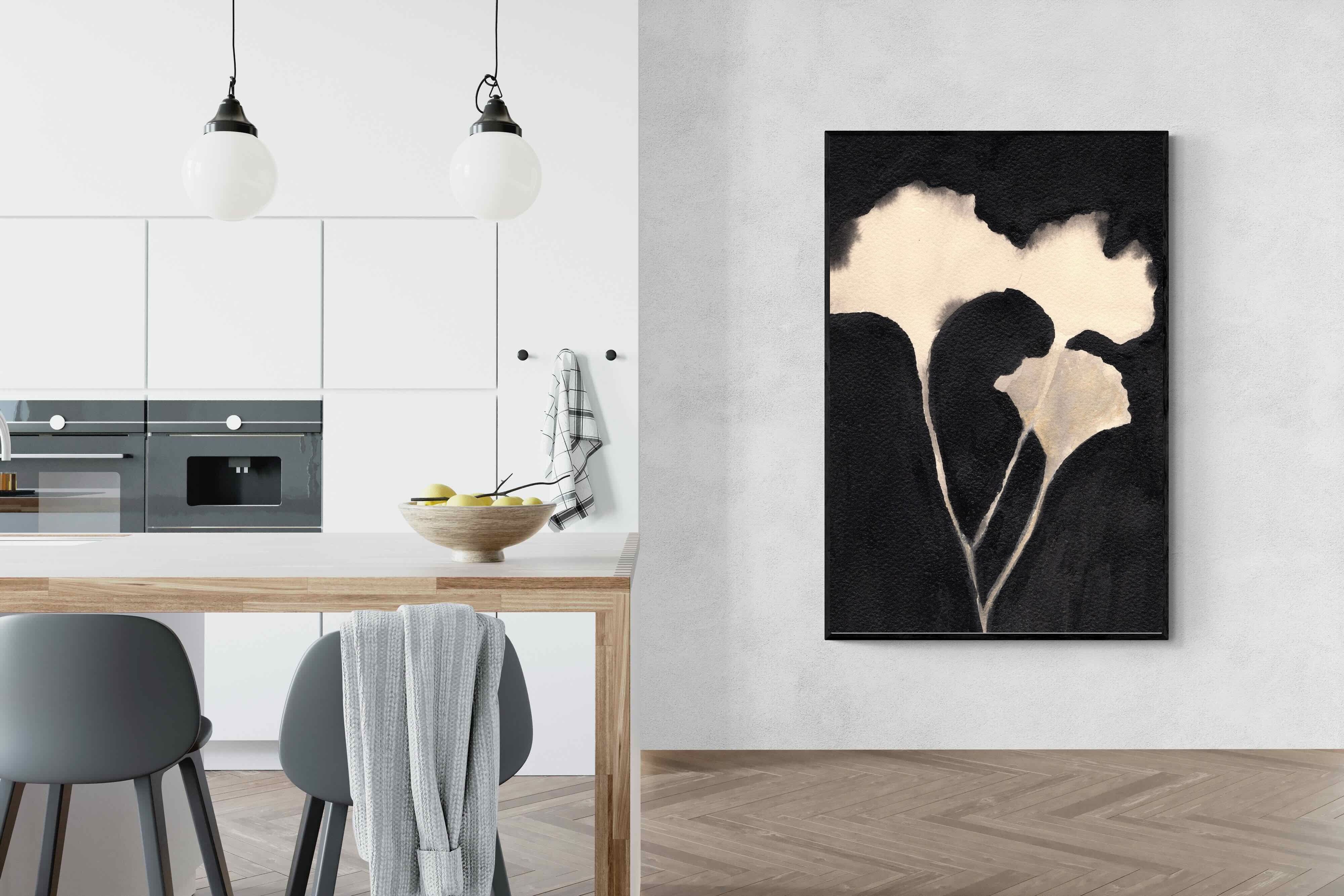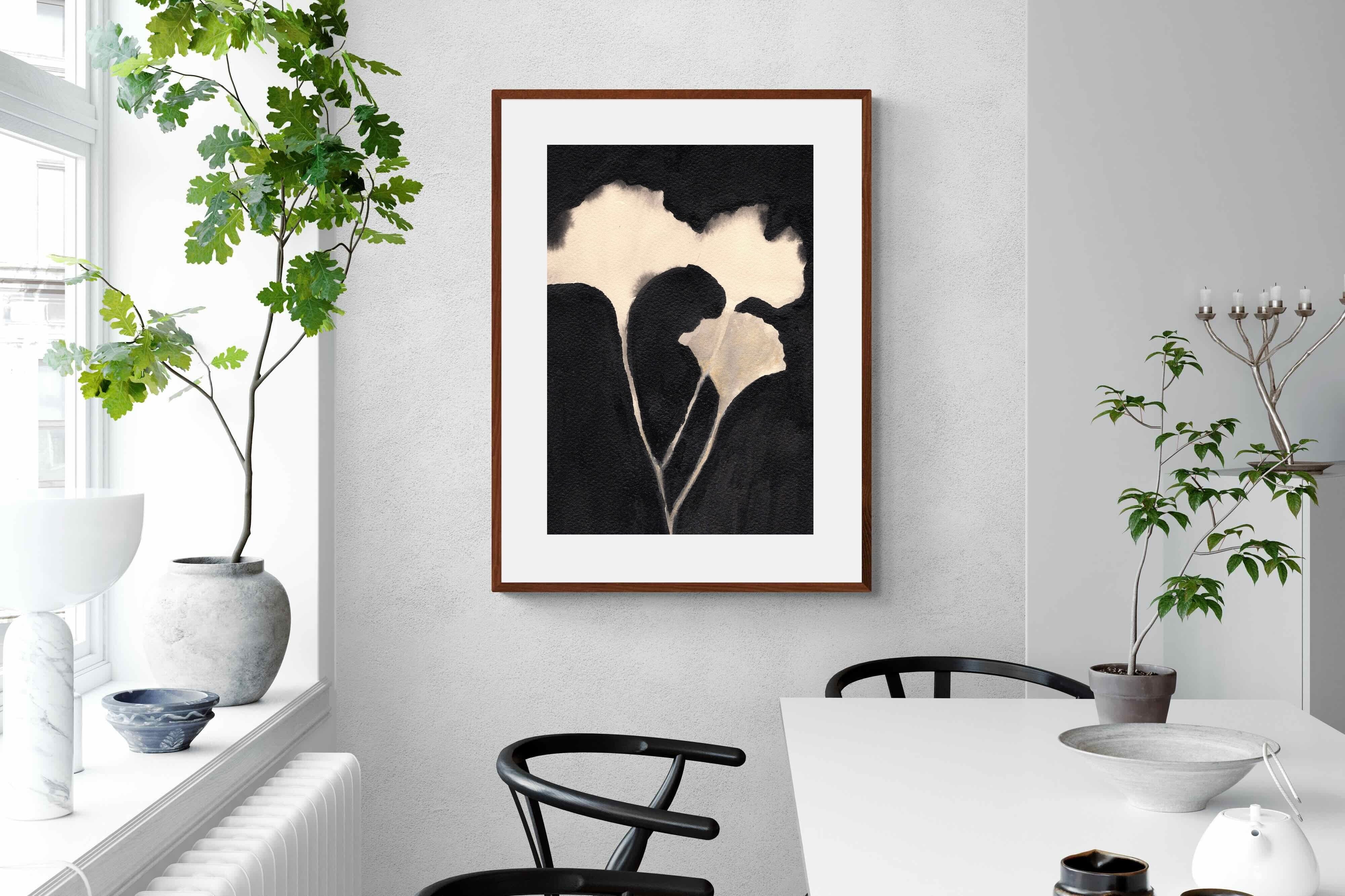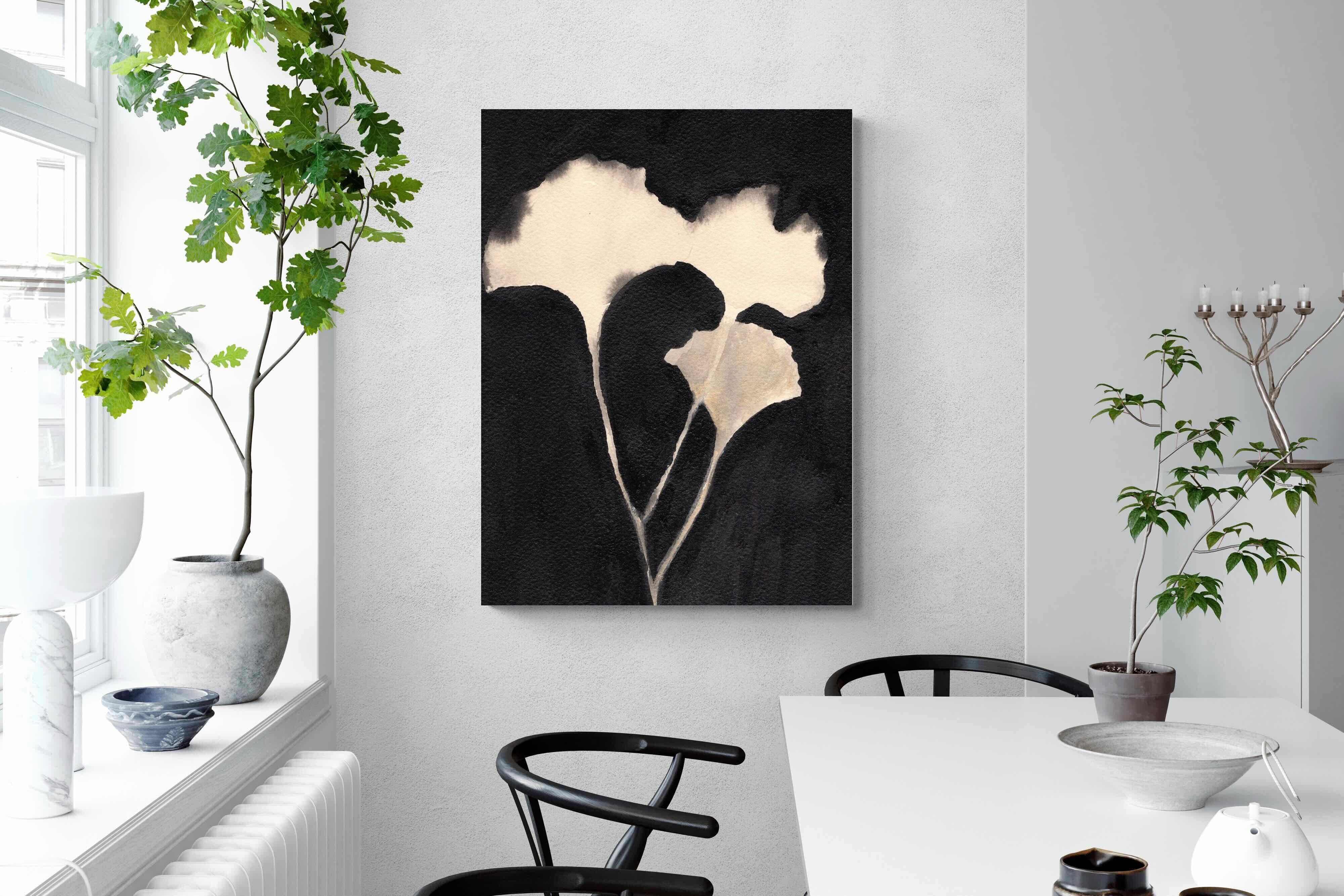 Striking in its simplicity, this monochrome botanical artwork uses bold ink contrasts to form a soft yet dramatic floral silhouette. The interplay between negative space and deep black tones creates a calming, refined composition suited to minimalist interiors. Ideal for bedrooms, hallways or modern living spaces, it delivers quiet elegance while maintaining a strong visual presence through its organic form and tonal depth.