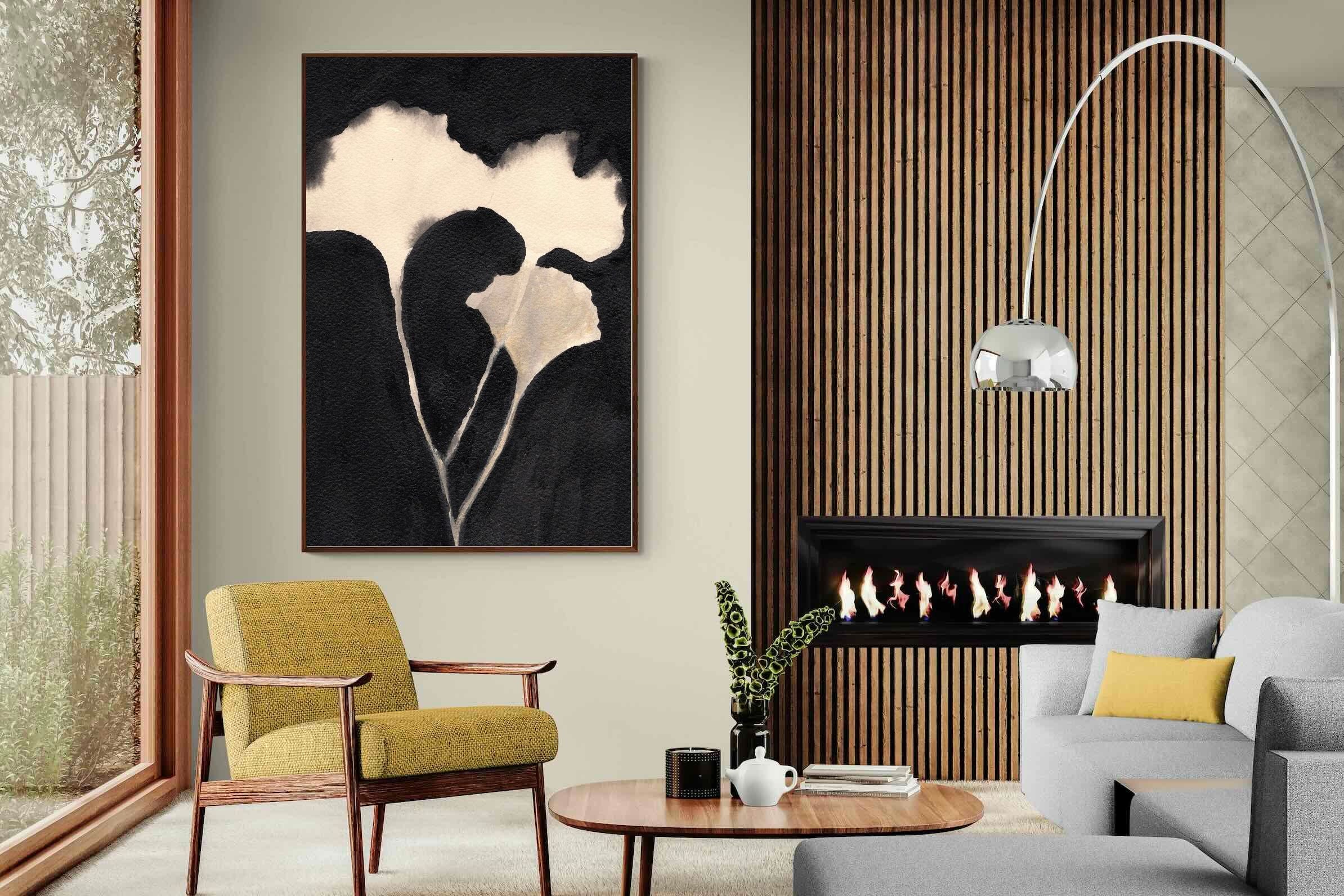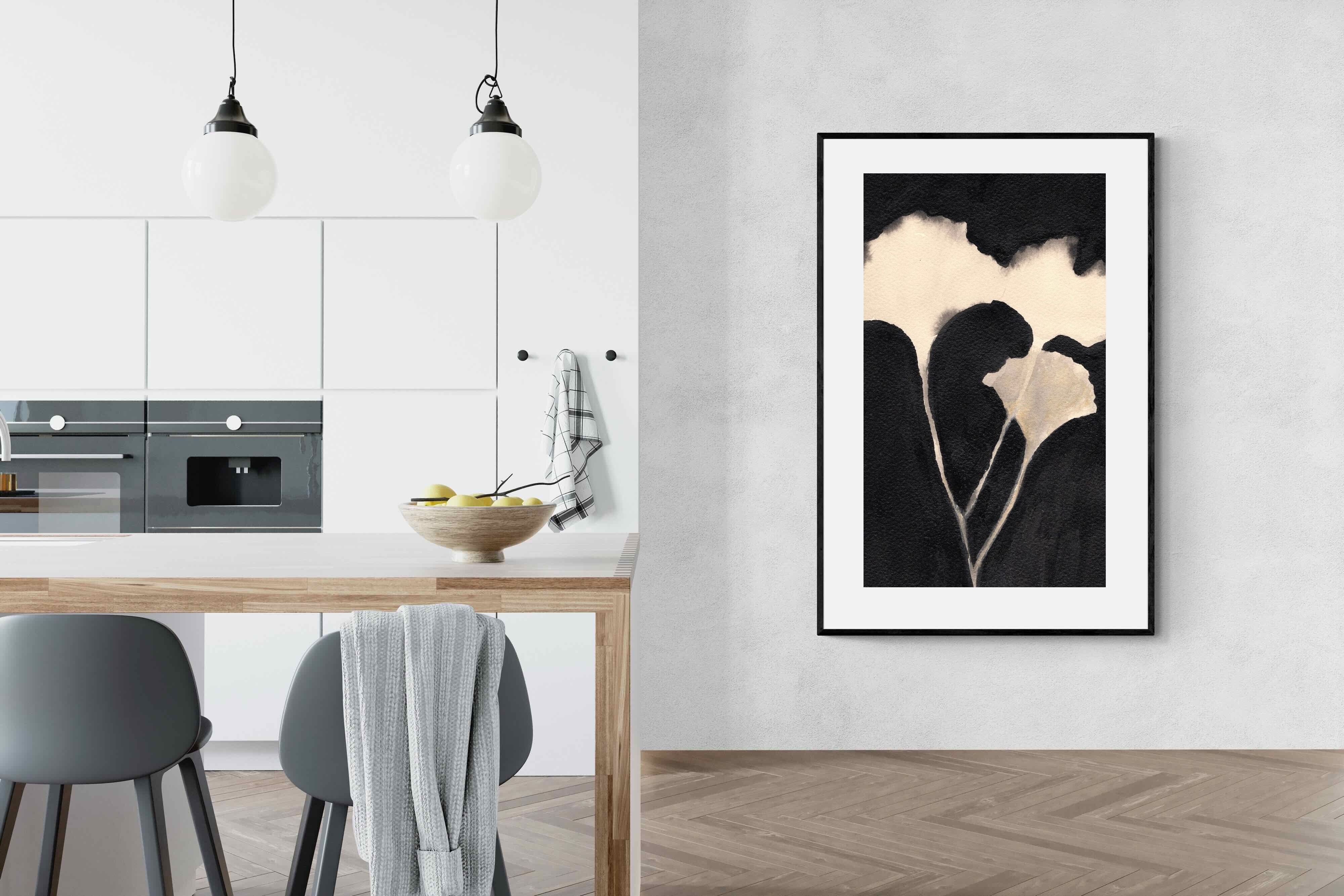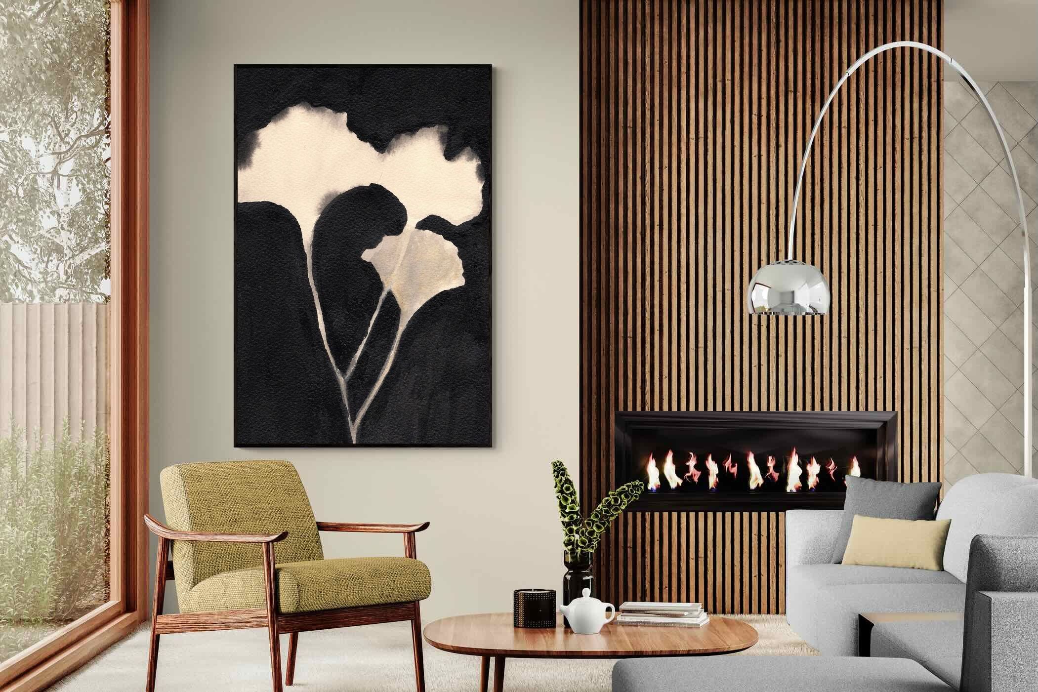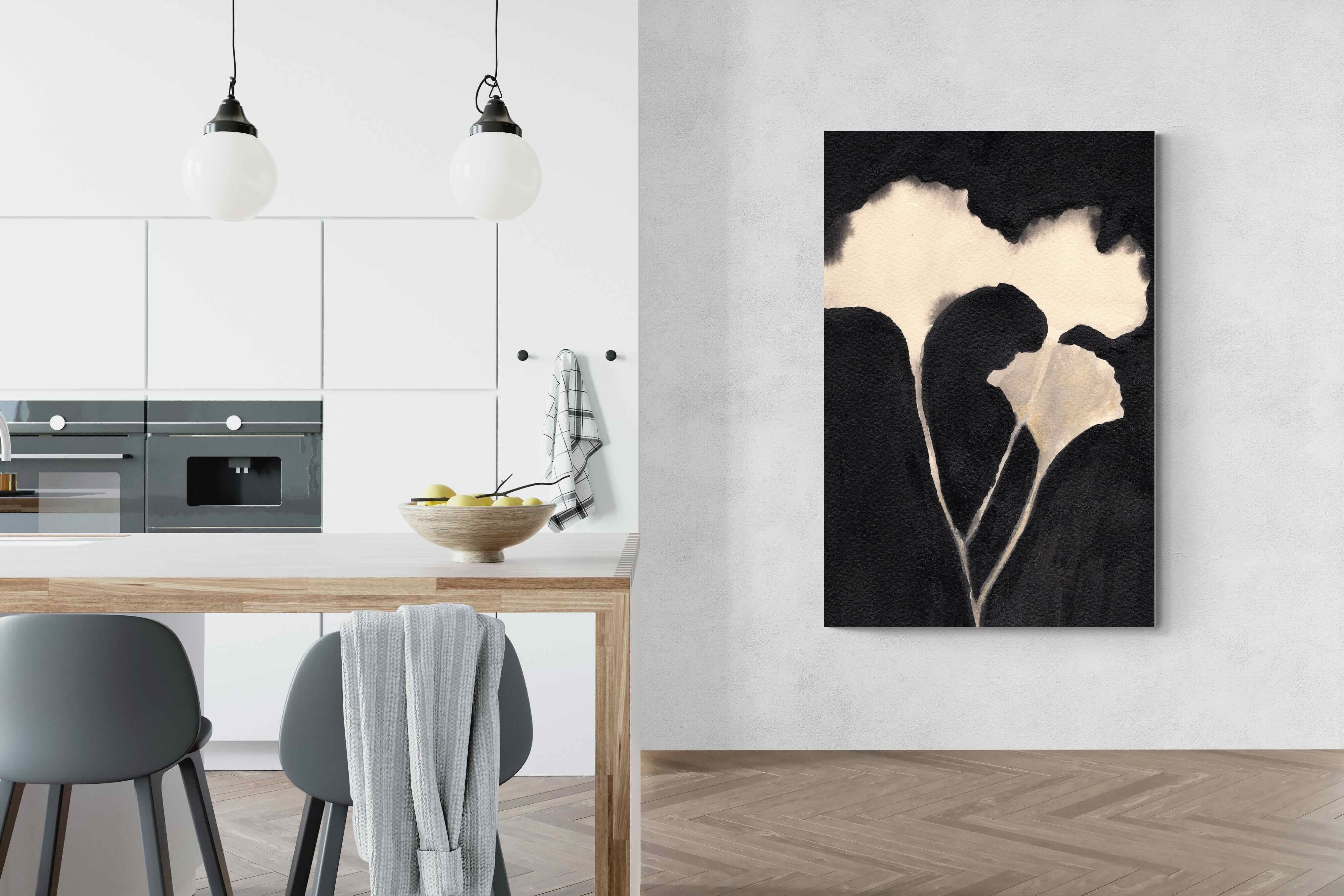 Striking in its simplicity, this monochrome botanical artwork uses bold ink contrasts to form a soft yet dramatic floral silhouette. The interplay between negative space and deep black tones creates a calming, refined composition suited to minimalist interiors. Ideal for bedrooms, hallways or modern living spaces, it delivers quiet elegance while maintaining a strong visual presence through its organic form and tonal depth.