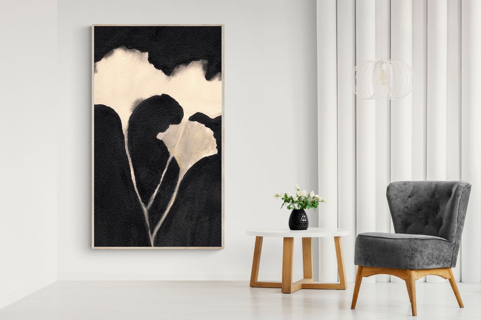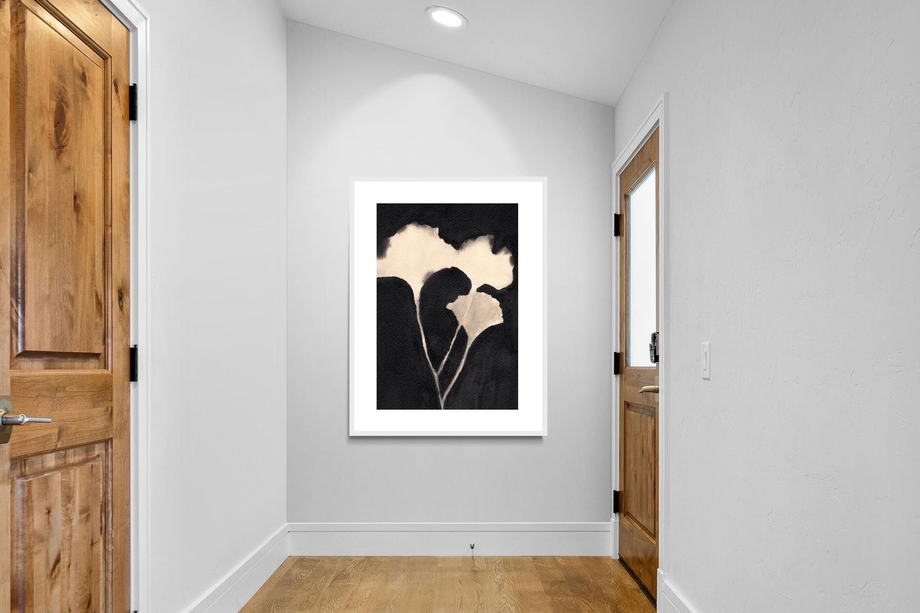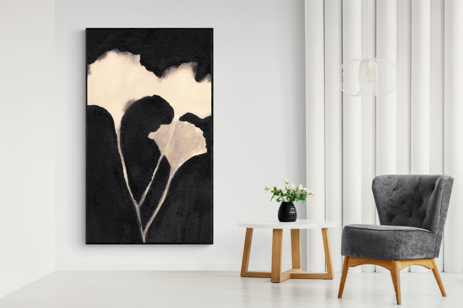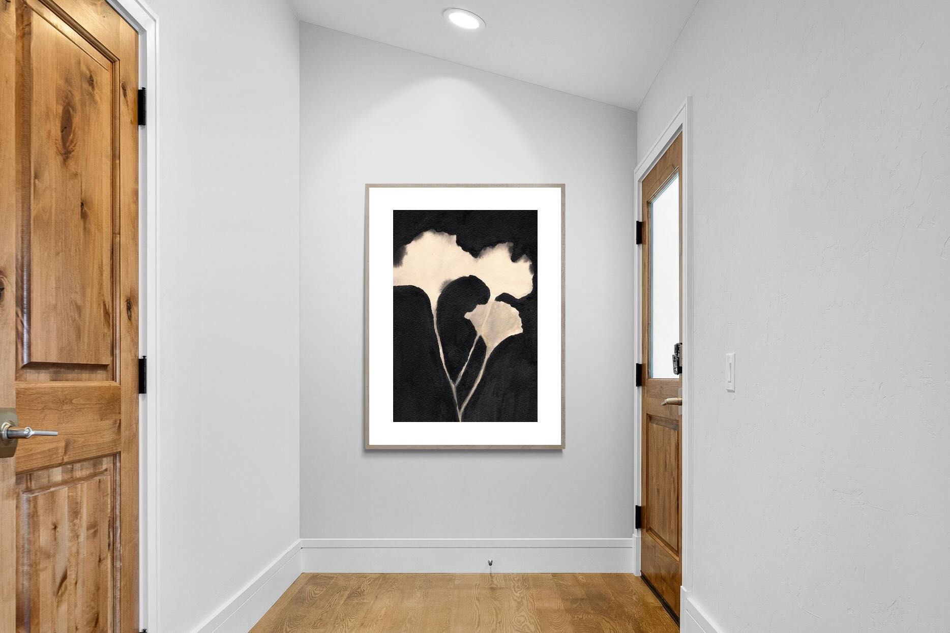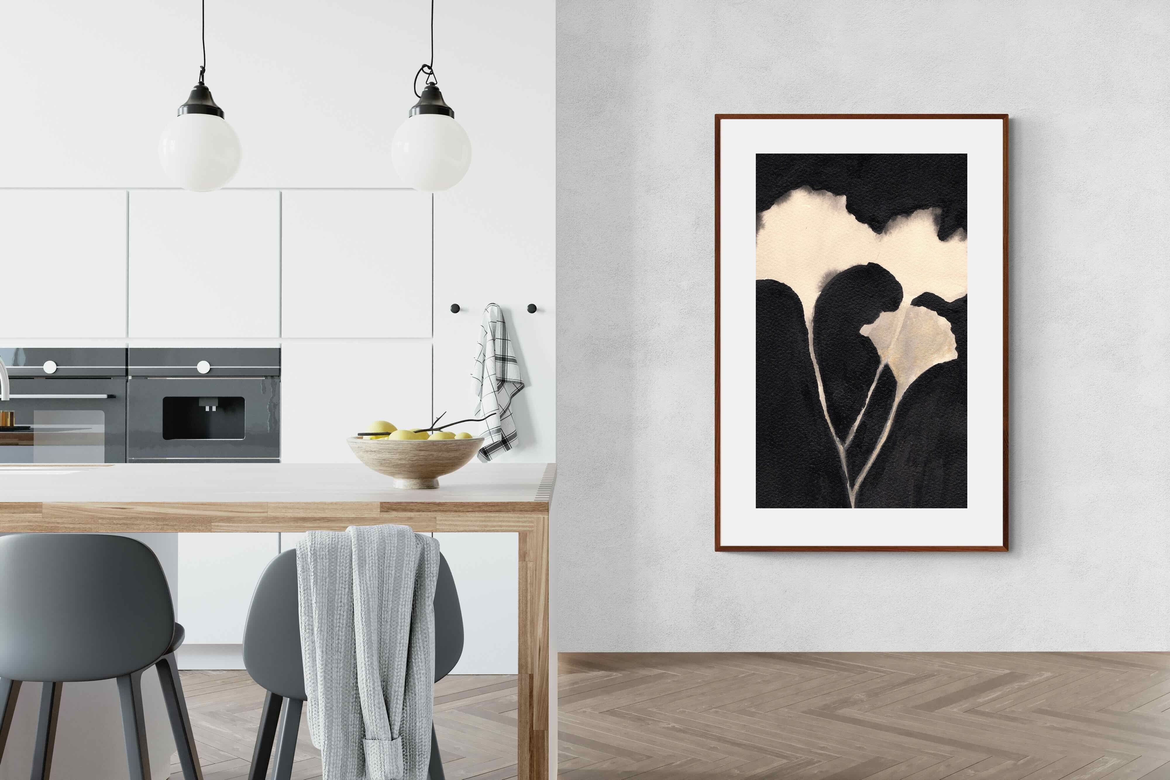 Striking in its simplicity, this monochrome botanical artwork uses bold ink contrasts to form a soft yet dramatic floral silhouette. The interplay between negative space and deep black tones creates a calming, refined composition suited to minimalist interiors. Ideal for bedrooms, hallways or modern living spaces, it delivers quiet elegance while maintaining a strong visual presence through its organic form and tonal depth.