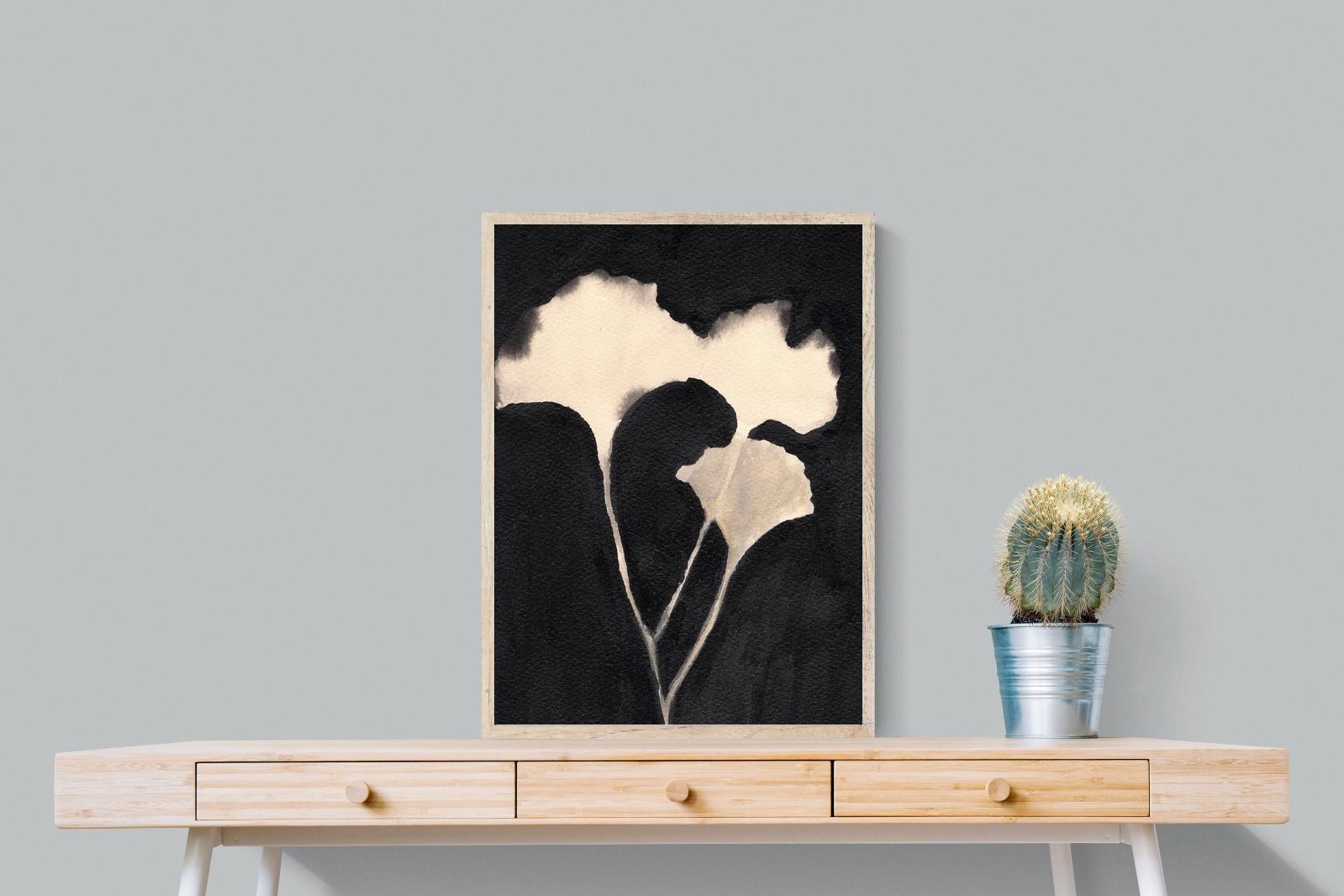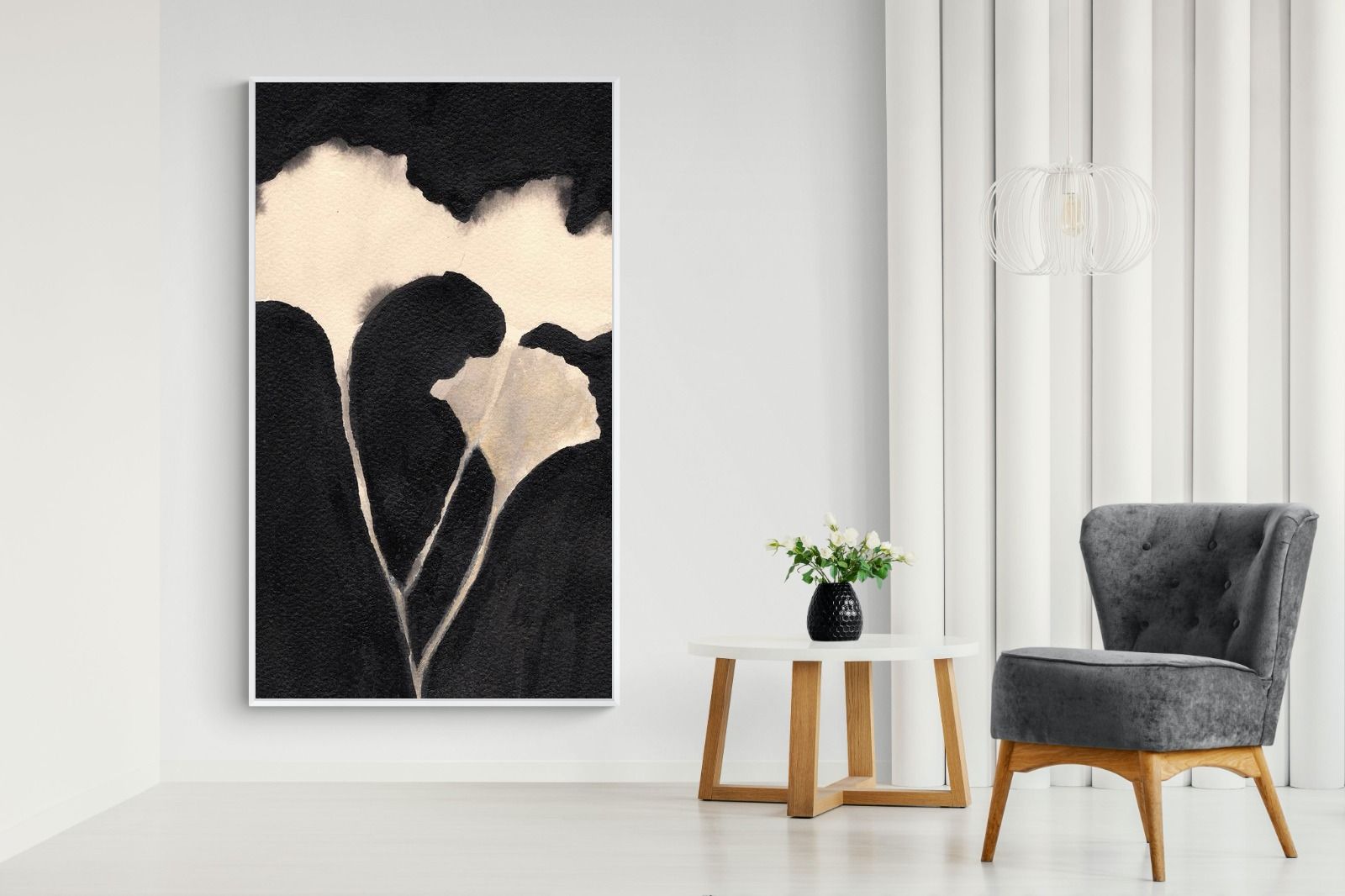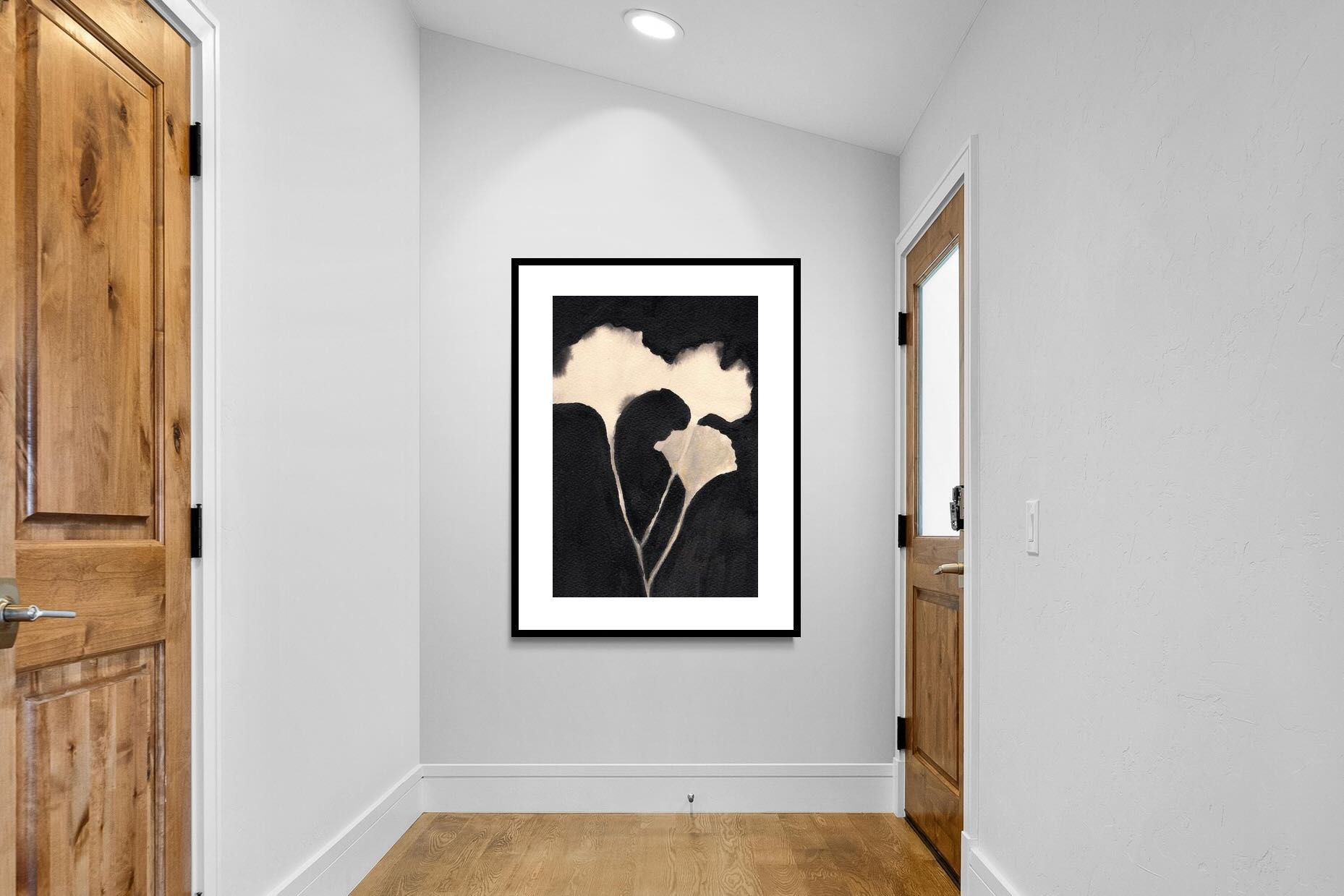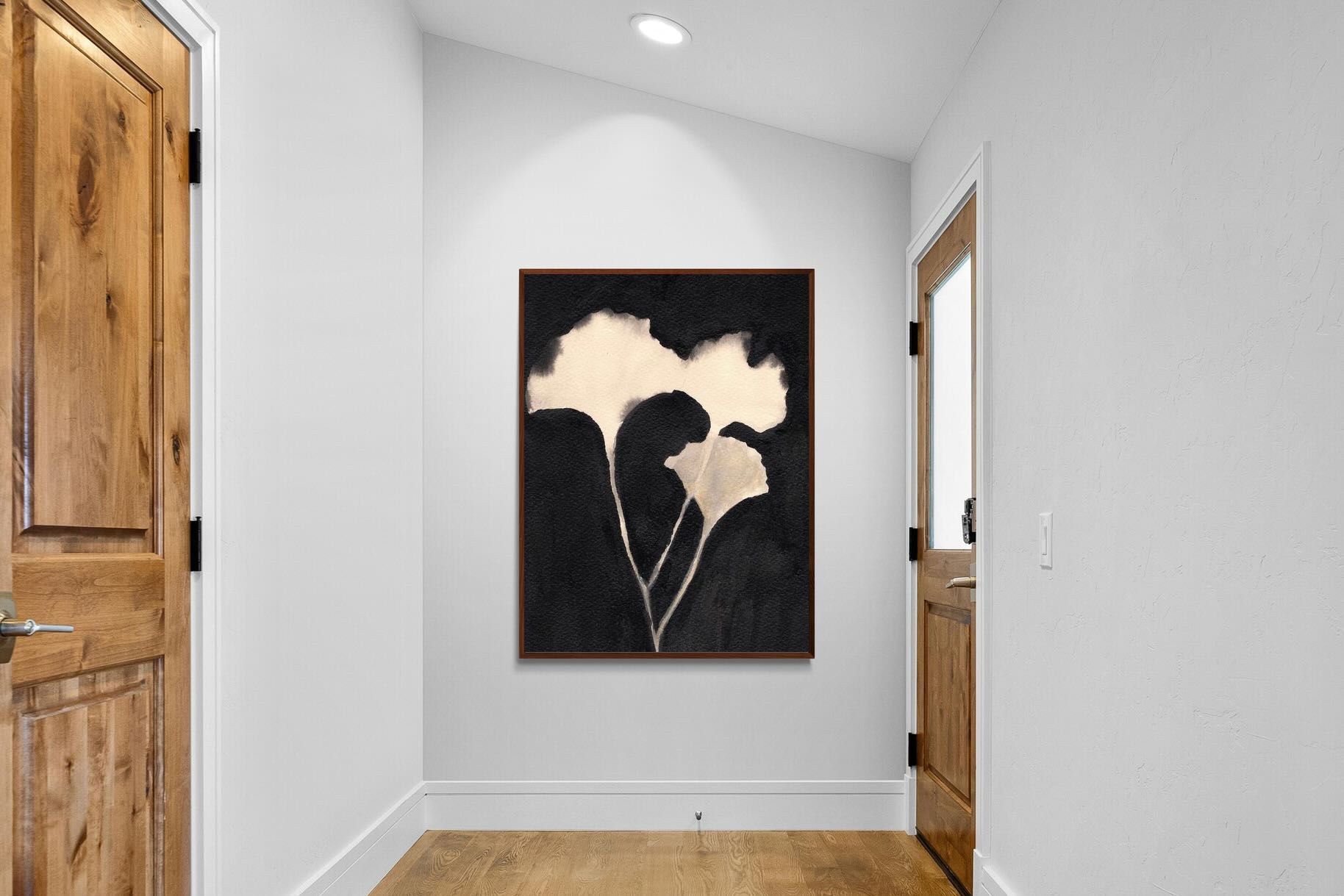 Striking in its simplicity, this monochrome botanical artwork uses bold ink contrasts to form a soft yet dramatic floral silhouette. The interplay between negative space and deep black tones creates a calming, refined composition suited to minimalist interiors. Ideal for bedrooms, hallways or modern living spaces, it delivers quiet elegance while maintaining a strong visual presence through its organic form and tonal depth.
