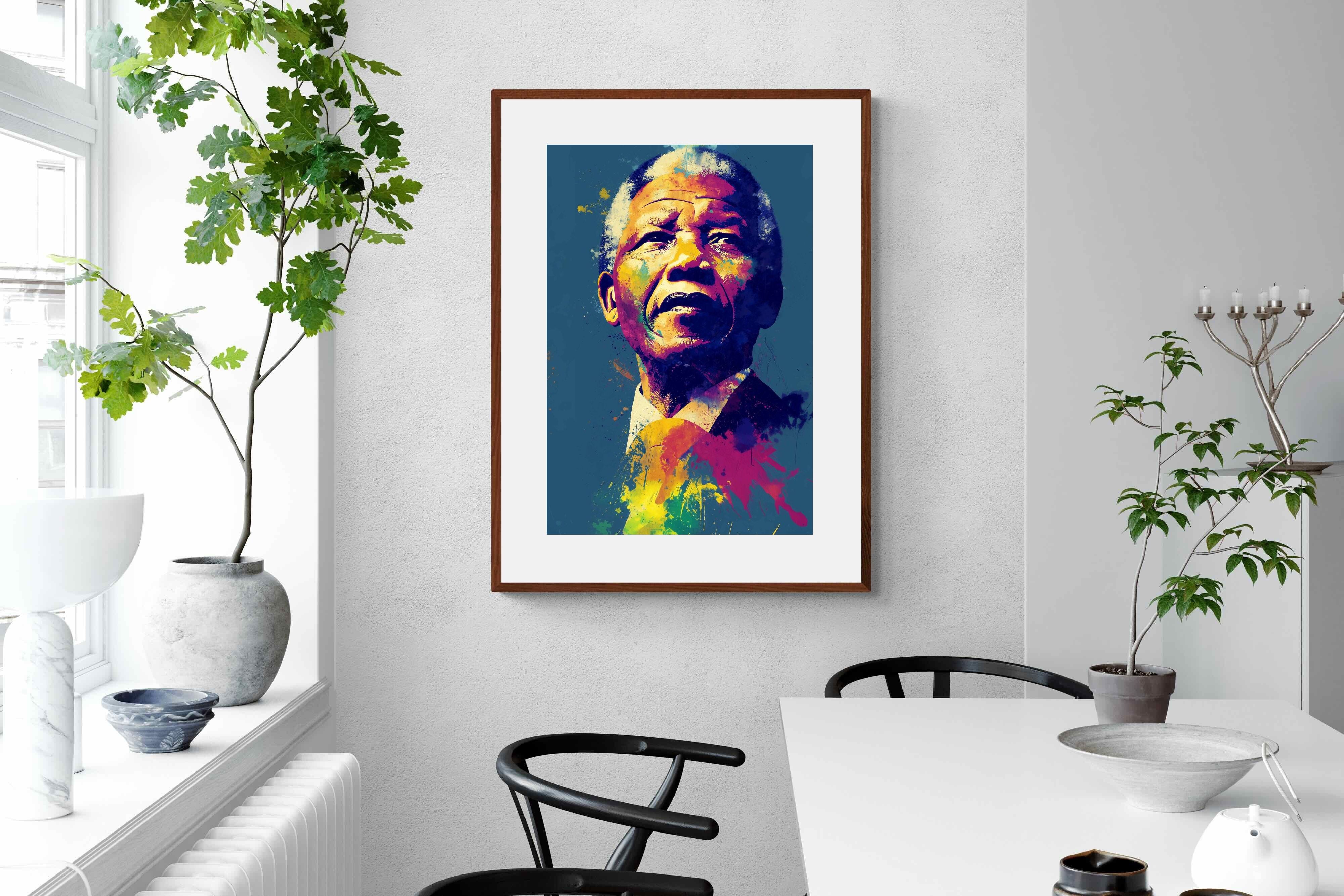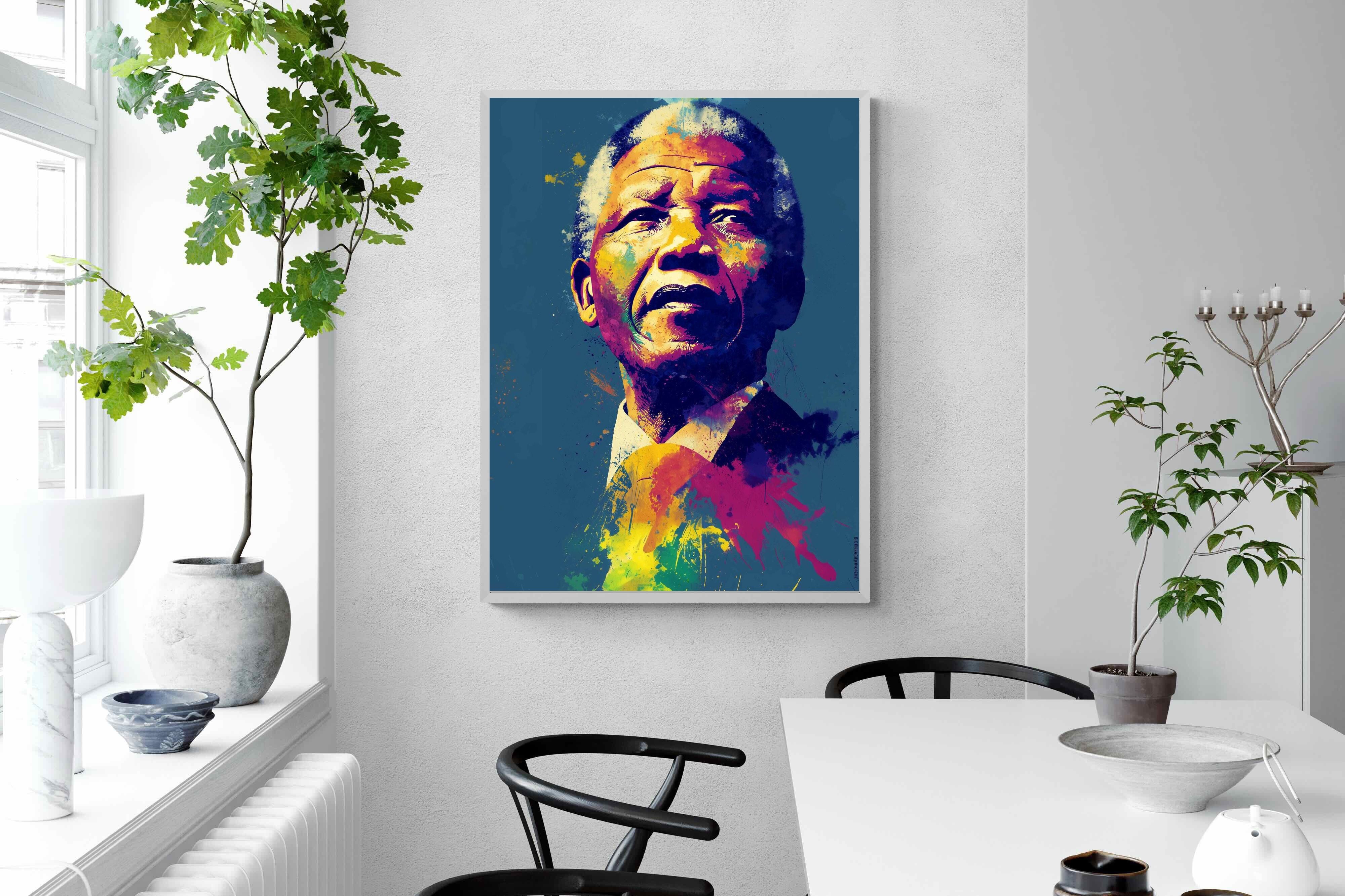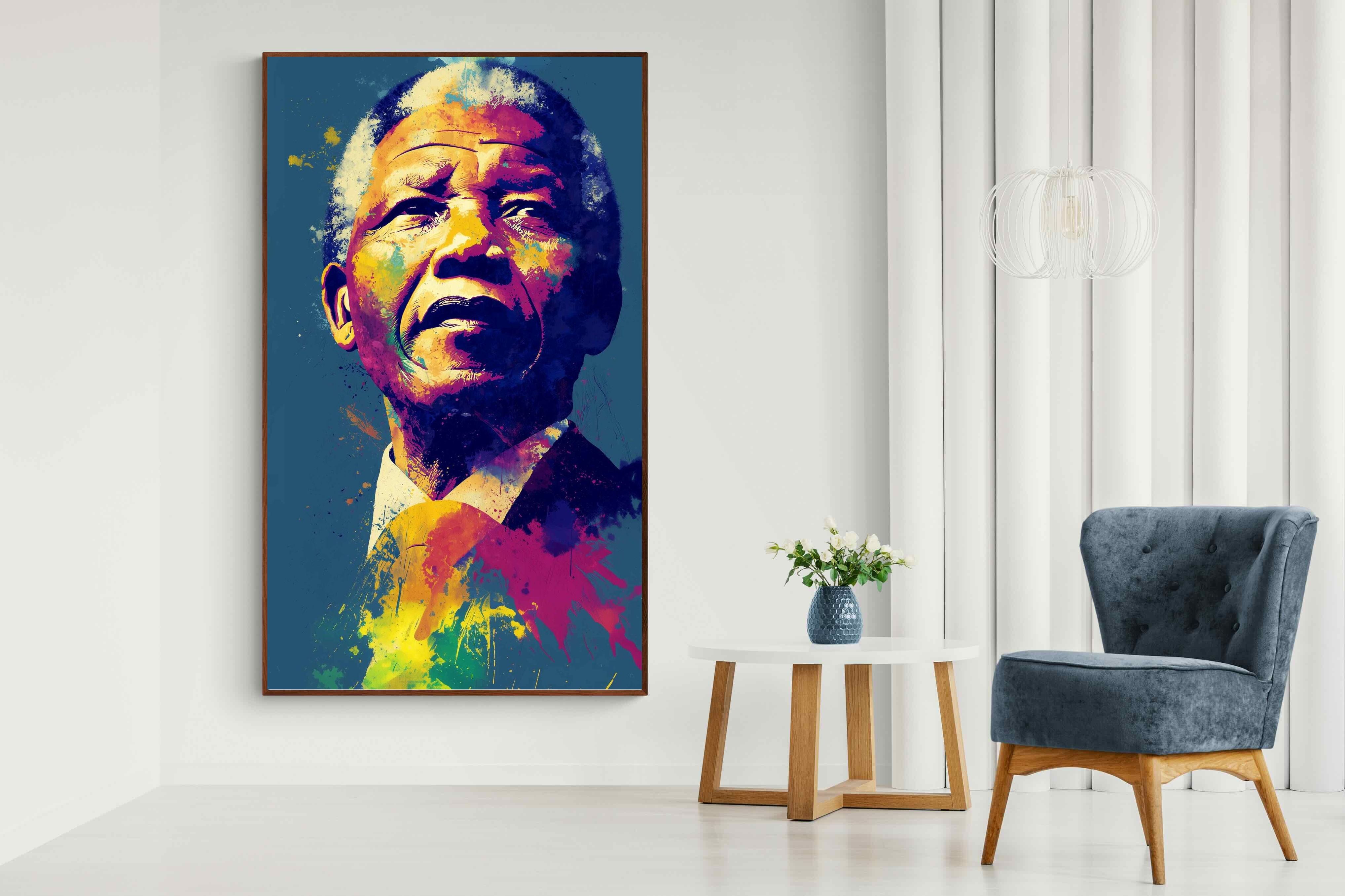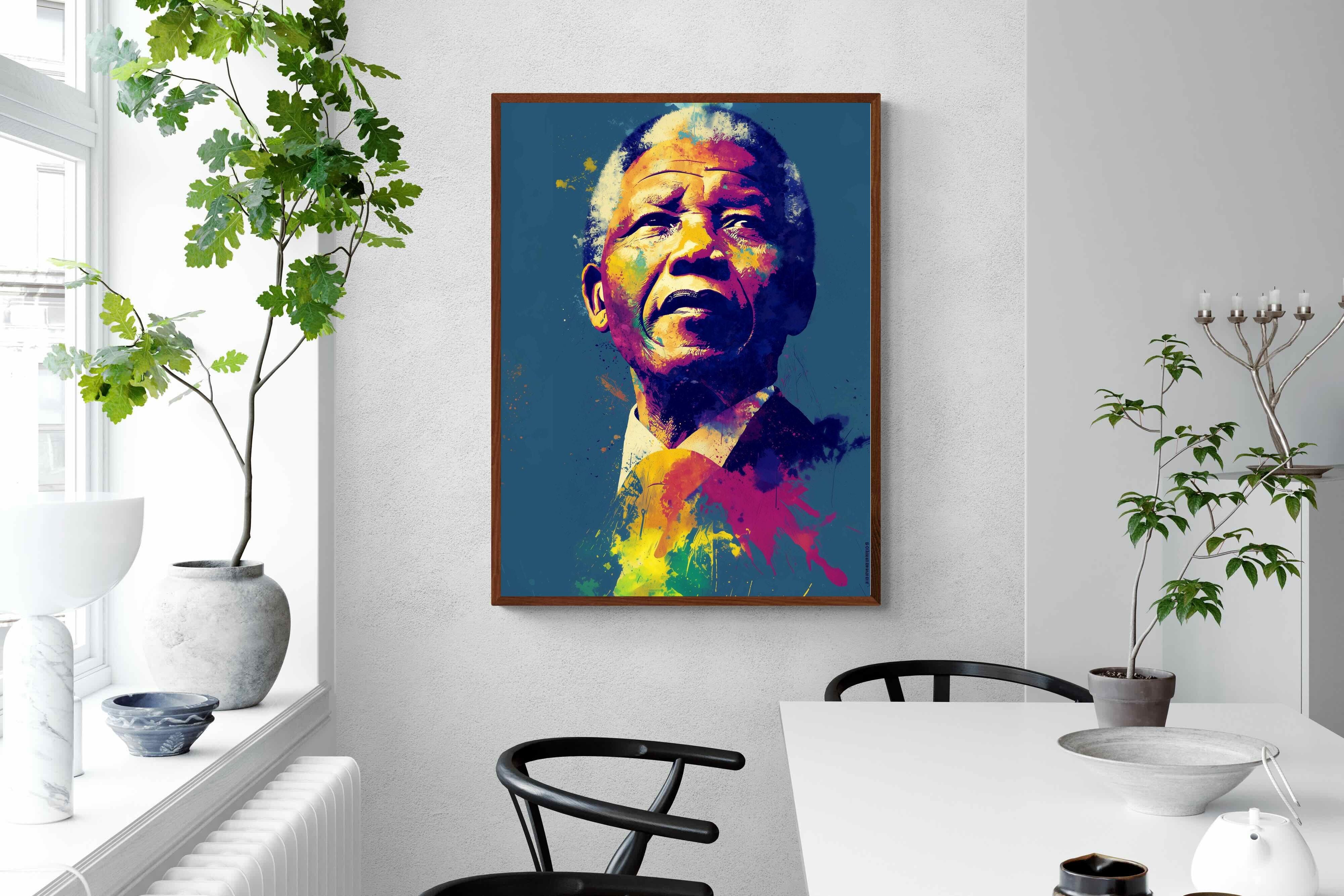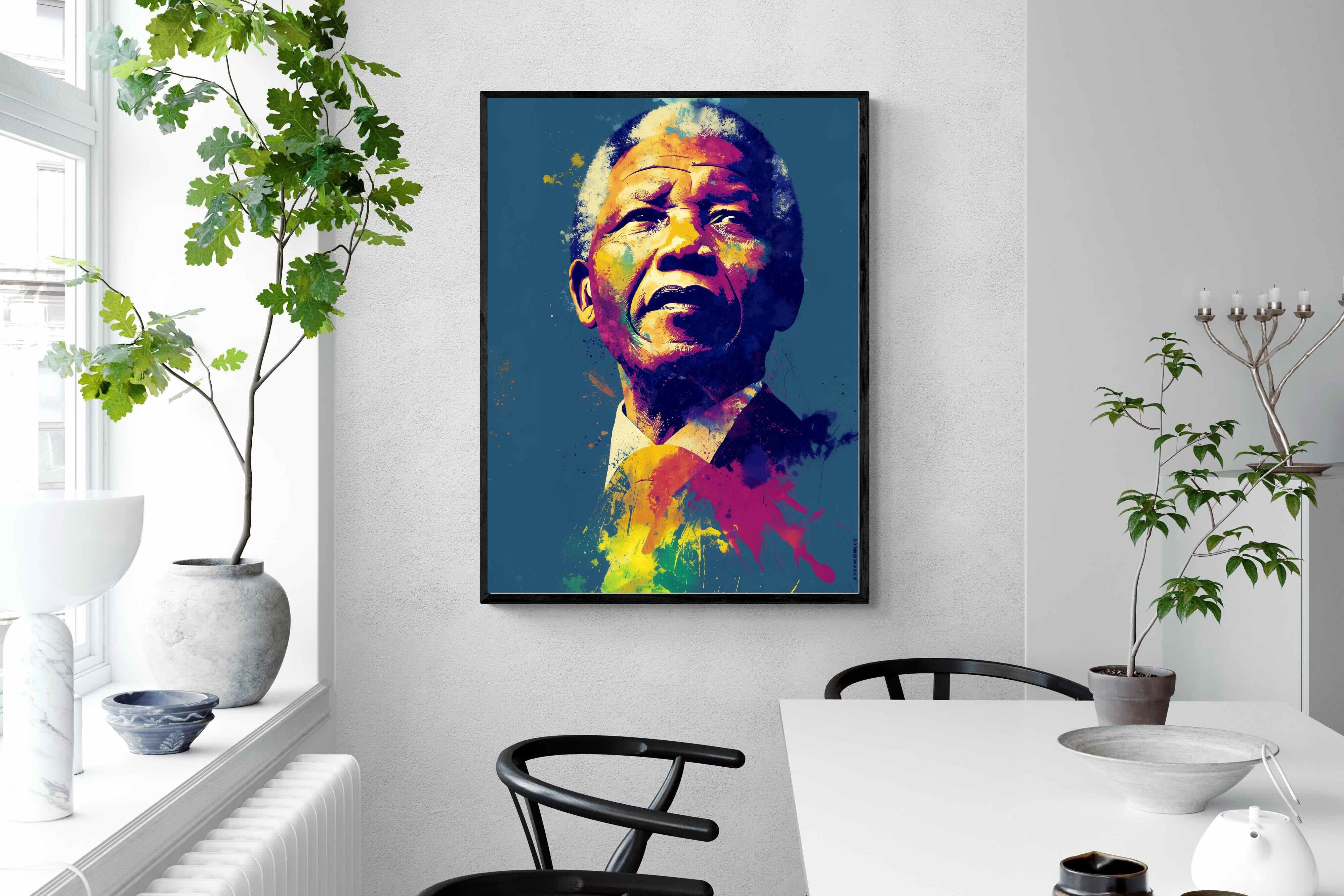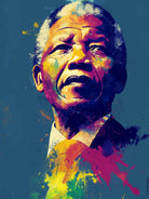 A vibrant pop art portrait of Nelson Mandela rendered in bold splashes of colour celebrates one of the most influential figures of modern history. Rich layers of blue, yellow, red and violet bring energy and movement to the composition while highlighting Mandela’s resolute expression. Contemporary and striking, the artwork honours a legacy of leadership, resilience and hope, making it a powerful statement piece for modern interiors or collections celebrating cultural icons.