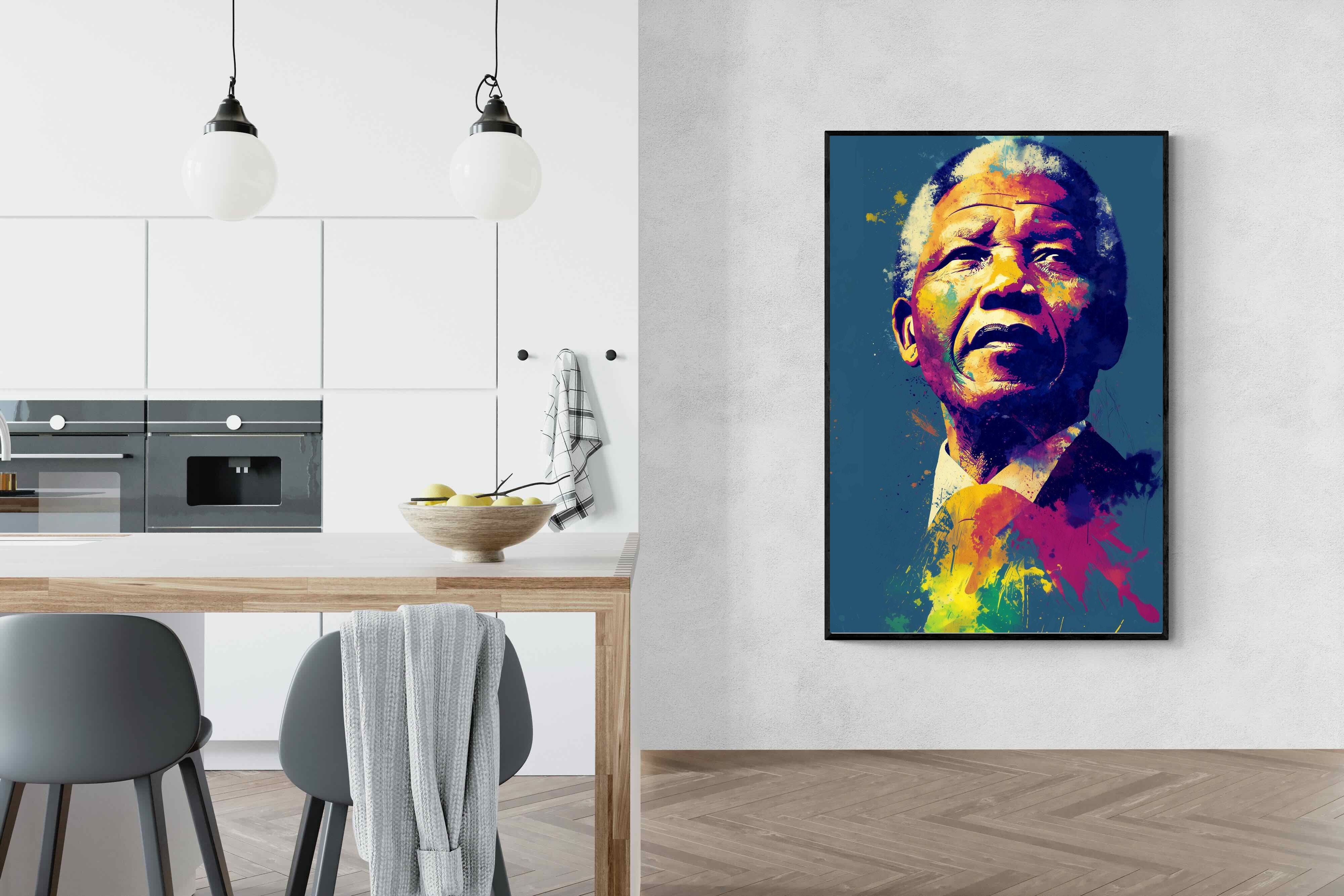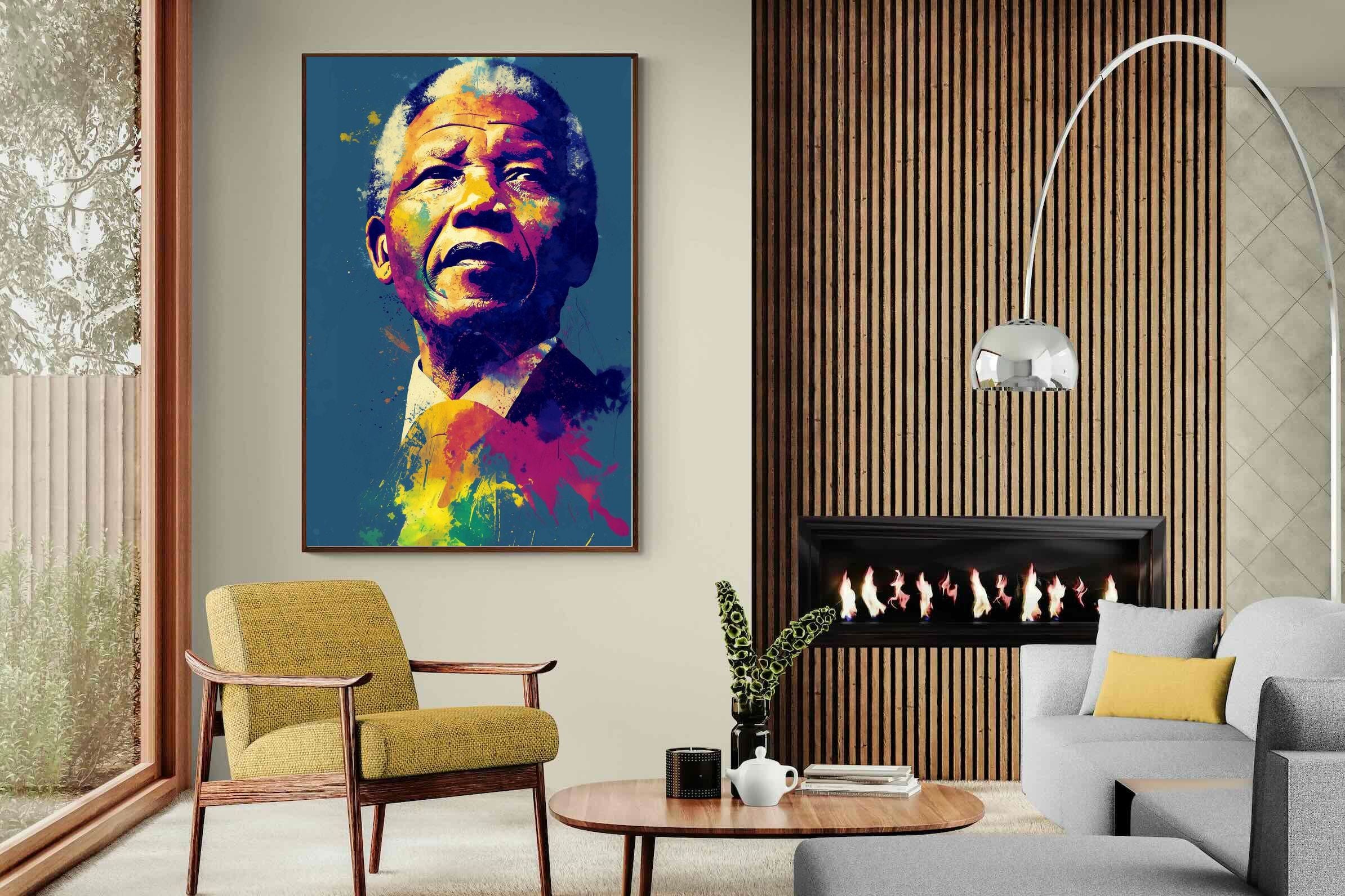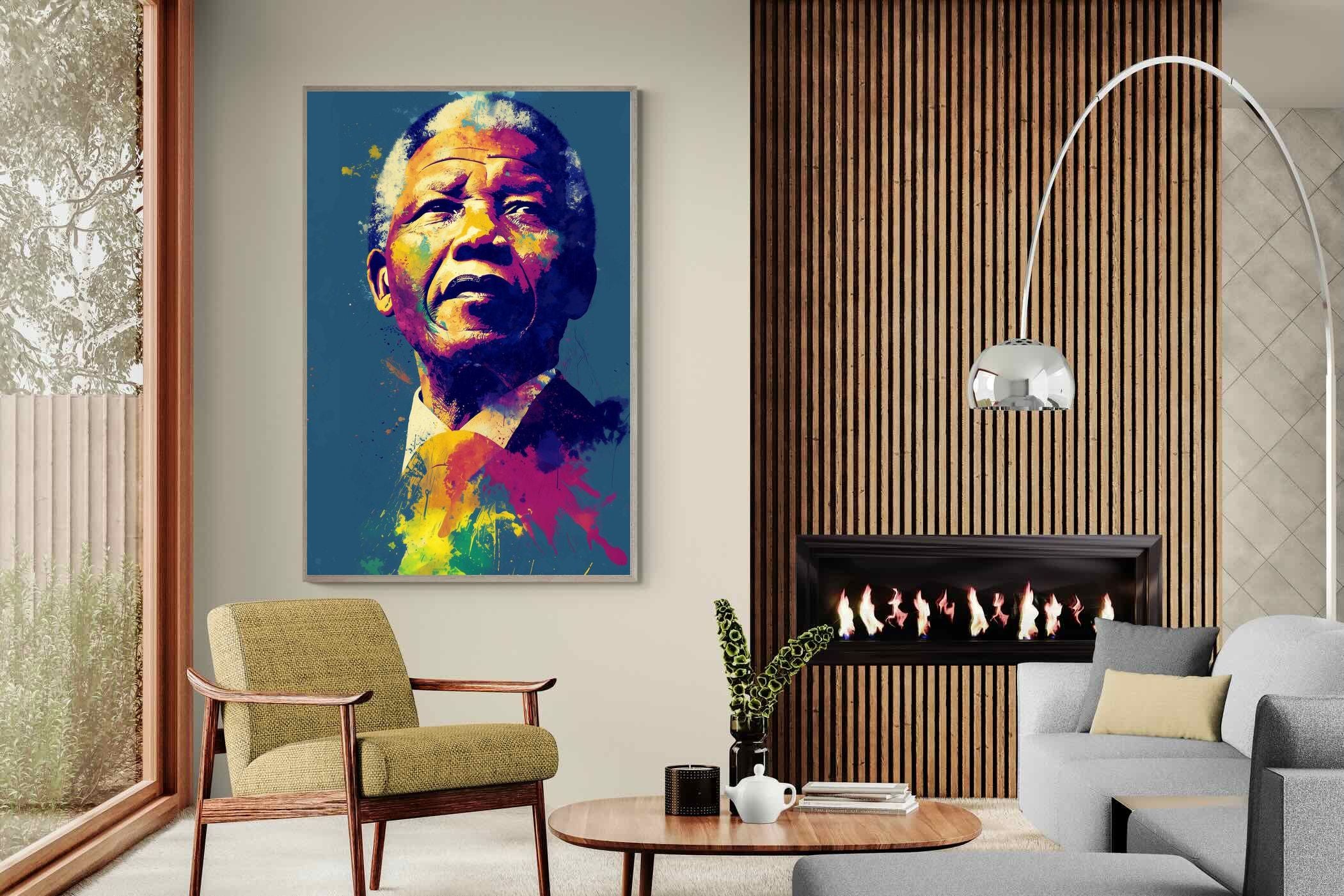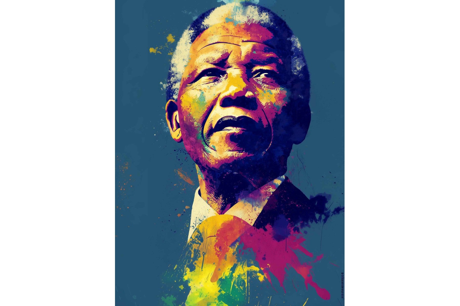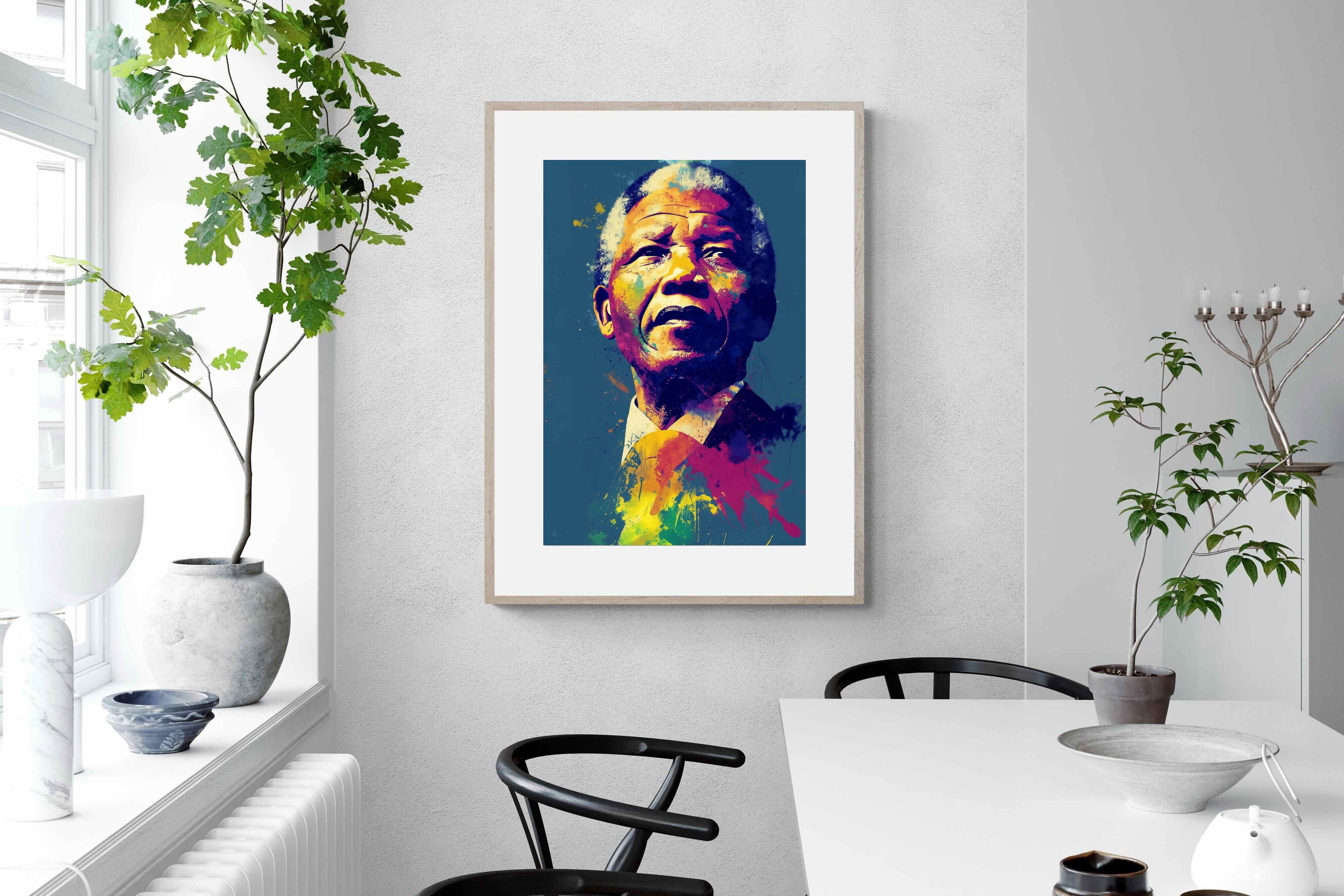 A vibrant pop art portrait of Nelson Mandela rendered in bold splashes of colour celebrates one of the most influential figures of modern history. Rich layers of blue, yellow, red and violet bring energy and movement to the composition while highlighting Mandela’s resolute expression. Contemporary and striking, the artwork honours a legacy of leadership, resilience and hope, making it a powerful statement piece for modern interiors or collections celebrating cultural icons.