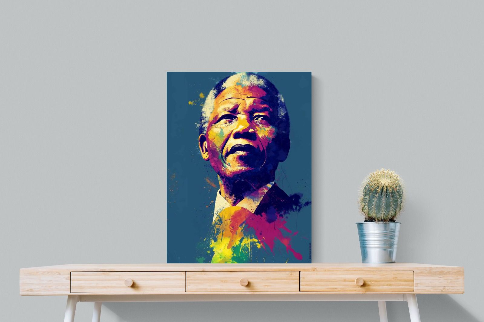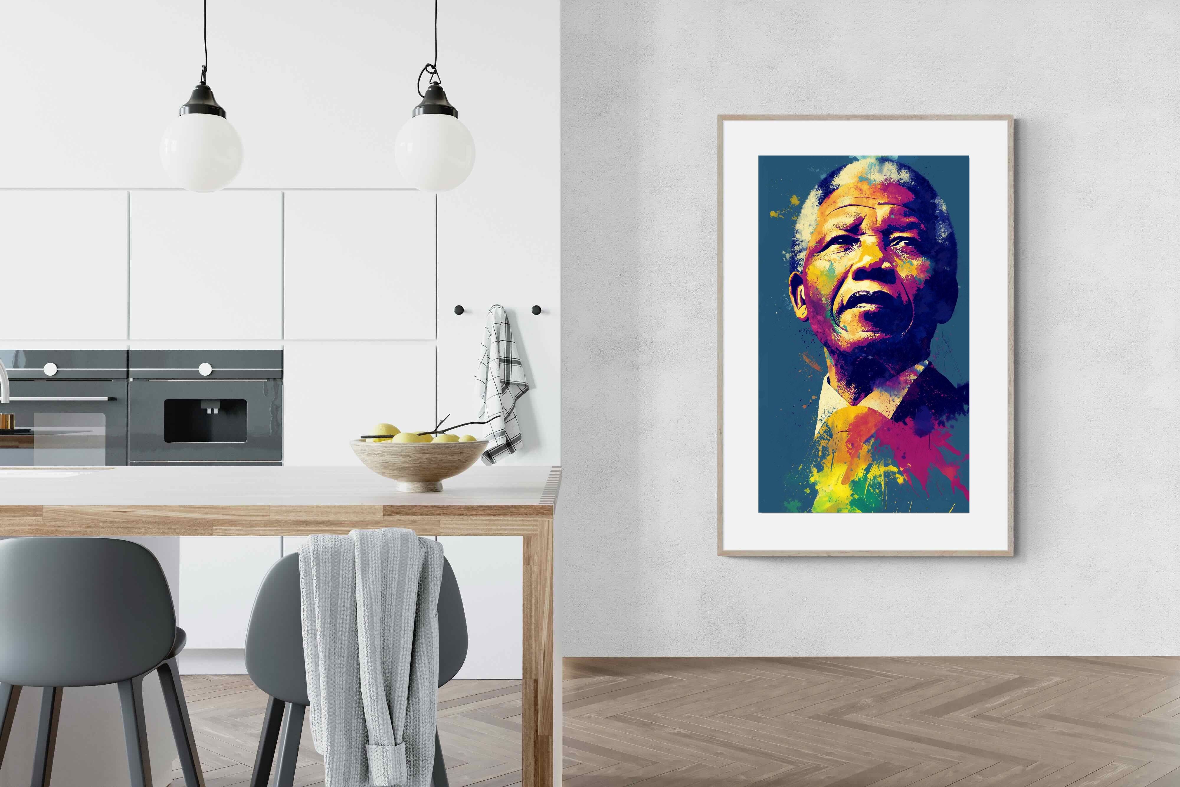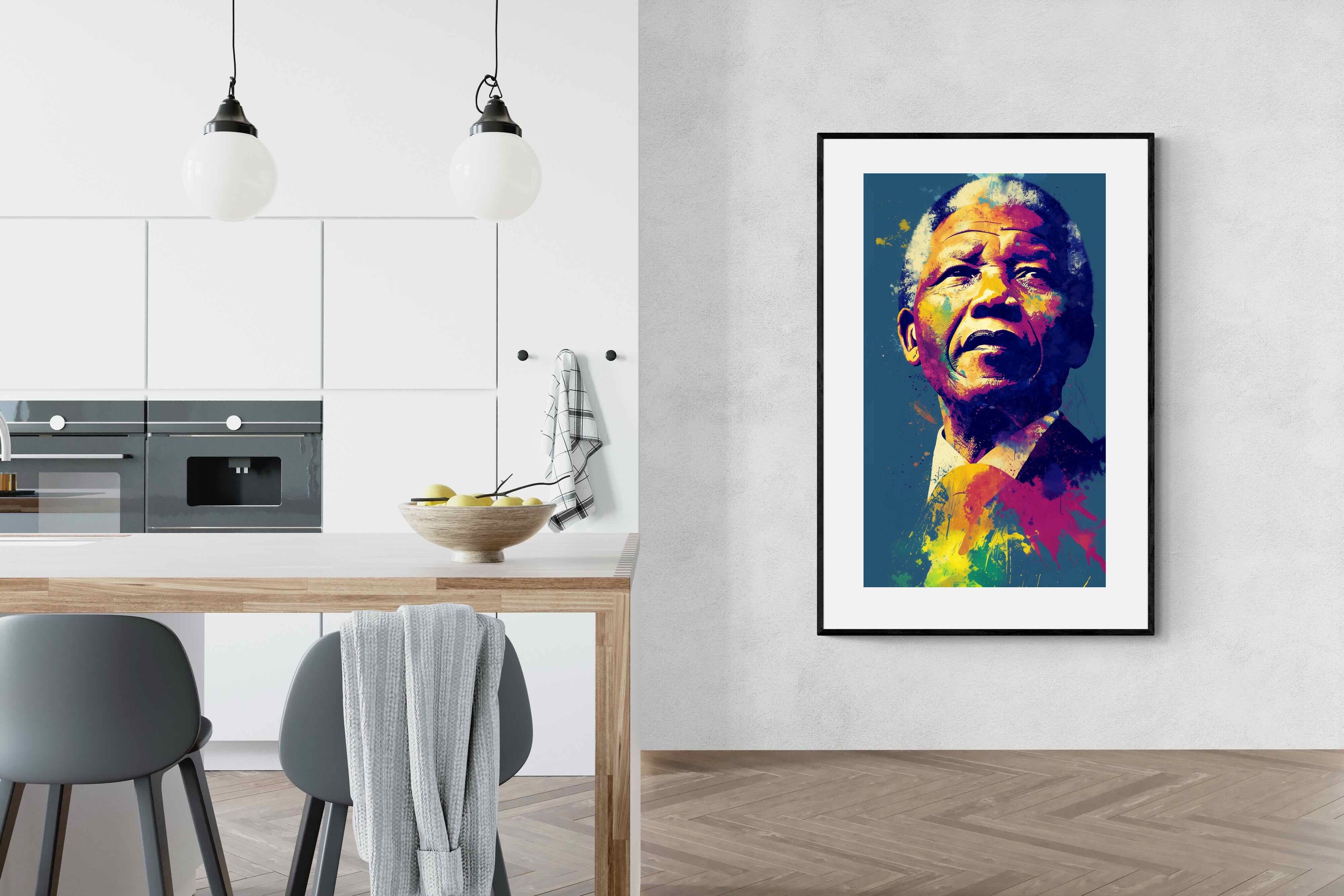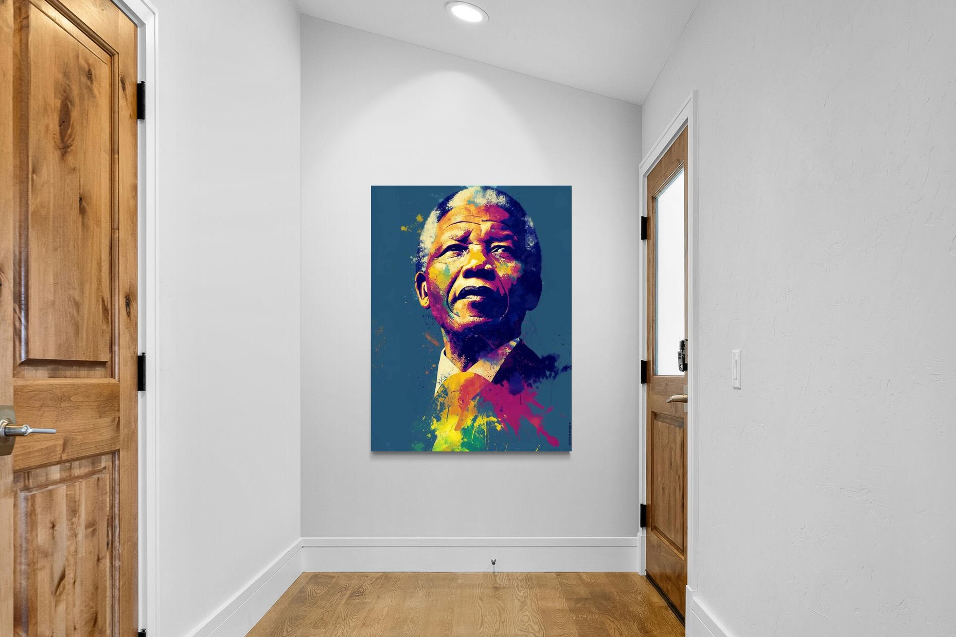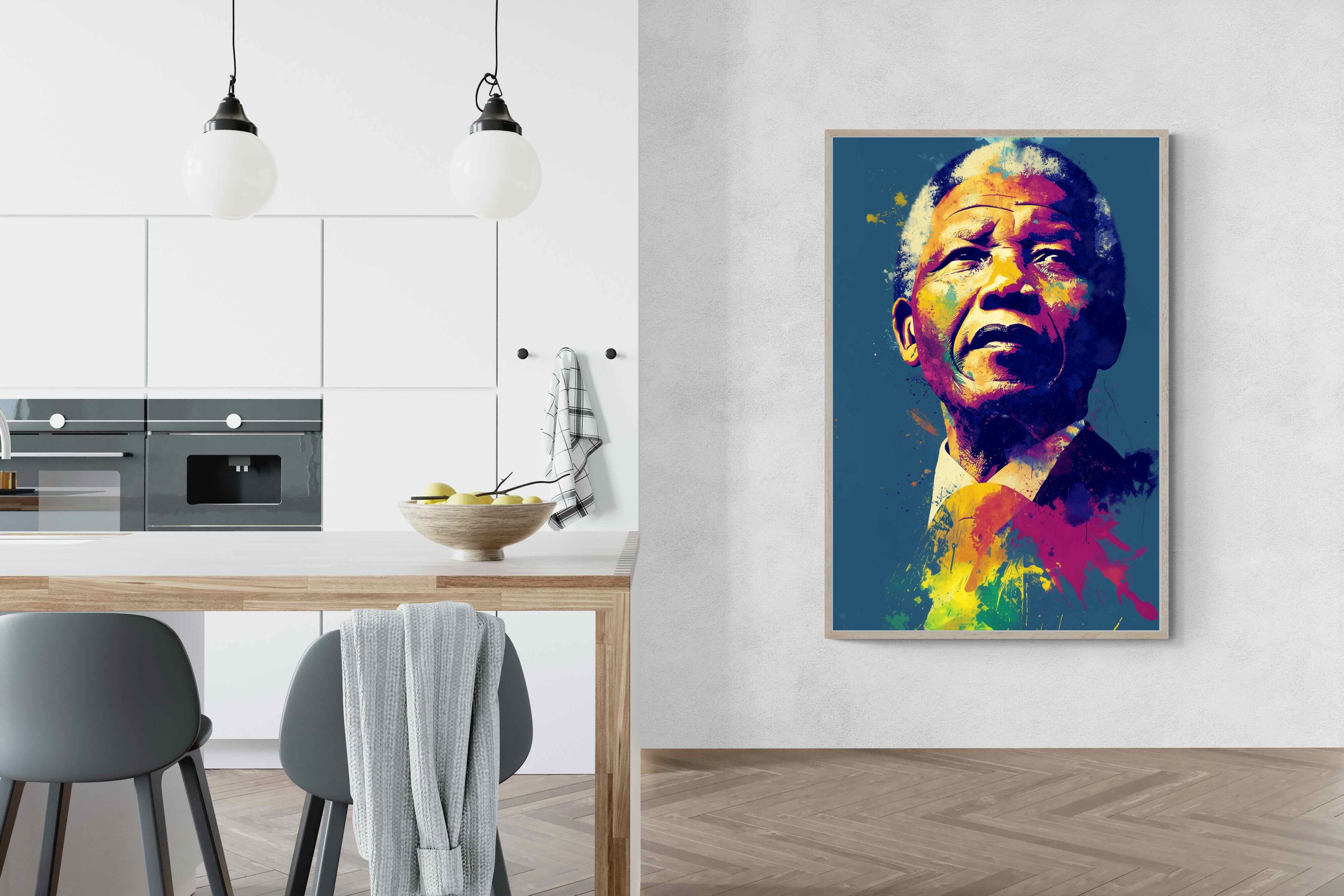 A vibrant pop art portrait of Nelson Mandela rendered in bold splashes of colour celebrates one of the most influential figures of modern history. Rich layers of blue, yellow, red and violet bring energy and movement to the composition while highlighting Mandela’s resolute expression. Contemporary and striking, the artwork honours a legacy of leadership, resilience and hope, making it a powerful statement piece for modern interiors or collections celebrating cultural icons.