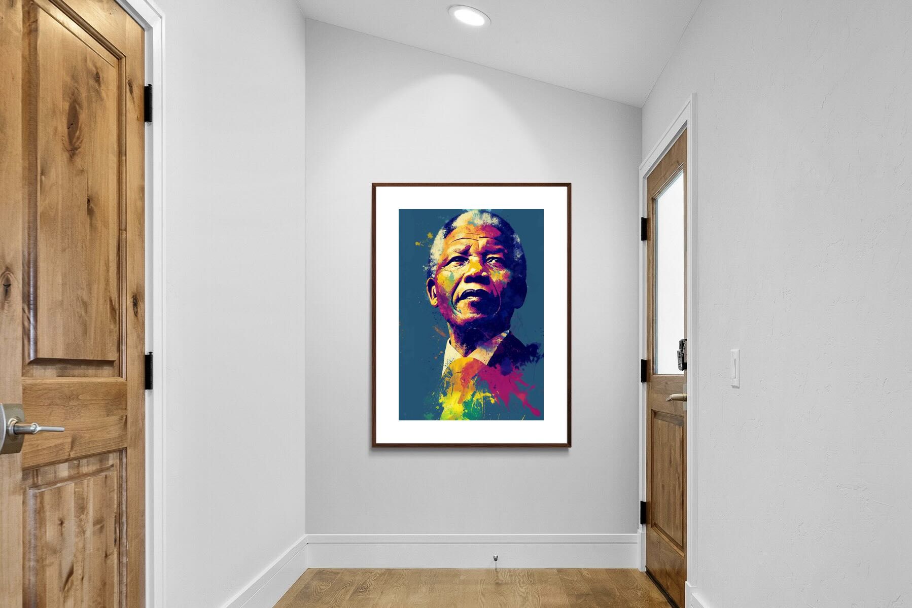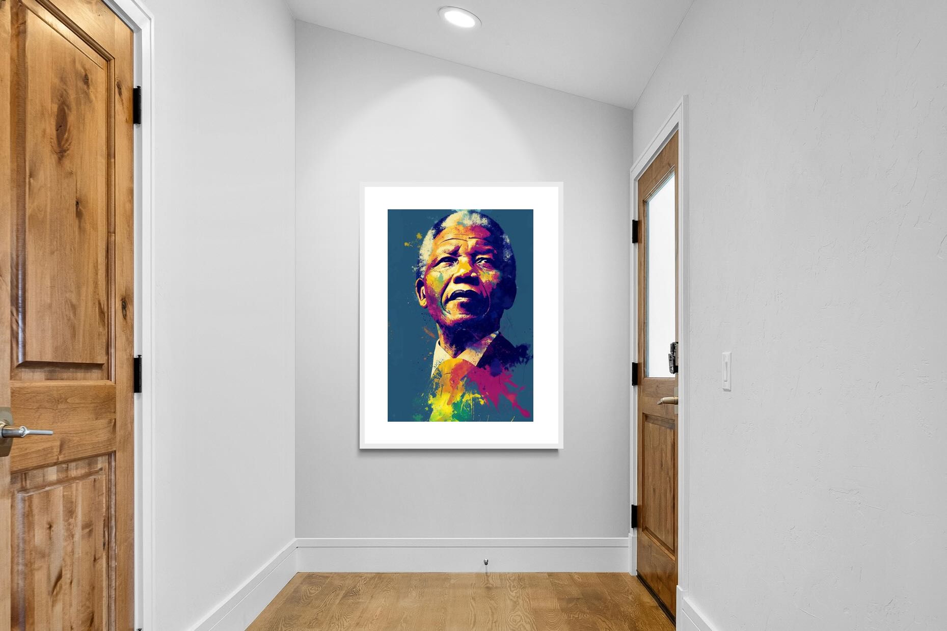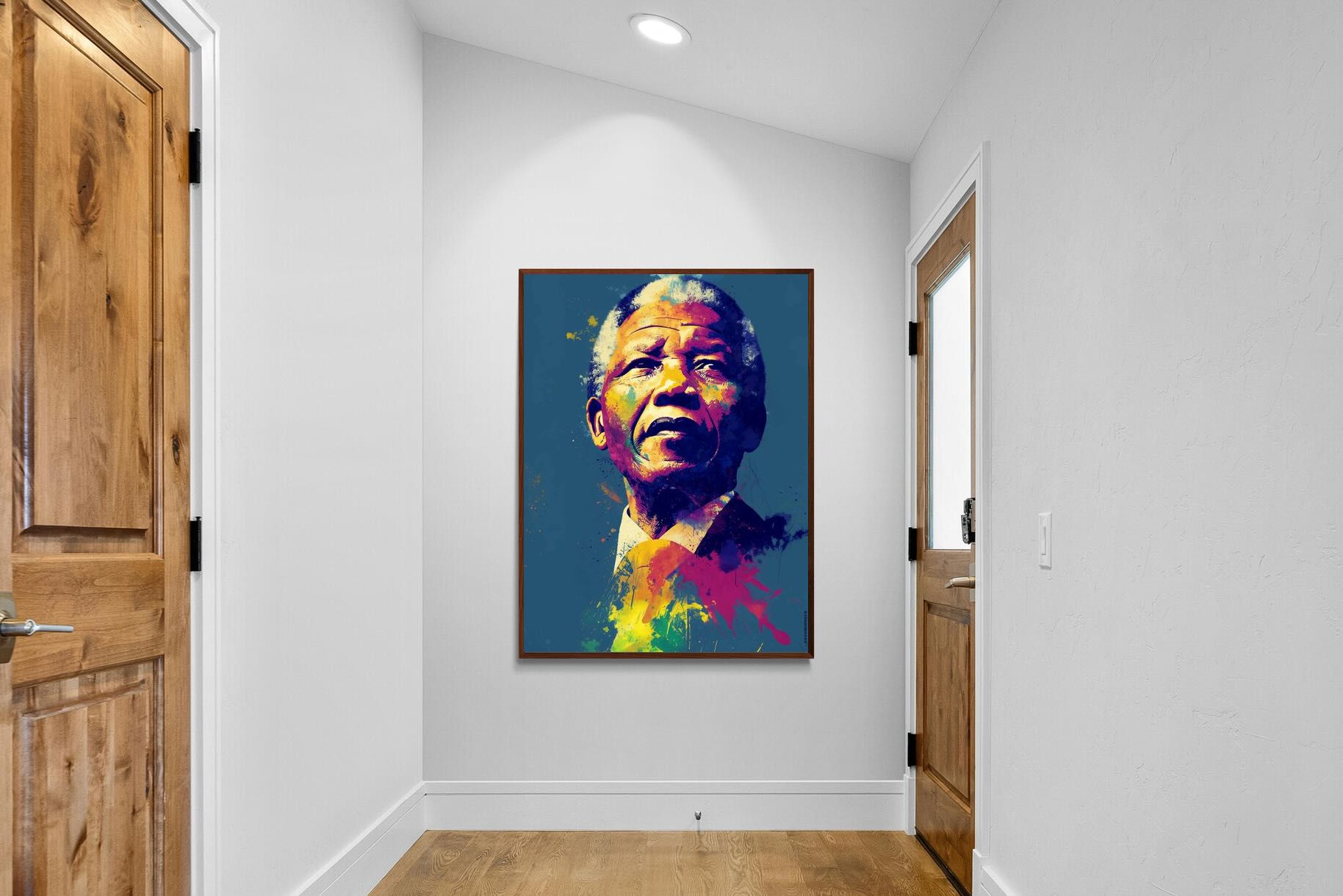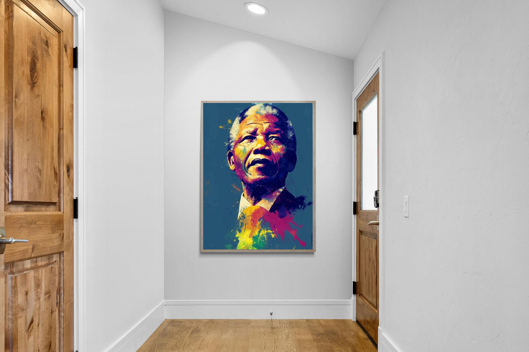 A vibrant pop art portrait of Nelson Mandela rendered in bold splashes of colour celebrates one of the most influential figures of modern history. Rich layers of blue, yellow, red and violet bring energy and movement to the composition while highlighting Mandela’s resolute expression. Contemporary and striking, the artwork honours a legacy of leadership, resilience and hope, making it a powerful statement piece for modern interiors or collections celebrating cultural icons.