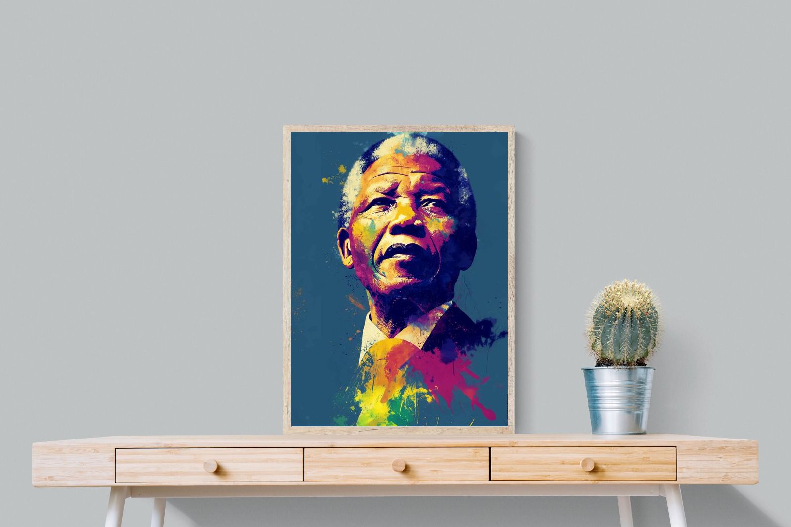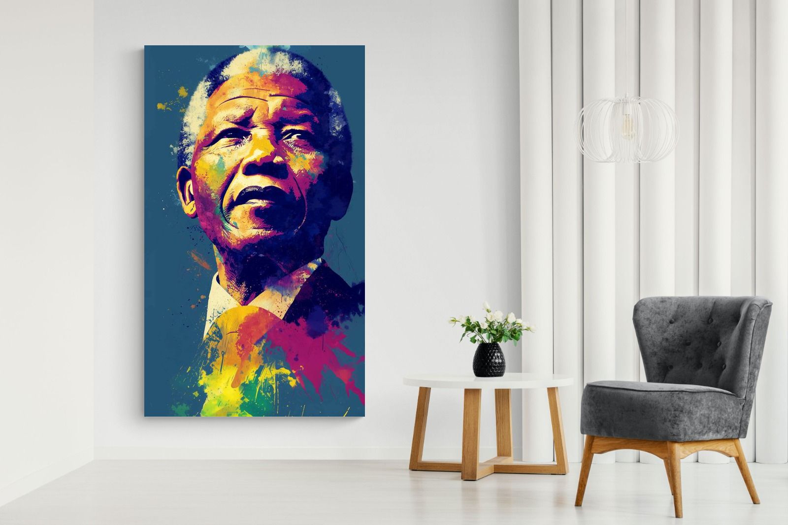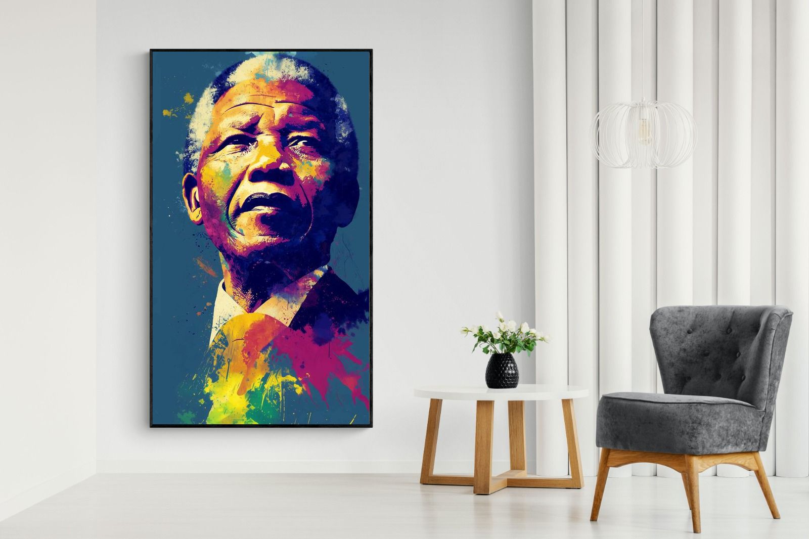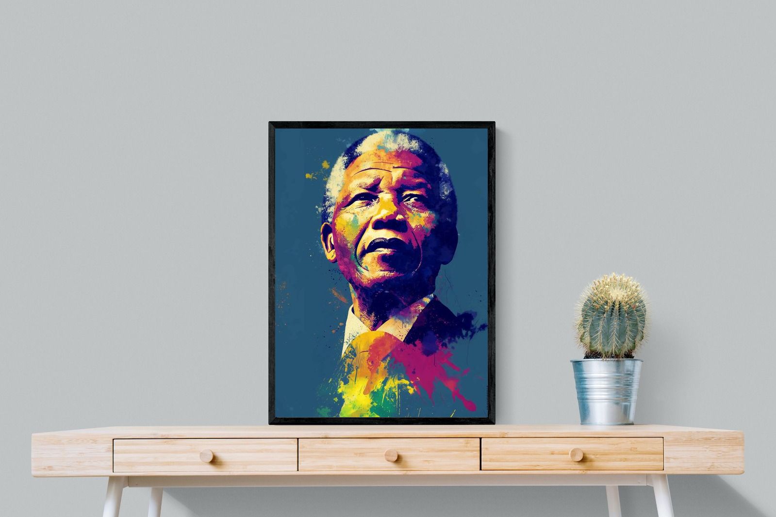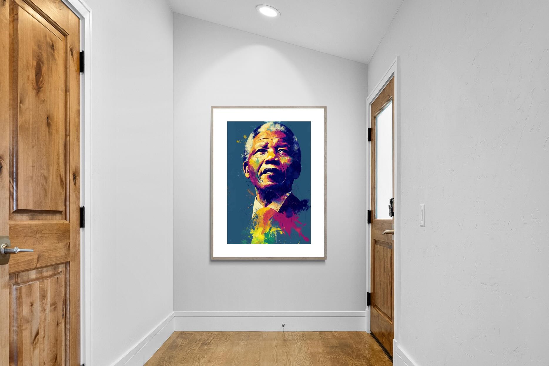 A vibrant pop art portrait of Nelson Mandela rendered in bold splashes of colour celebrates one of the most influential figures of modern history. Rich layers of blue, yellow, red and violet bring energy and movement to the composition while highlighting Mandela’s resolute expression. Contemporary and striking, the artwork honours a legacy of leadership, resilience and hope, making it a powerful statement piece for modern interiors or collections celebrating cultural icons.