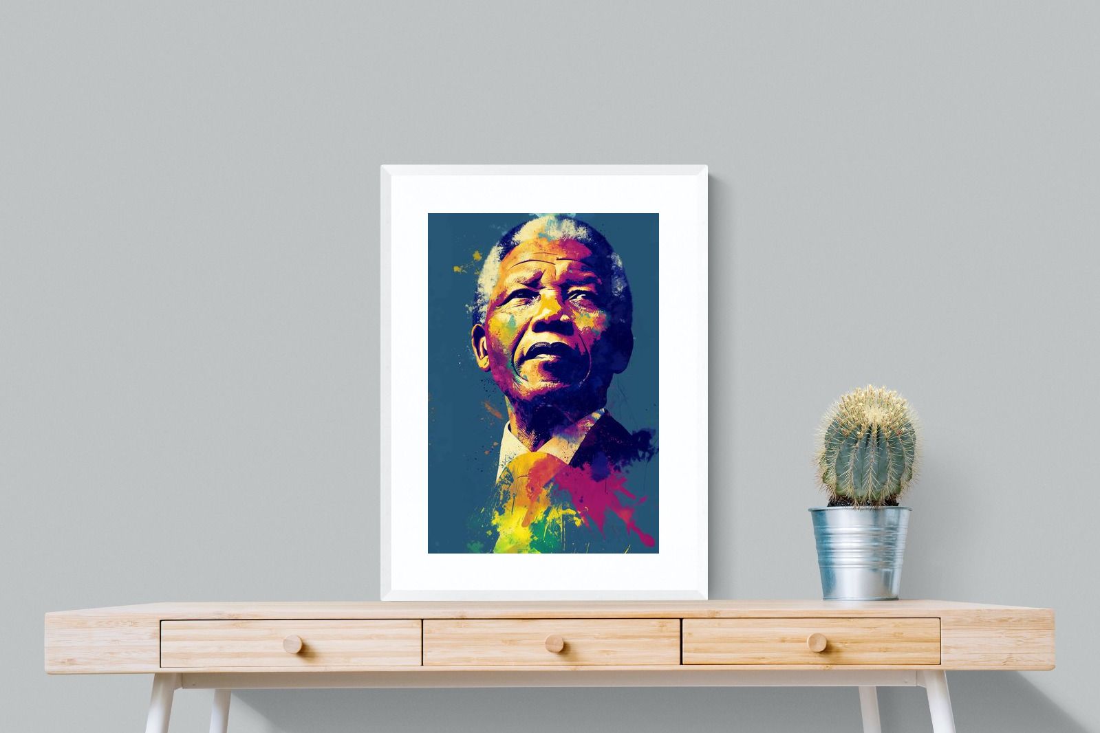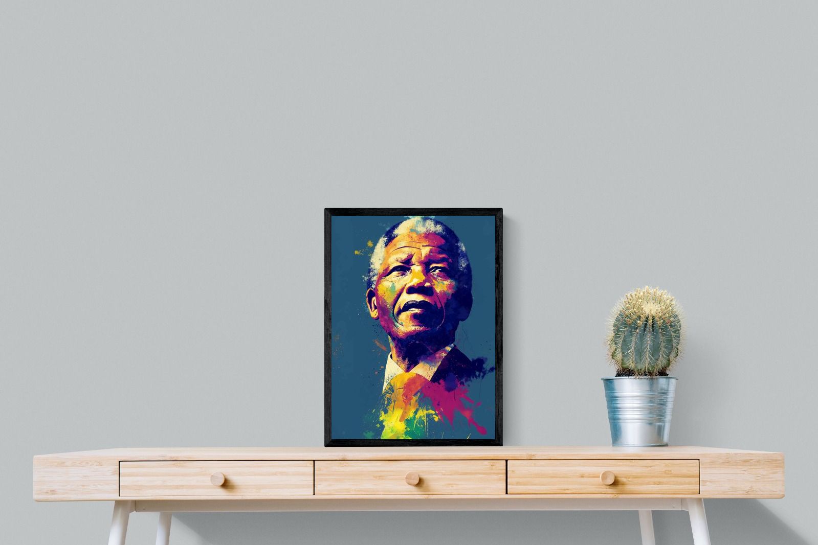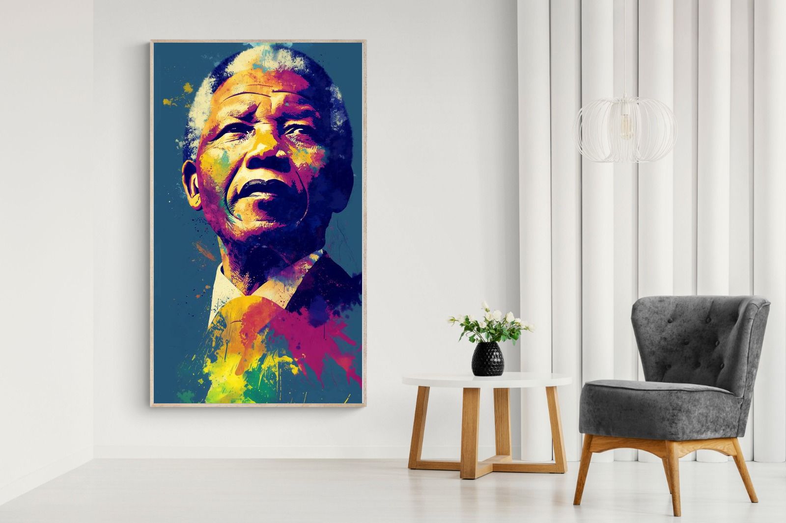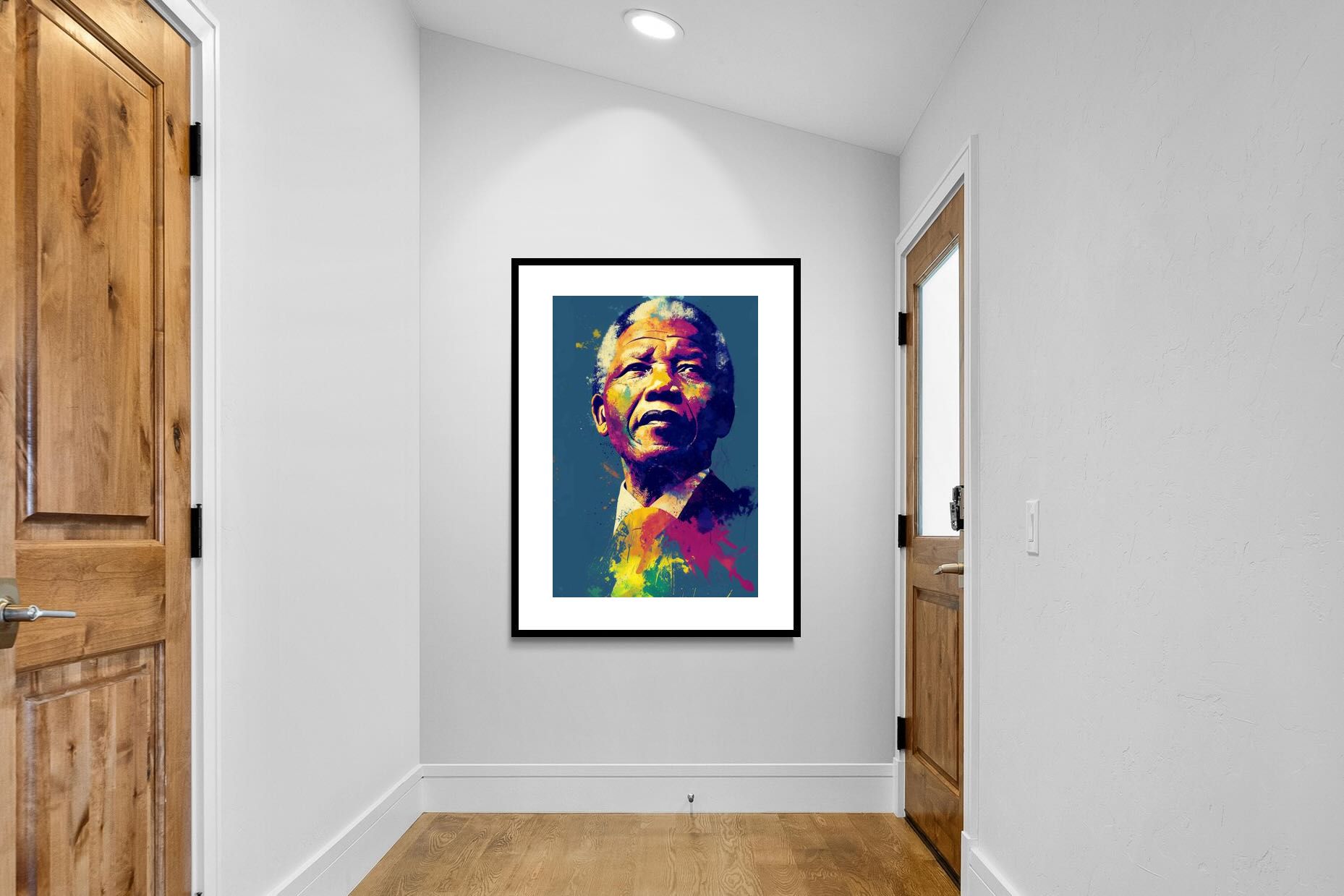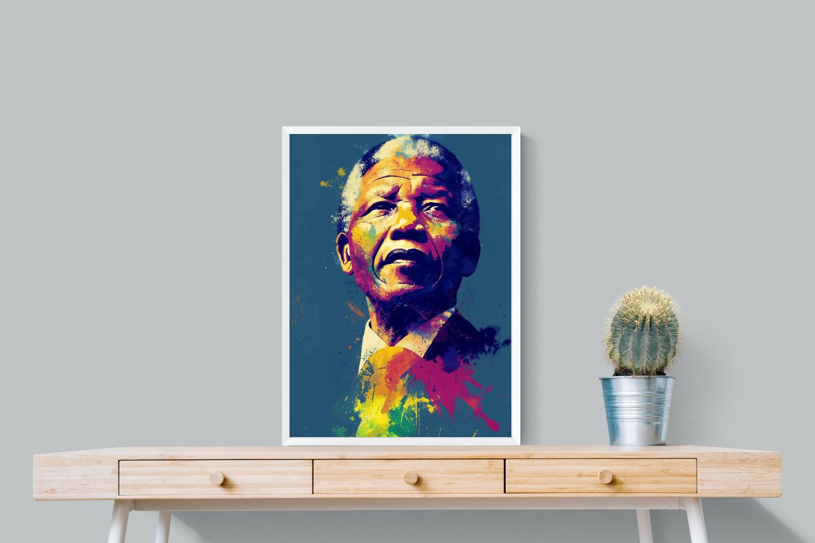 A vibrant pop art portrait of Nelson Mandela rendered in bold splashes of colour celebrates one of the most influential figures of modern history. Rich layers of blue, yellow, red and violet bring energy and movement to the composition while highlighting Mandela’s resolute expression. Contemporary and striking, the artwork honours a legacy of leadership, resilience and hope, making it a powerful statement piece for modern interiors or collections celebrating cultural icons.