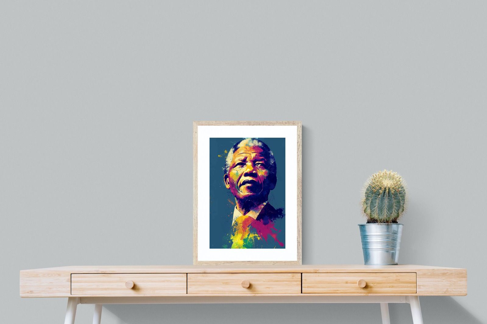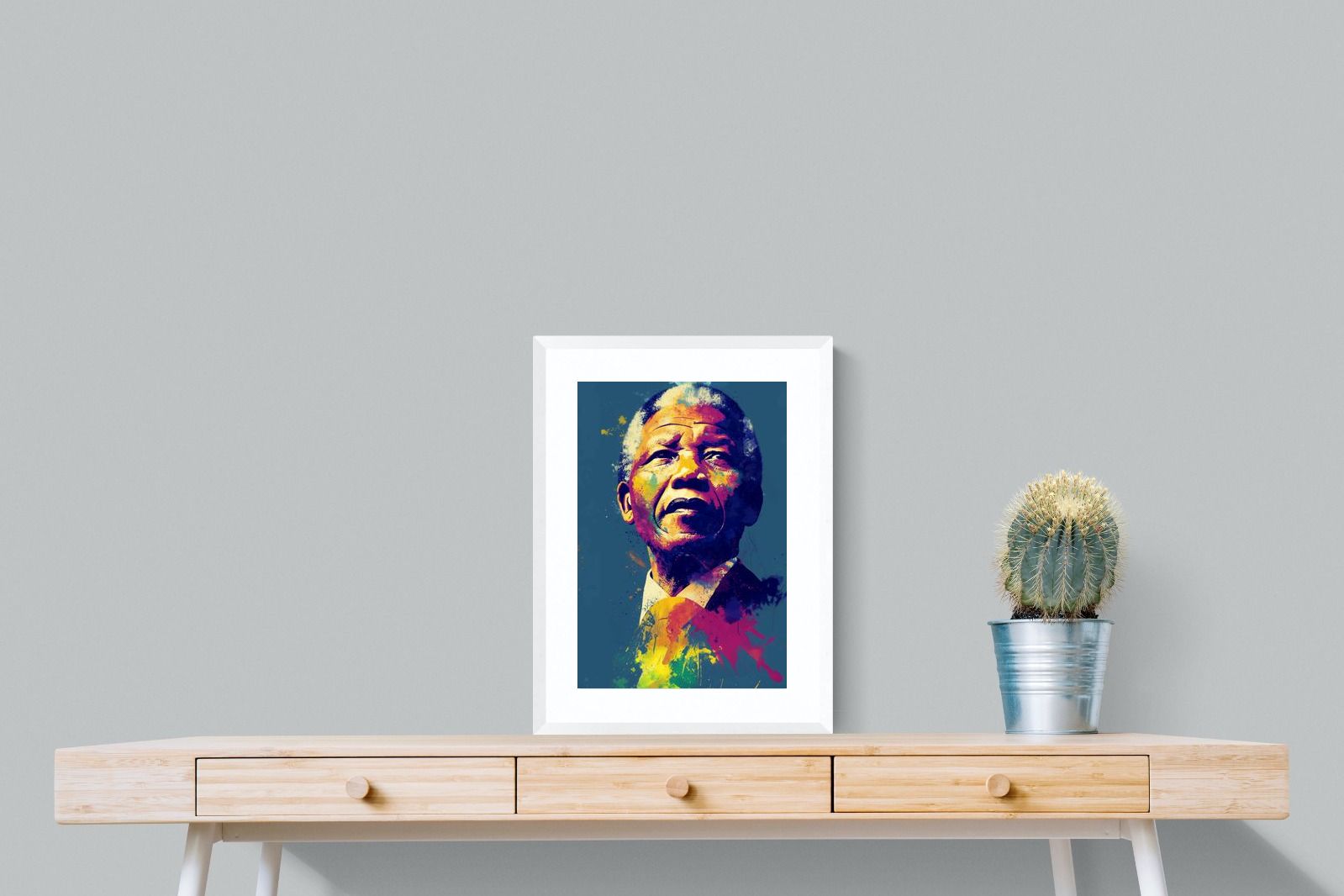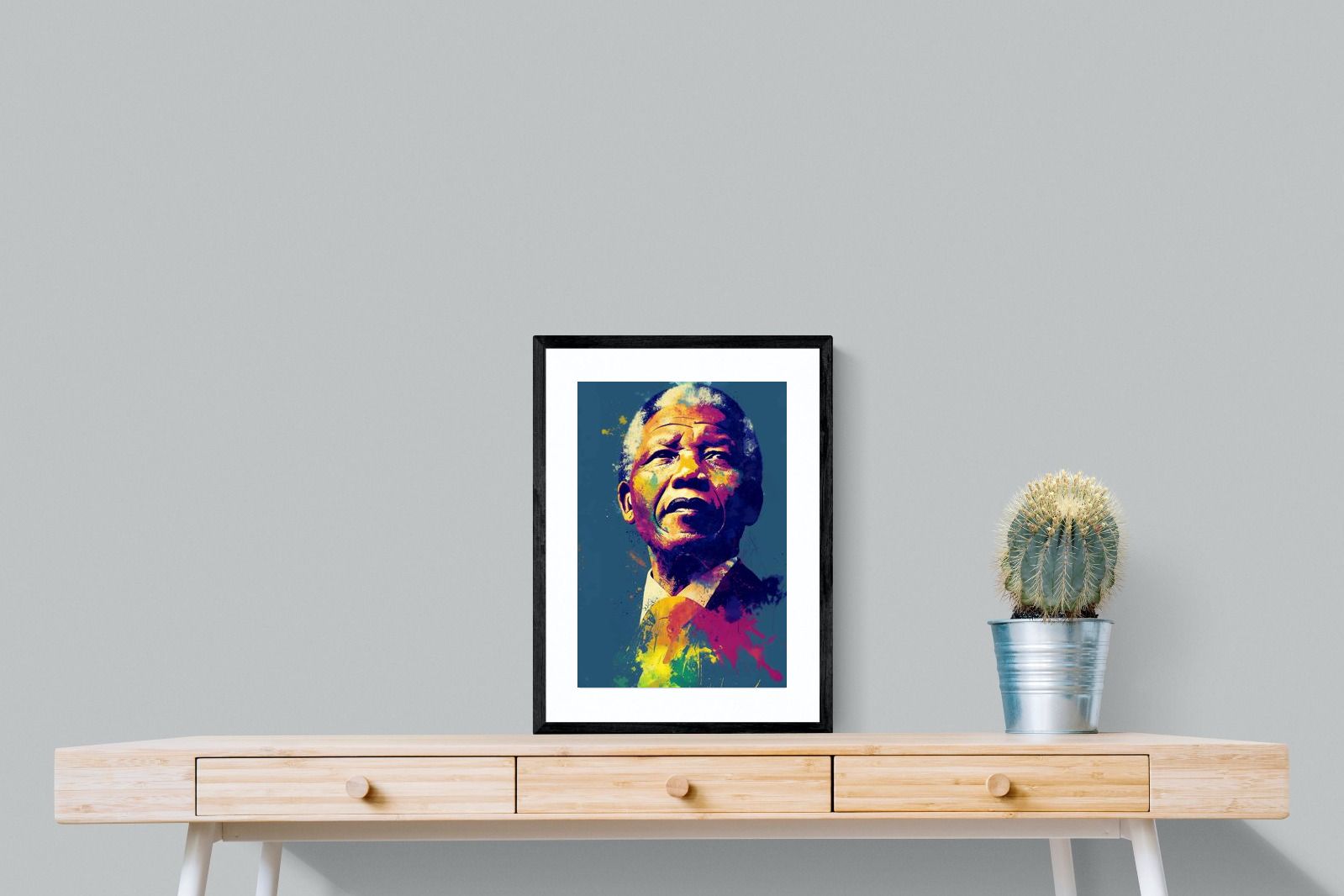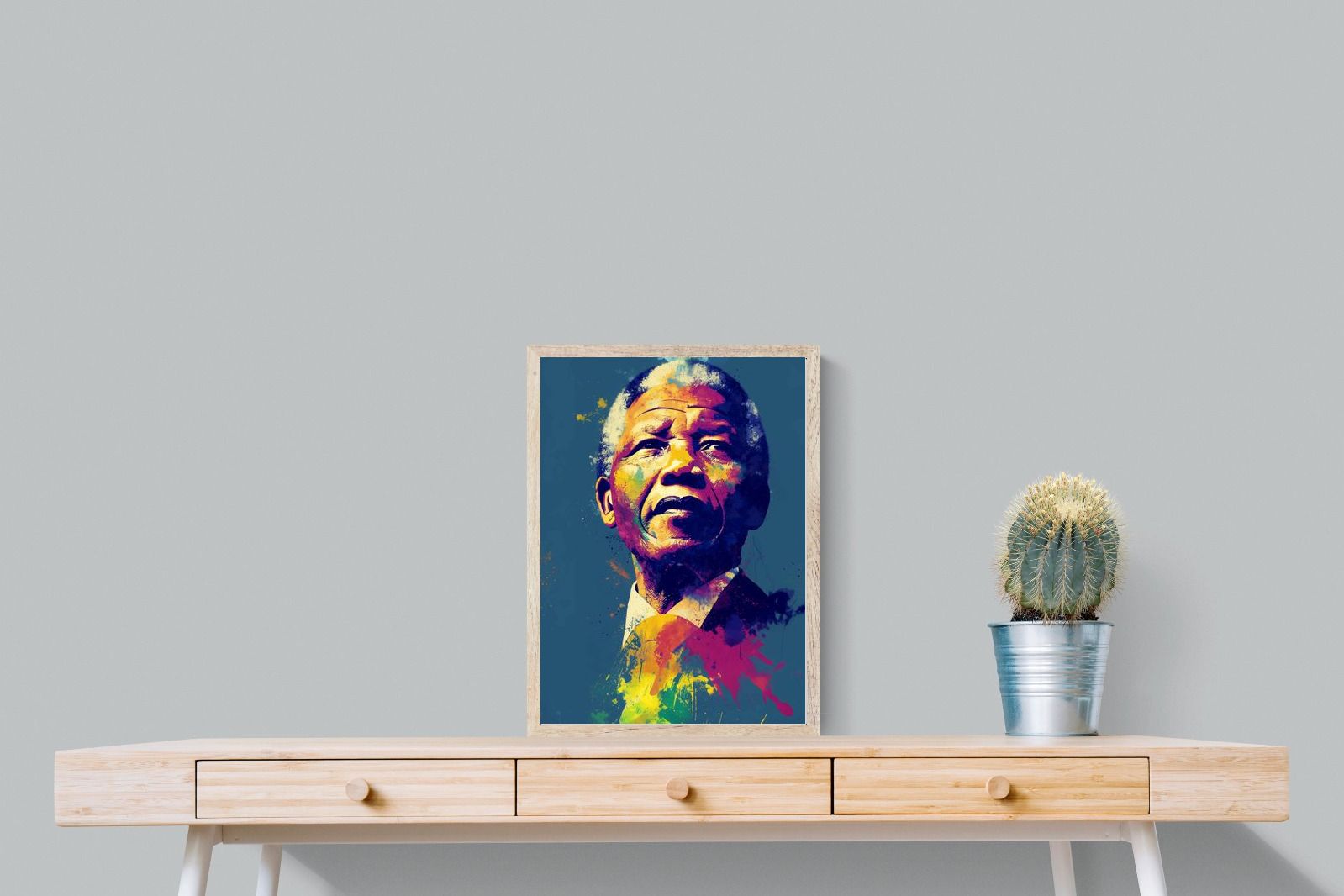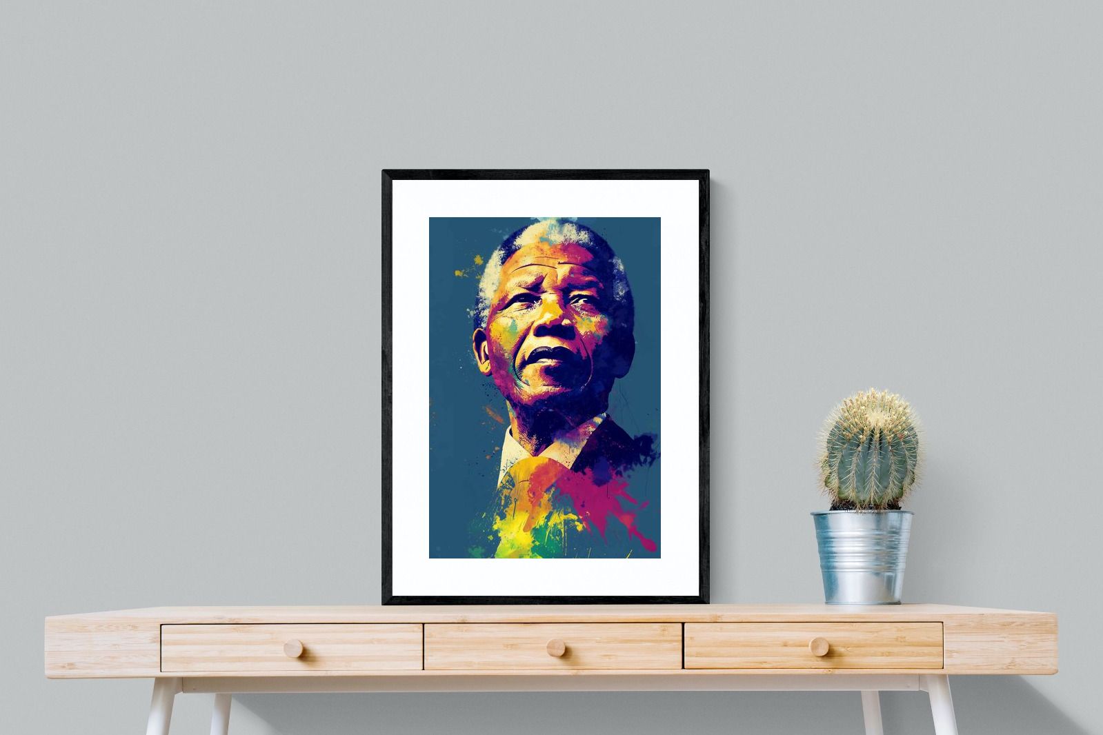 A vibrant pop art portrait of Nelson Mandela rendered in bold splashes of colour celebrates one of the most influential figures of modern history. Rich layers of blue, yellow, red and violet bring energy and movement to the composition while highlighting Mandela’s resolute expression. Contemporary and striking, the artwork honours a legacy of leadership, resilience and hope, making it a powerful statement piece for modern interiors or collections celebrating cultural icons.