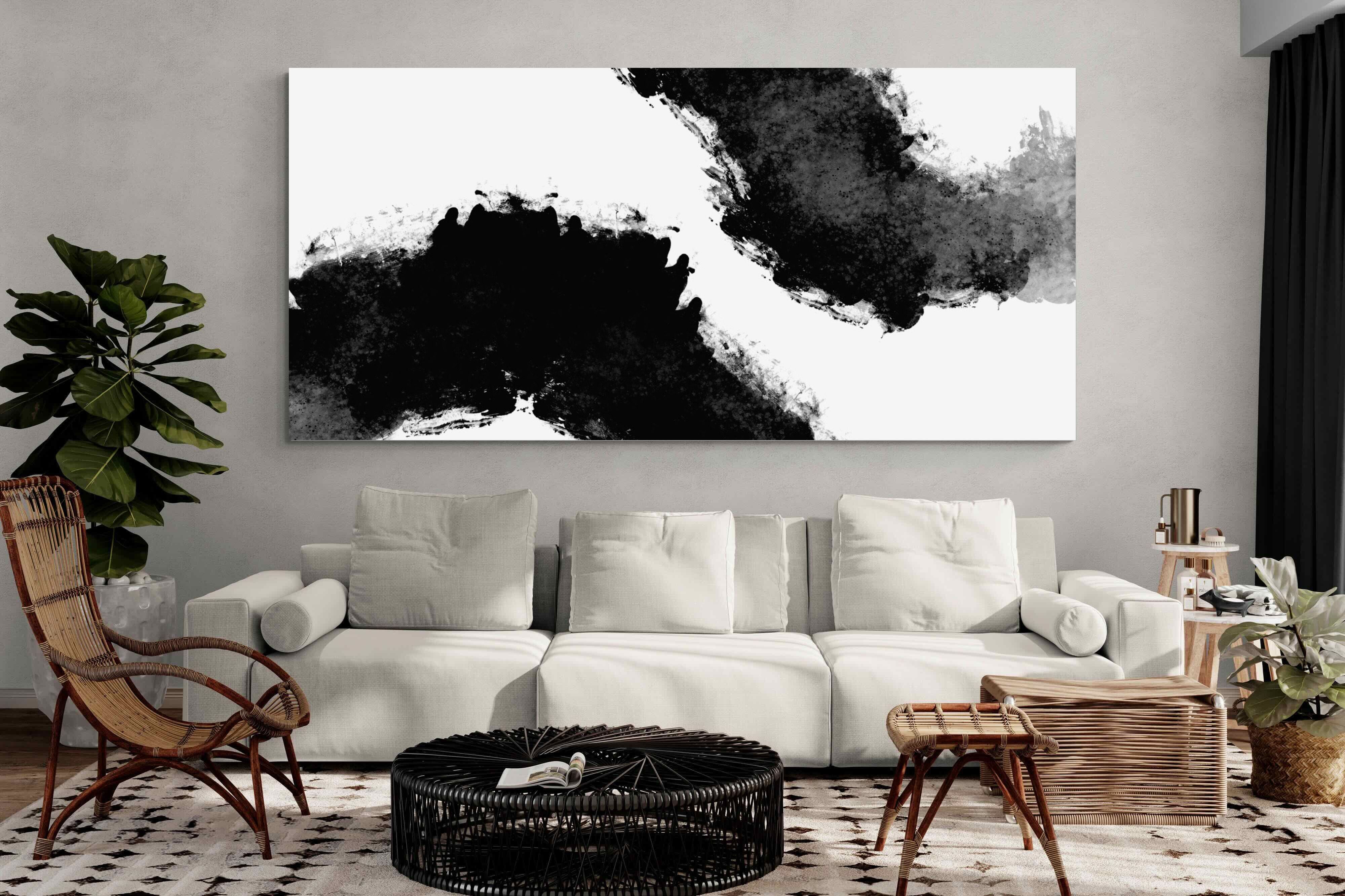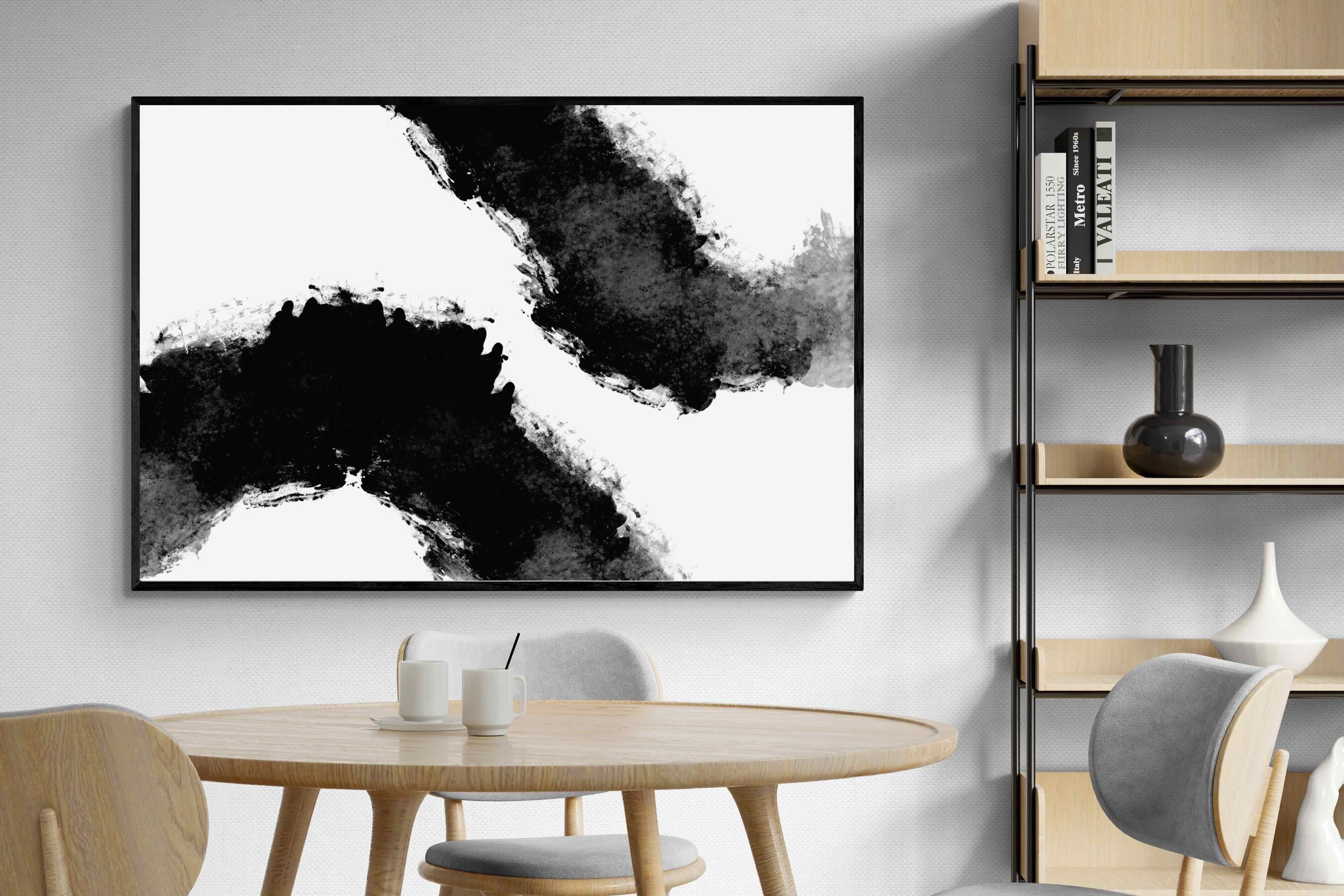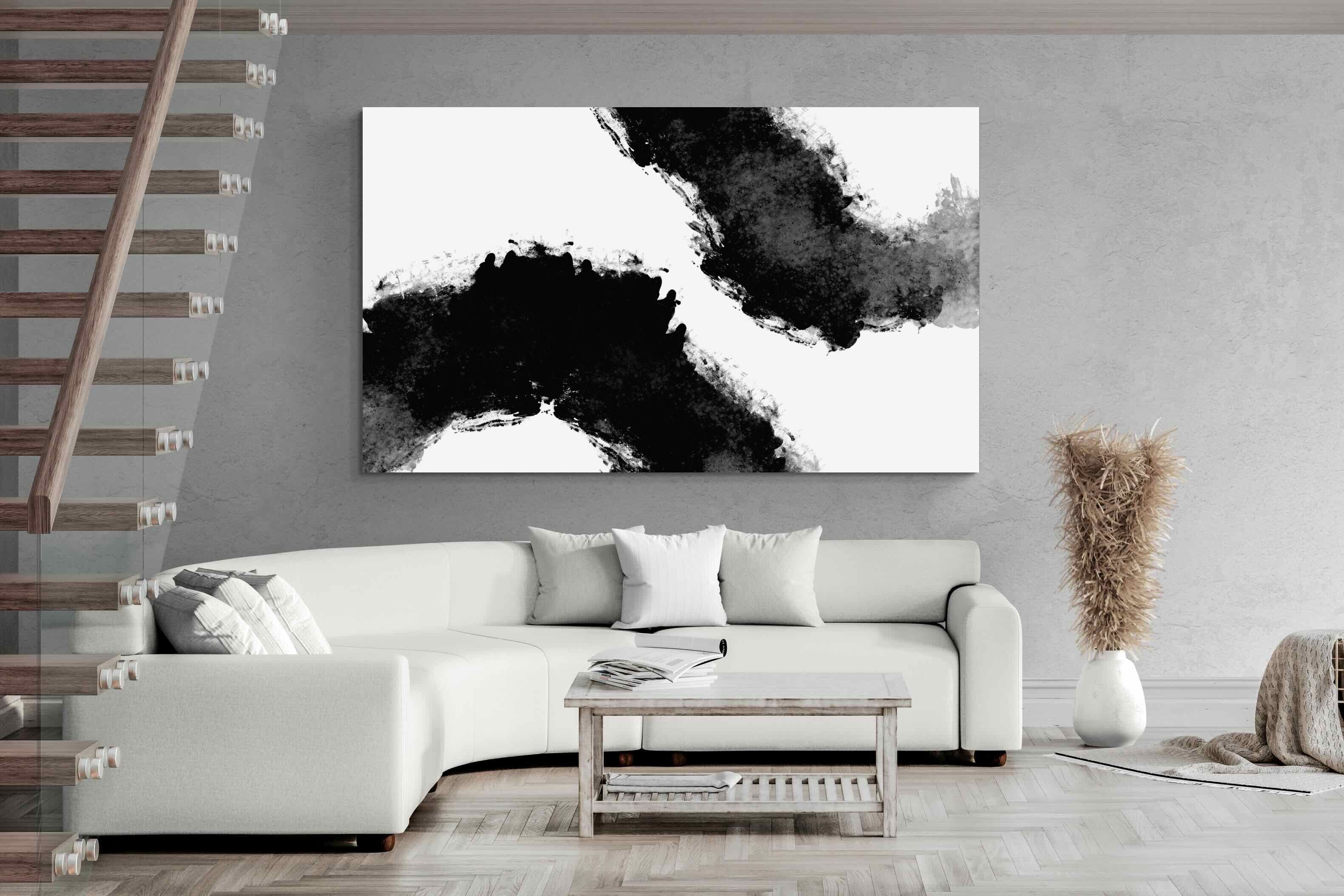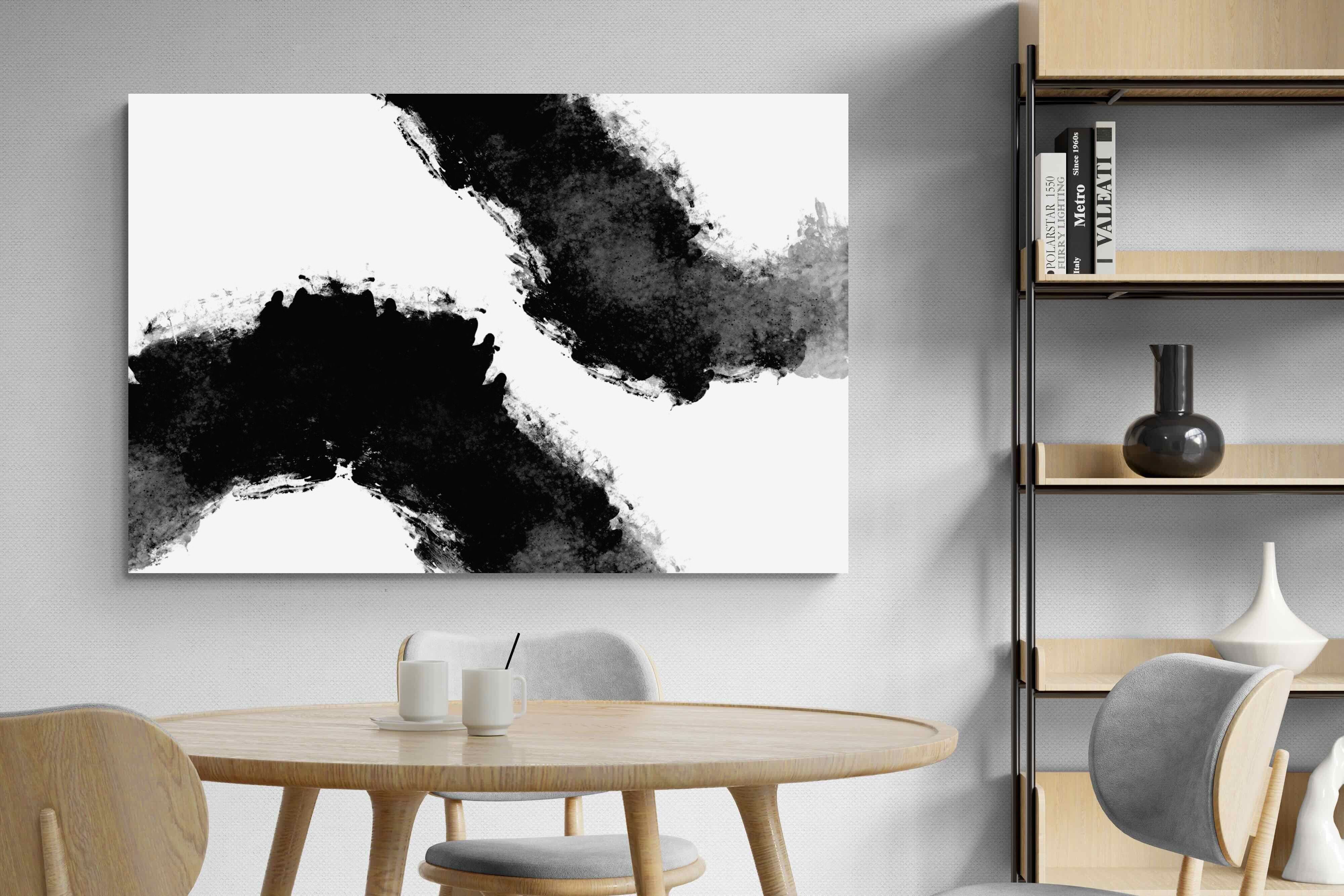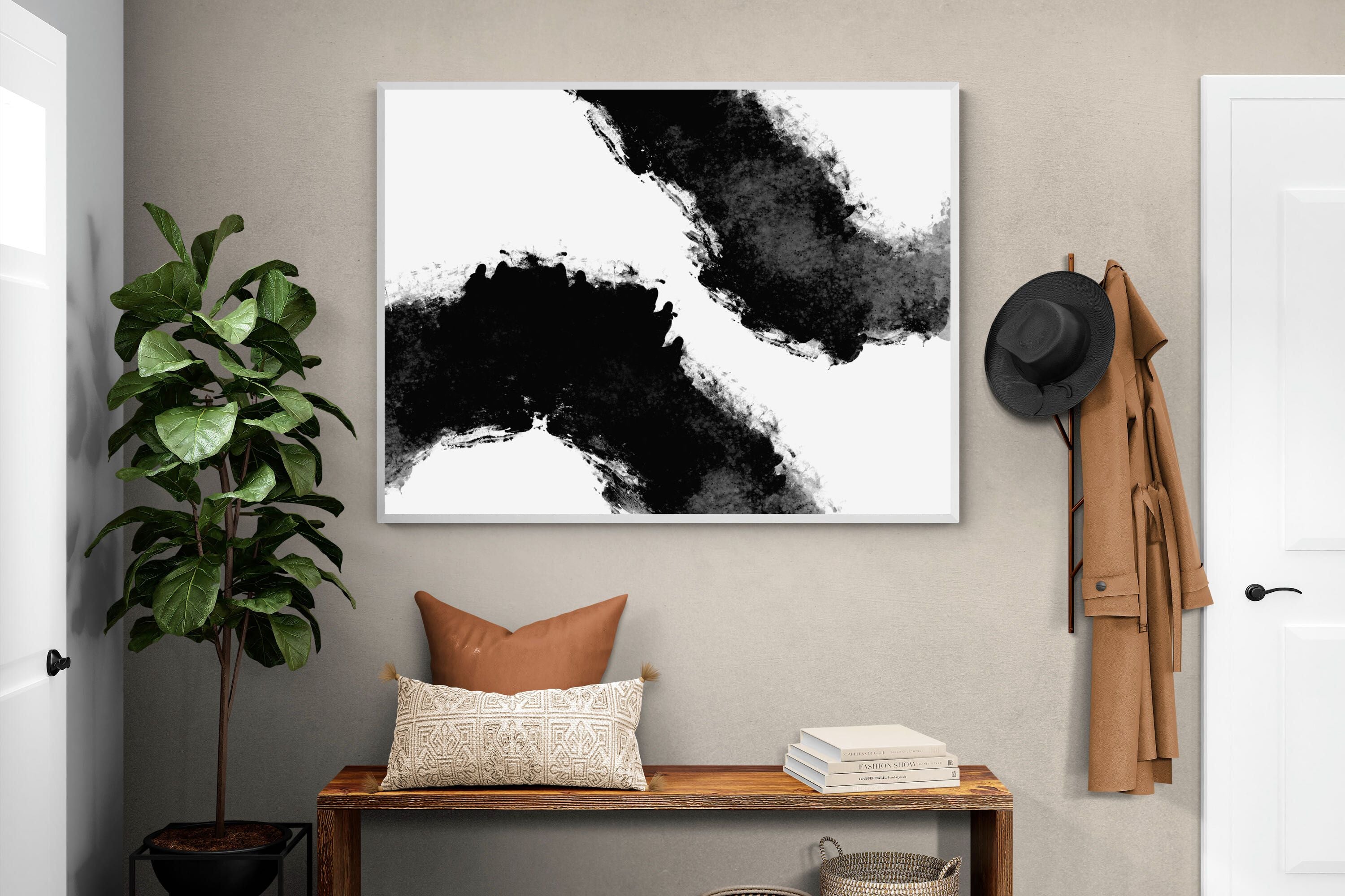 Inkfall is a bold monochrome abstract defined by dramatic black ink textures against a crisp white background. The raw contrast and organic edges give the piece a strong contemporary presence. Ideal for modern, industrial or minimalist interiors, it works well as a statement artwork in living rooms, offices or galleries where clean lines and impact matter.
