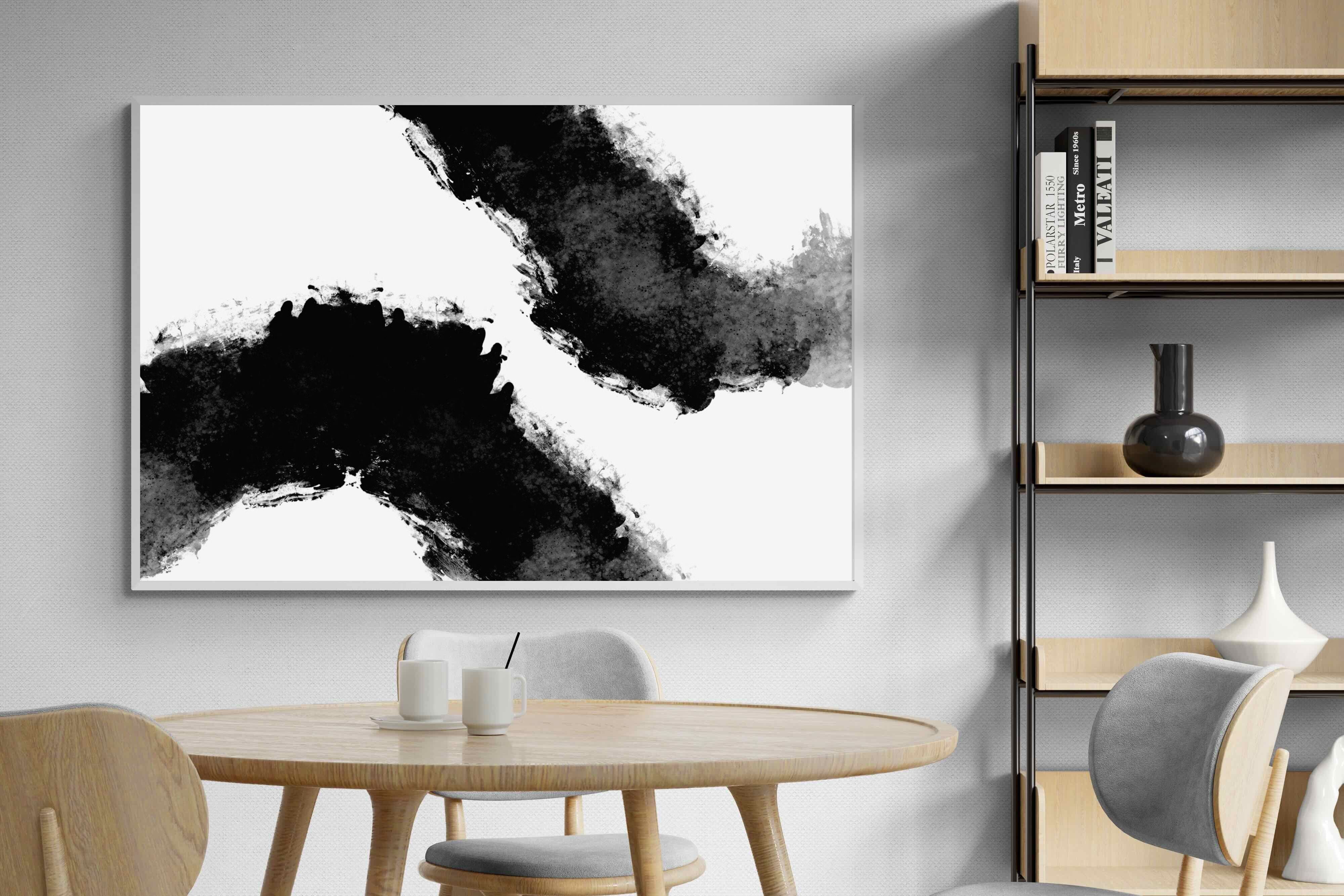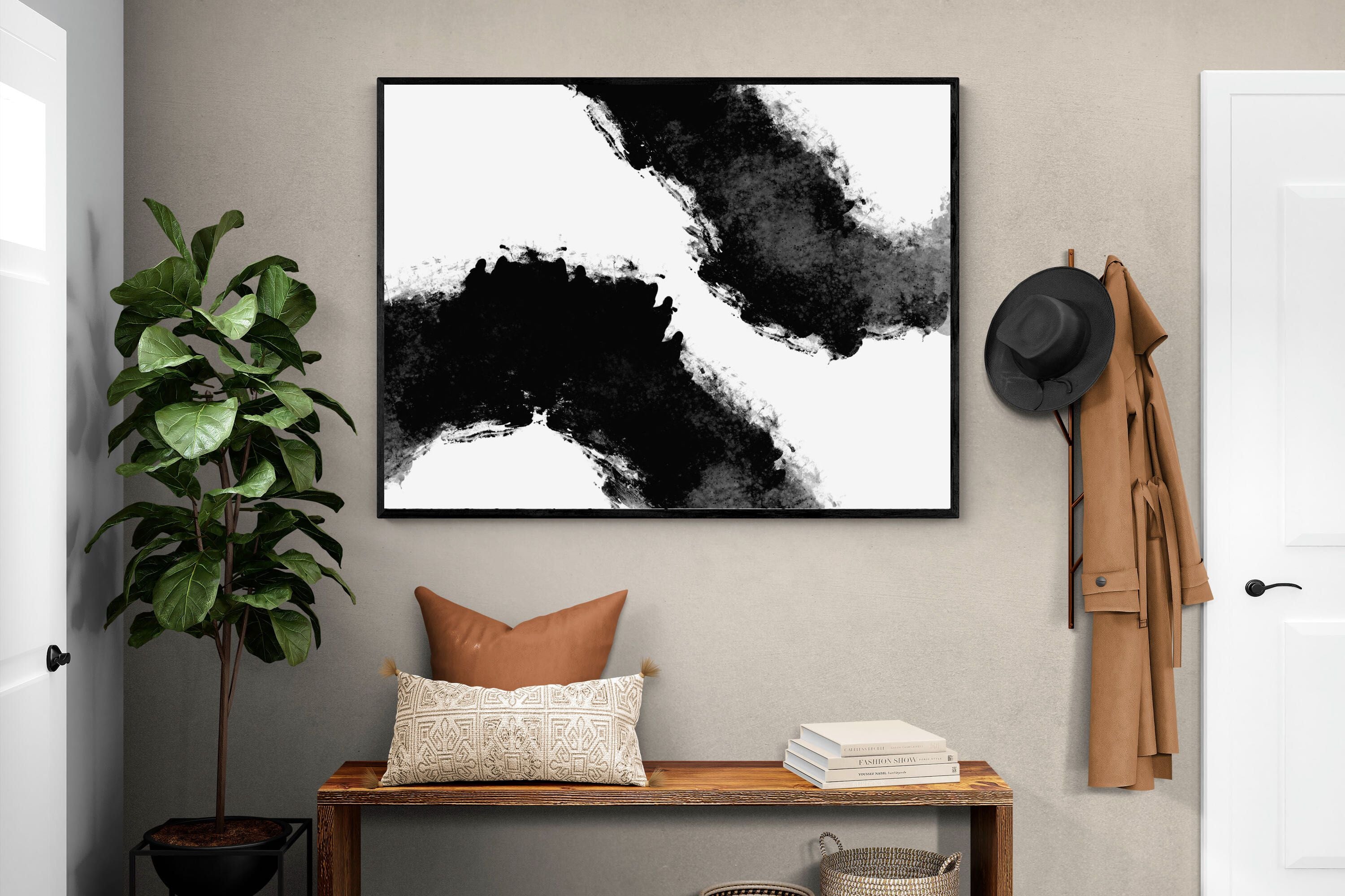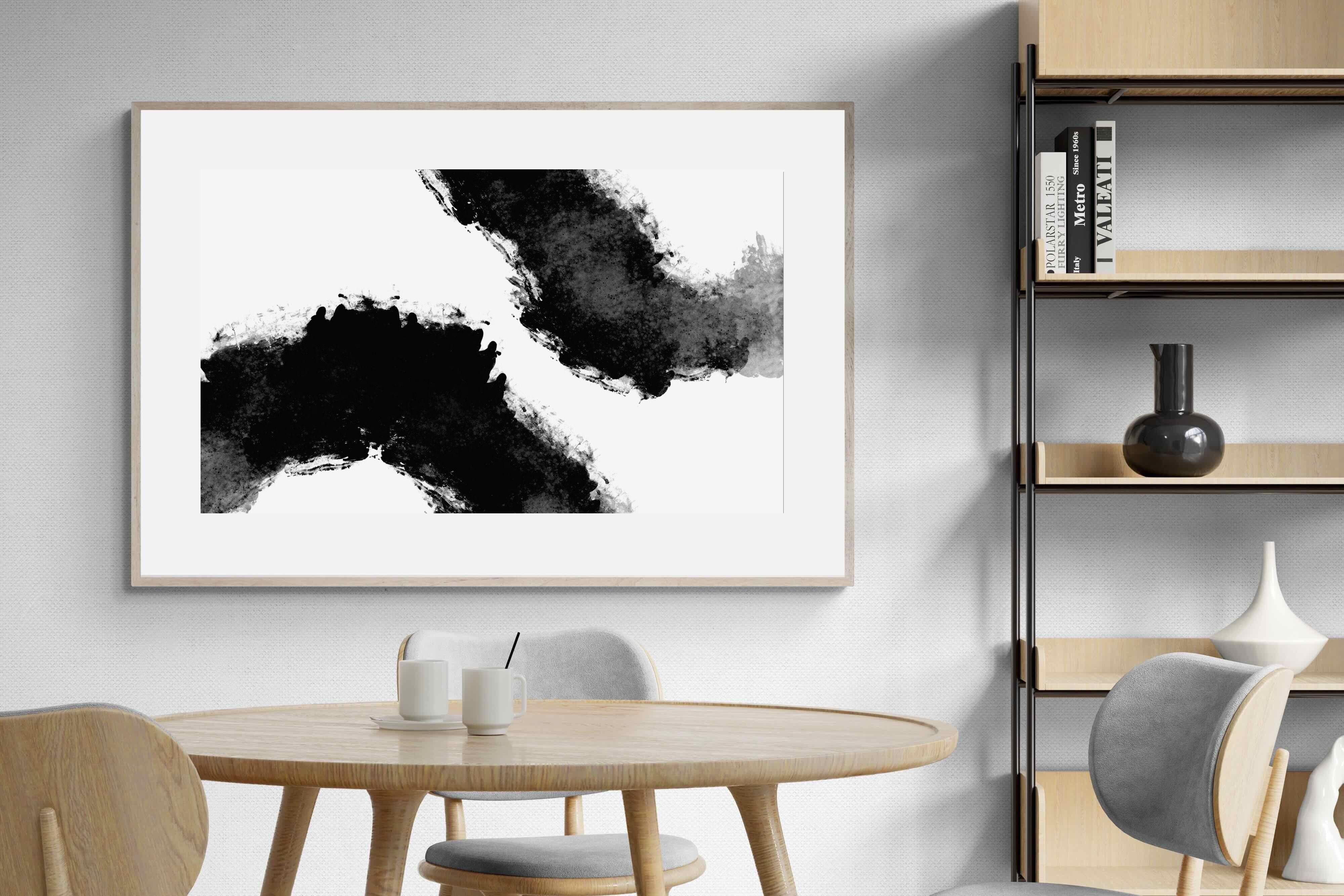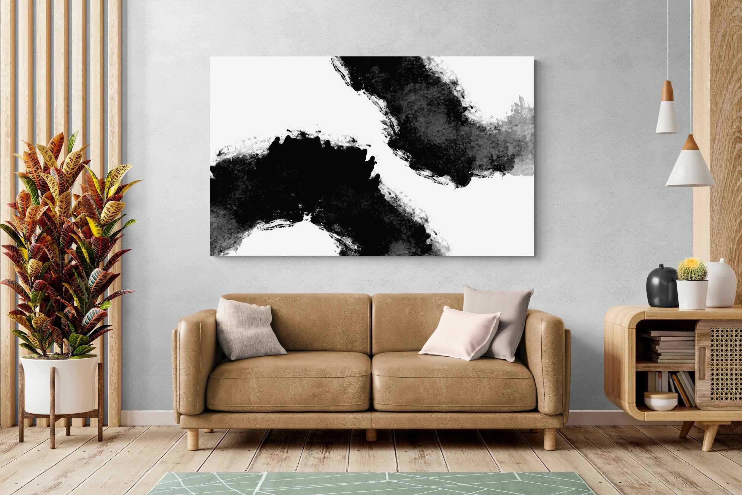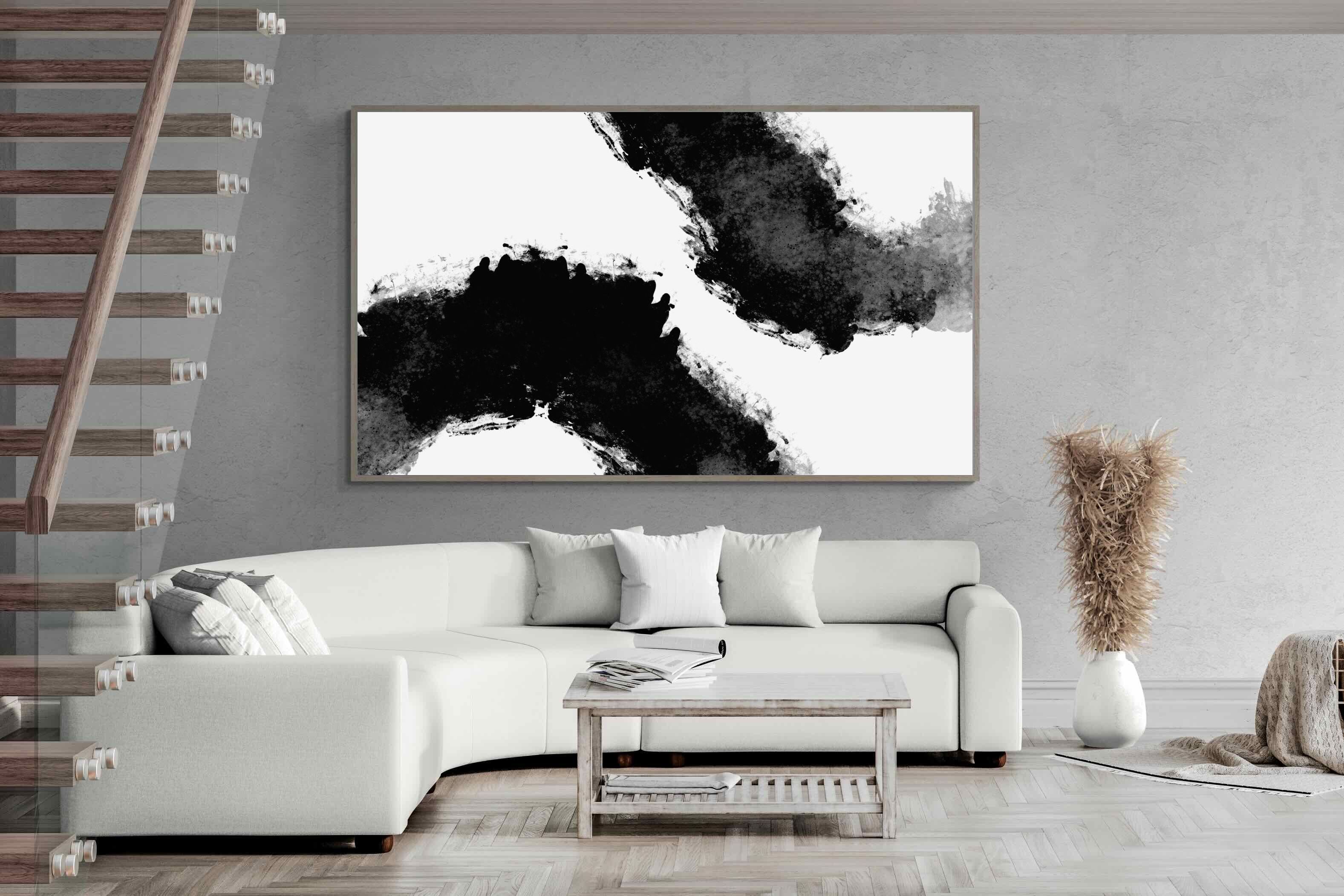 Inkfall is a bold monochrome abstract defined by dramatic black ink textures against a crisp white background. The raw contrast and organic edges give the piece a strong contemporary presence. Ideal for modern, industrial or minimalist interiors, it works well as a statement artwork in living rooms, offices or galleries where clean lines and impact matter.