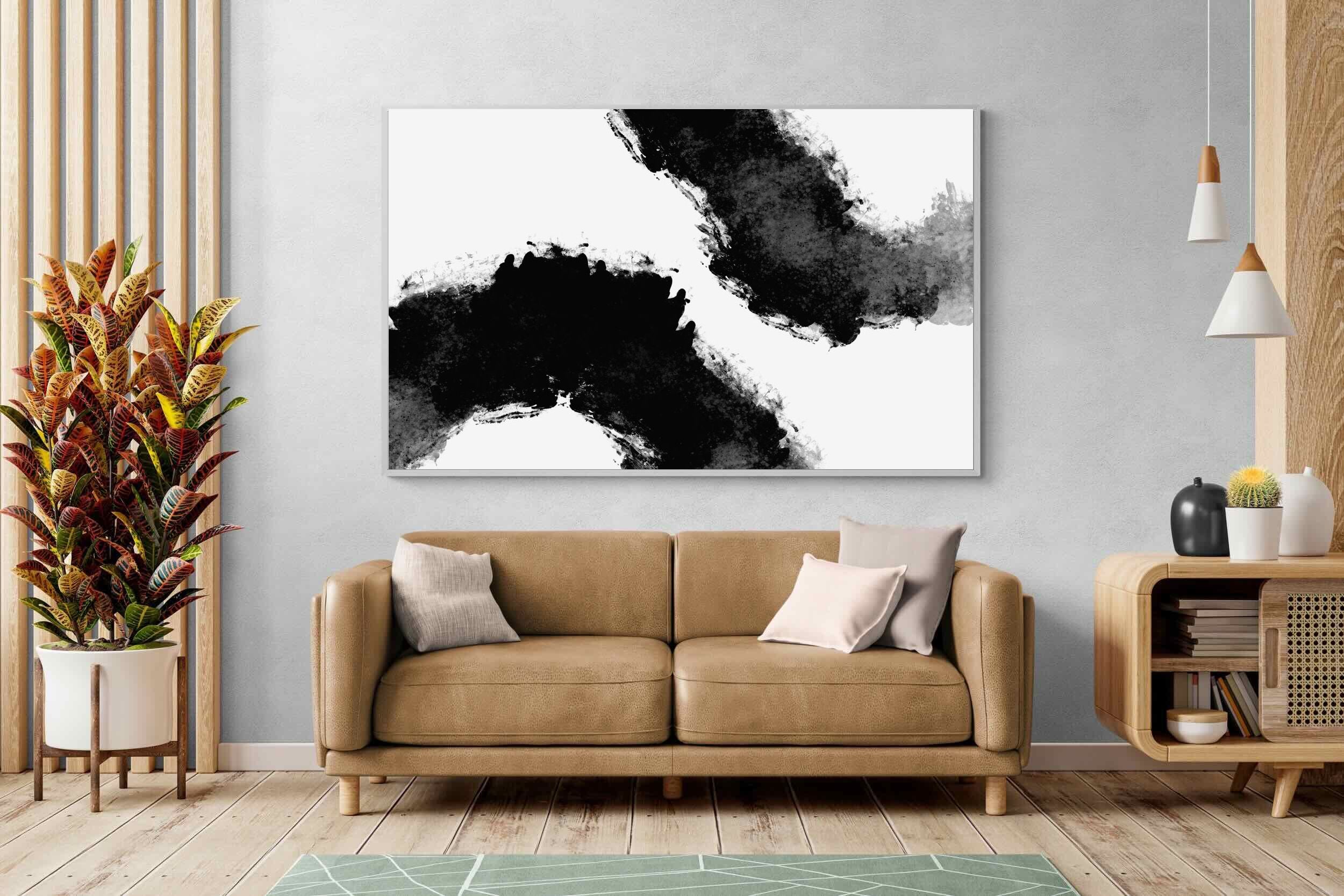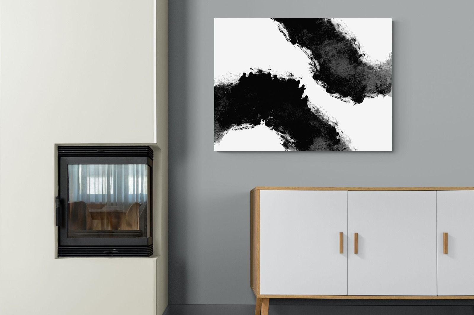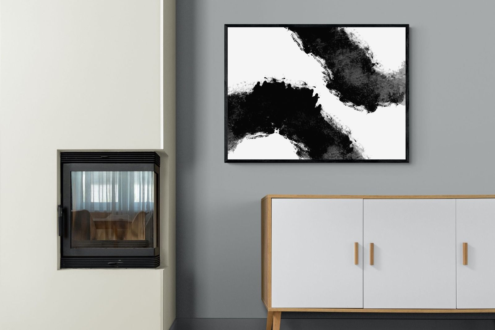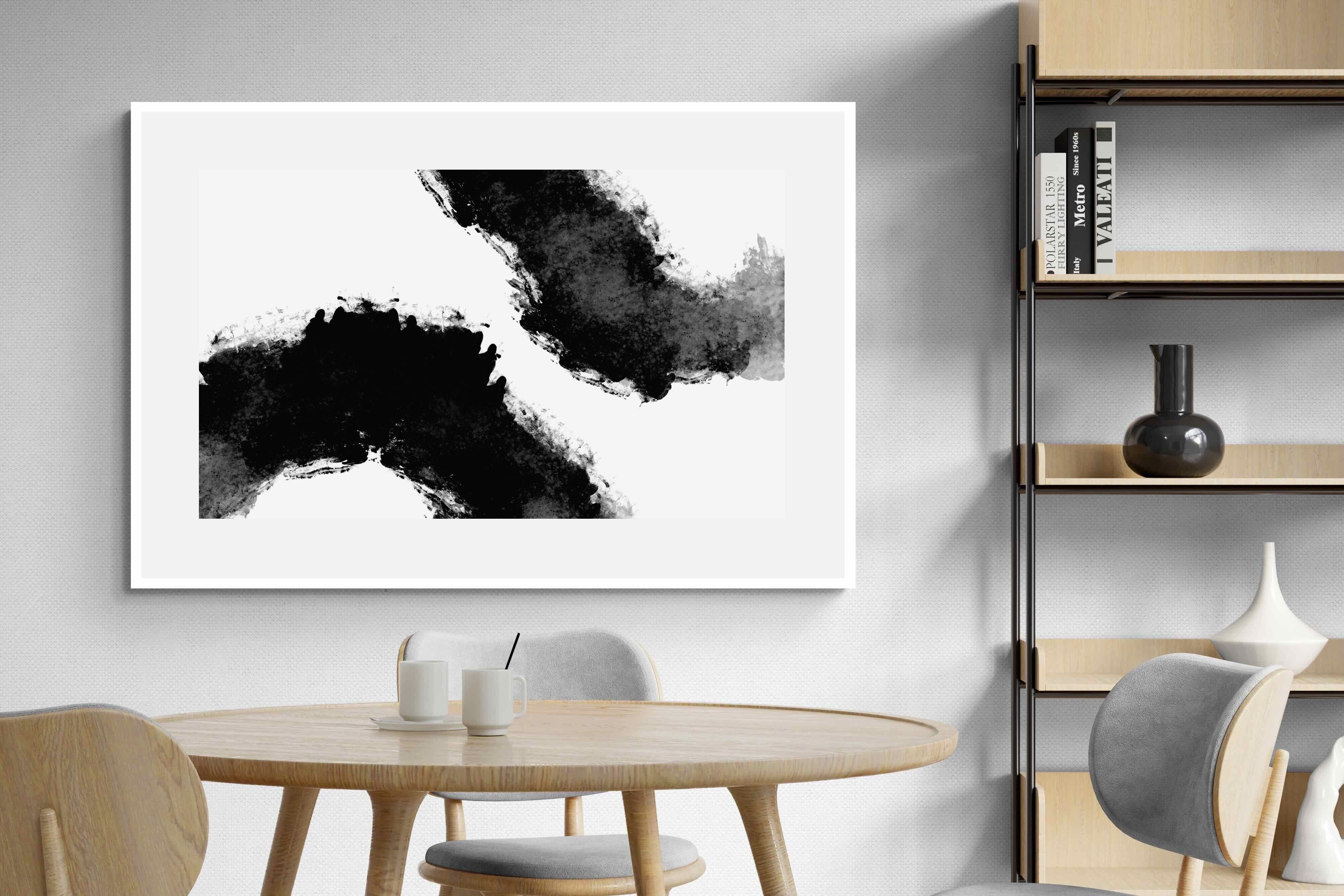 Inkfall is a bold monochrome abstract defined by dramatic black ink textures against a crisp white background. The raw contrast and organic edges give the piece a strong contemporary presence. Ideal for modern, industrial or minimalist interiors, it works well as a statement artwork in living rooms, offices or galleries where clean lines and impact matter.