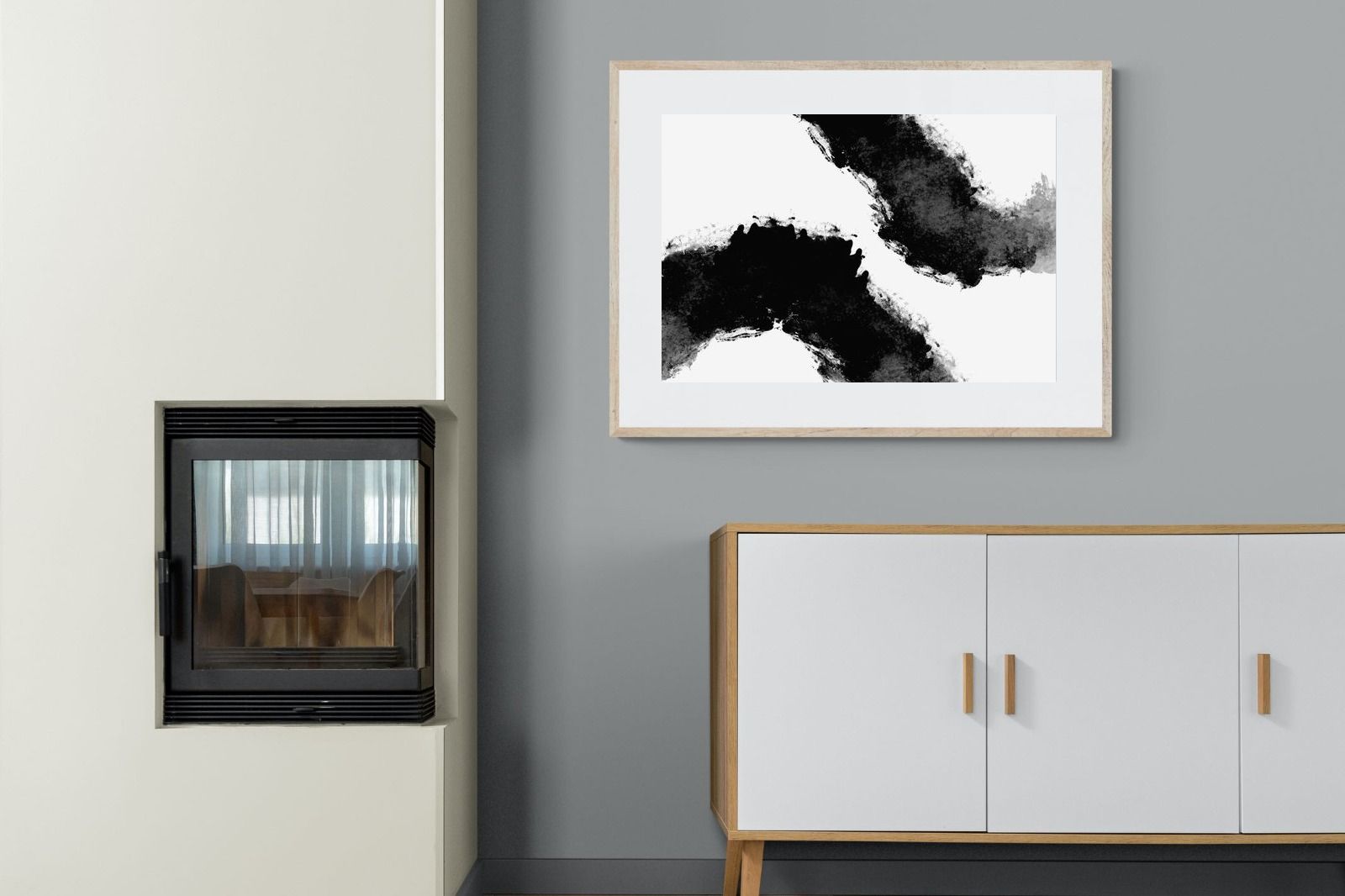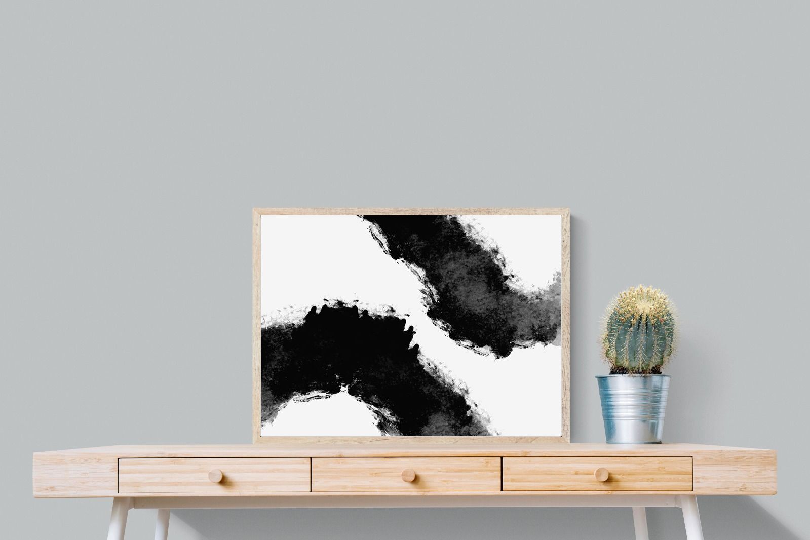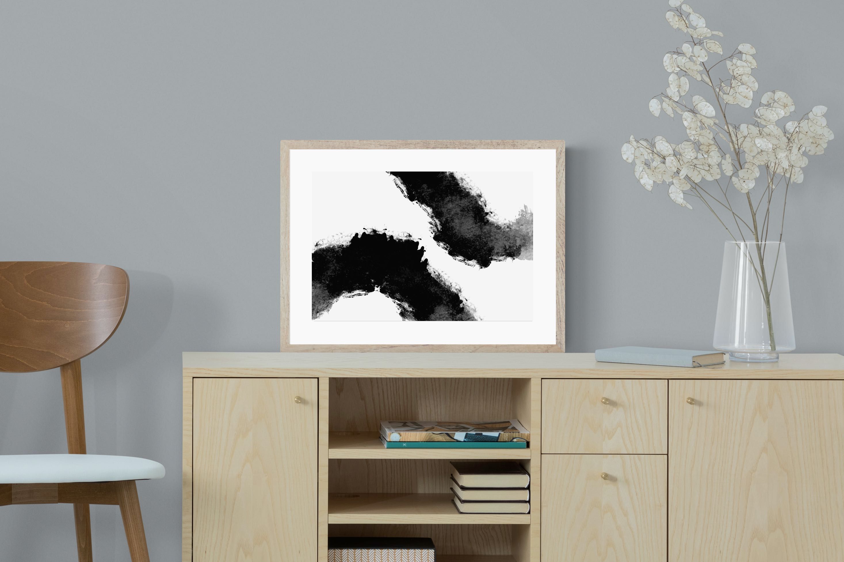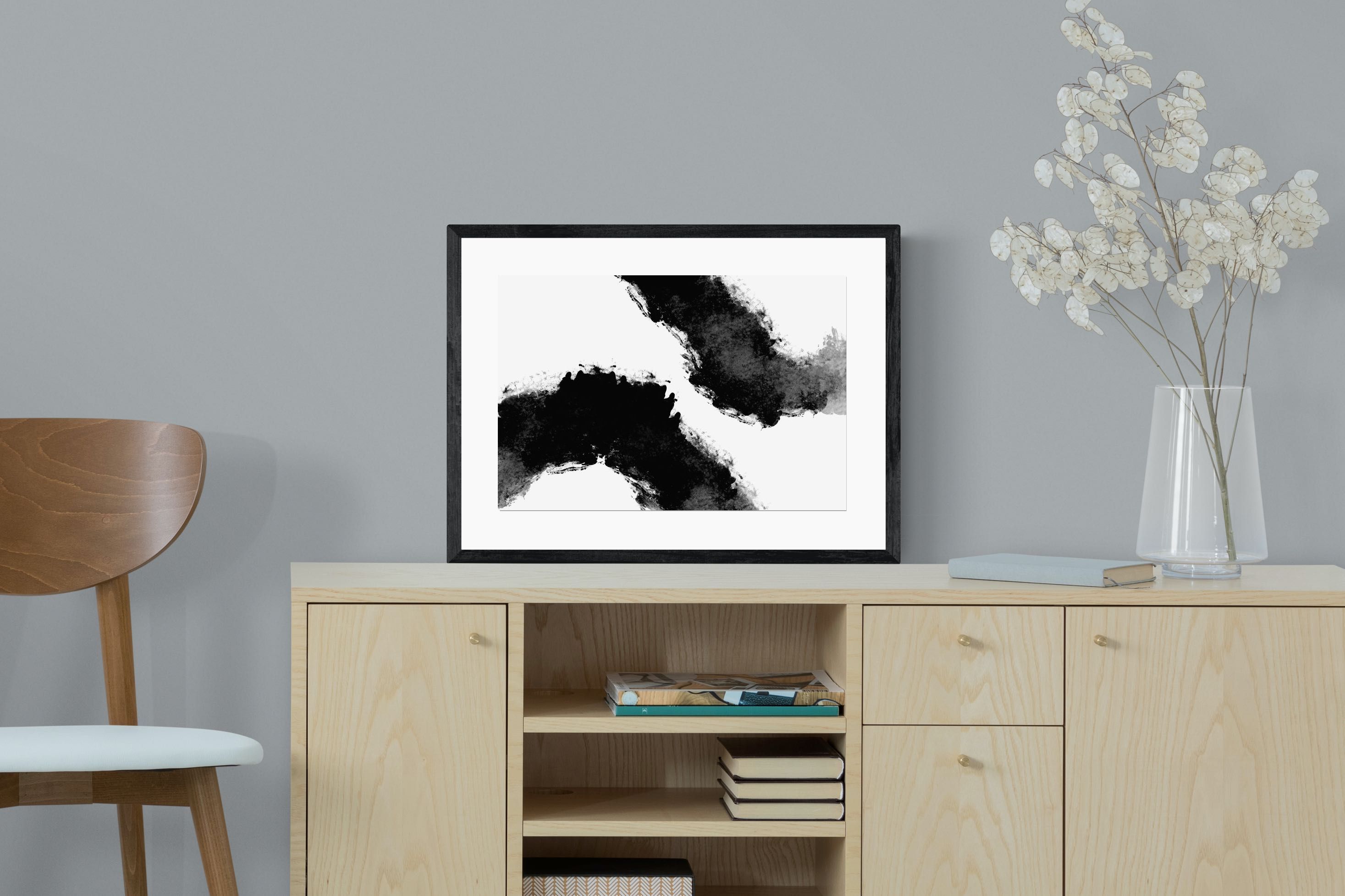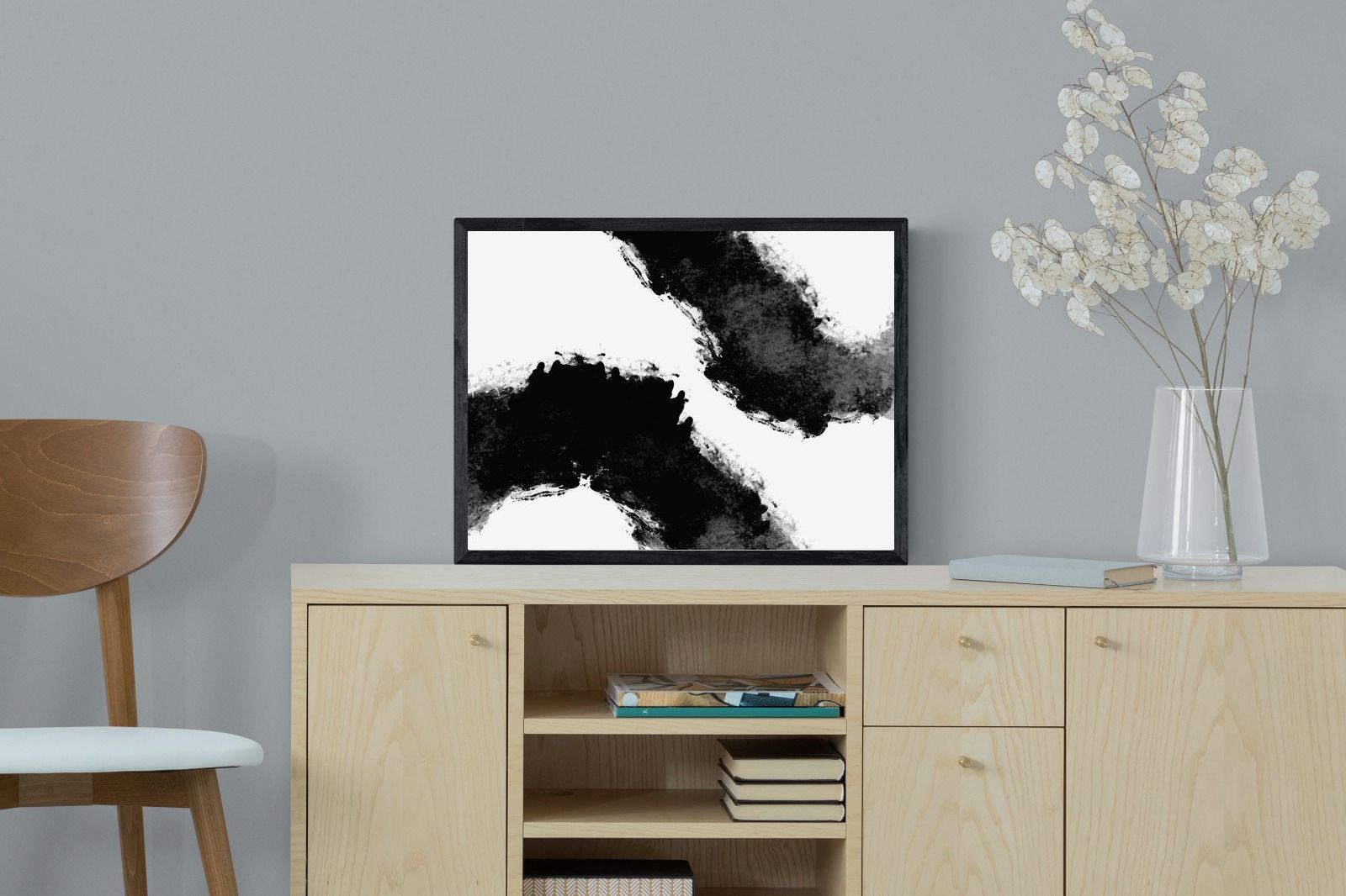 Inkfall is a bold monochrome abstract defined by dramatic black ink textures against a crisp white background. The raw contrast and organic edges give the piece a strong contemporary presence. Ideal for modern, industrial or minimalist interiors, it works well as a statement artwork in living rooms, offices or galleries where clean lines and impact matter.