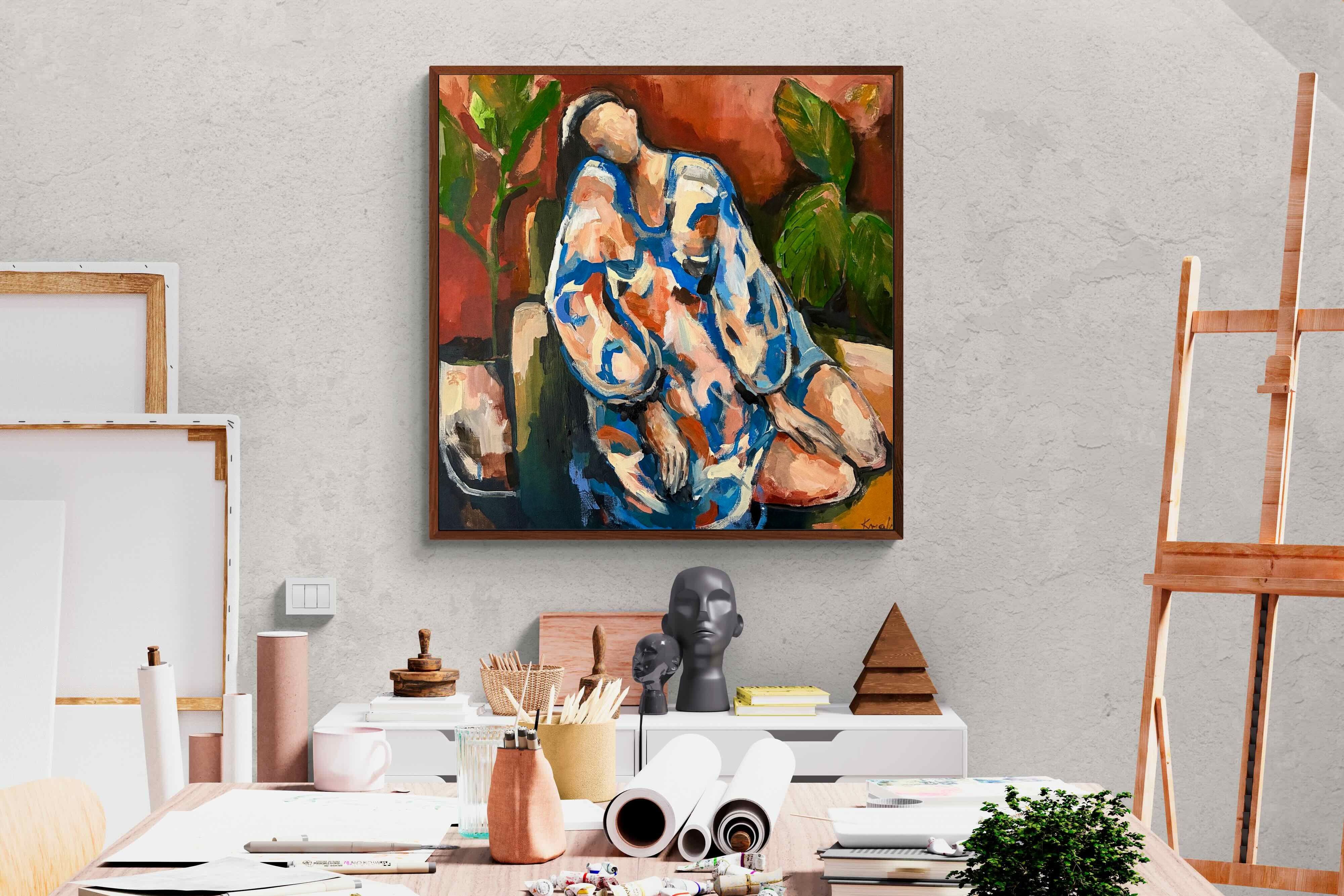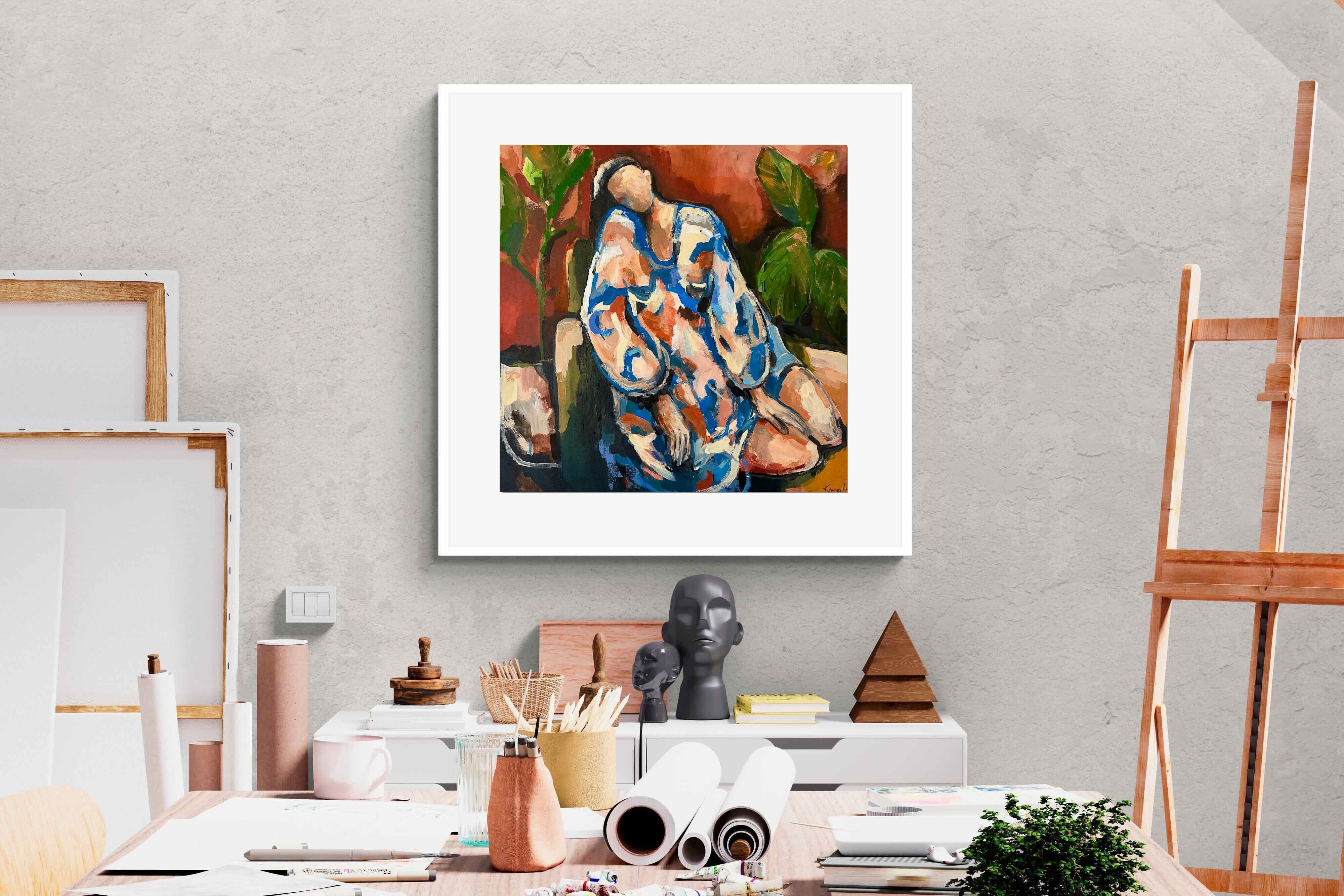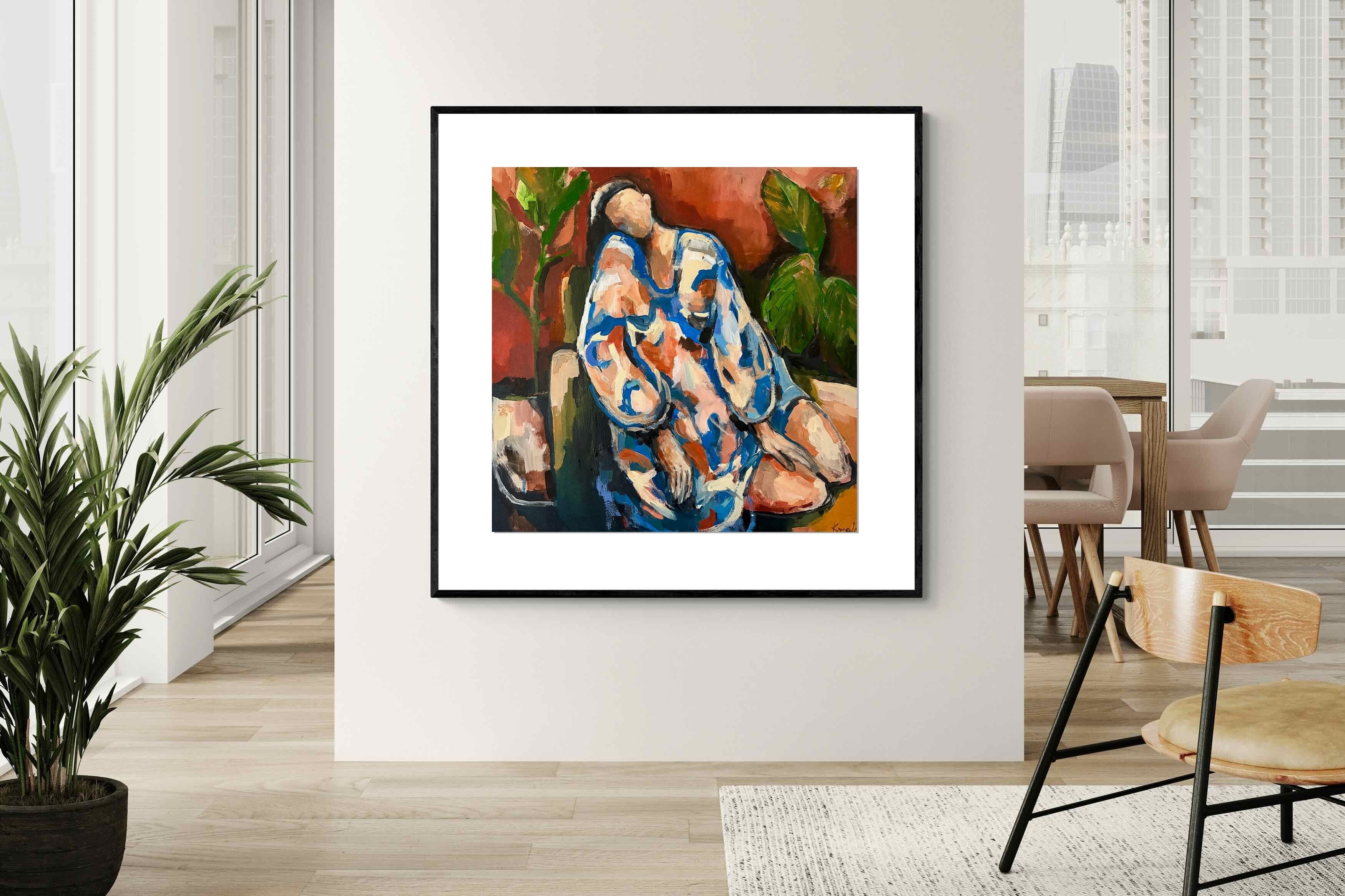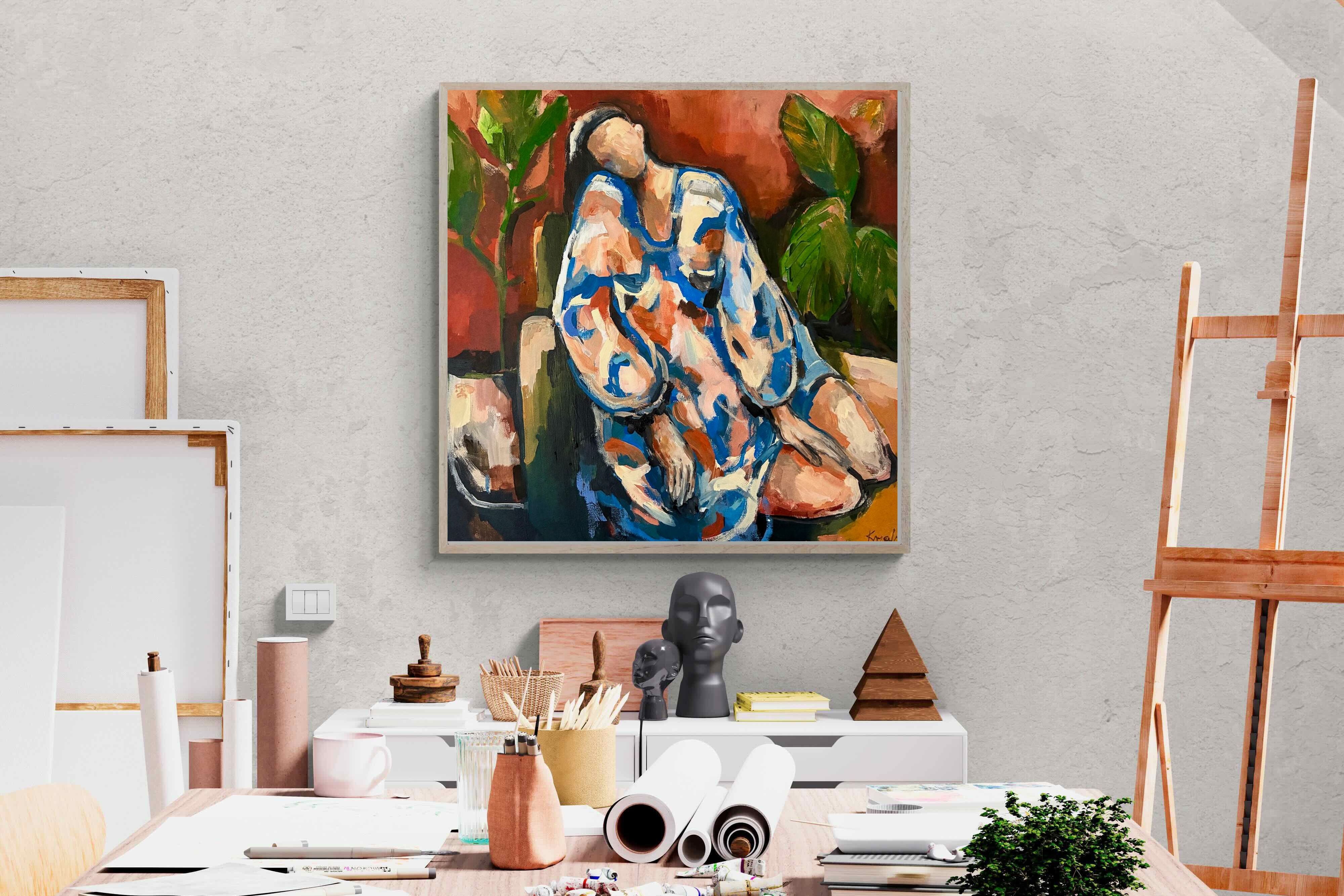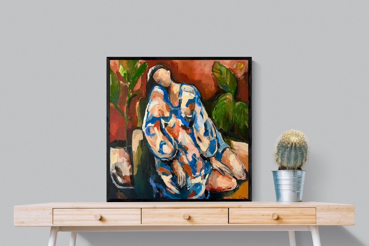 This contemporary figurative piece captures a moment of stillness through layered brushwork and expressive colour. The abstracted figure, set against warm earthy tones, conveys introspection and calm while maintaining artistic energy. Ideal for modern interiors, it works beautifully in lounges, bedrooms or creative spaces, adding depth and emotional nuance without overpowering the room’s aesthetic.