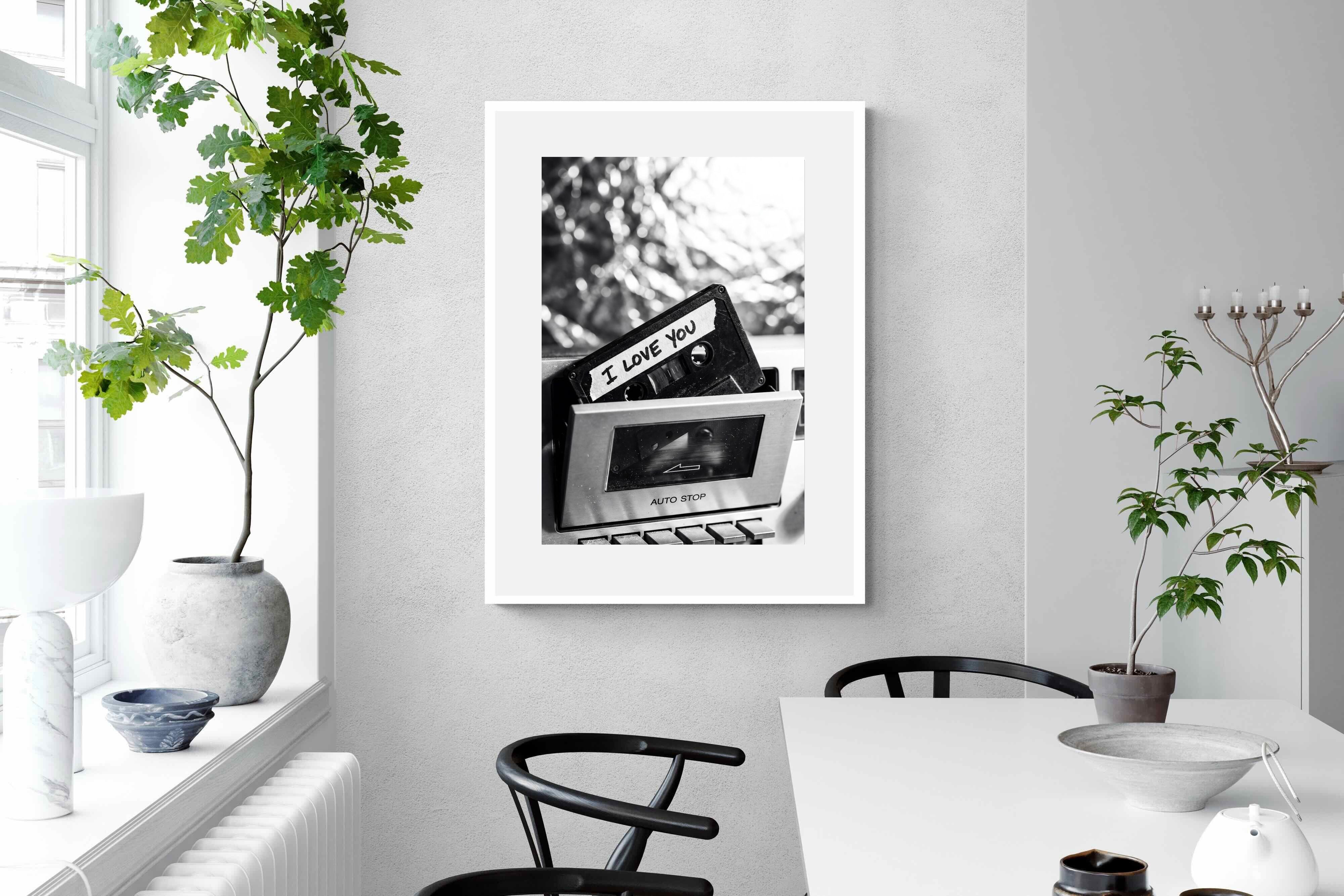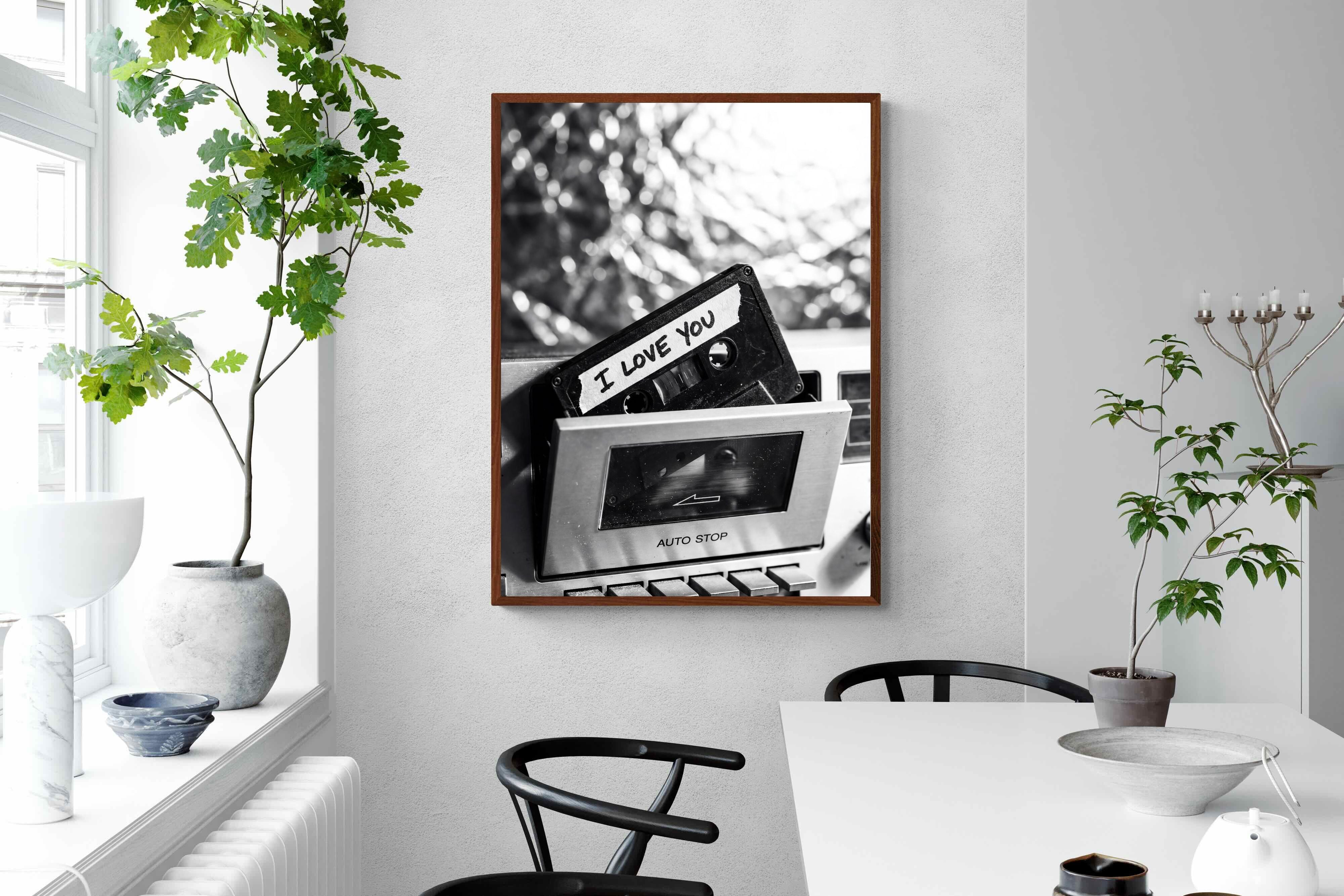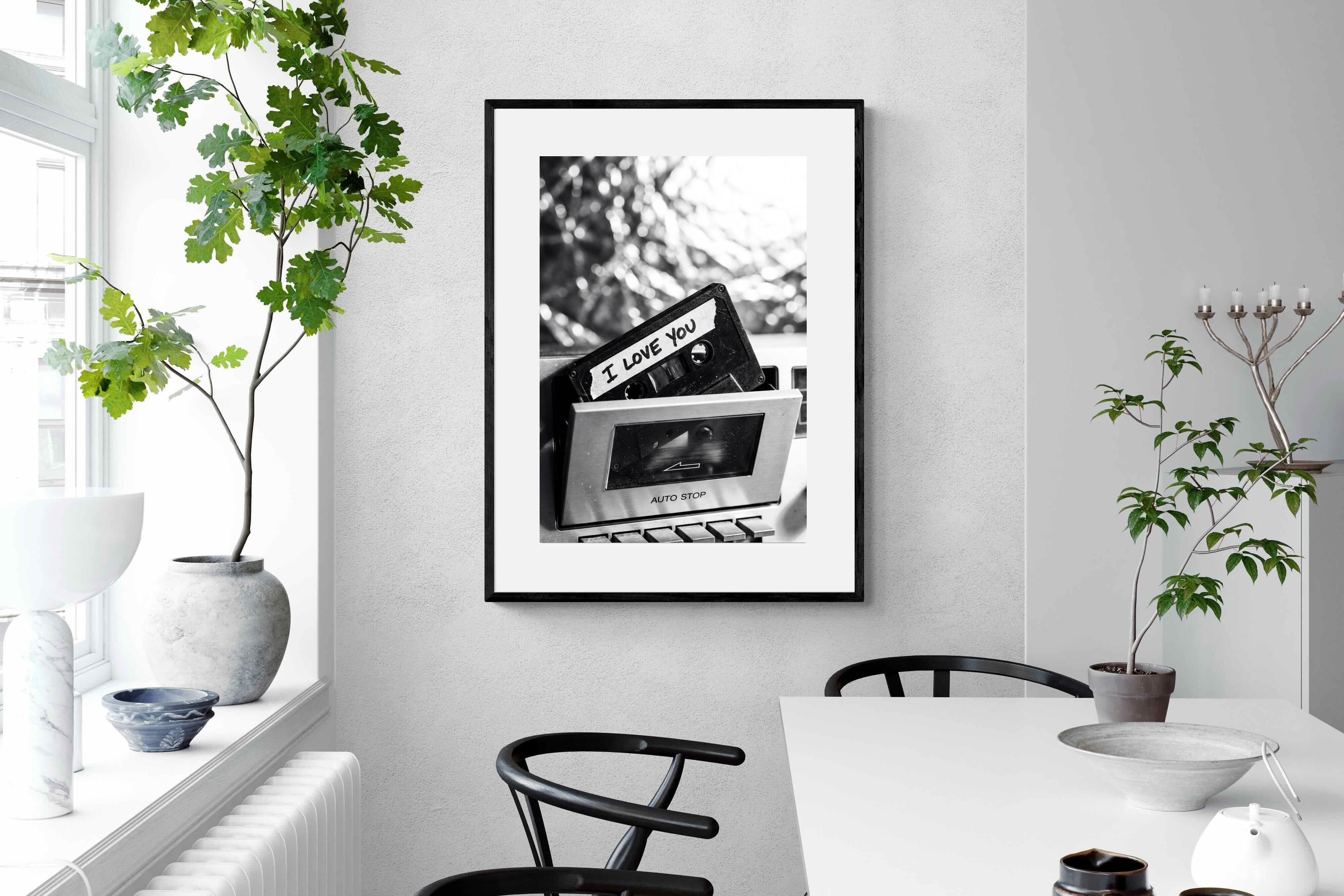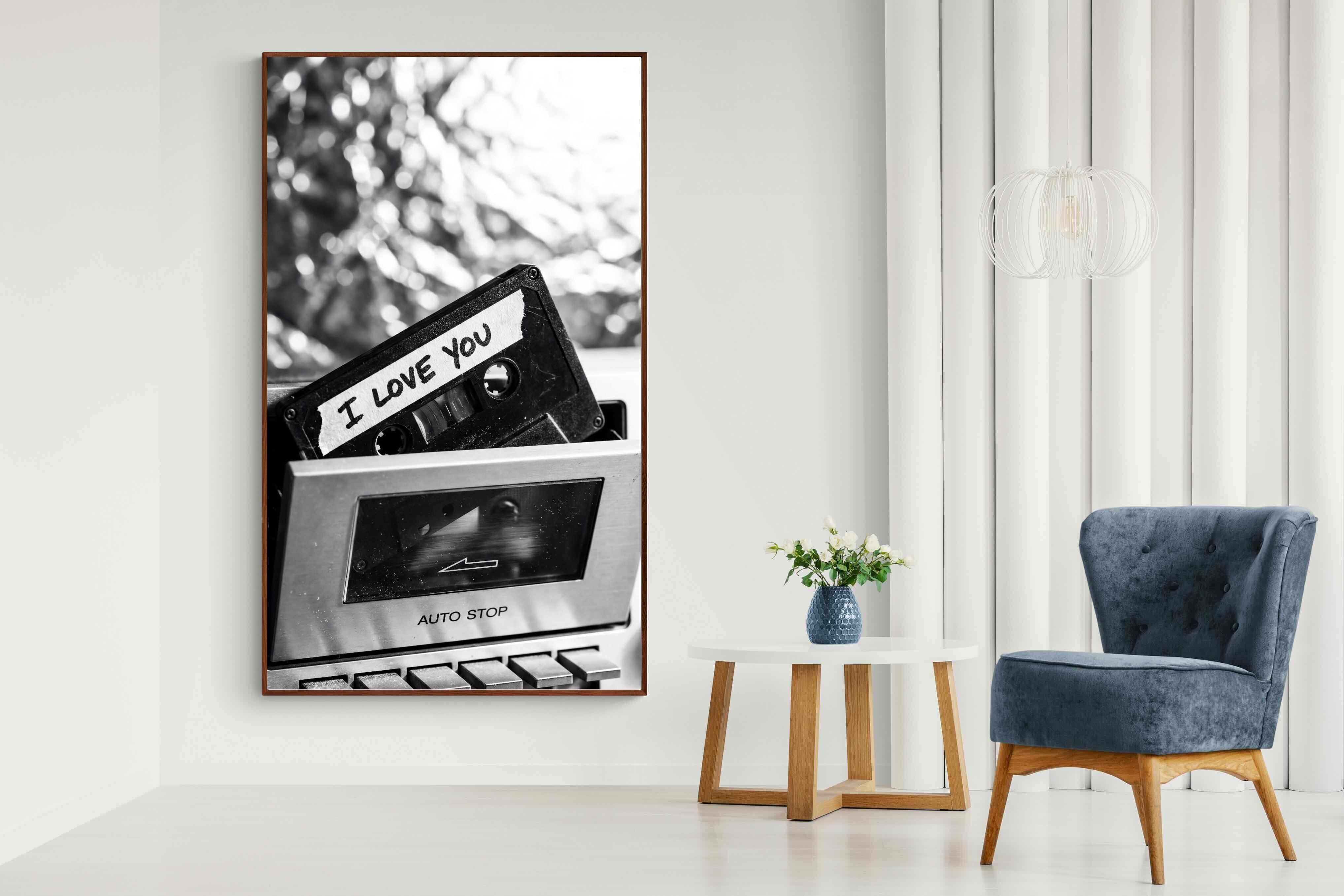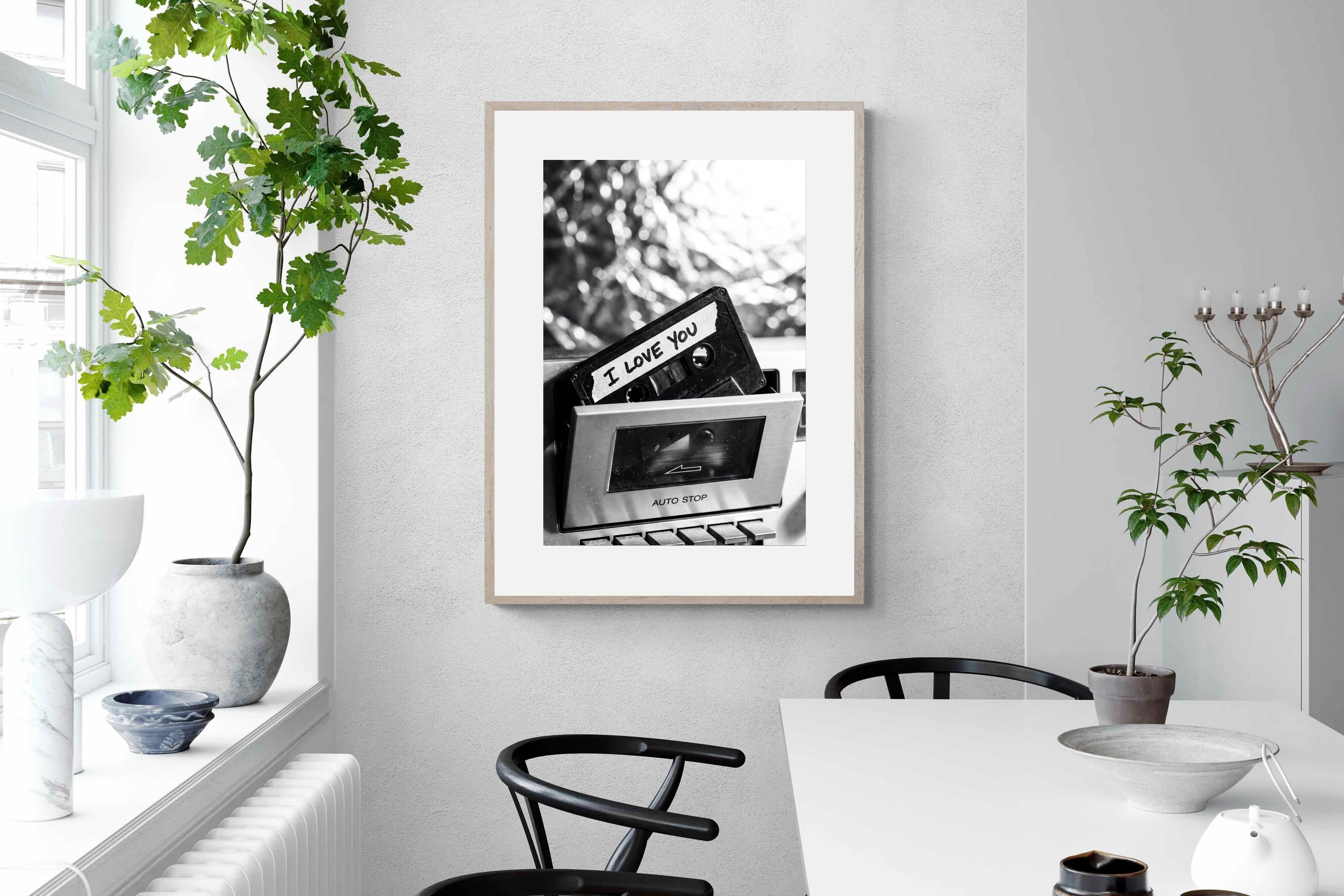 A nostalgic black-and-white photograph of a cassette tape labelled “I Love You” sliding into a retro tape deck. The grainy textures and soft highlights capture the tactile charm of analogue music culture, recalling an era when playlists were handmade and deeply personal. Perfect for music lovers and retro enthusiasts, the image carries both romance and nostalgia. It suits modern, industrial and eclectic interiors where vintage technology and storytelling photography bring personality to the space.