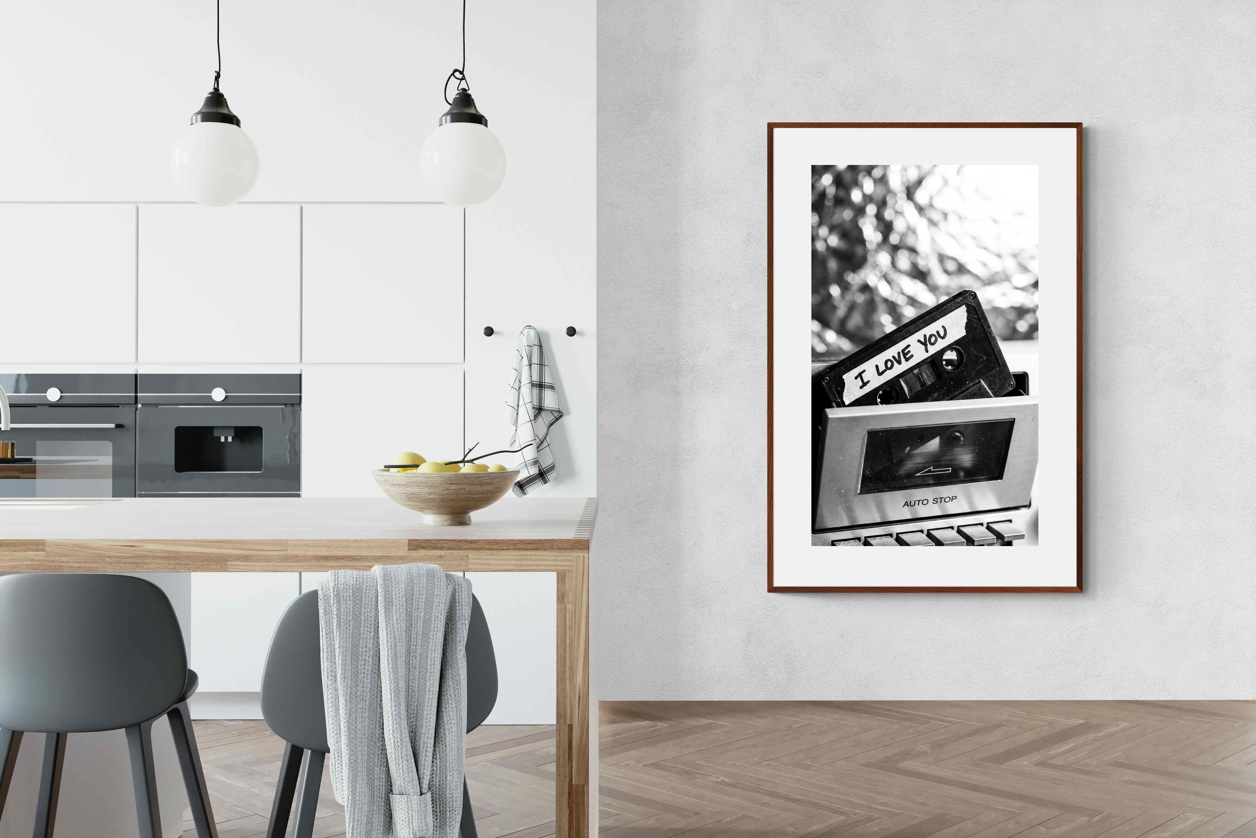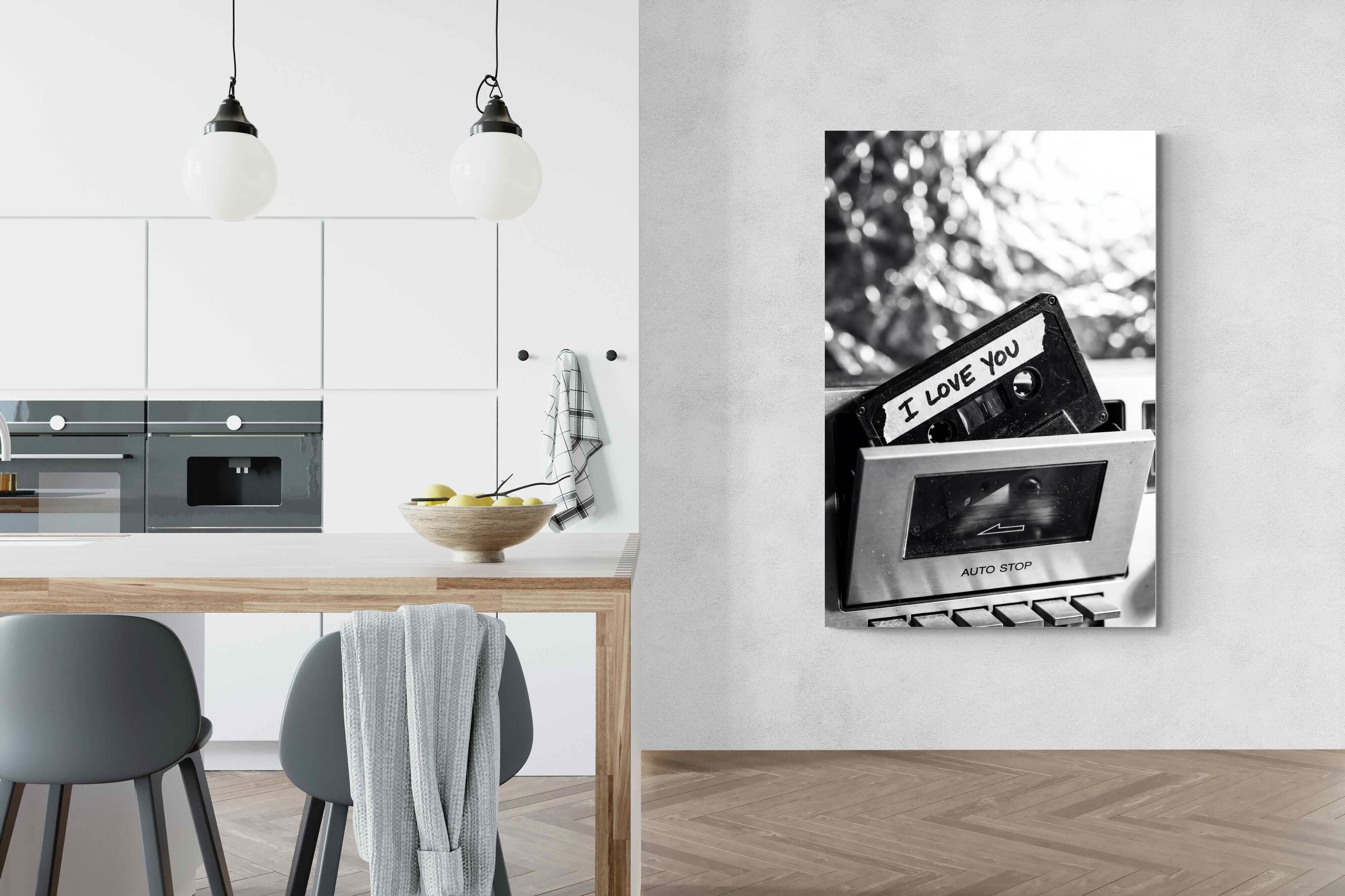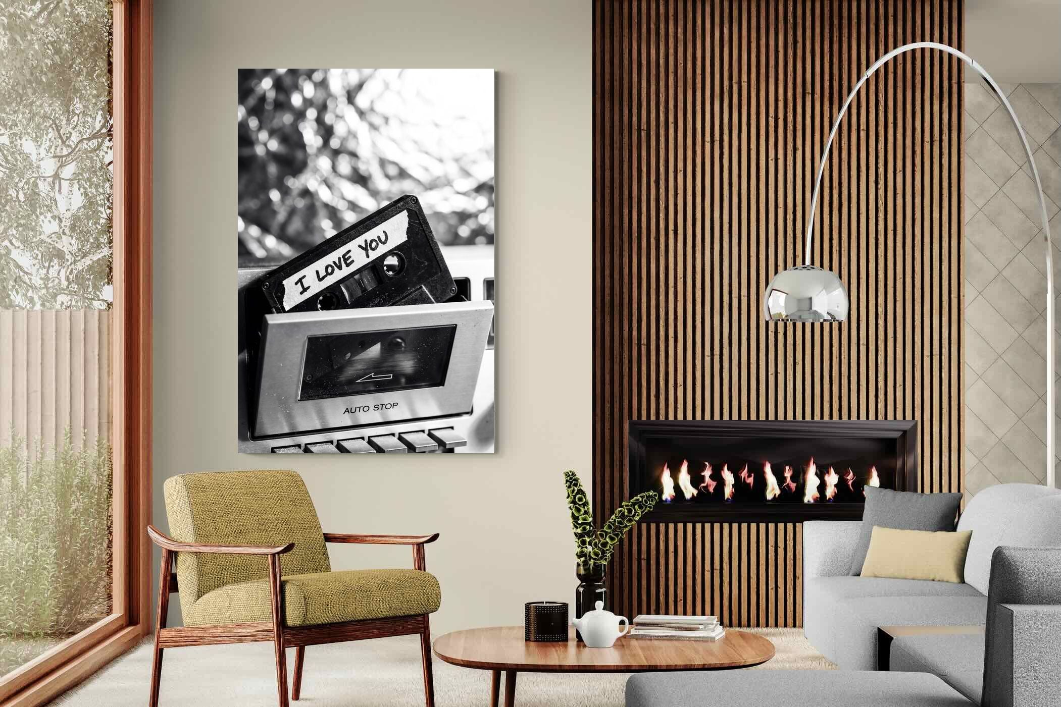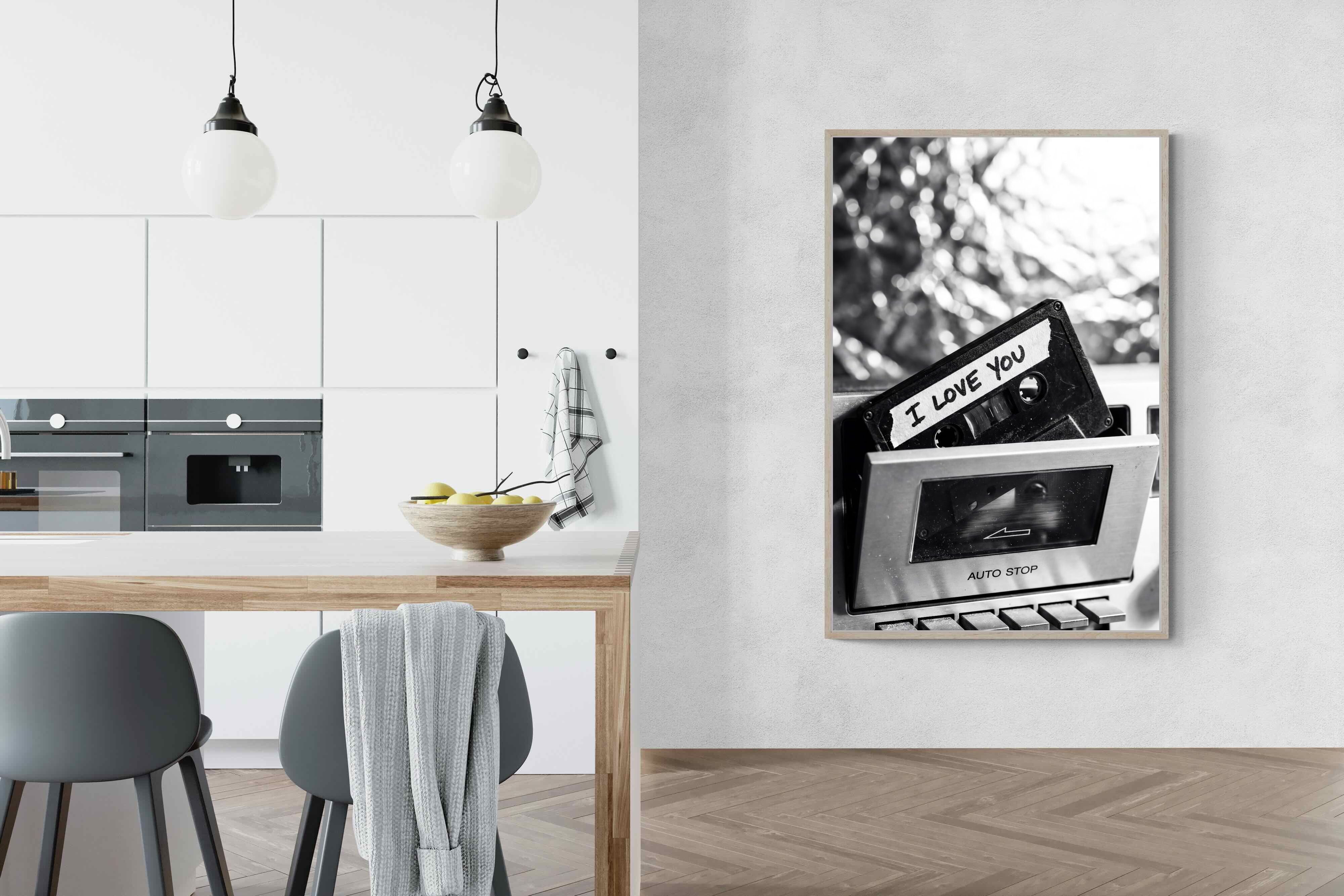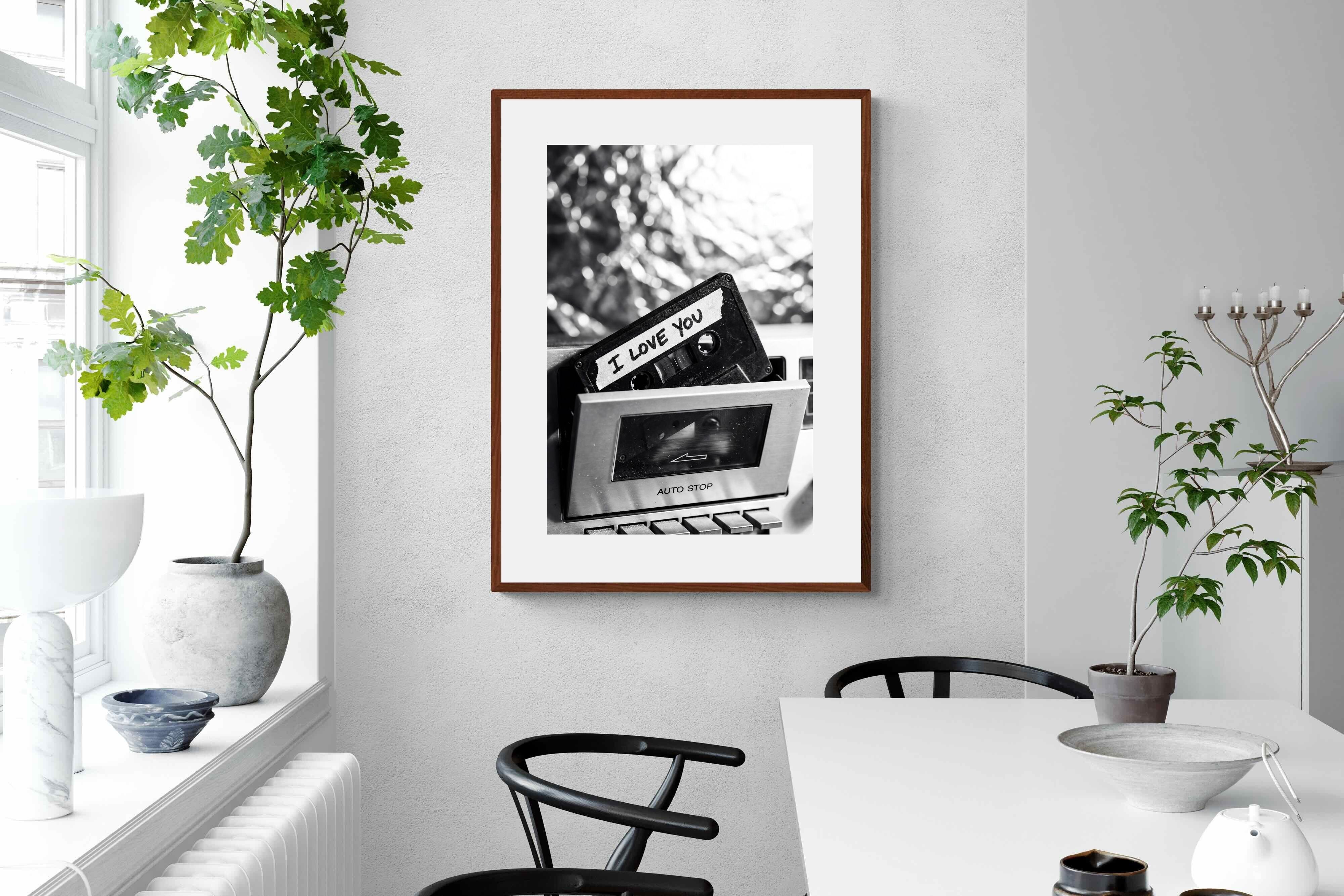 A nostalgic black-and-white photograph of a cassette tape labelled “I Love You” sliding into a retro tape deck. The grainy textures and soft highlights capture the tactile charm of analogue music culture, recalling an era when playlists were handmade and deeply personal. Perfect for music lovers and retro enthusiasts, the image carries both romance and nostalgia. It suits modern, industrial and eclectic interiors where vintage technology and storytelling photography bring personality to the space.