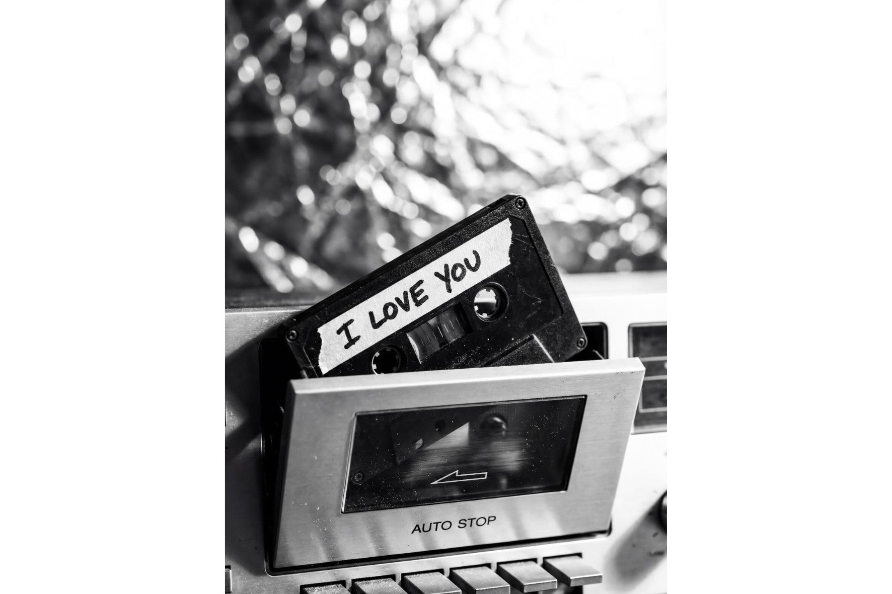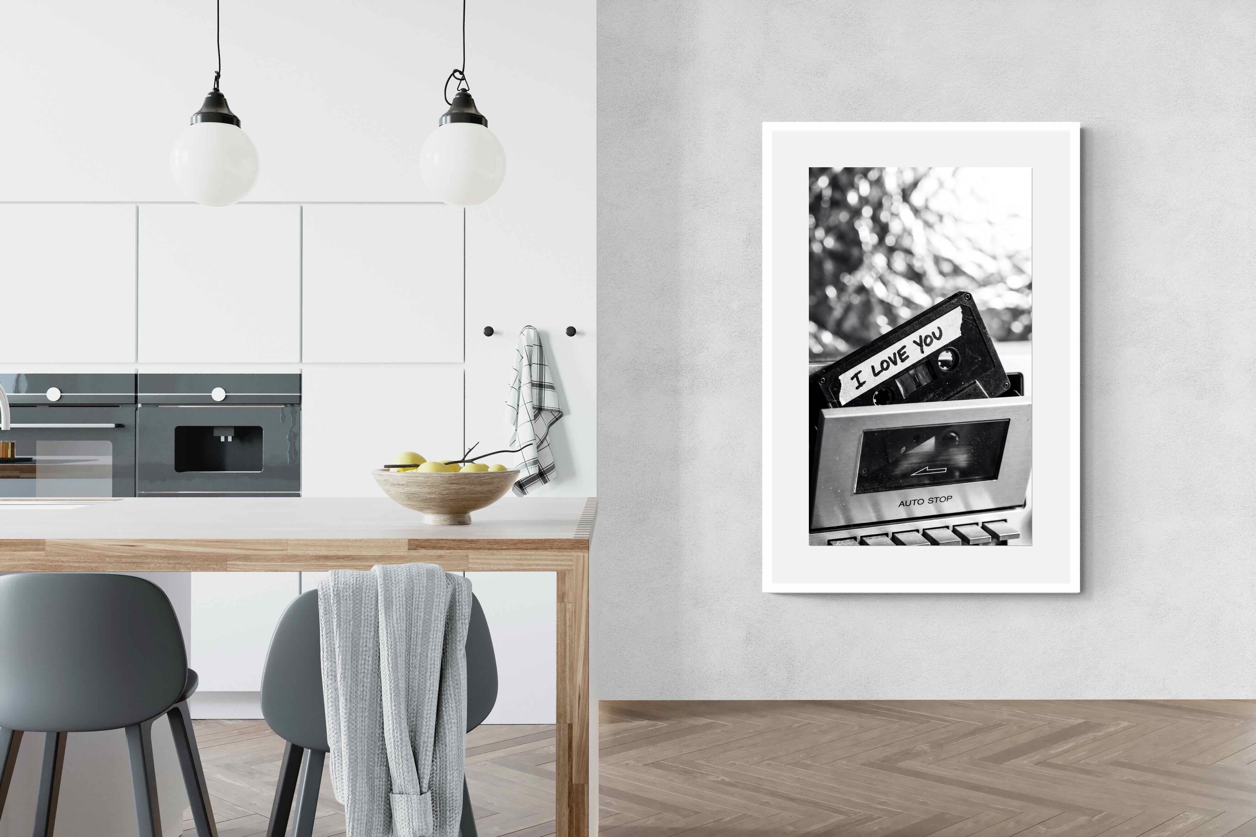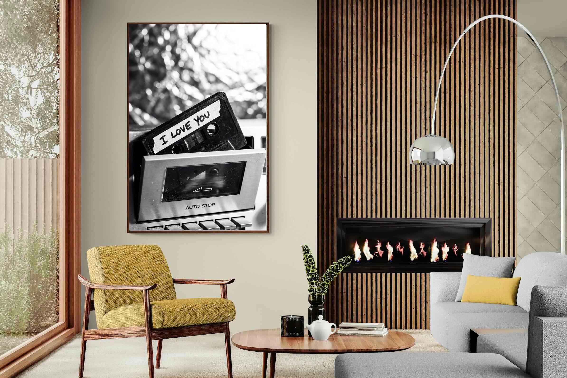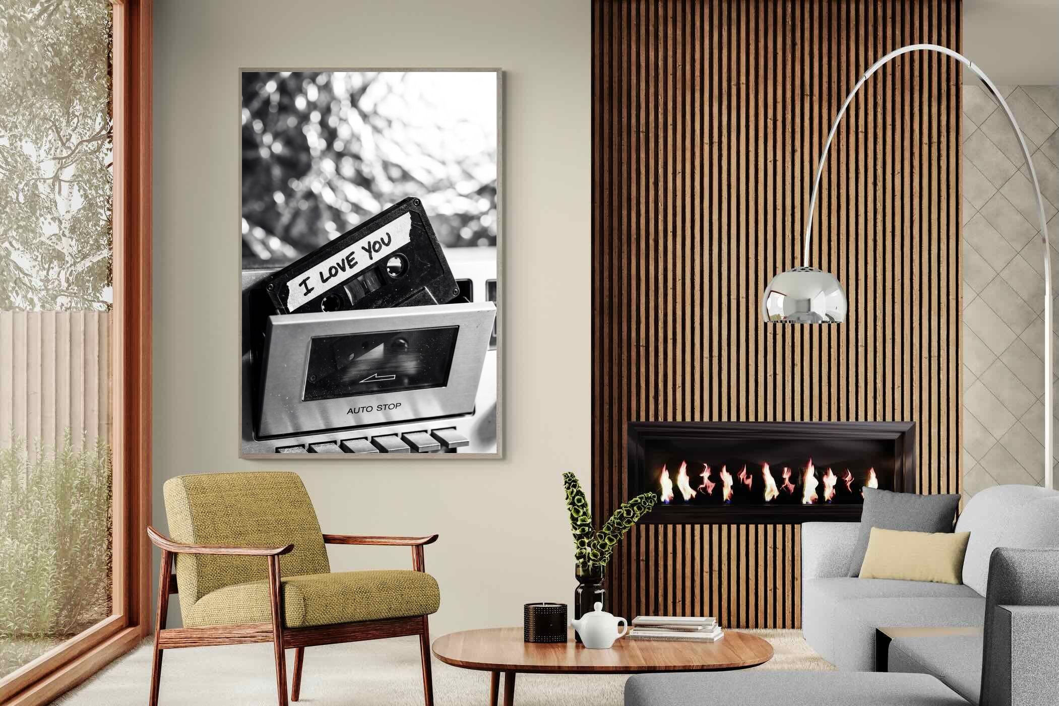 A nostalgic black-and-white photograph of a cassette tape labelled “I Love You” sliding into a retro tape deck. The grainy textures and soft highlights capture the tactile charm of analogue music culture, recalling an era when playlists were handmade and deeply personal. Perfect for music lovers and retro enthusiasts, the image carries both romance and nostalgia. It suits modern, industrial and eclectic interiors where vintage technology and storytelling photography bring personality to the space.