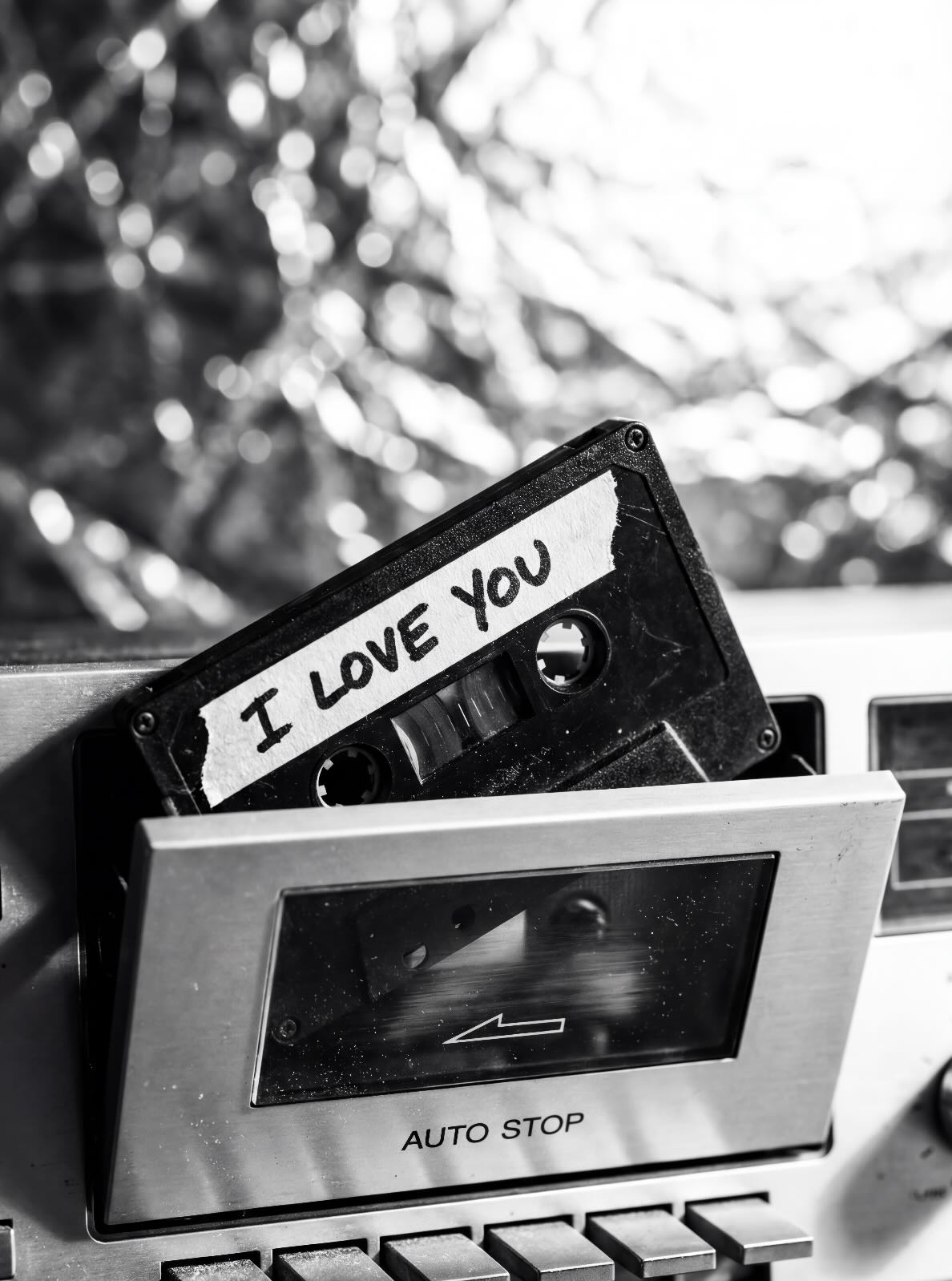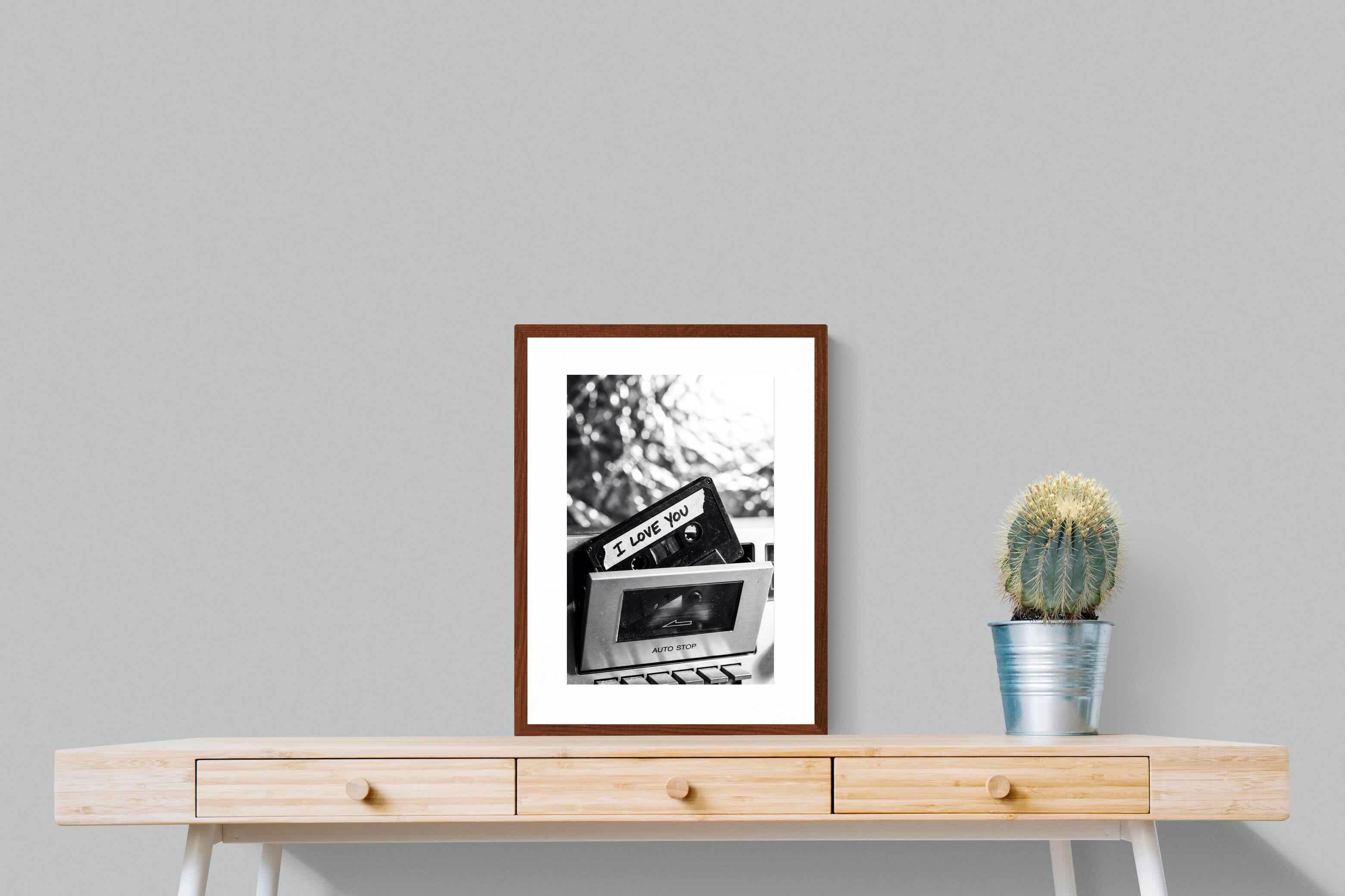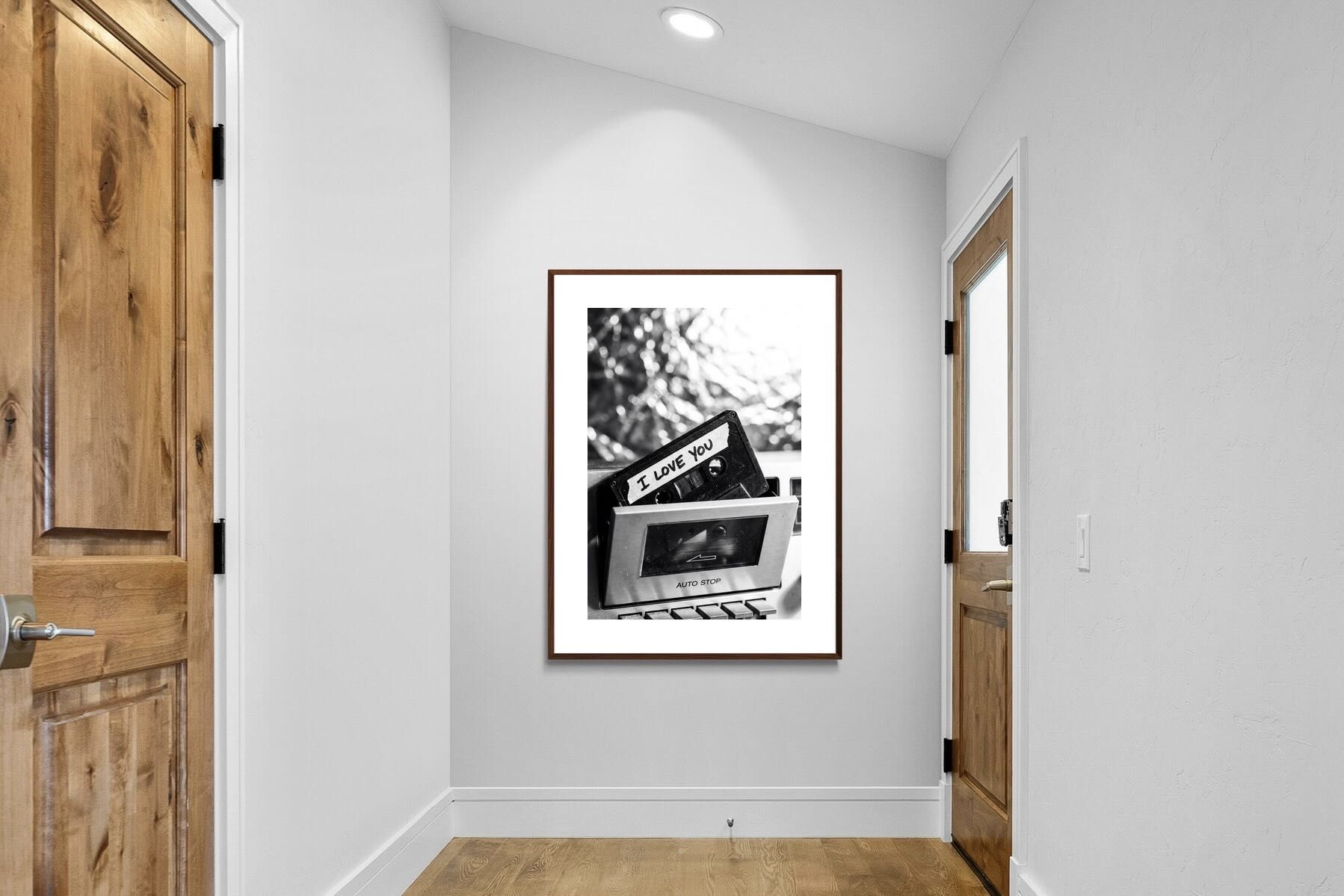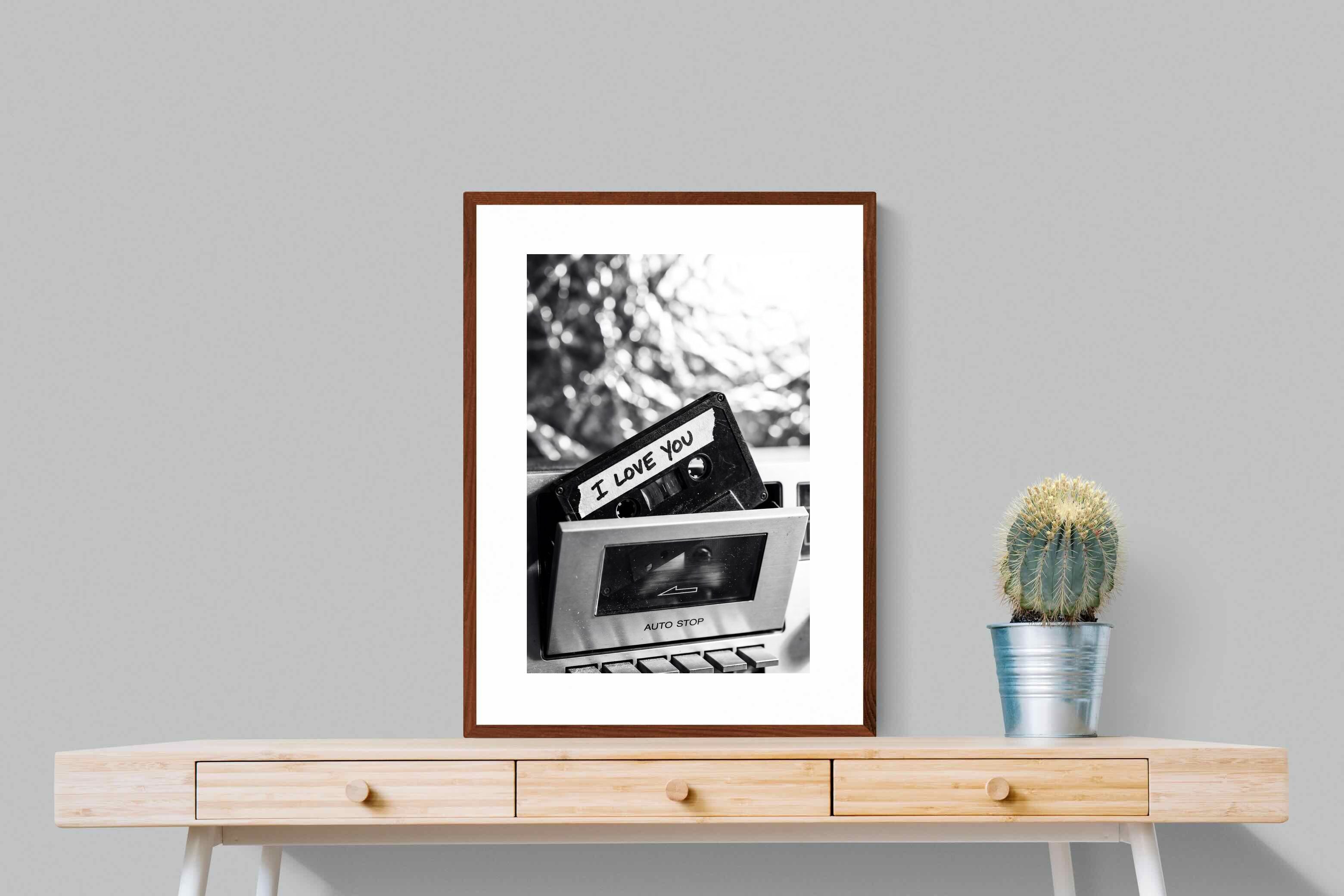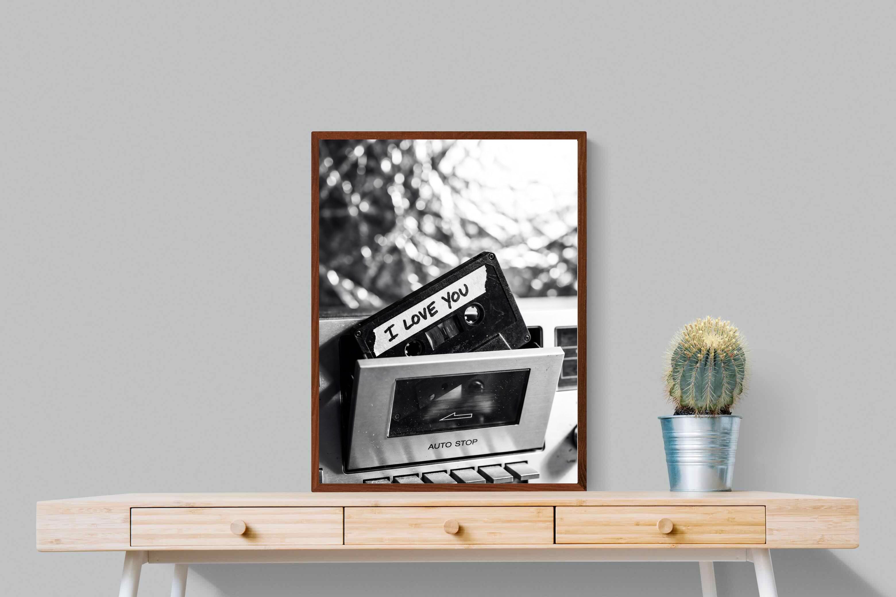 A nostalgic black-and-white photograph of a cassette tape labelled “I Love You” sliding into a retro tape deck. The grainy textures and soft highlights capture the tactile charm of analogue music culture, recalling an era when playlists were handmade and deeply personal. Perfect for music lovers and retro enthusiasts, the image carries both romance and nostalgia. It suits modern, industrial and eclectic interiors where vintage technology and storytelling photography bring personality to the space.
