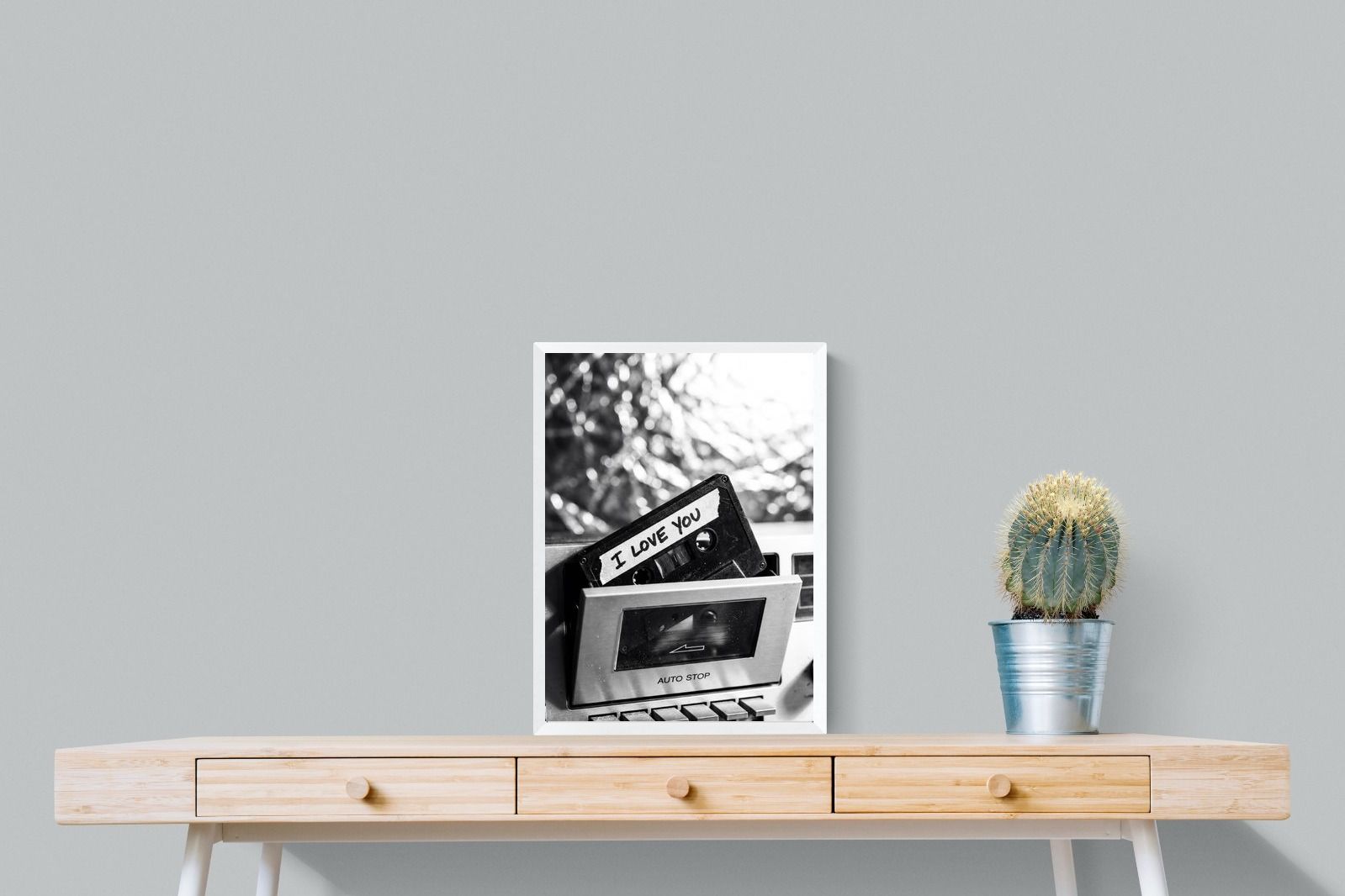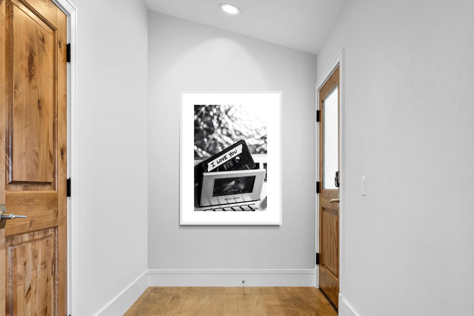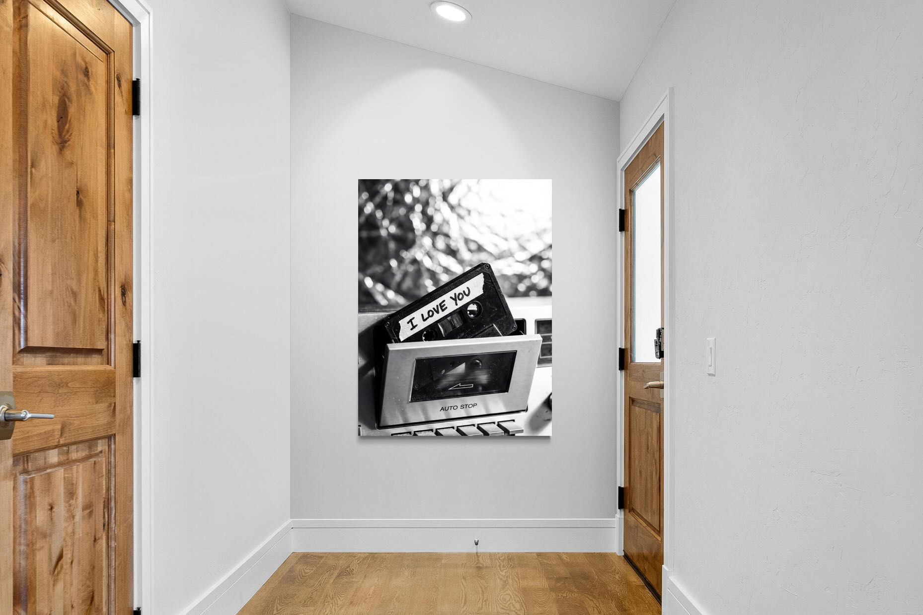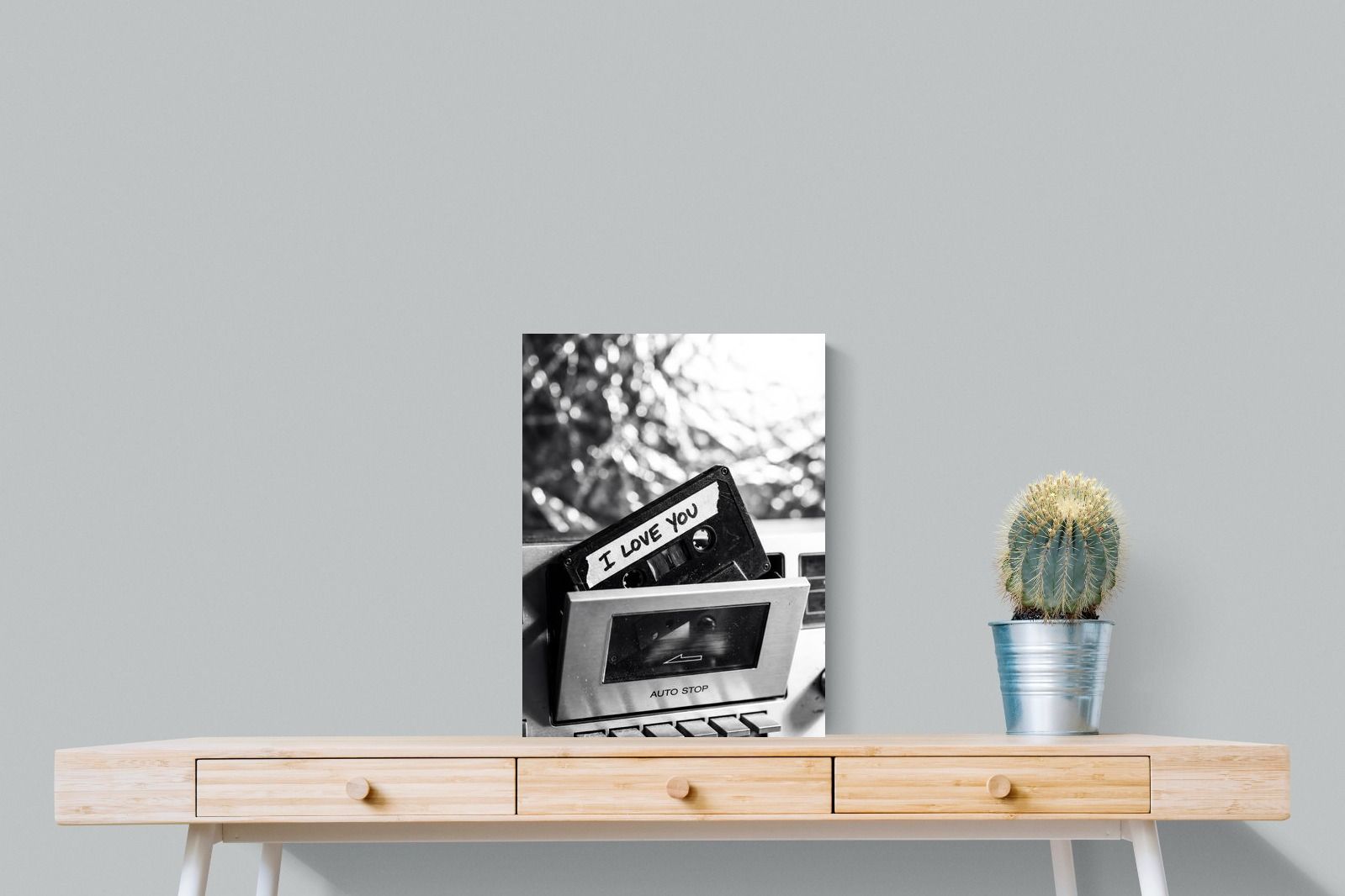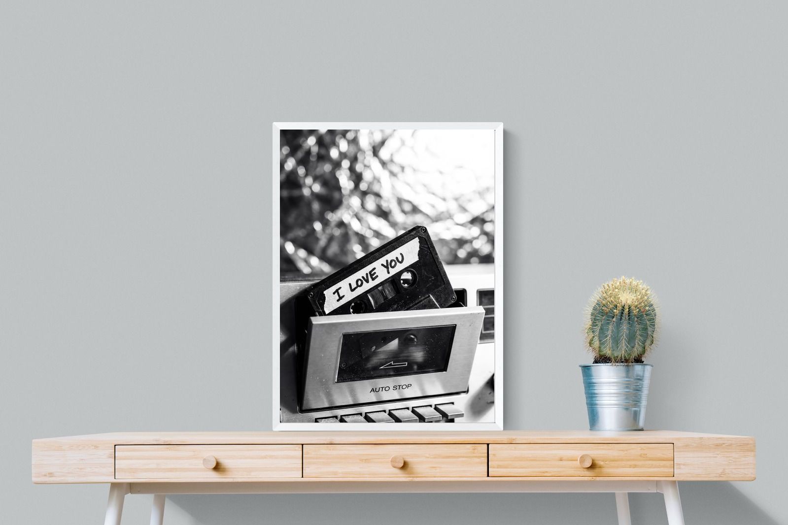A nostalgic black-and-white photograph of a cassette tape labelled “I Love You” sliding into a retro tape deck. The grainy textures and soft highlights capture the tactile charm of analogue music culture, recalling an era when playlists were handmade and deeply personal. Perfect for music lovers and retro enthusiasts, the image carries both romance and nostalgia. It suits modern, industrial and eclectic interiors where vintage technology and storytelling photography bring personality to the space.